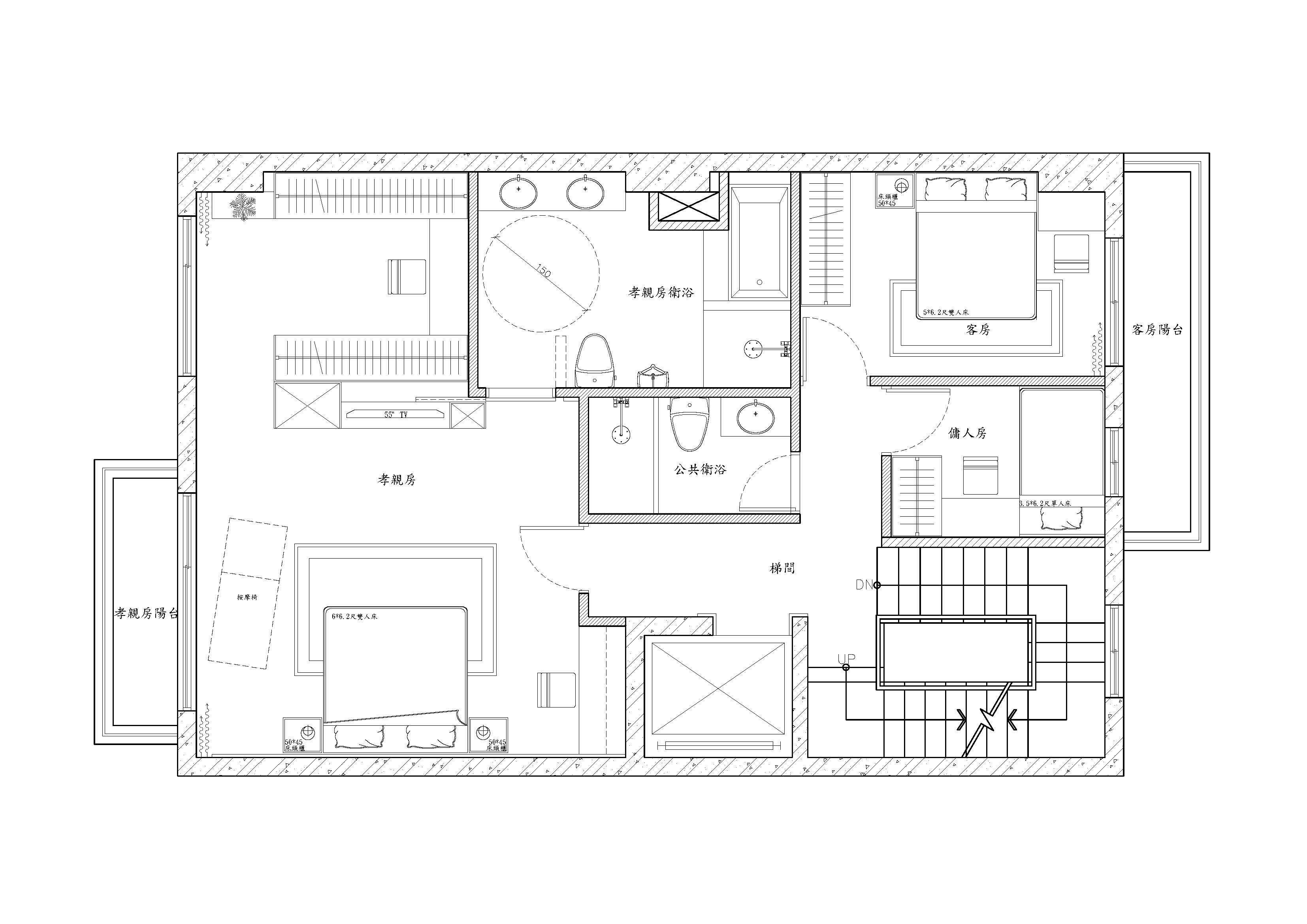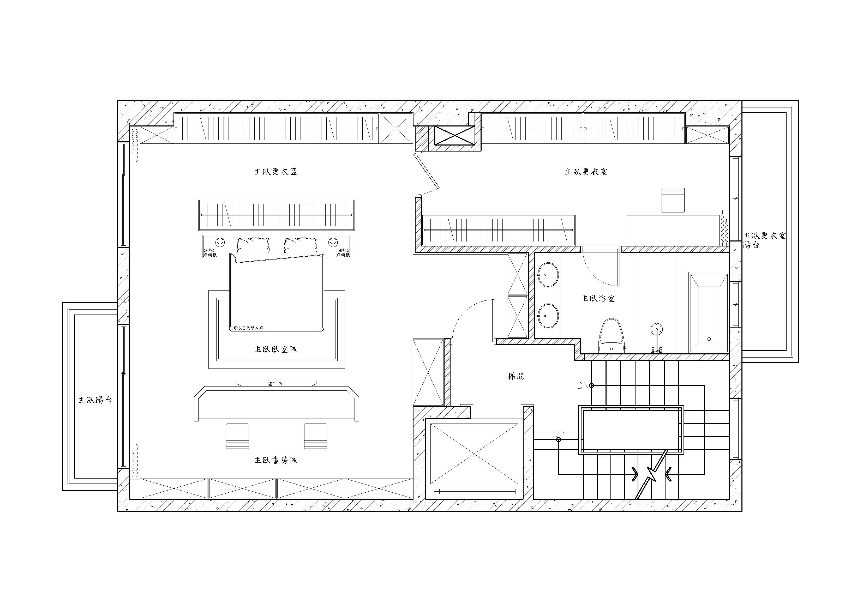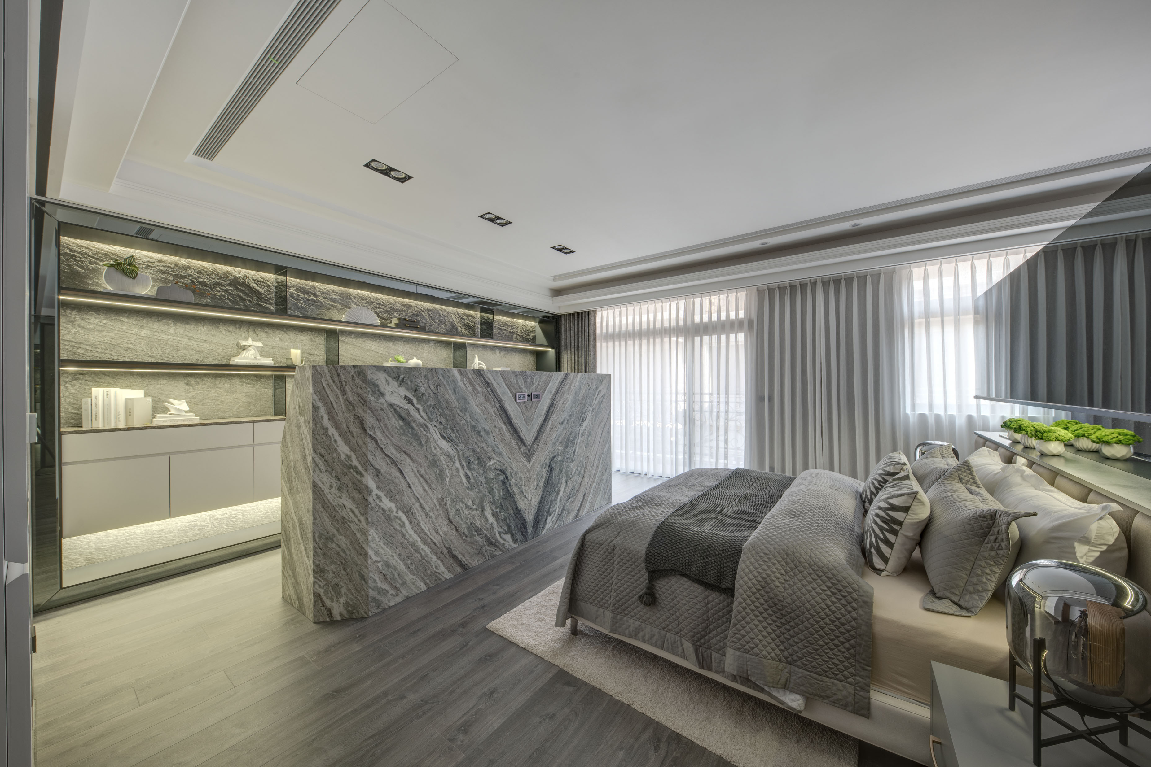 空间布局:空間佈局的創新集中在「開放但清晰分區」與「多機能量體整合」。餐、客廳以家具、矮牆及背景牆語彙自然定義區域,保持開放視野又無互相干擾;圓形餐桌被置於空間中心,搭配雕塑感吊燈,形成全宅動線的核心。主臥採用結合床頭背板、收納、展示與隔間功能的量體,使更衣區與睡眠區既界定又連續,打破傳統厚實隔牆,拓展視覺深度並提升空間彈性。