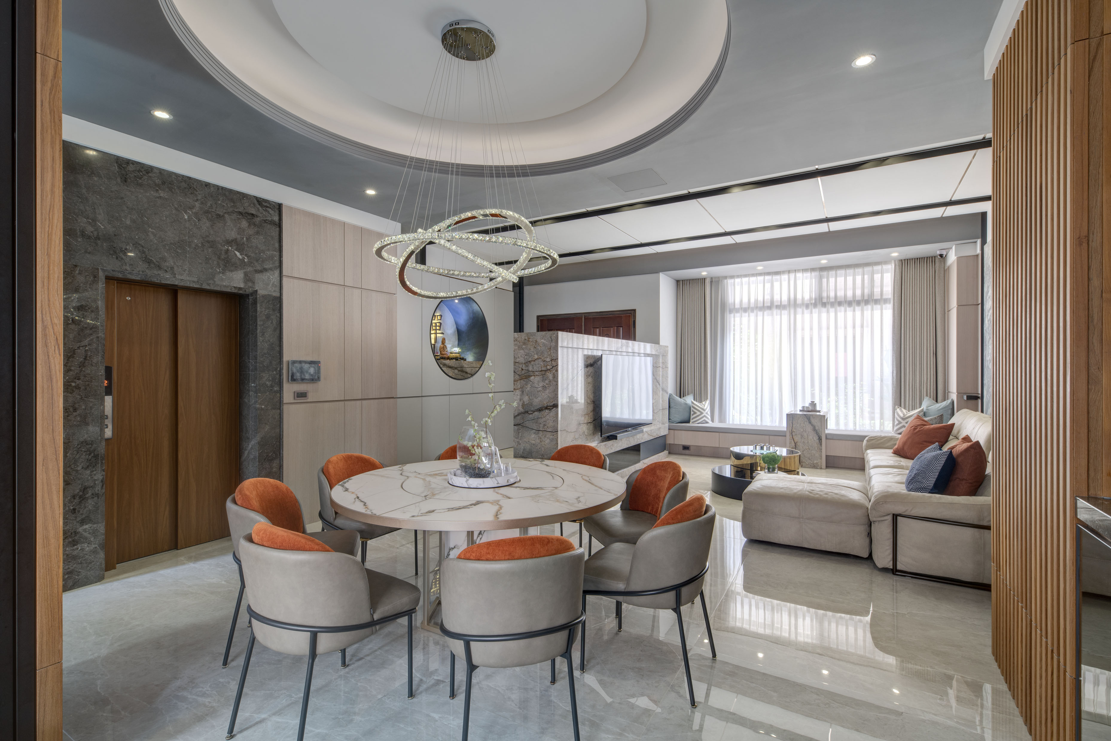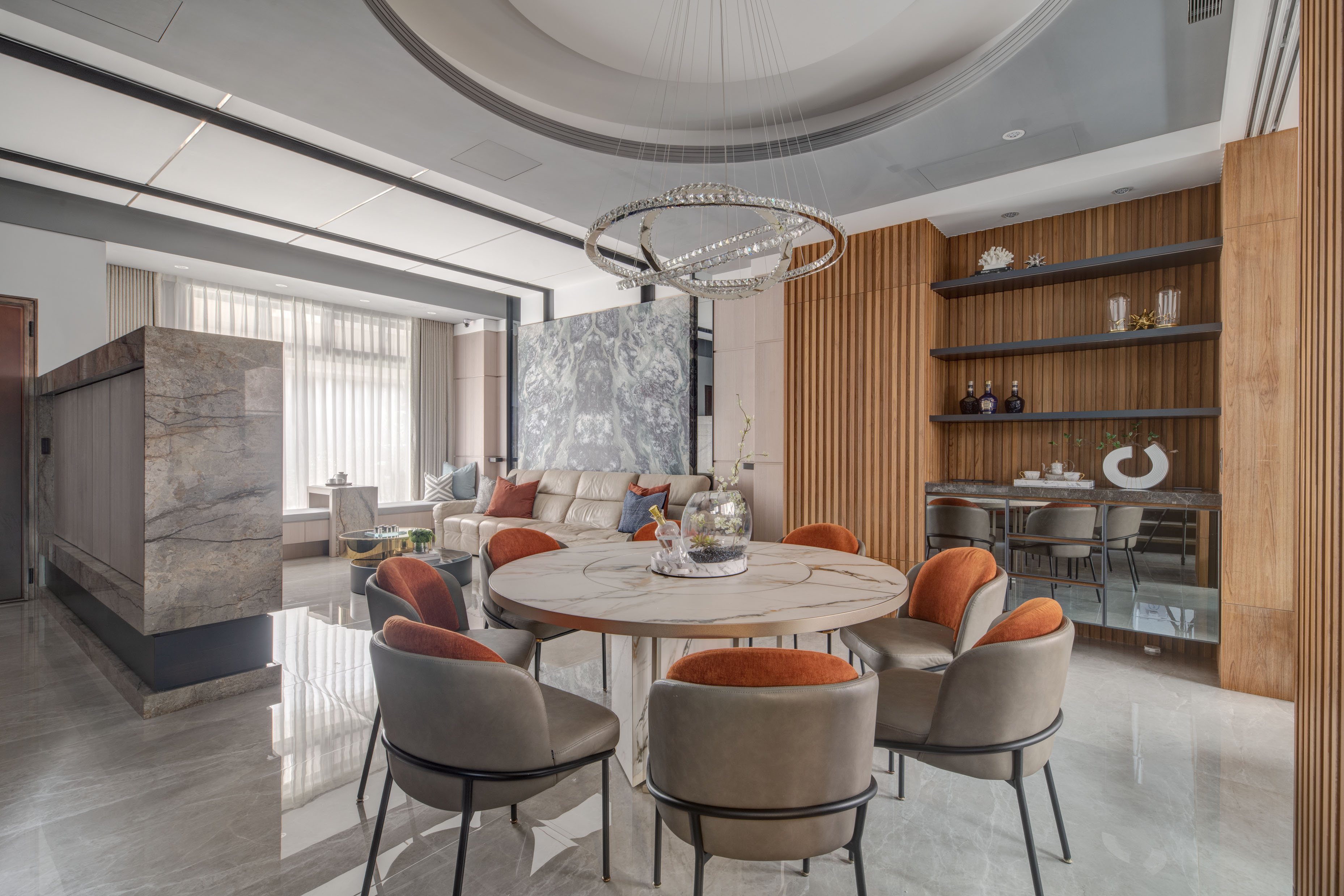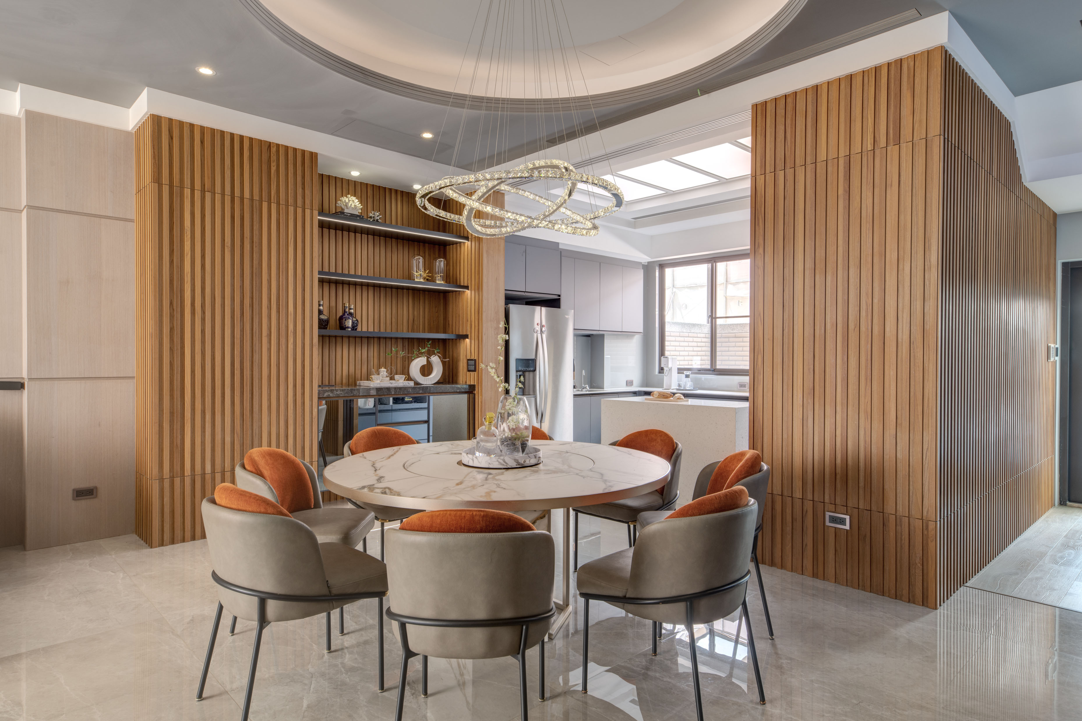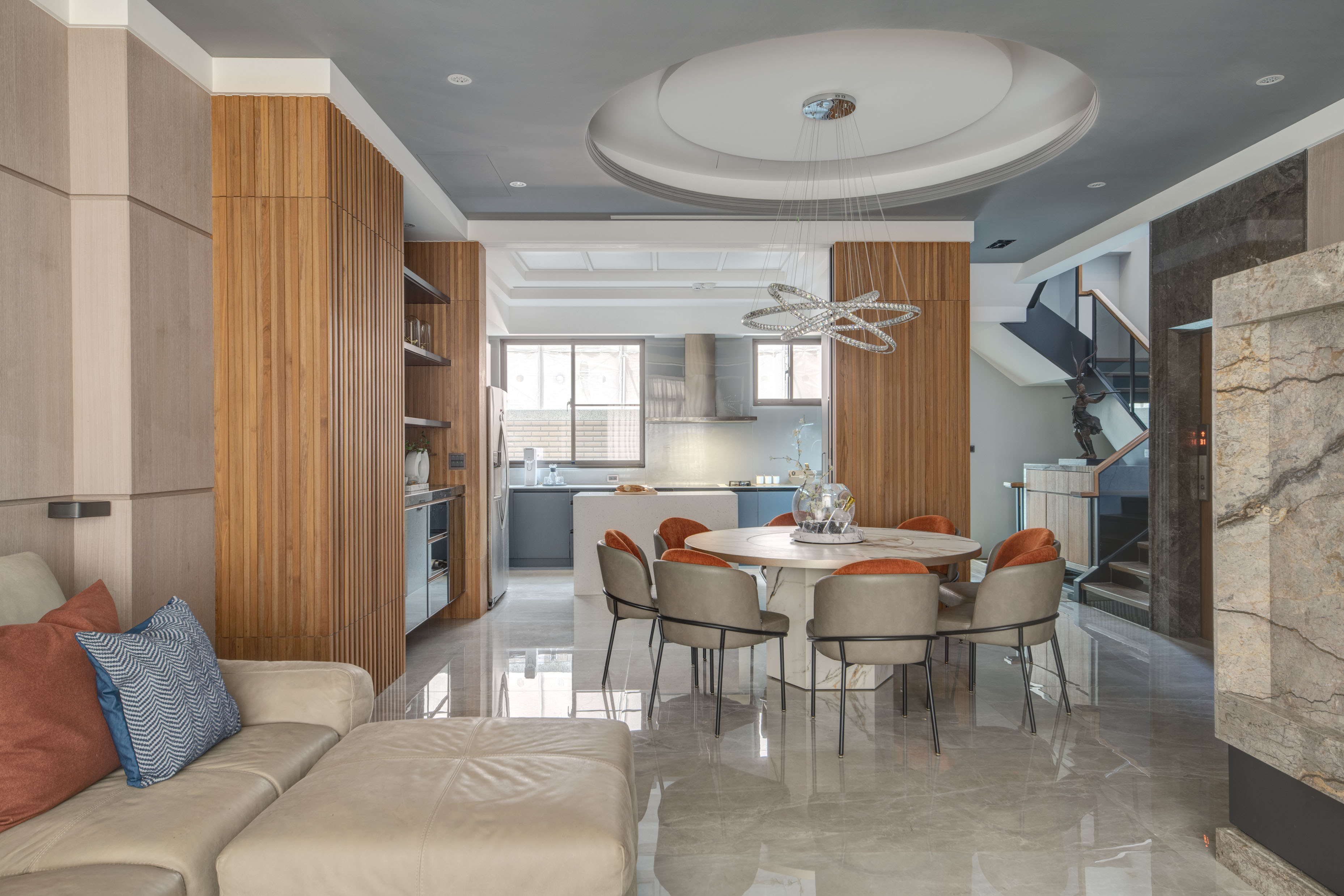 项目定位:以「現代輕奢 × 人文雅韻」為核心定位,透過石材的沉穩質感、木質的溫潤語彙及光影層次的引導,形塑出兼具精品酒店質感與居家溫度的生活場景。設計策畫以居住者的日常體驗為主軸,將寧靜、秩序與舒適集結於一體,並以圓形餐區與視覺焦點牆面構成空間主視覺,使整體風格在柔與剛、冷與暖之間達到平衡與高度辨識度。