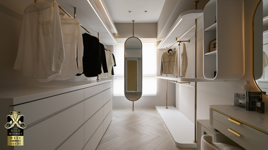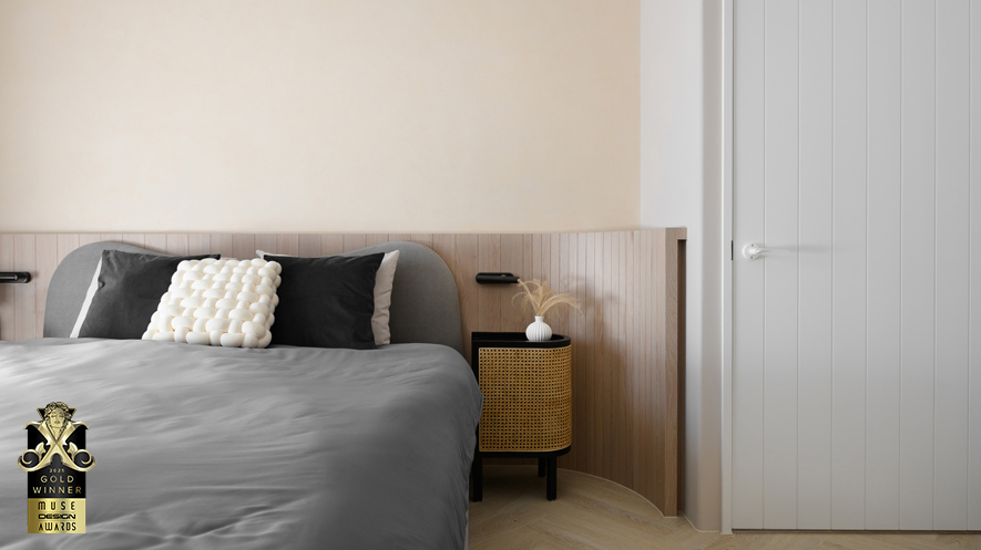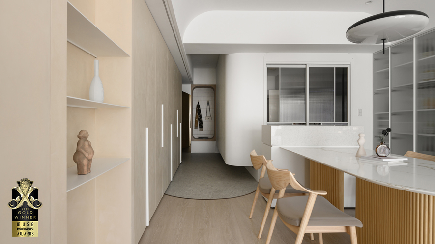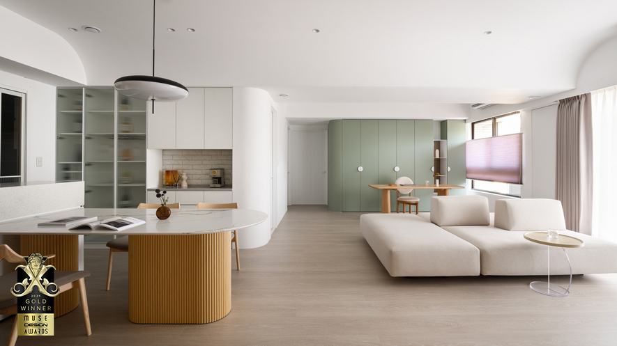 9美国 MUSE Design Awards致力于发掘全球设计缪思,涵盖建筑、室内、时尚等领域。2025年共吸引来自122国、超过十万件作品参赛,由200多位专业评审严格遴选,为国际设计界的重要指标。擎森设计 设计总监 陈楚扉 呼应住者对温馨居所的嚮往,透过圆弧曲线消弭空间结构的量体沉重感,搭配大地色系与素雅淨白,营造云朵飘浮般的轻盈诗意,家宅《云暮》以其跳脱传统格局、将生活哲学与空间美学完美融合的创新手法,充分体现该奖项推崇的「发掘兼具创新精神与人文关怀的设计」精神,荣获本届赛事「金奖」殊荣!