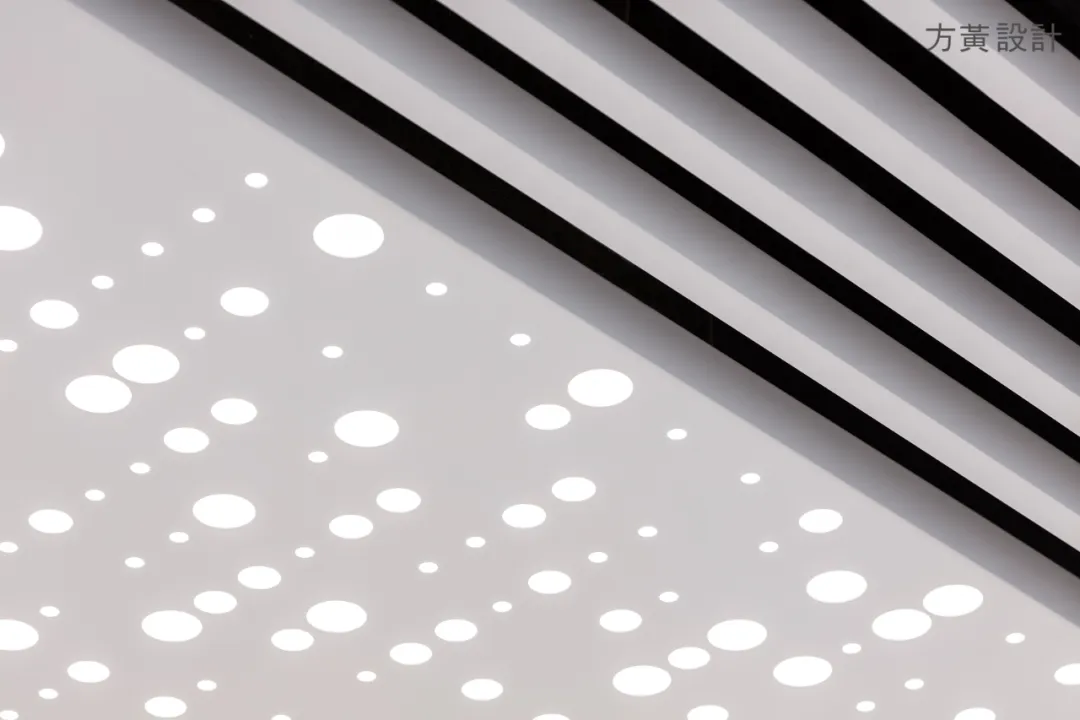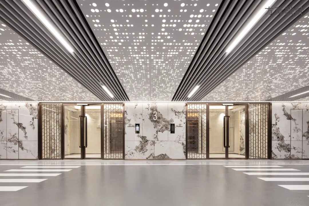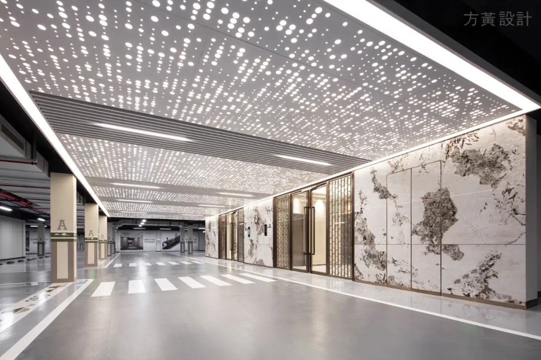 设计选材:依托海洋文化,车马厅的墙面和天花以冲孔板作为主要装饰材料,与白色铝格栅的组合使空间更具丰富的层次感,让住户的归家体验如酒店般的奢享品质感。
