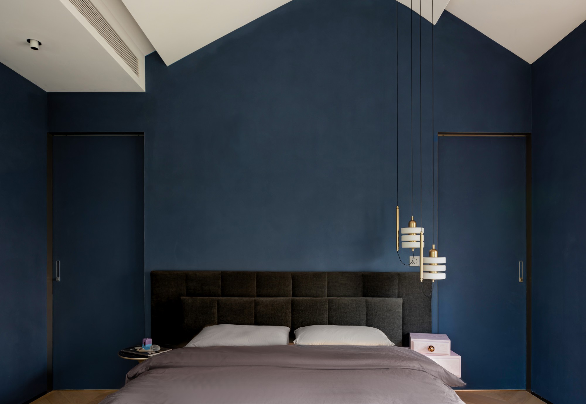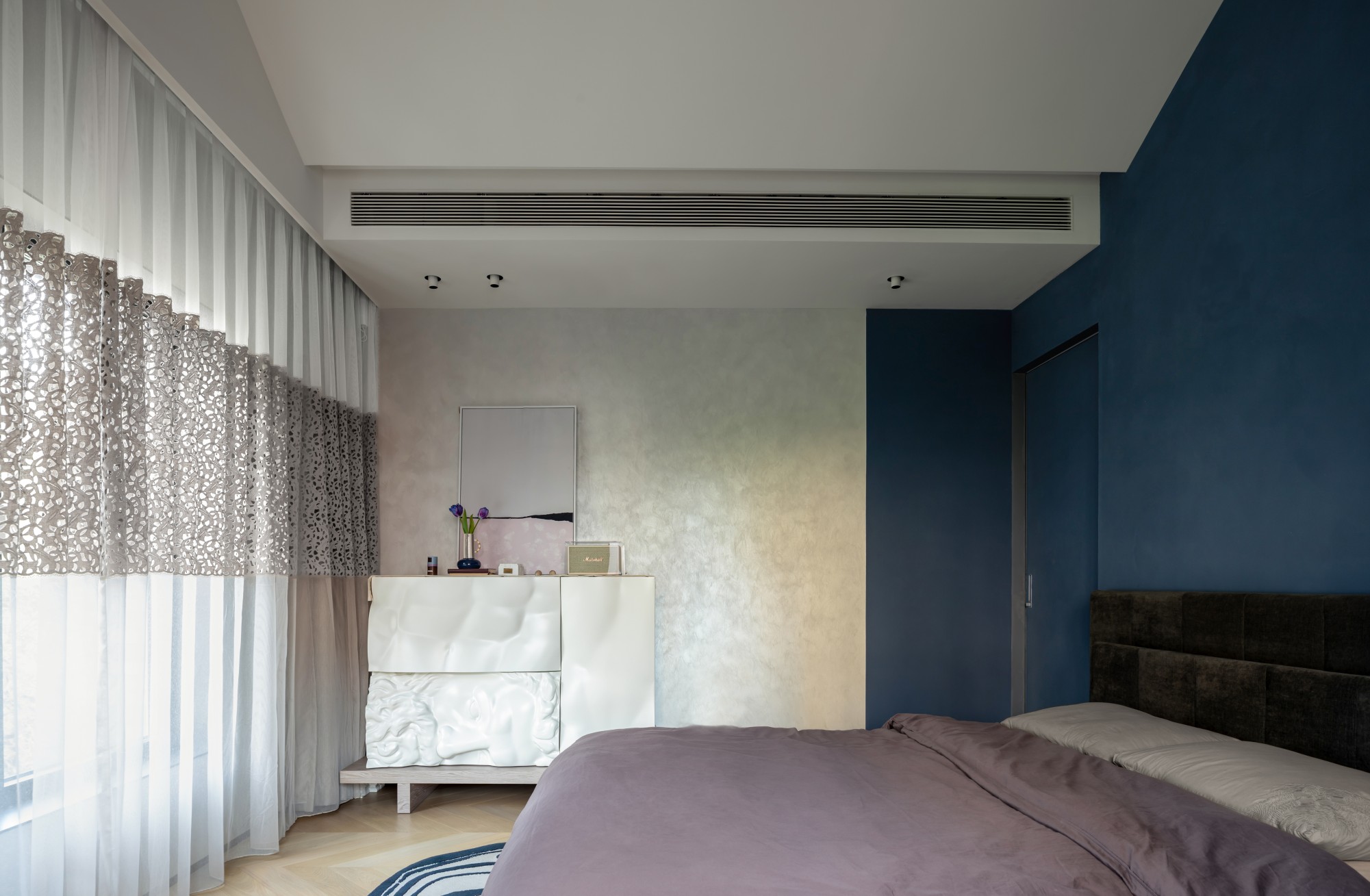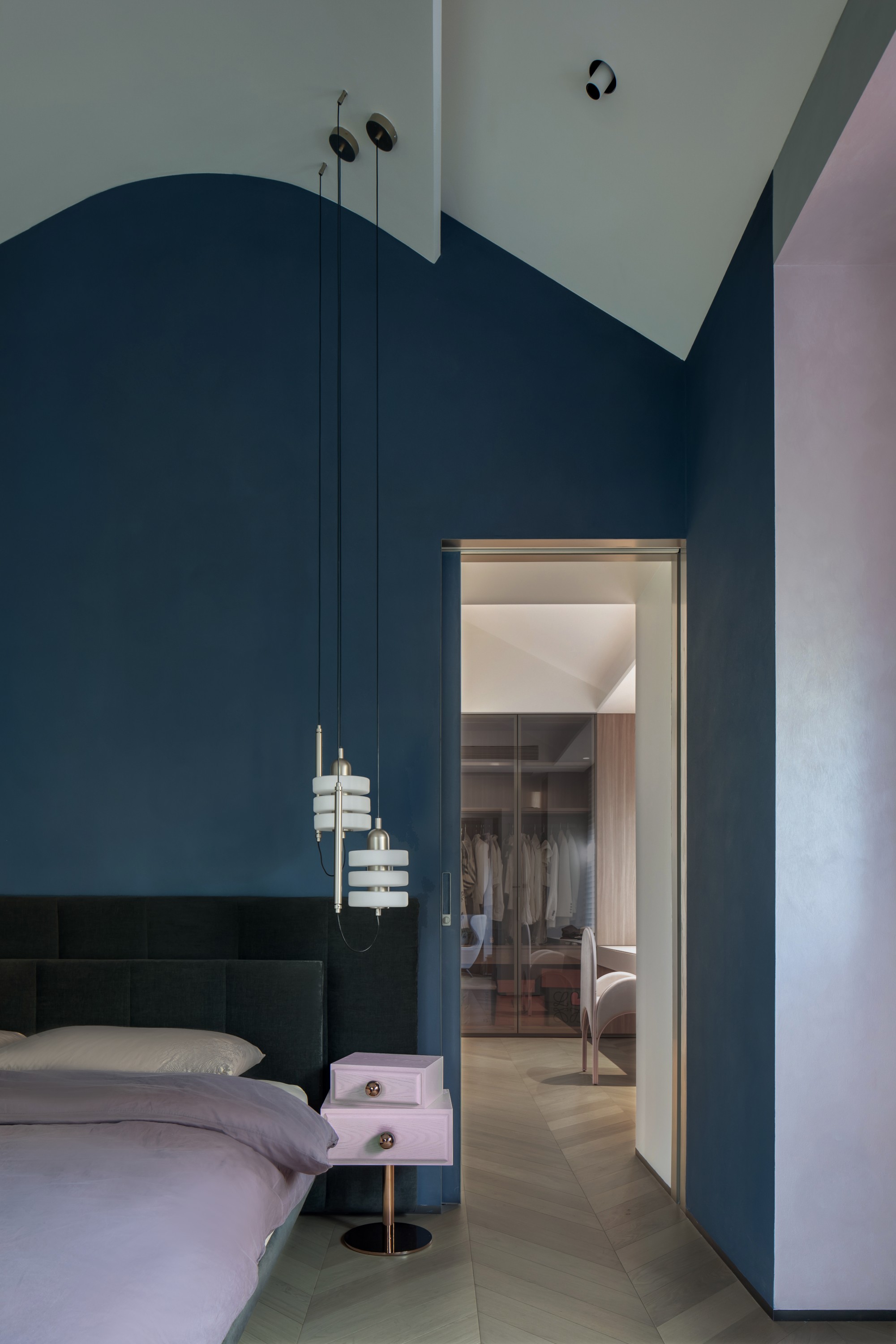 女儿套房: 这是一个完整表达个性的世界。深蓝色的卧室背景墙如静谧夜空,搭配设计感十足的Ercole e Afrodite柜体与艺术家具,冷静中透着不羁的创意。