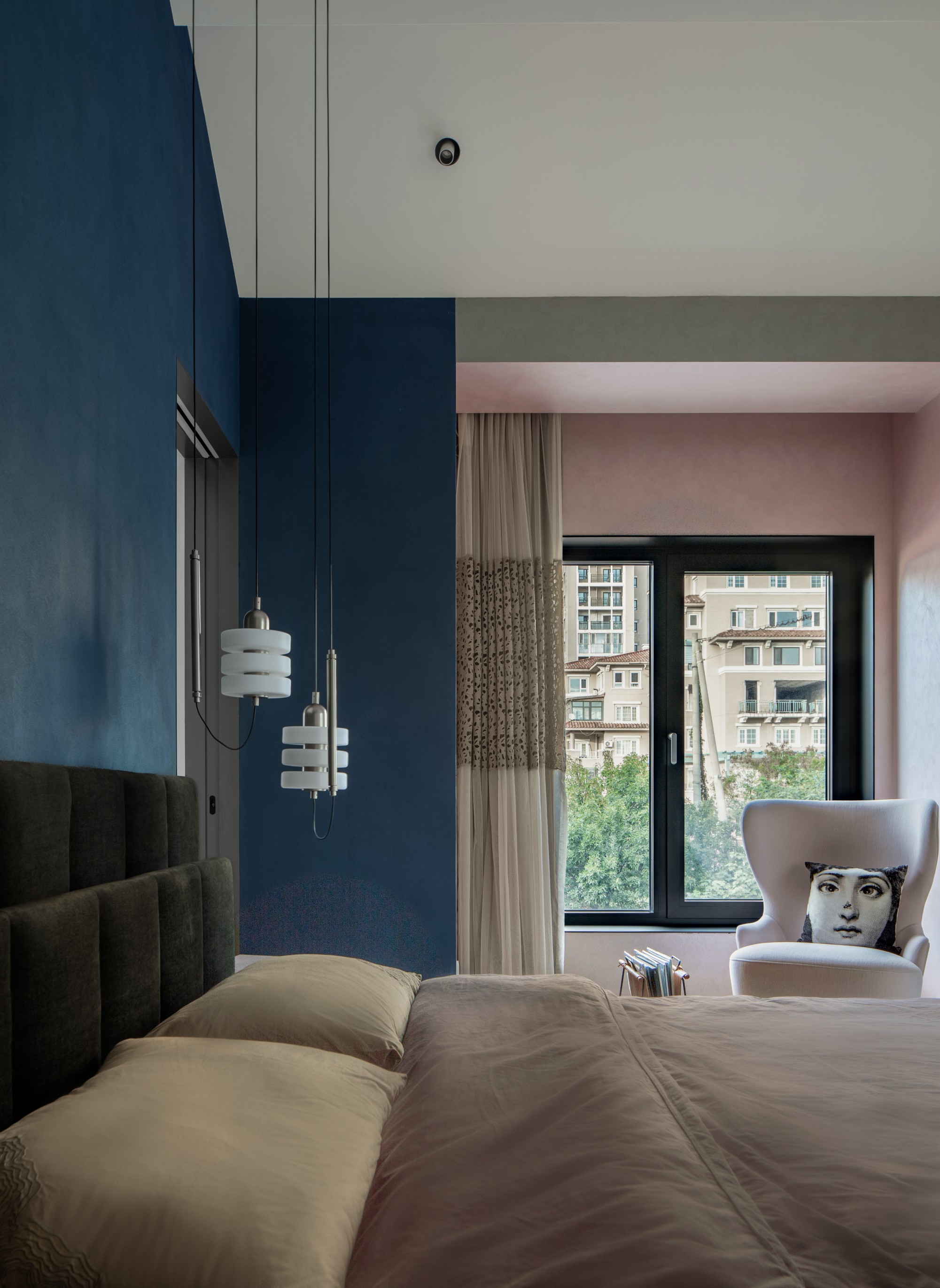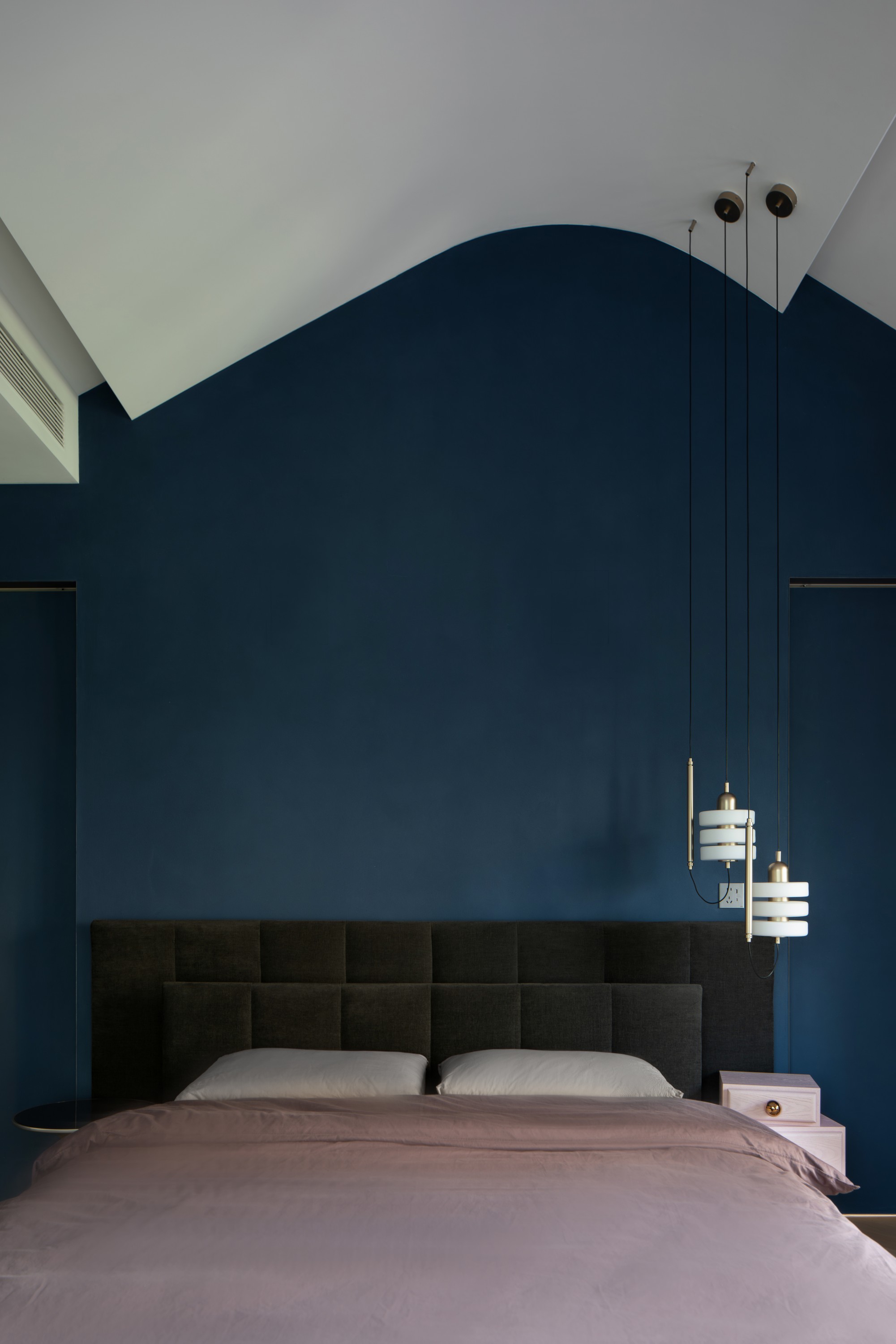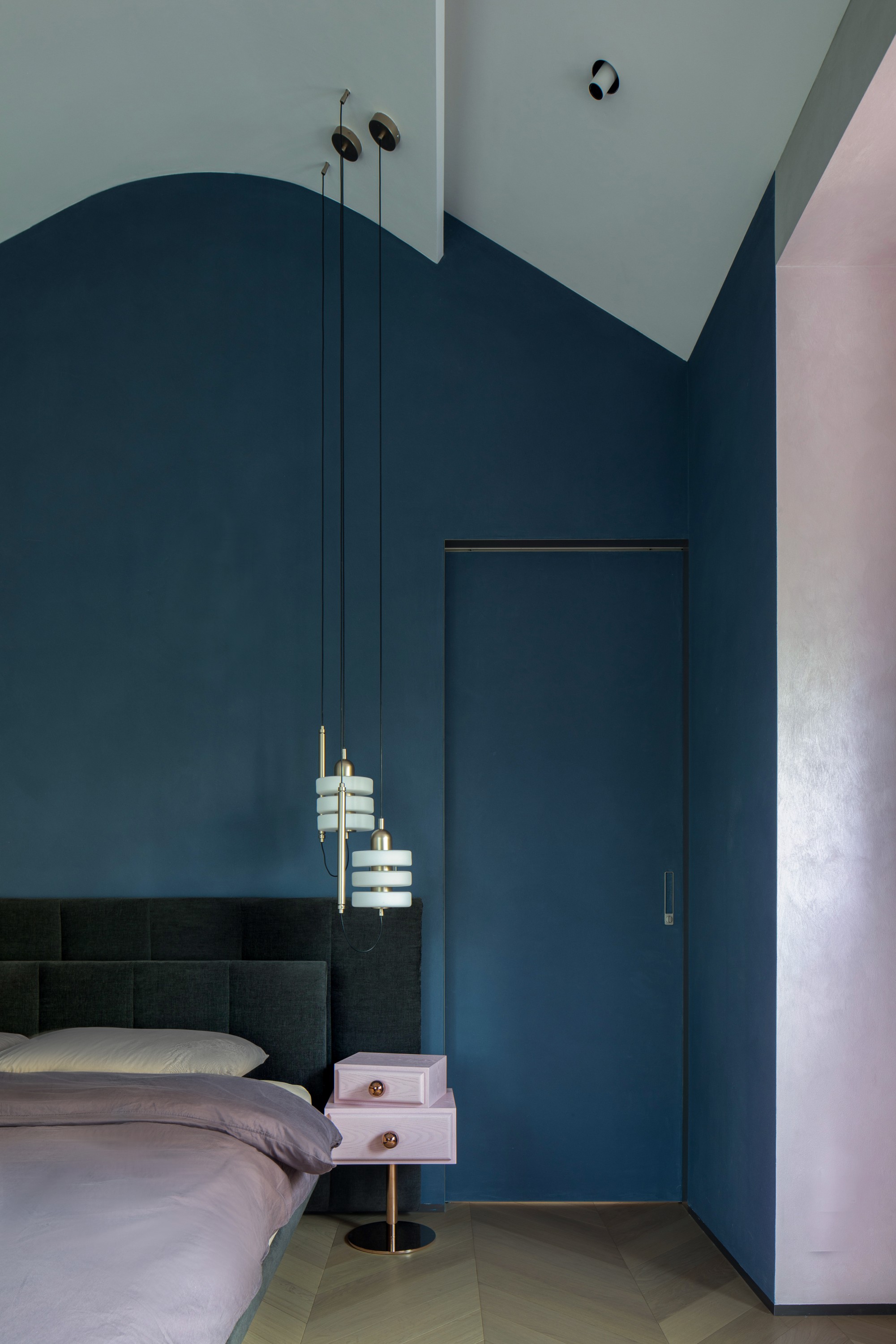 女儿套房: 这是一个完整表达个性的世界。深蓝色的卧室背景墙如静谧夜空,搭配设计感十足的Ercole e Afrodite柜体与艺术家具,冷静中透着不羁的创意。