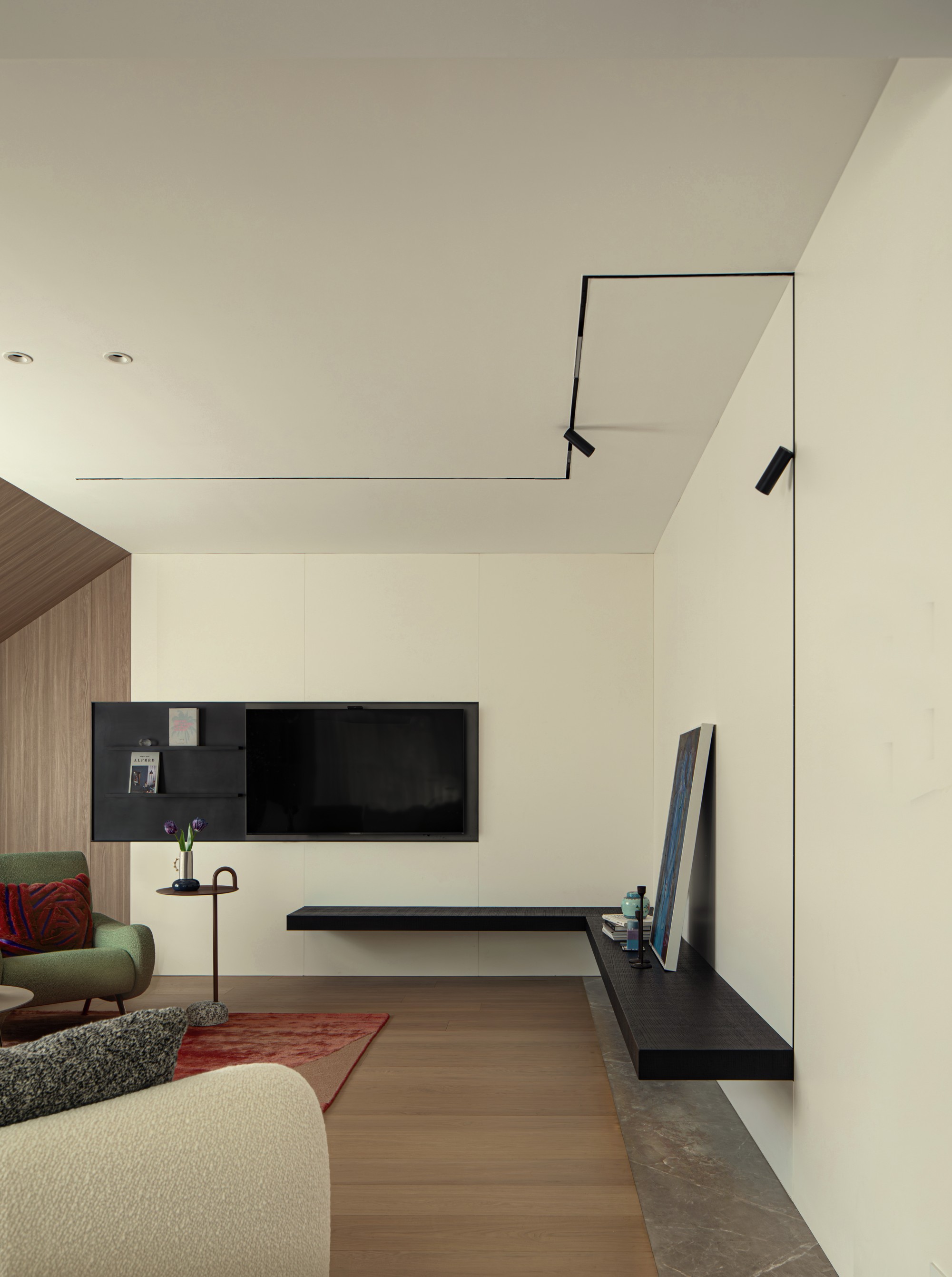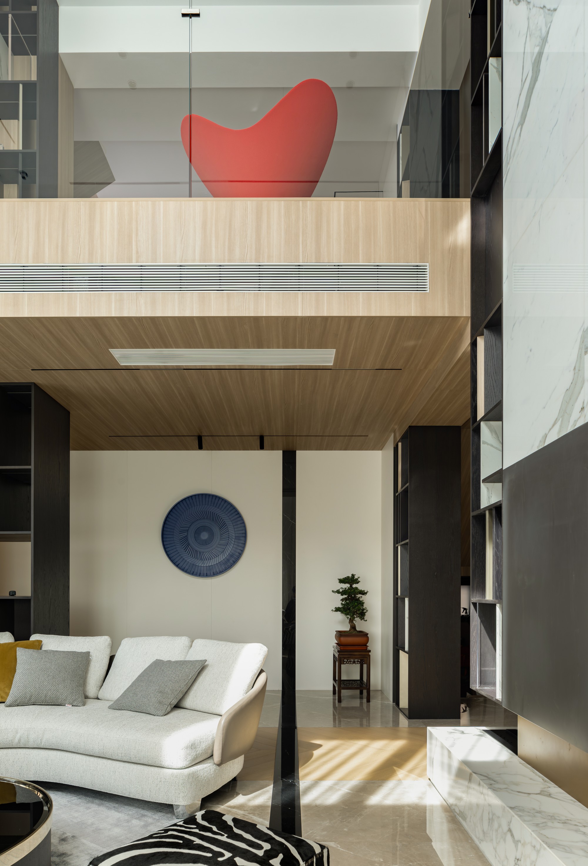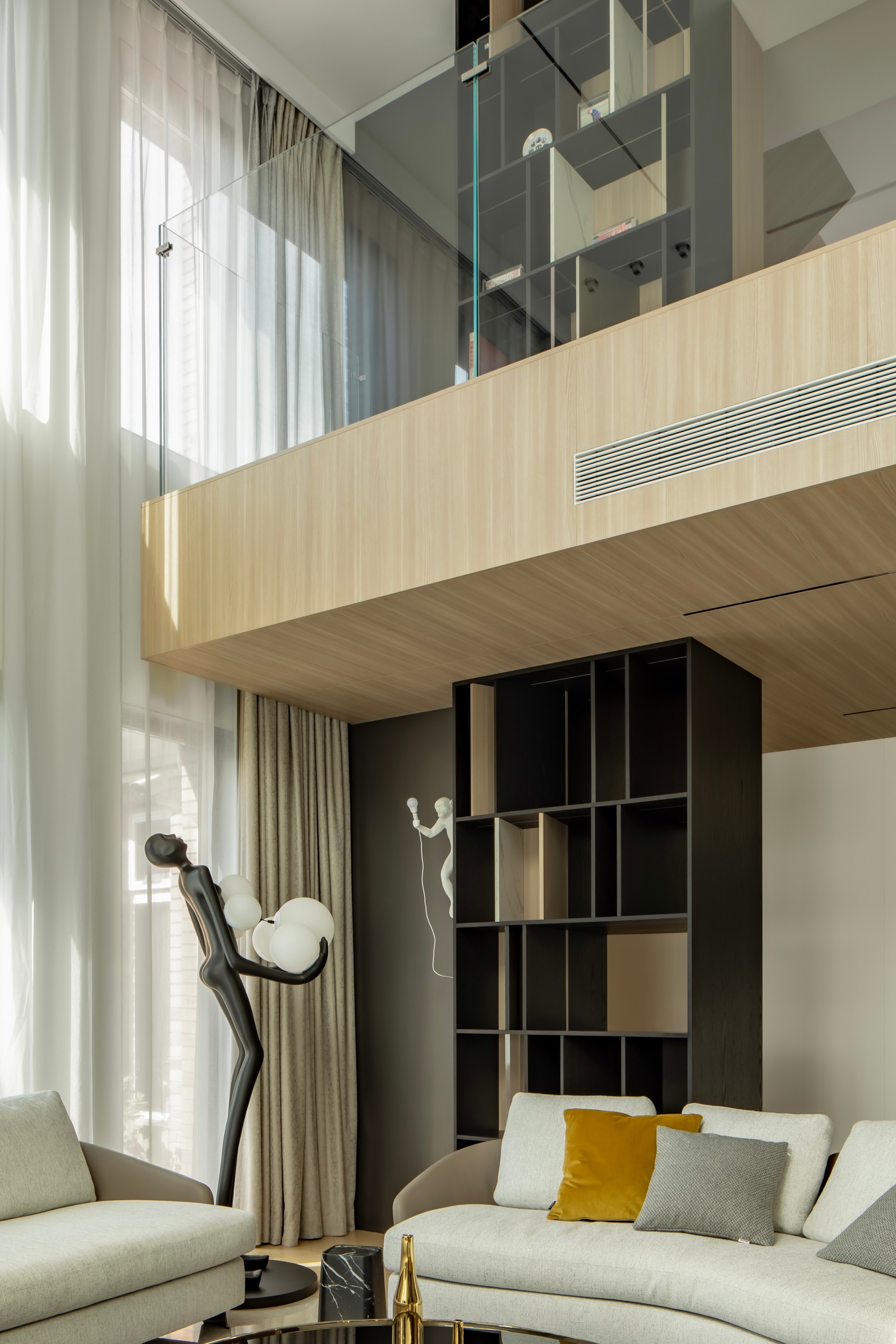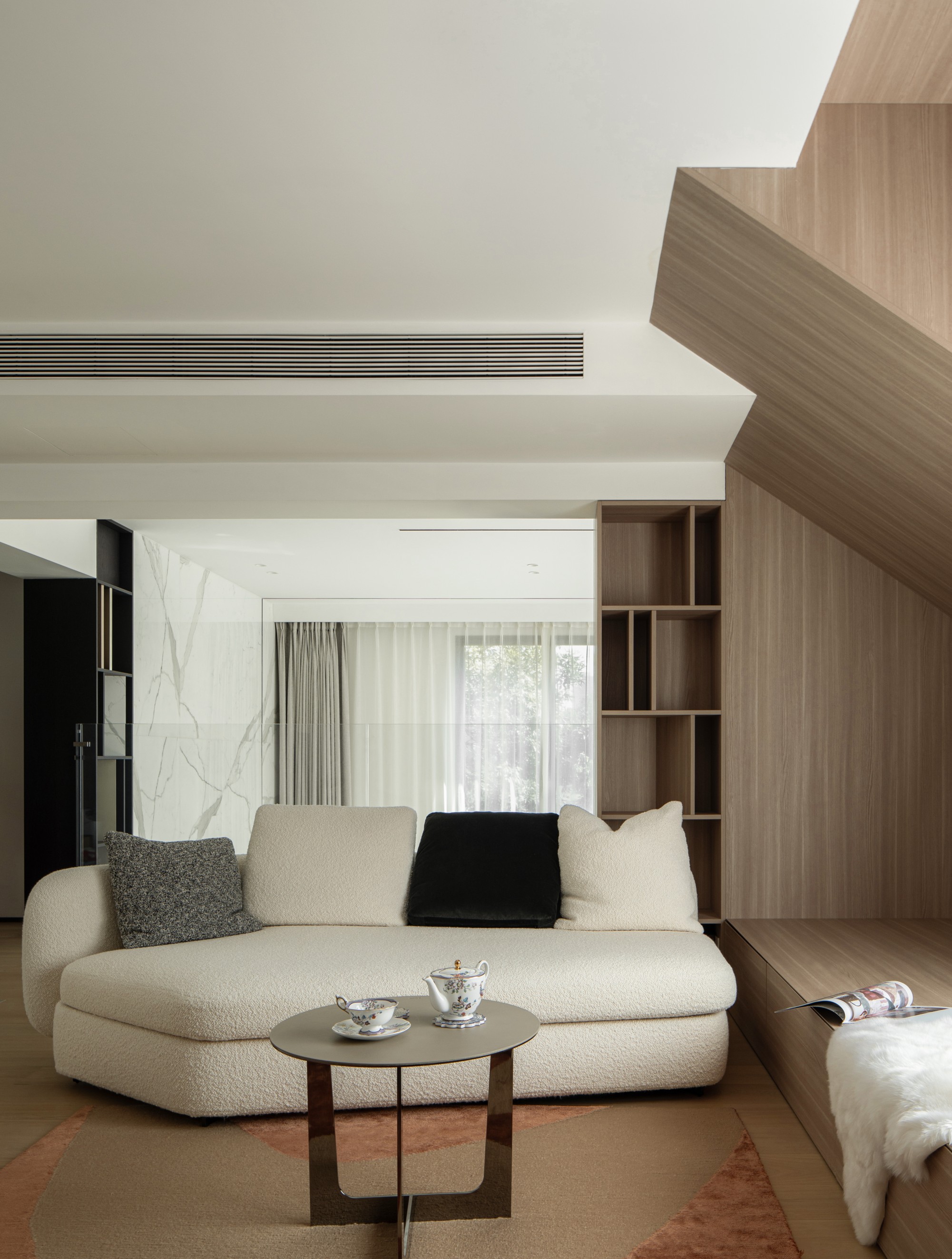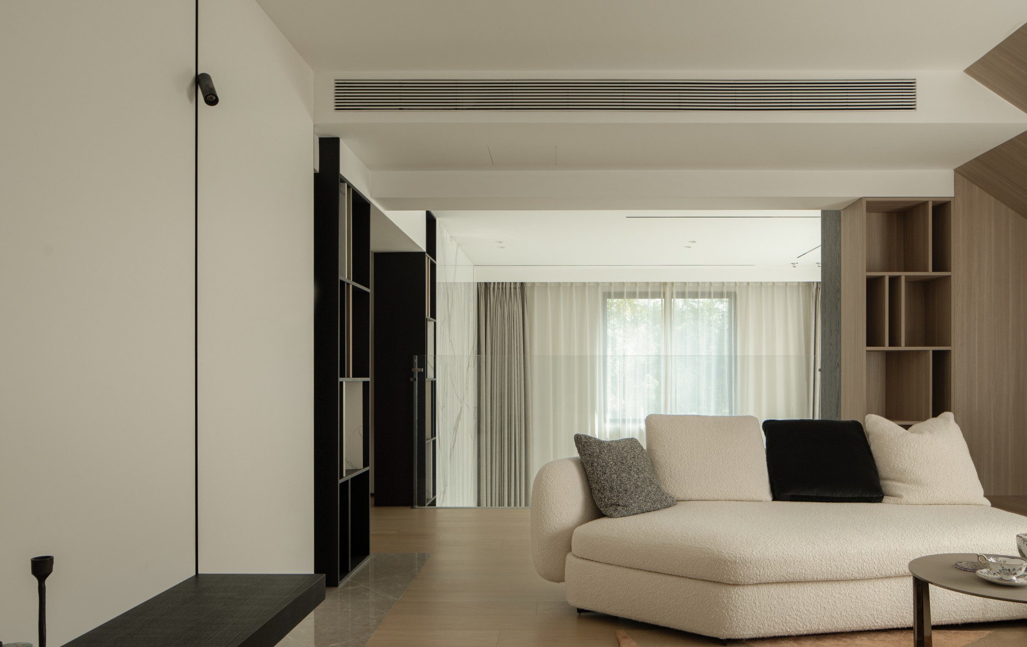 此处直面挑空,与楼下保持着若有似无的视觉联系。他们可以在此品茗阅读,或只是并肩看一部电影,共享一段不被干扰的静谧时光。