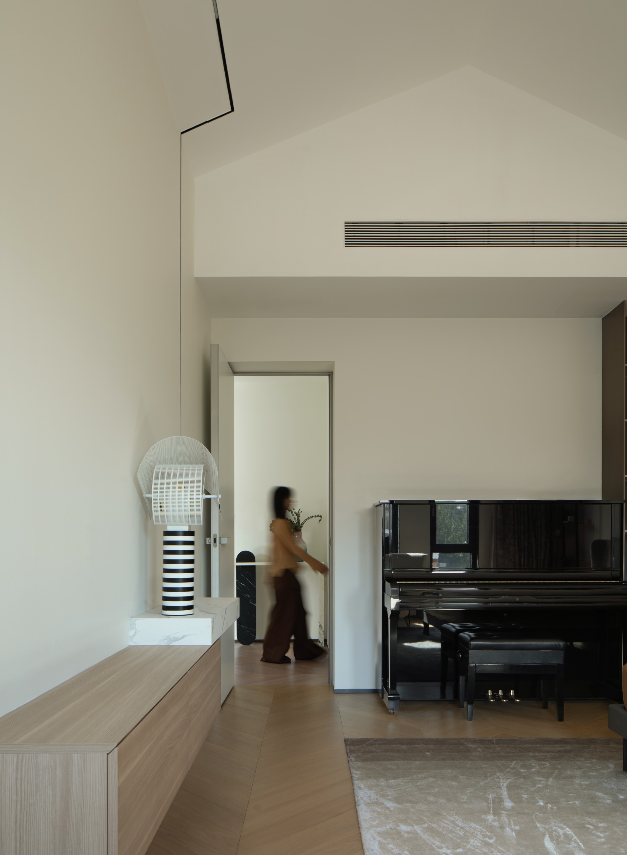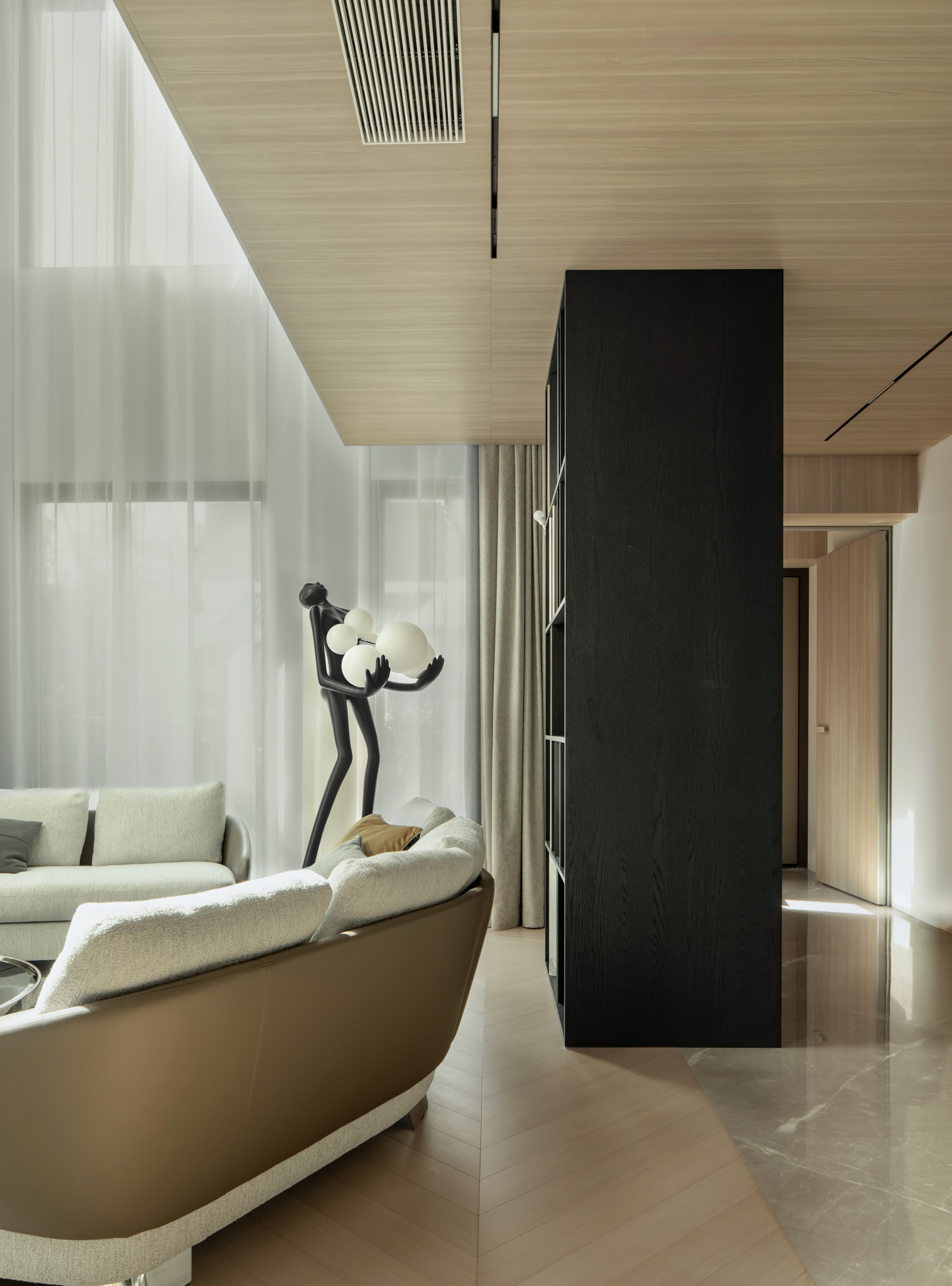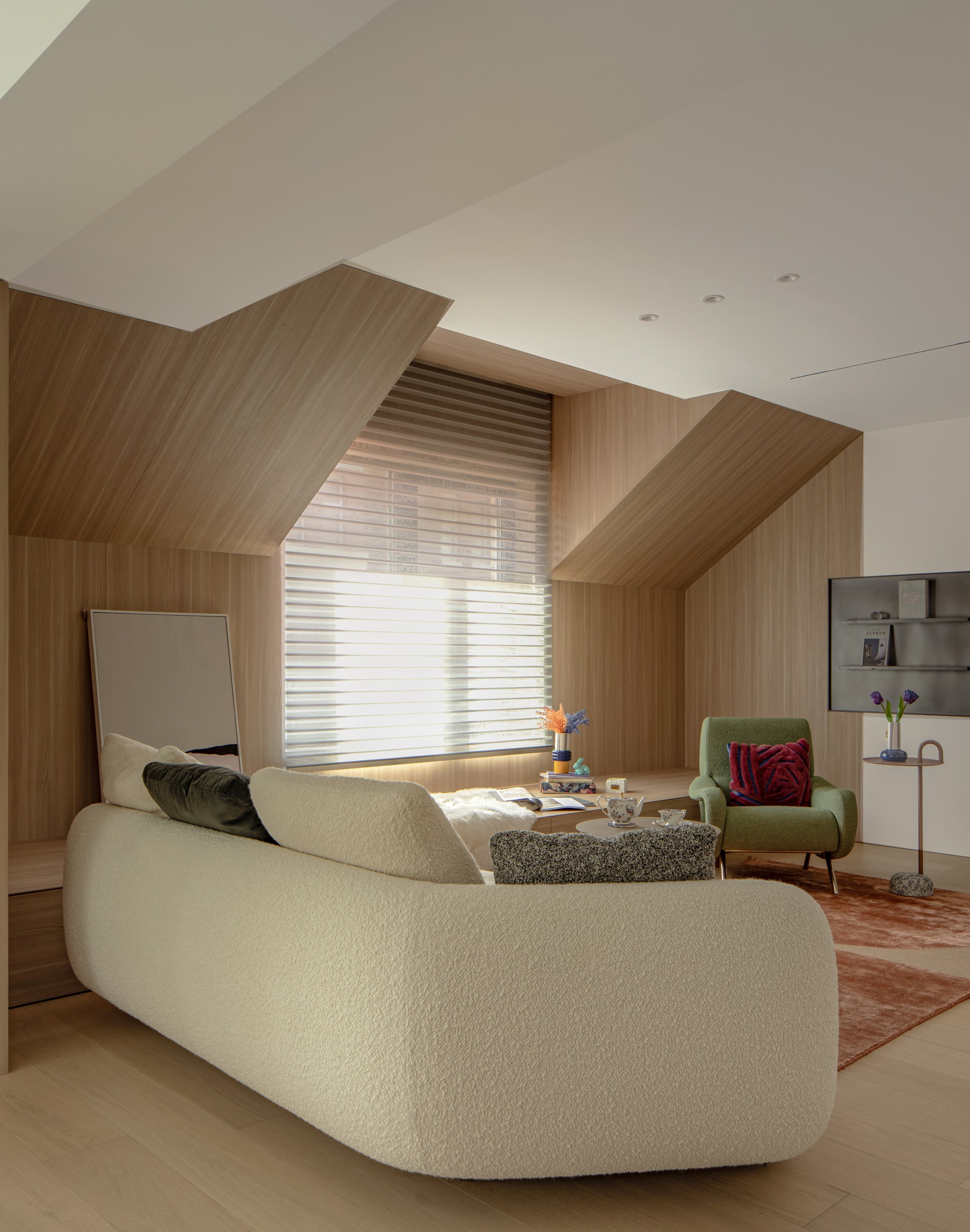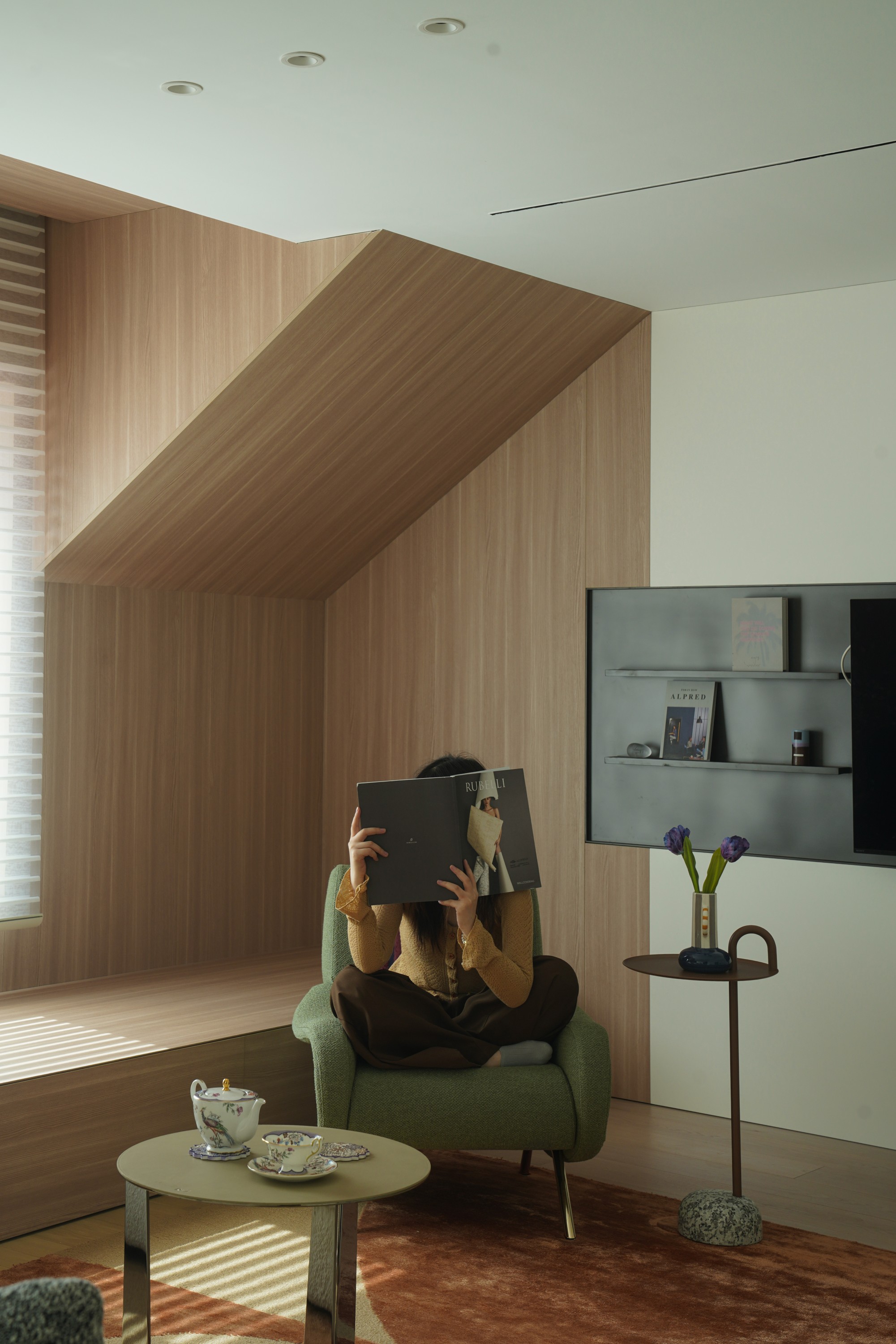 此处直面挑空,与楼下保持着若有似无的视觉联系。他们可以在此品茗阅读,或只是并肩看一部电影,共享一段不被干扰的静谧时光。