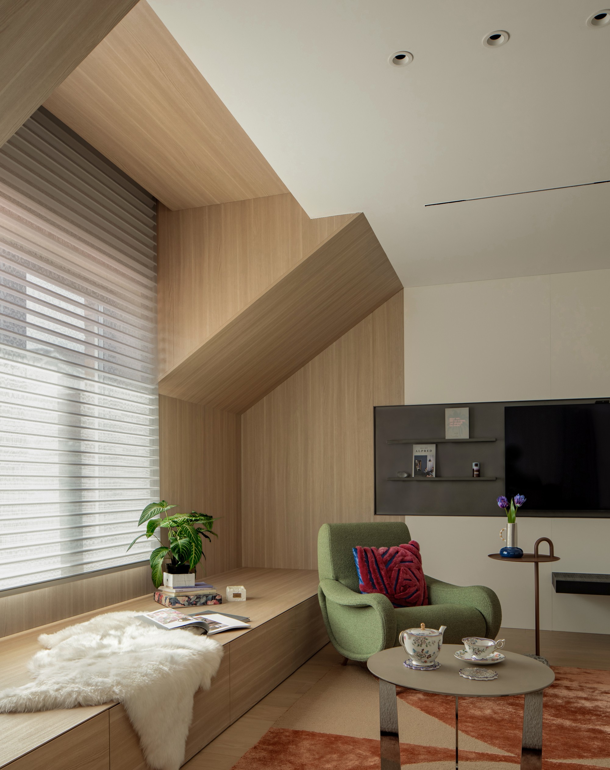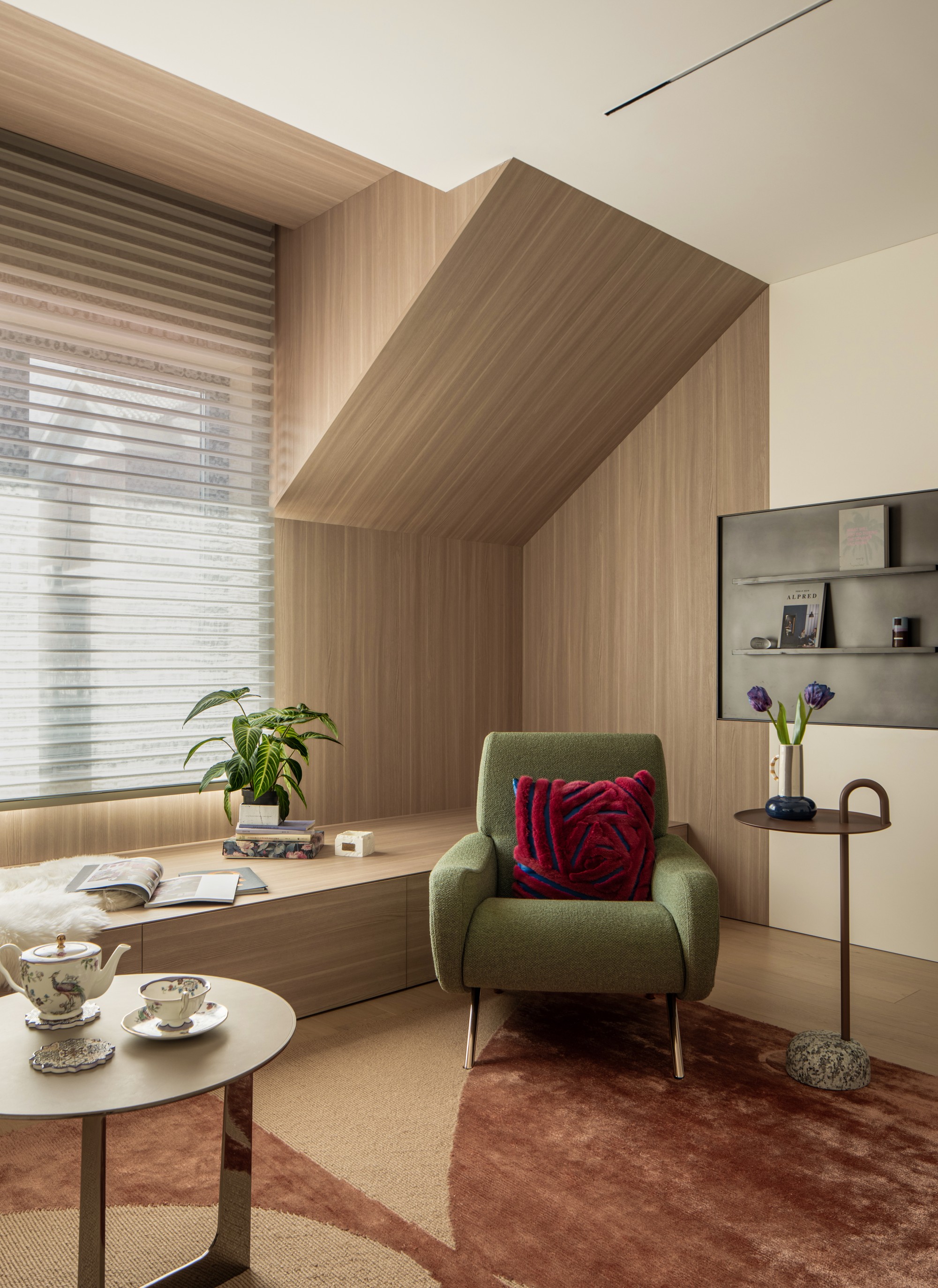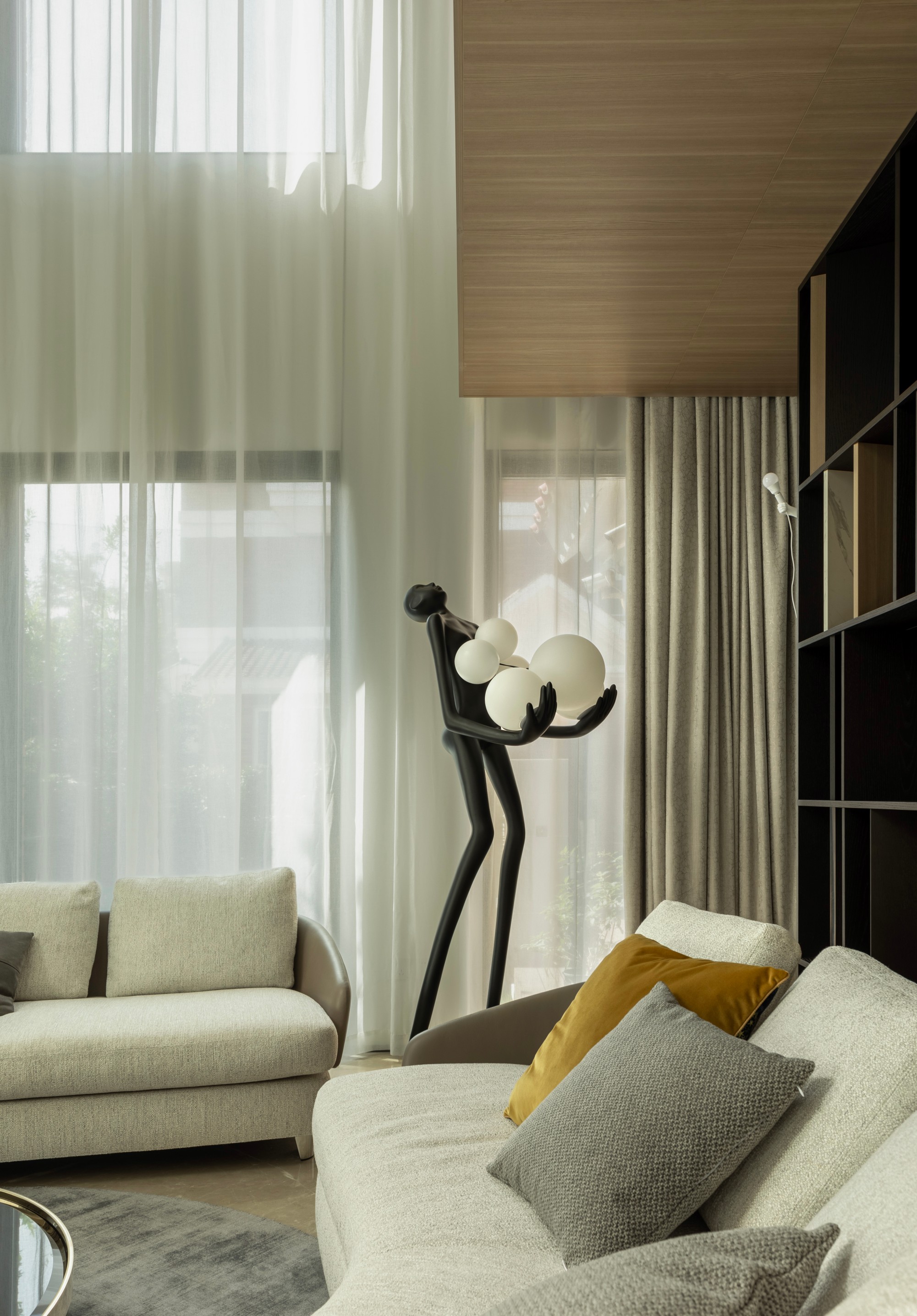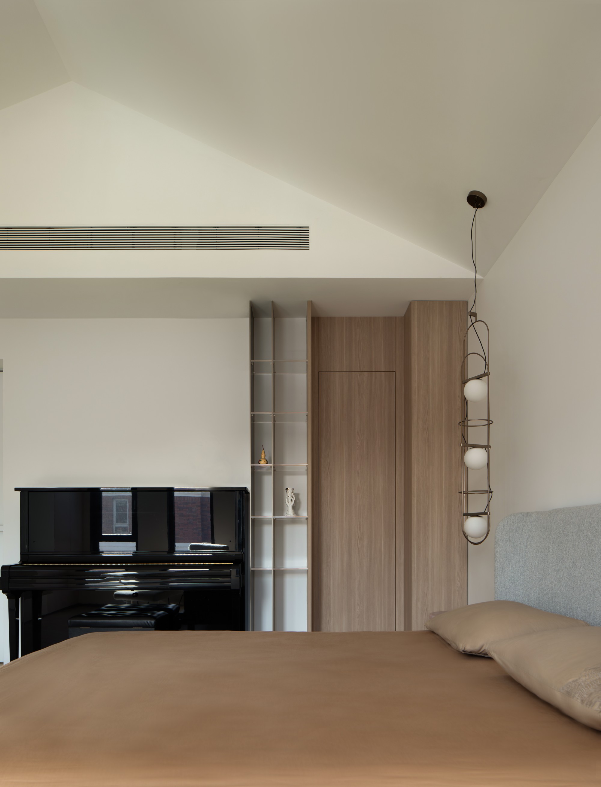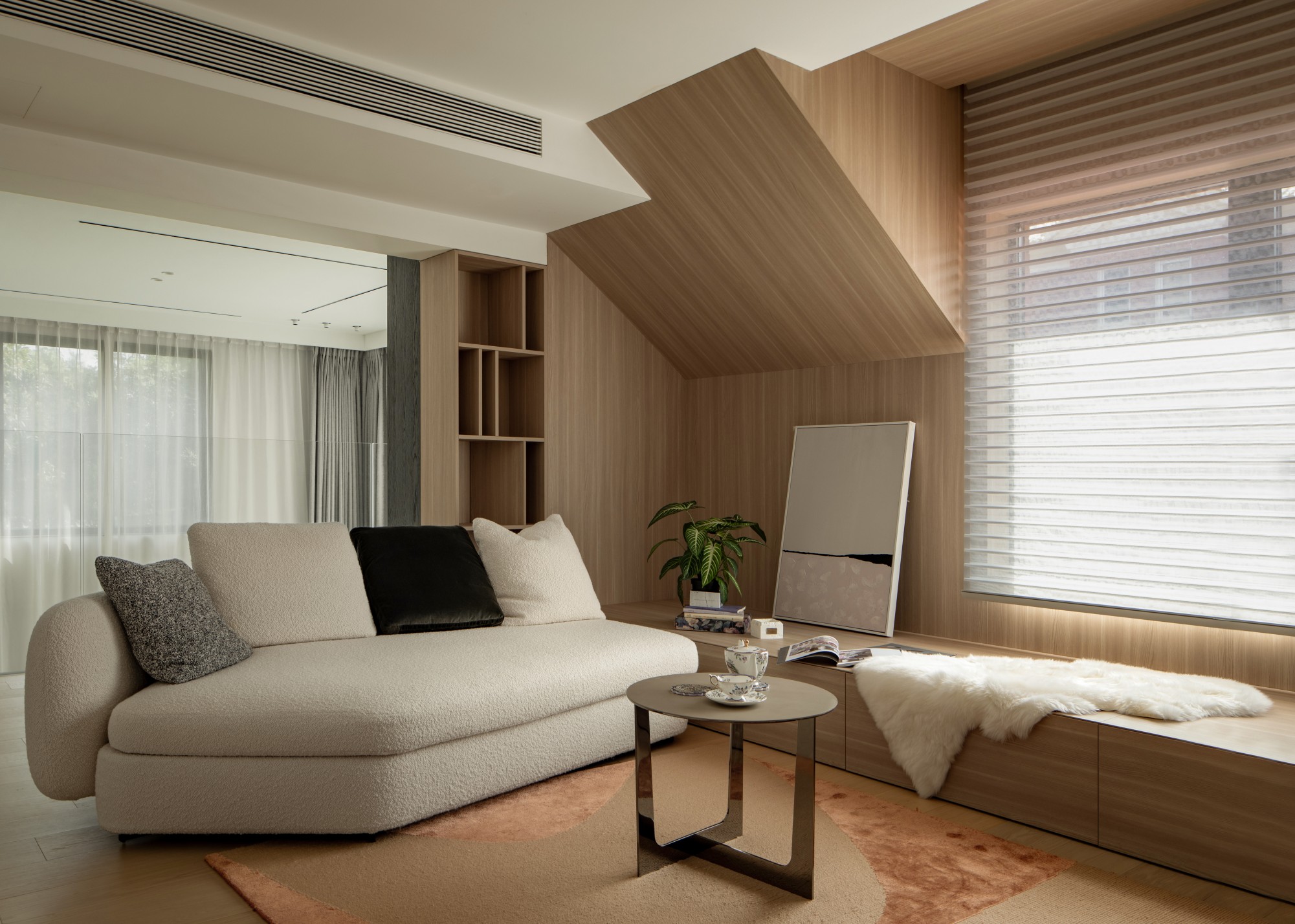 此处直面挑空,与楼下保持着若有似无的视觉联系。他们可以在此品茗阅读,或只是并肩看一部电影,共享一段不被干扰的静谧时光。