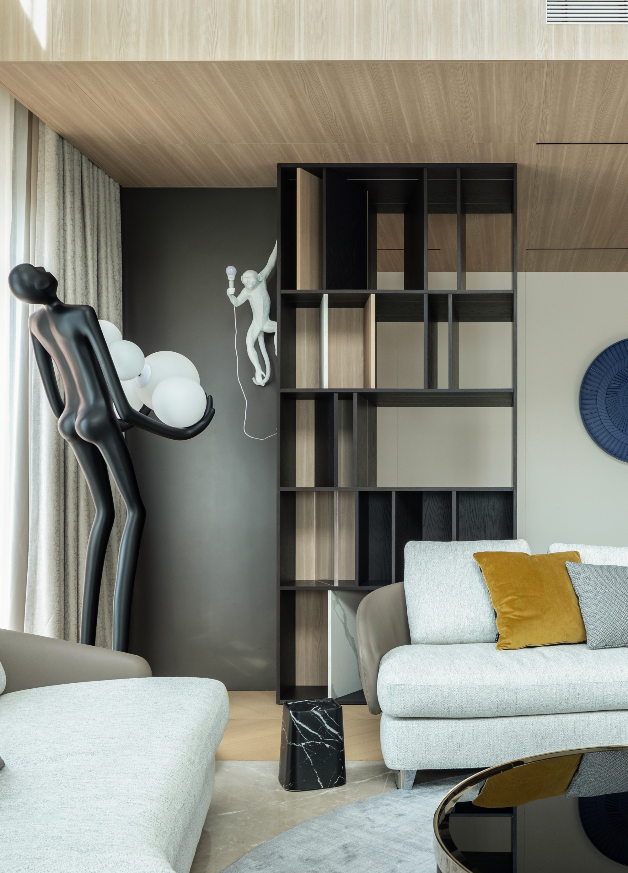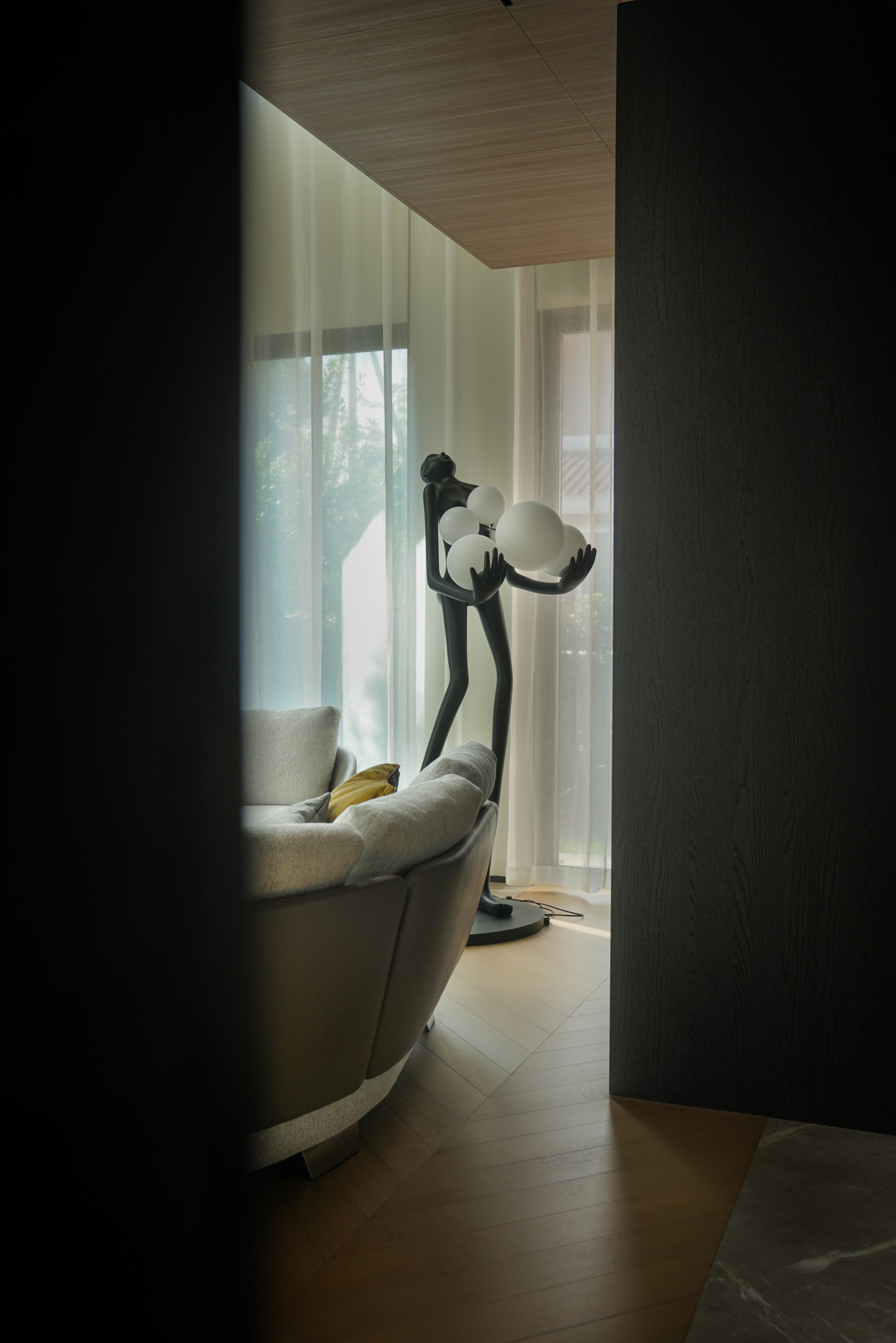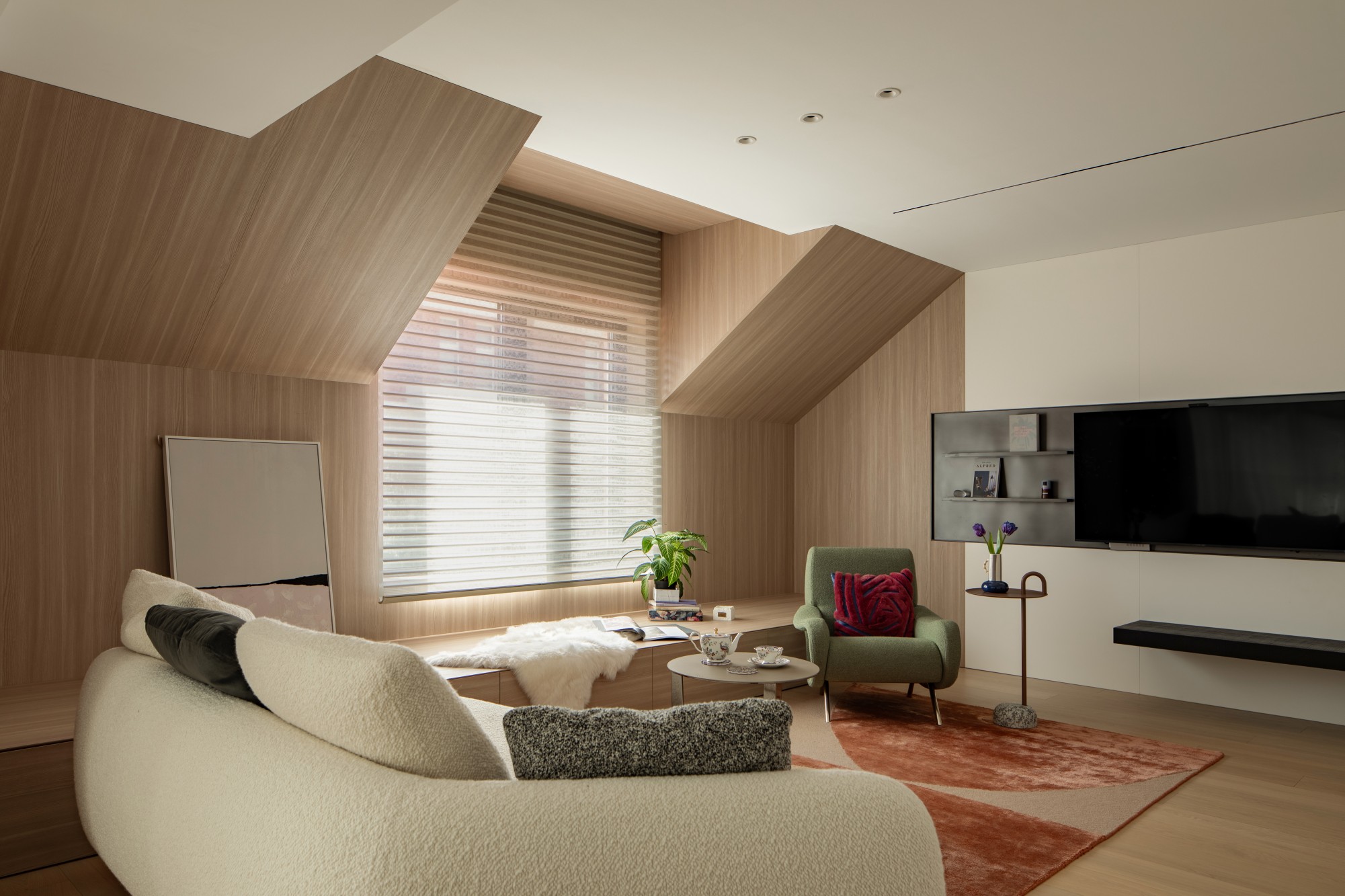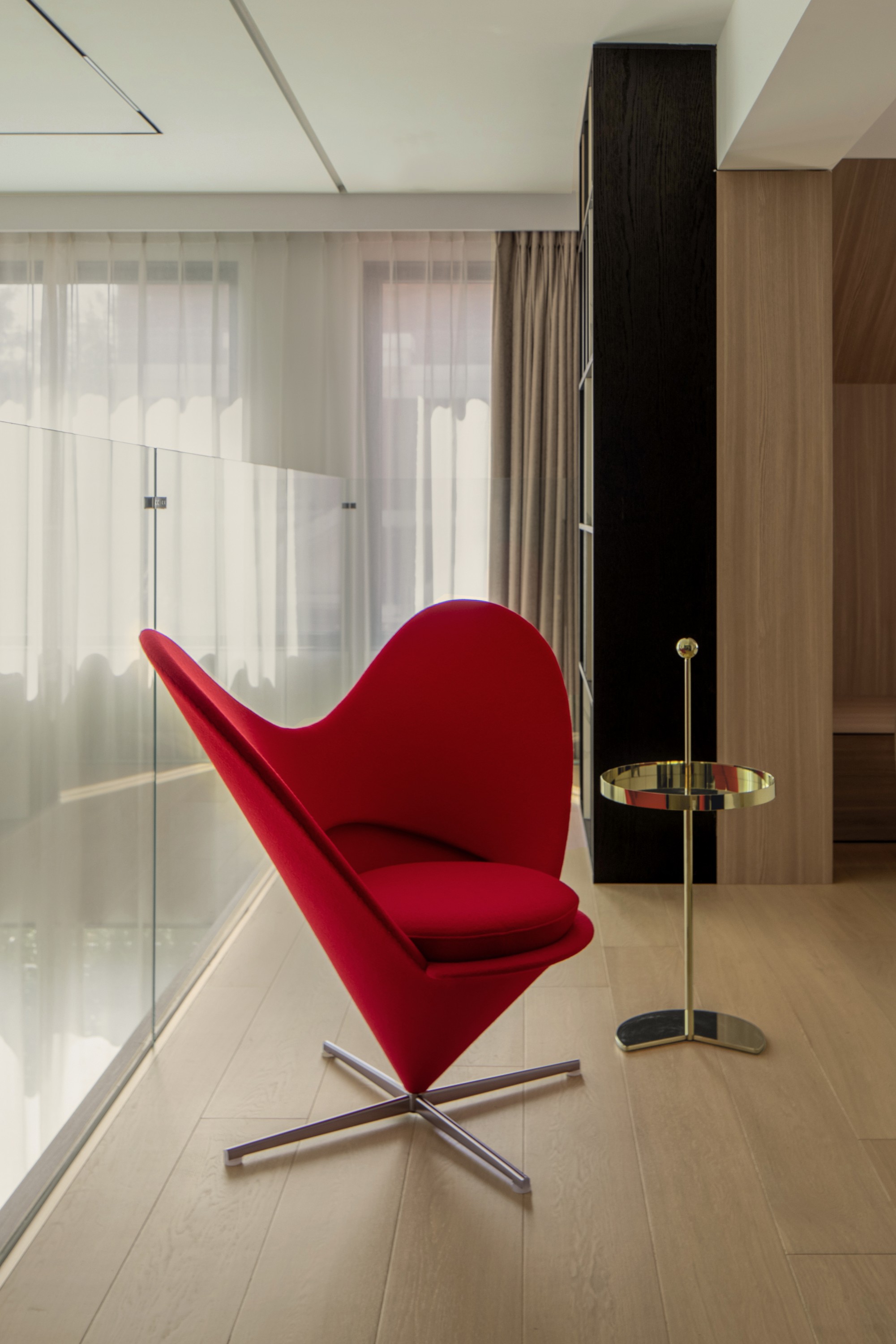 此处直面挑空,与楼下保持着若有似无的视觉联系。他们可以在此品茗阅读,或只是并肩看一部电影,共享一段不被干扰的静谧时光。