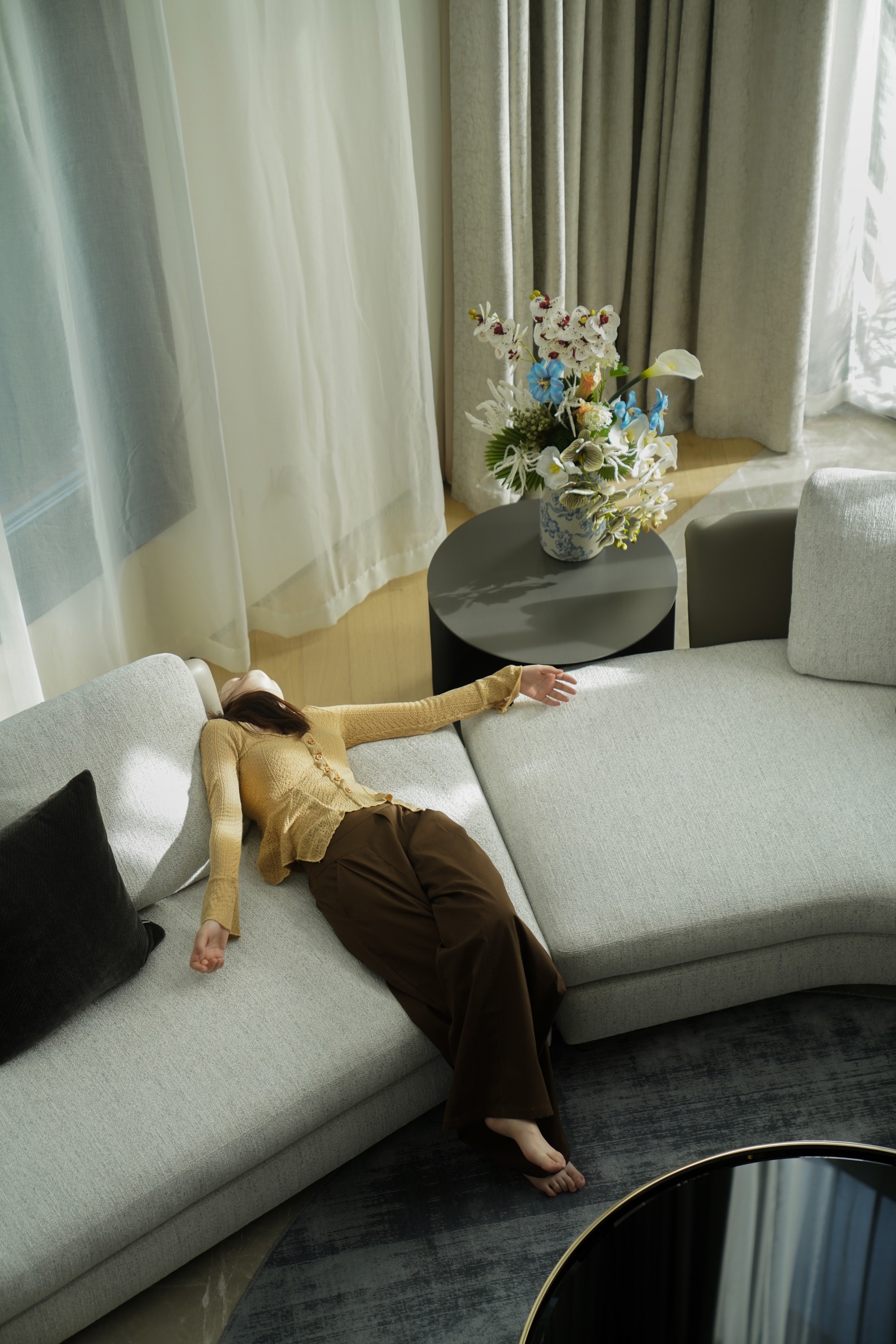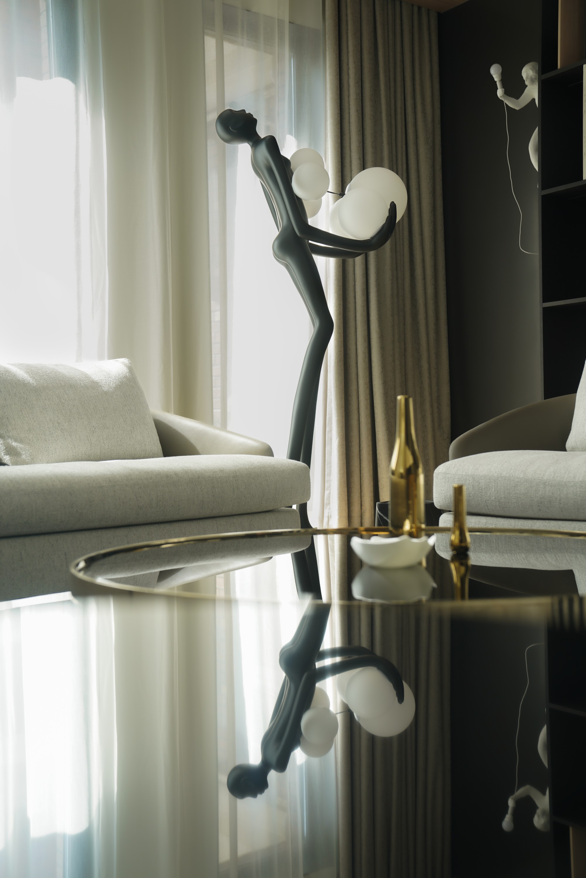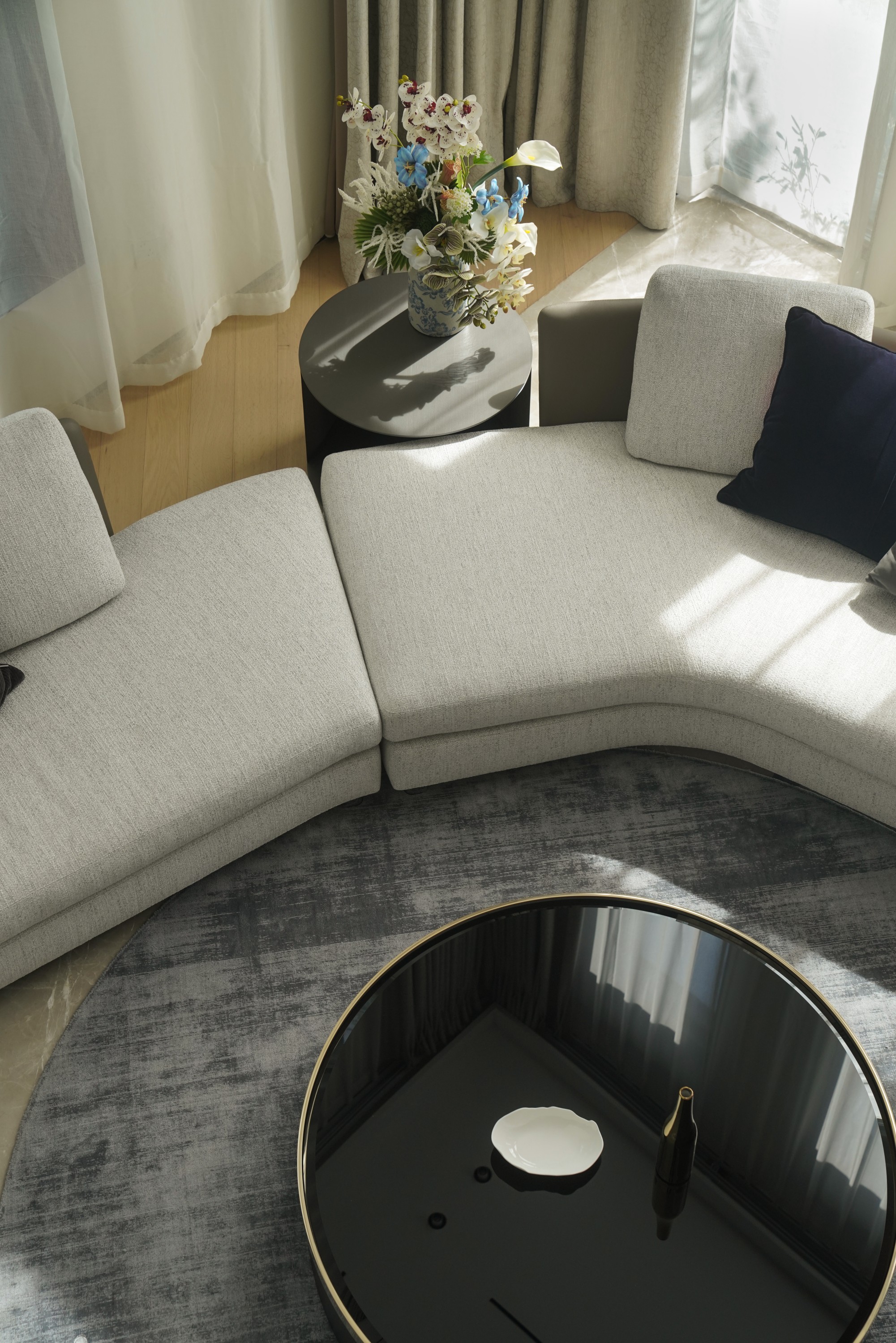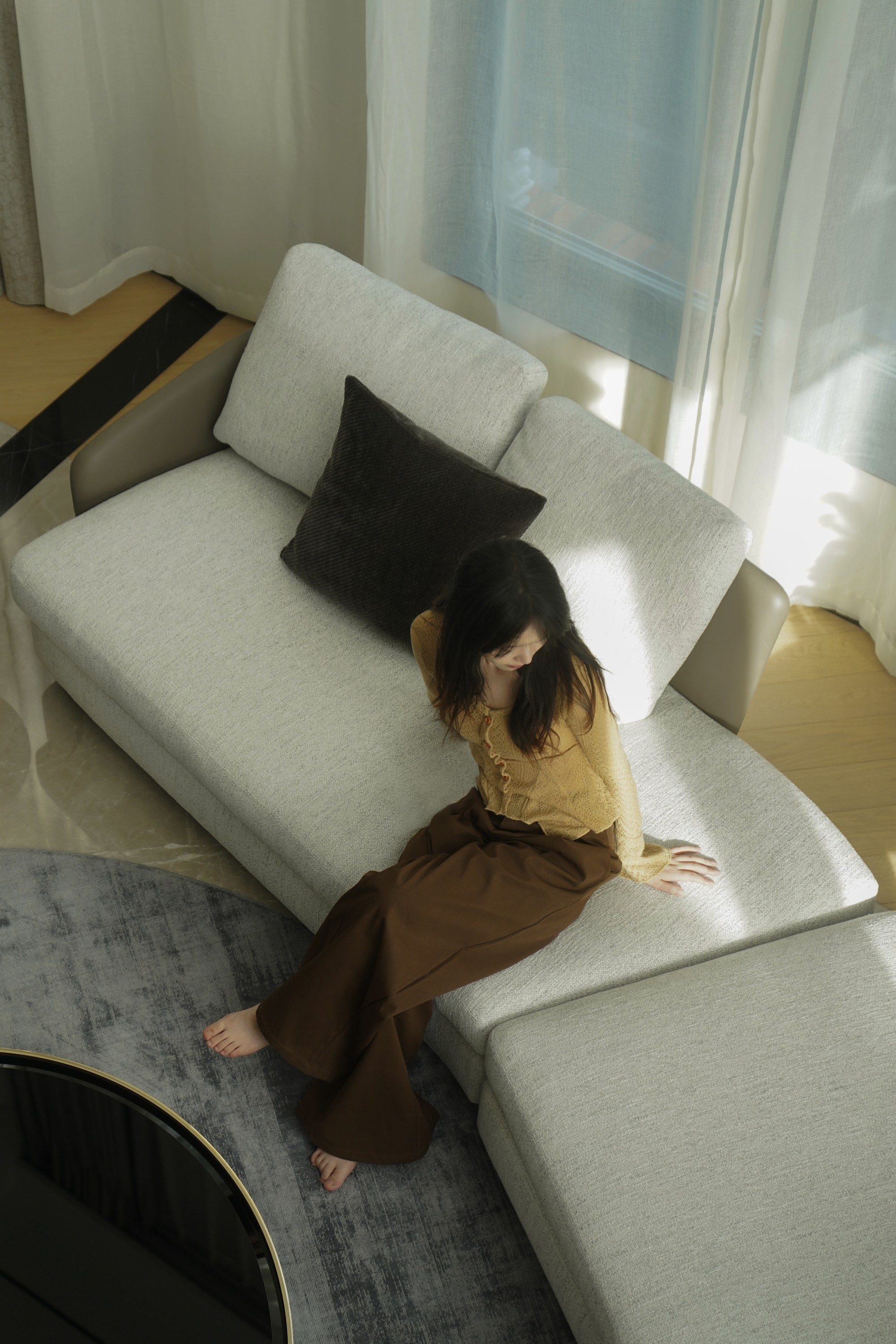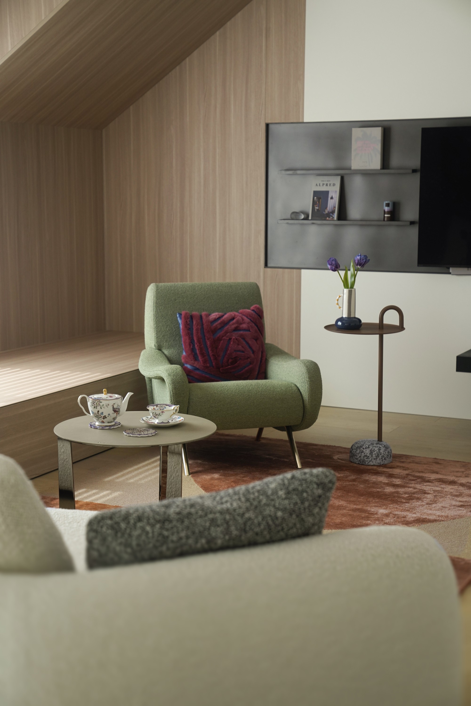 此处直面挑空,与楼下保持着若有似无的视觉联系。他们可以在此品茗阅读,或只是并肩看一部电影,共享一段不被干扰的静谧时光。