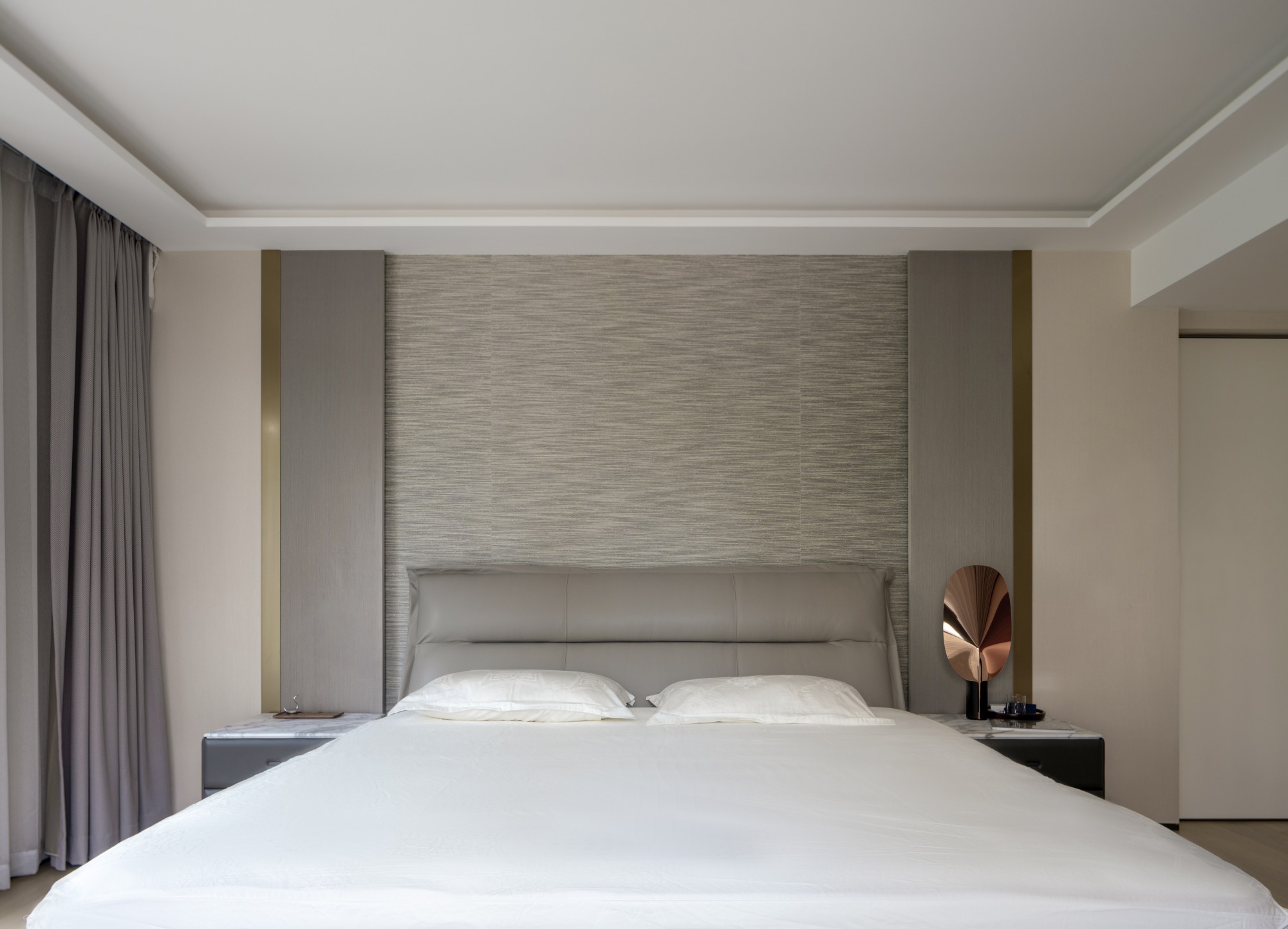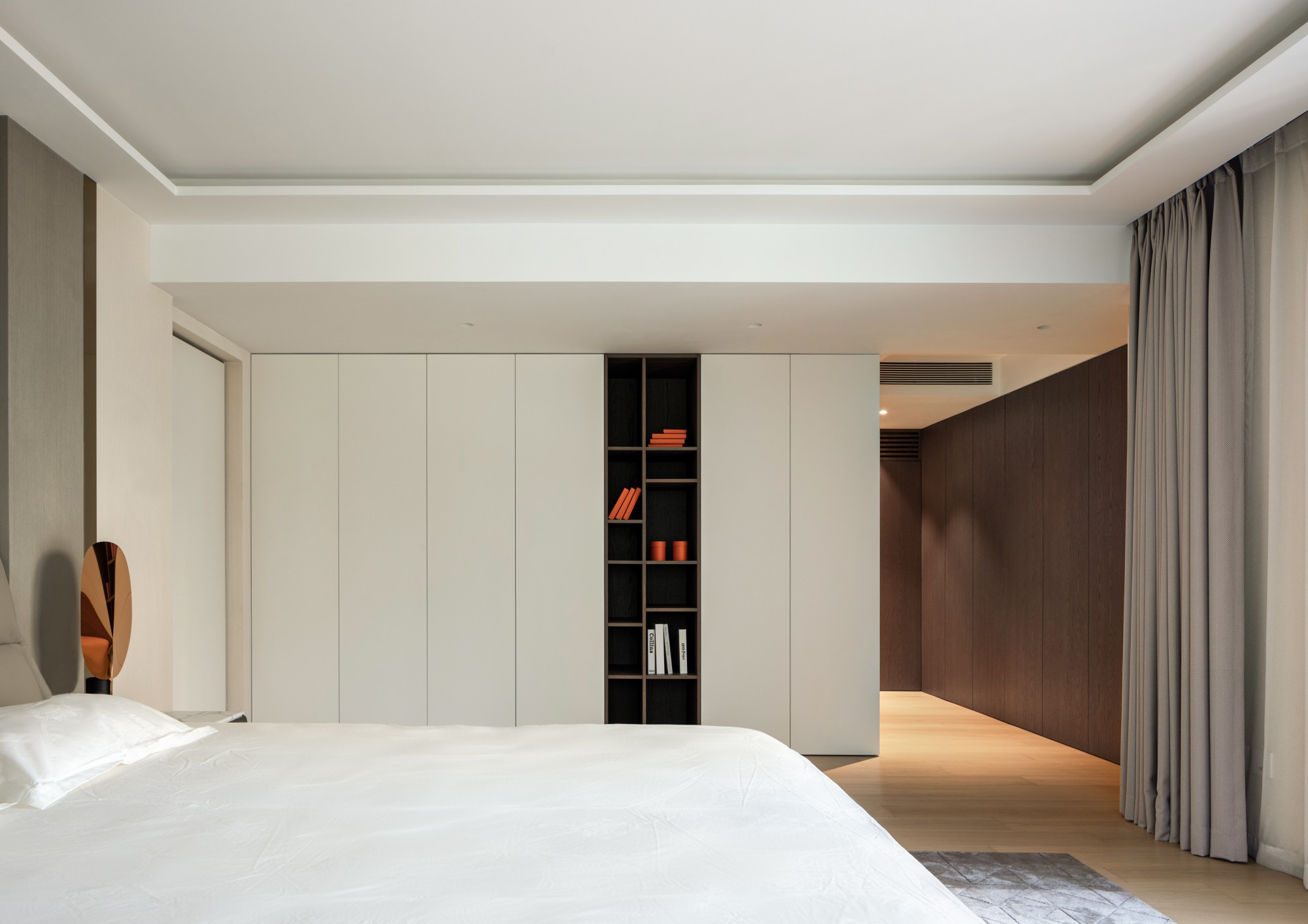 主卧套间: 极致简约中蕴藏着对质感的苛求。佐敦涂料的墙面触摸时有细腻的肌肤感,厘芈定制的寝具提供云朵般的包裹感。这里没有任何冗余之物,只有有助于深度休息的宁静与舒适。