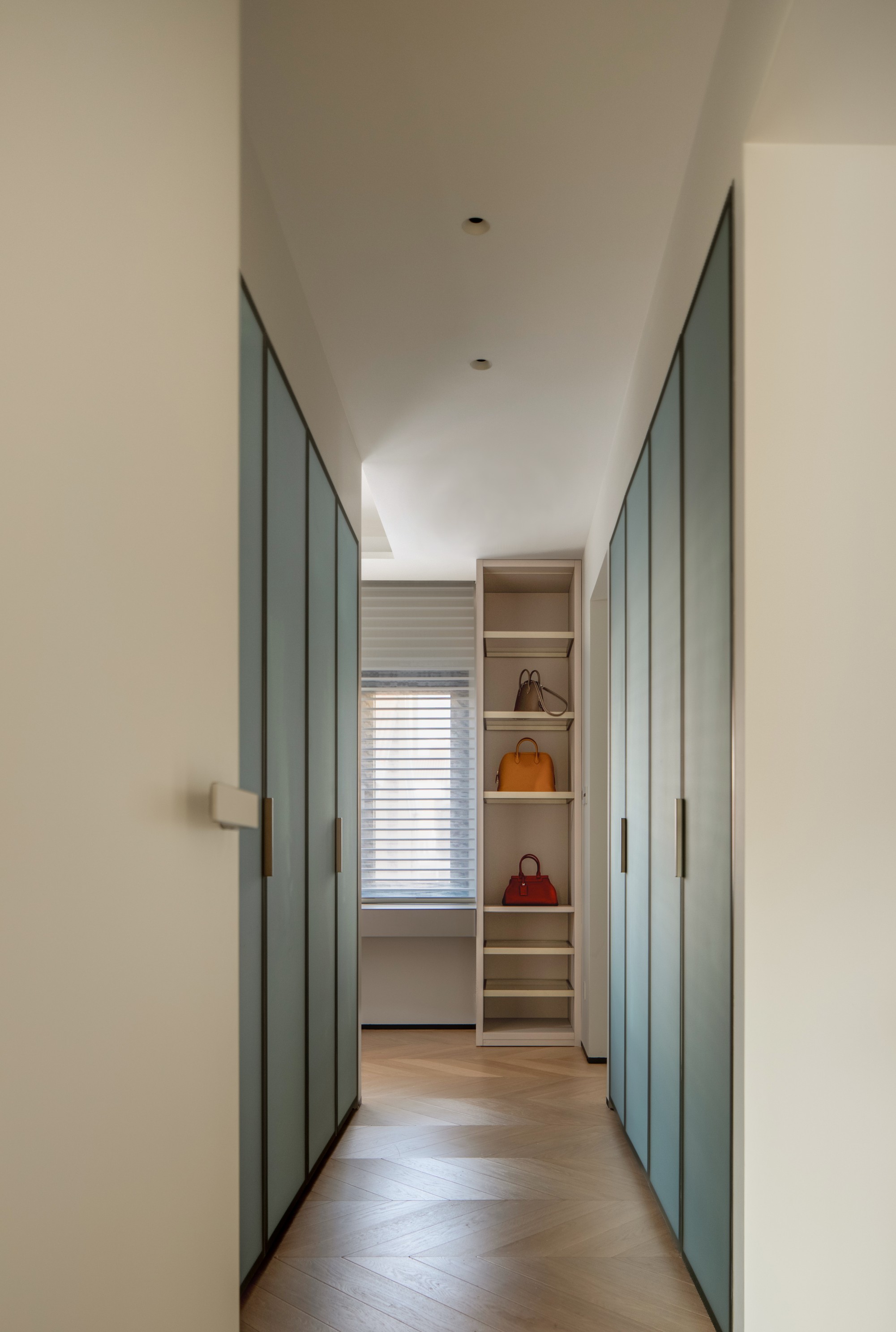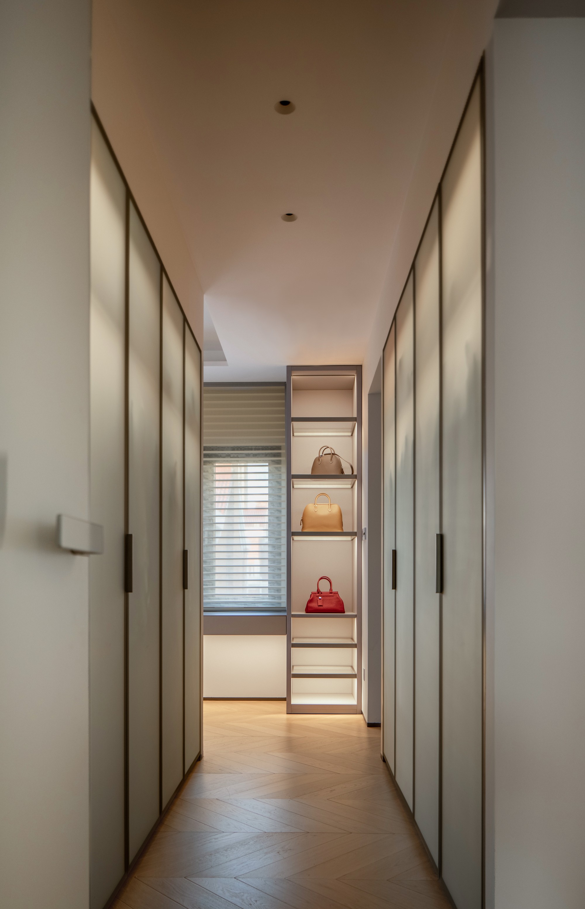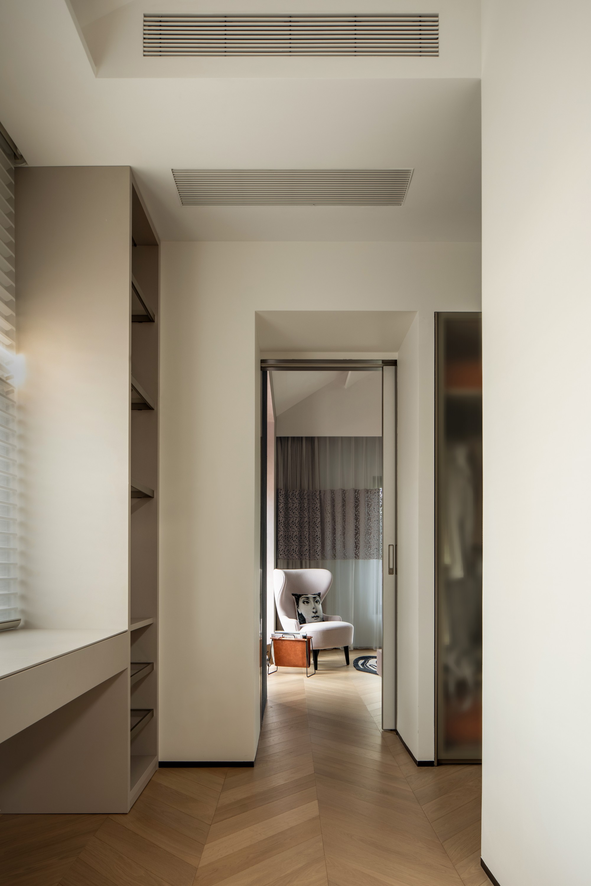 收纳化为一道道精准“暗线”:玄关壁柜、客厅格栅、衣帽间的开合对比……它们如空间标点,妥帖收束日常,让“空”与“净”承载从容生活。