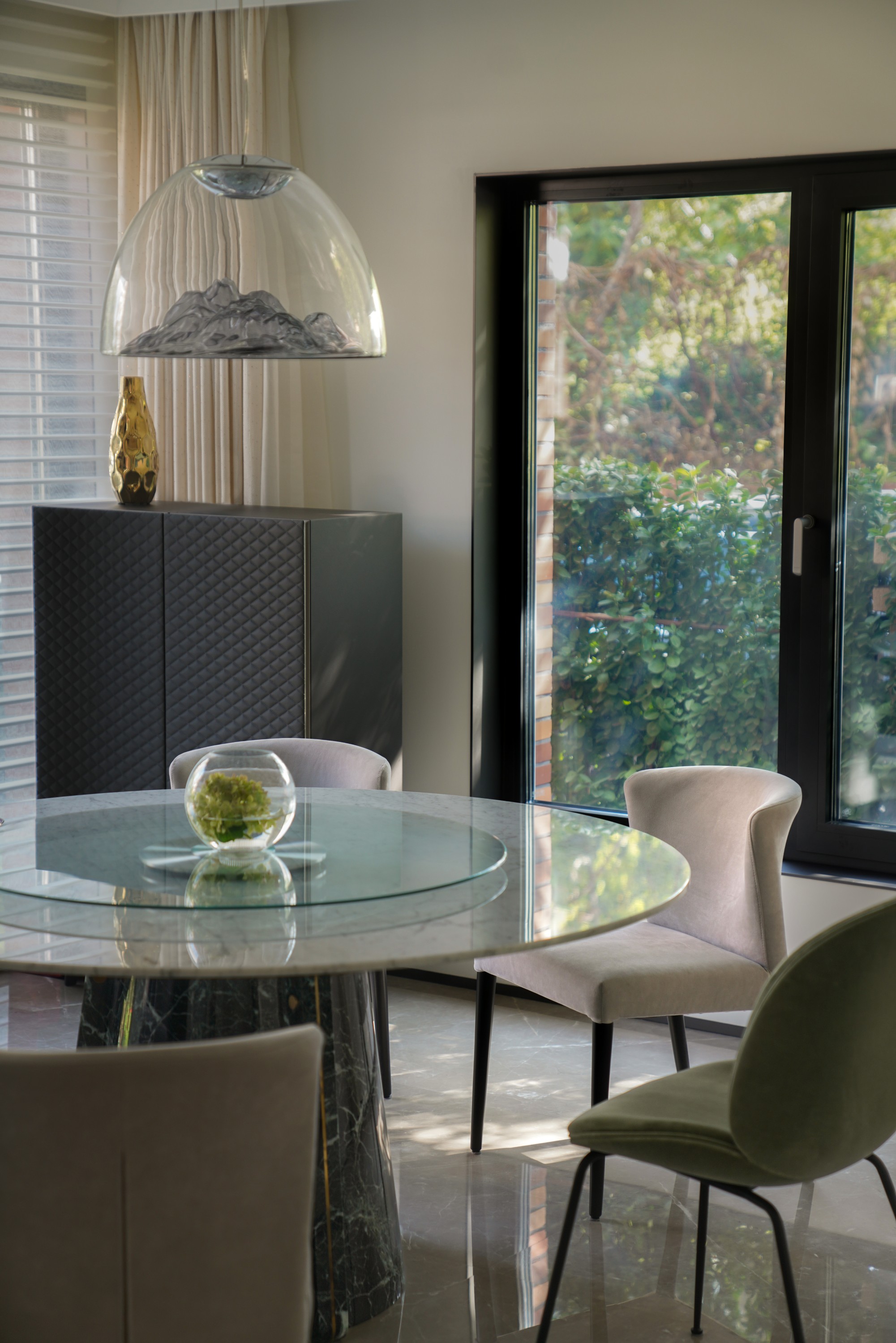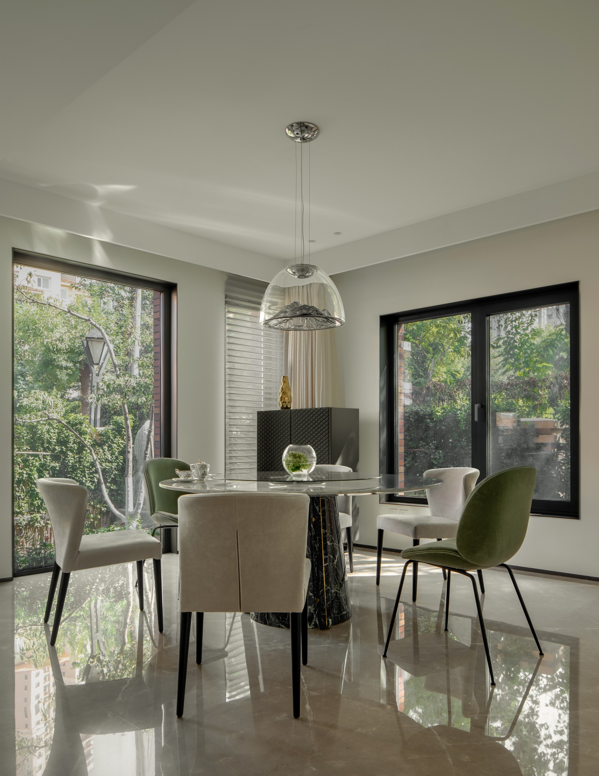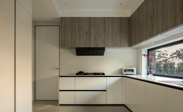 餐厅与厨房: 圆形餐桌凝聚家庭温度,两侧开窗借景庭院绿意。厨房操作区增设的条形窗,将光线与美景一并奉上。