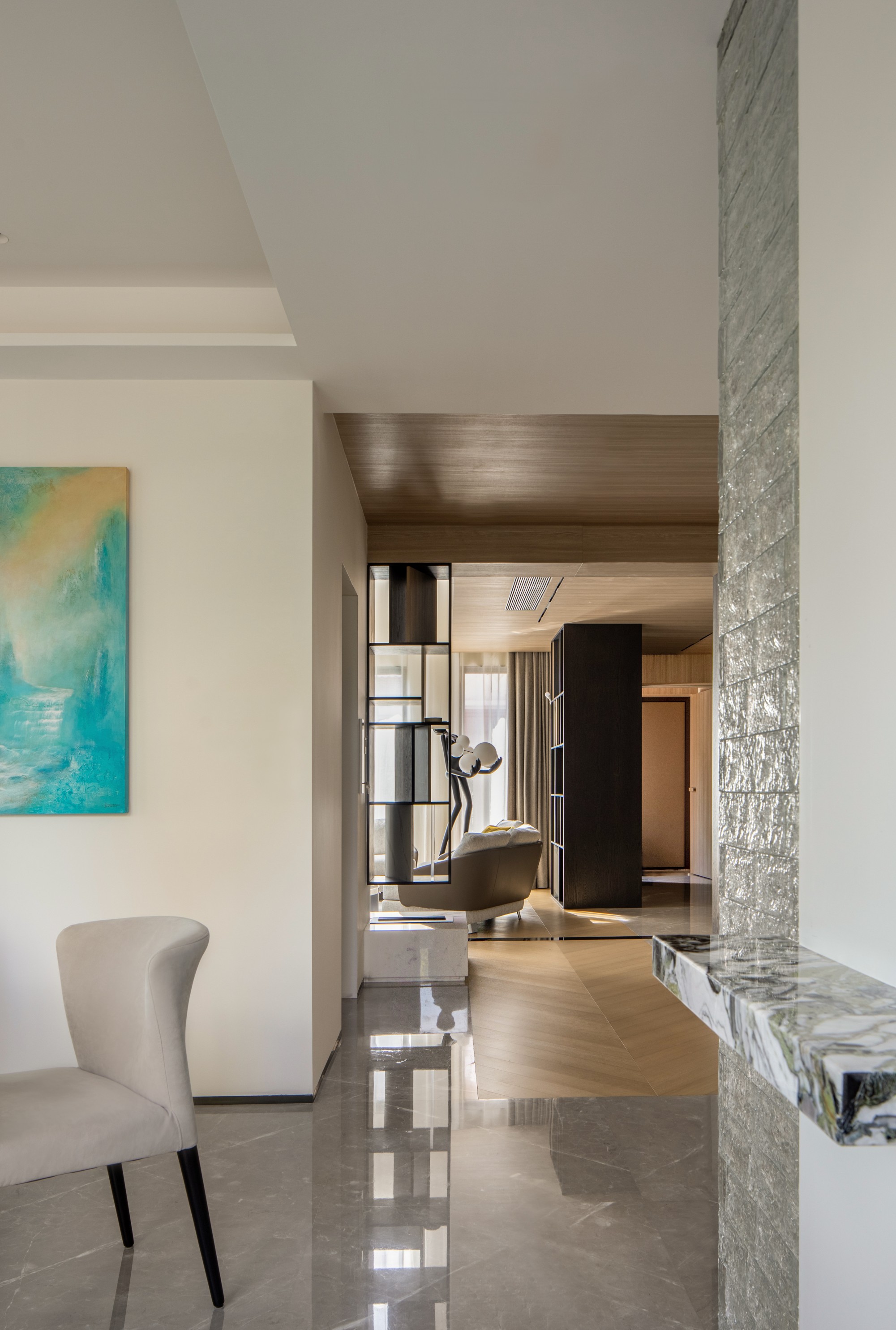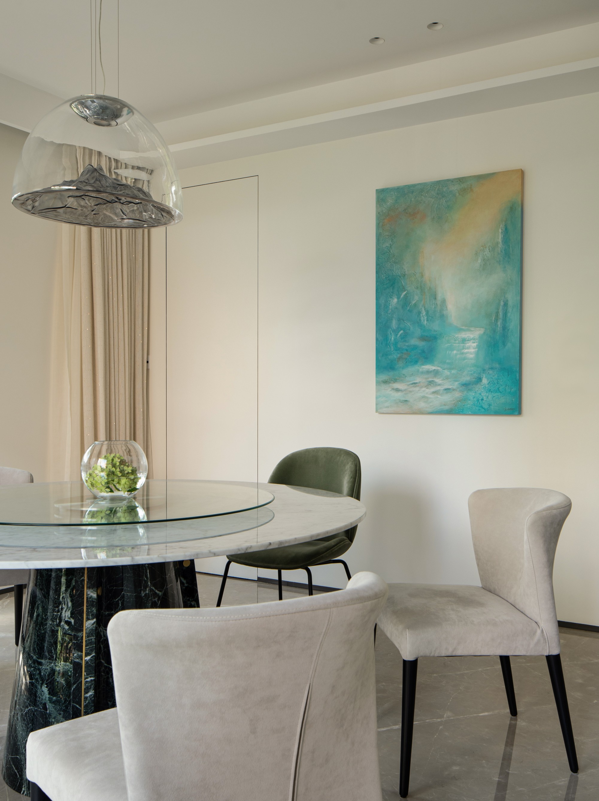 石材天然的纹理如水墨画般流淌,在光影下气韵生动,成为待客时无声的底蕴。极简的意式风骨,为这个家奠定了沉稳、高级的底色。