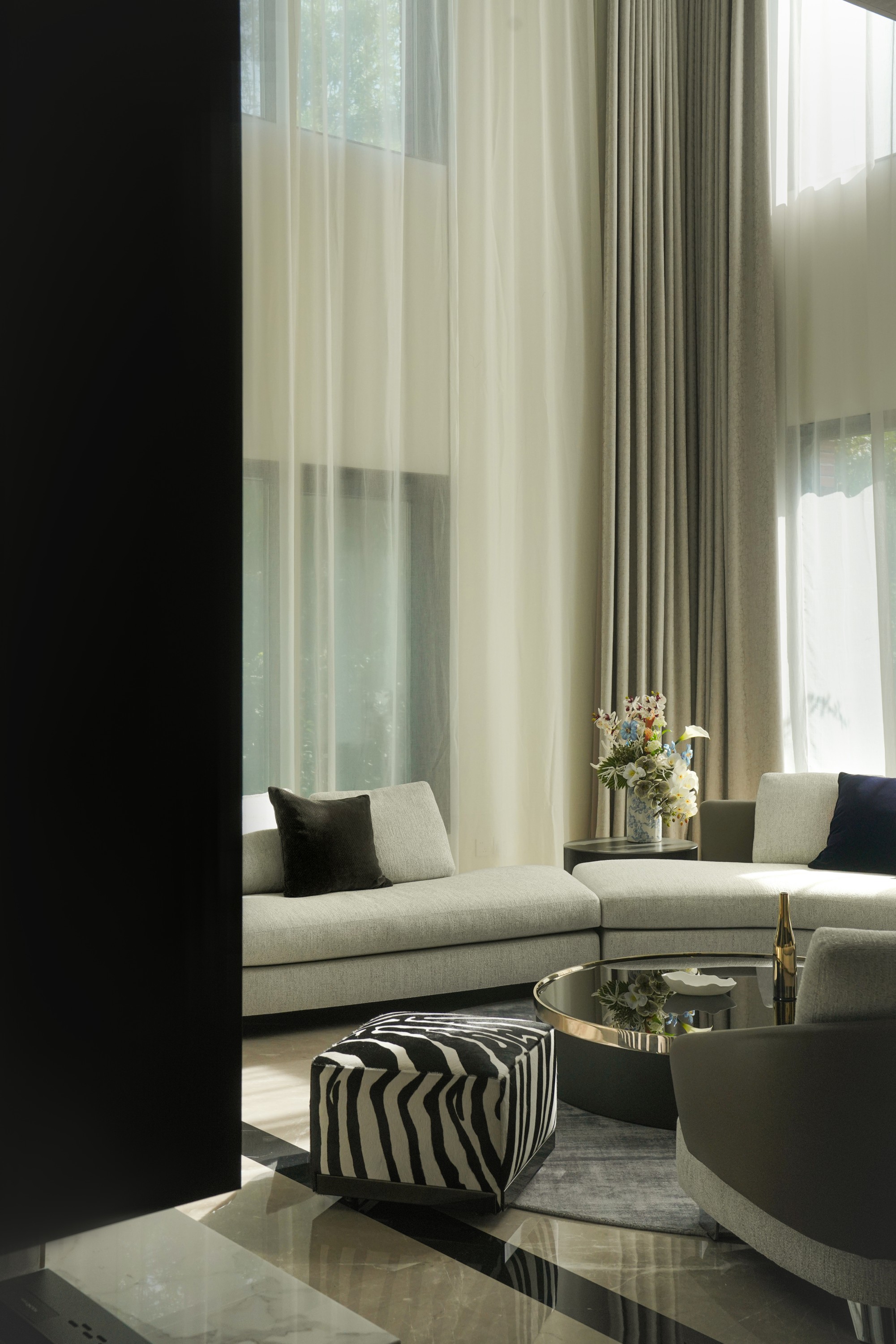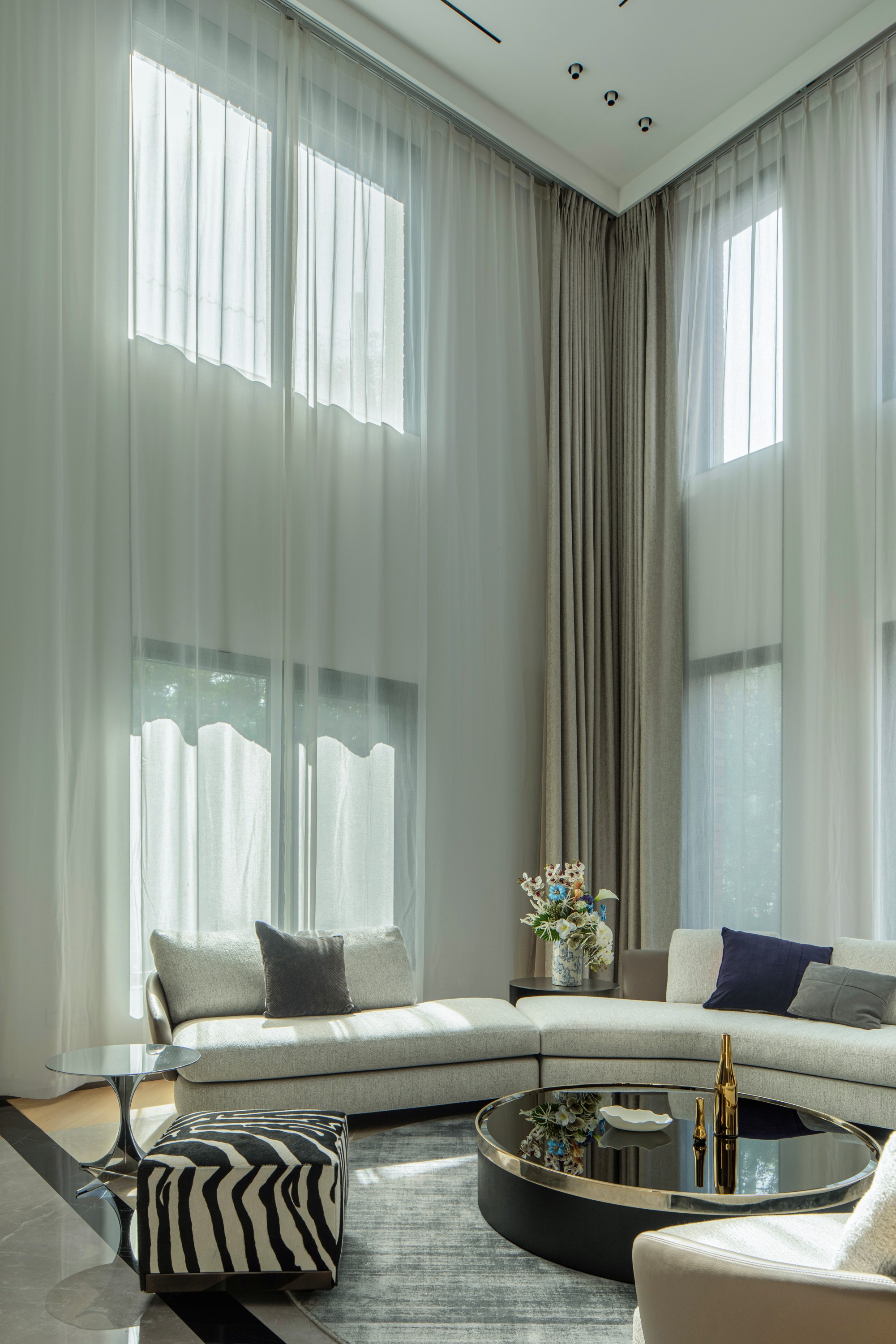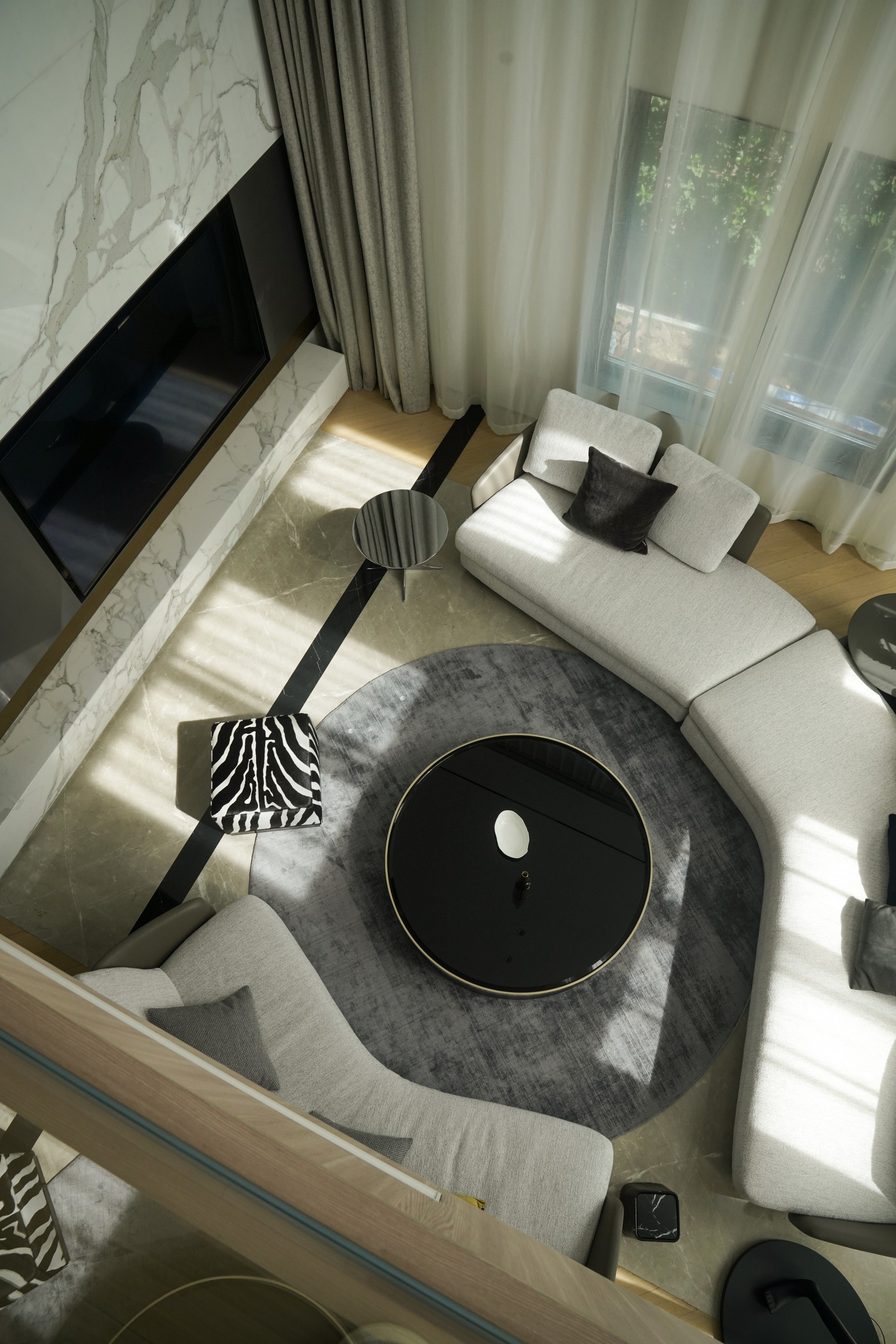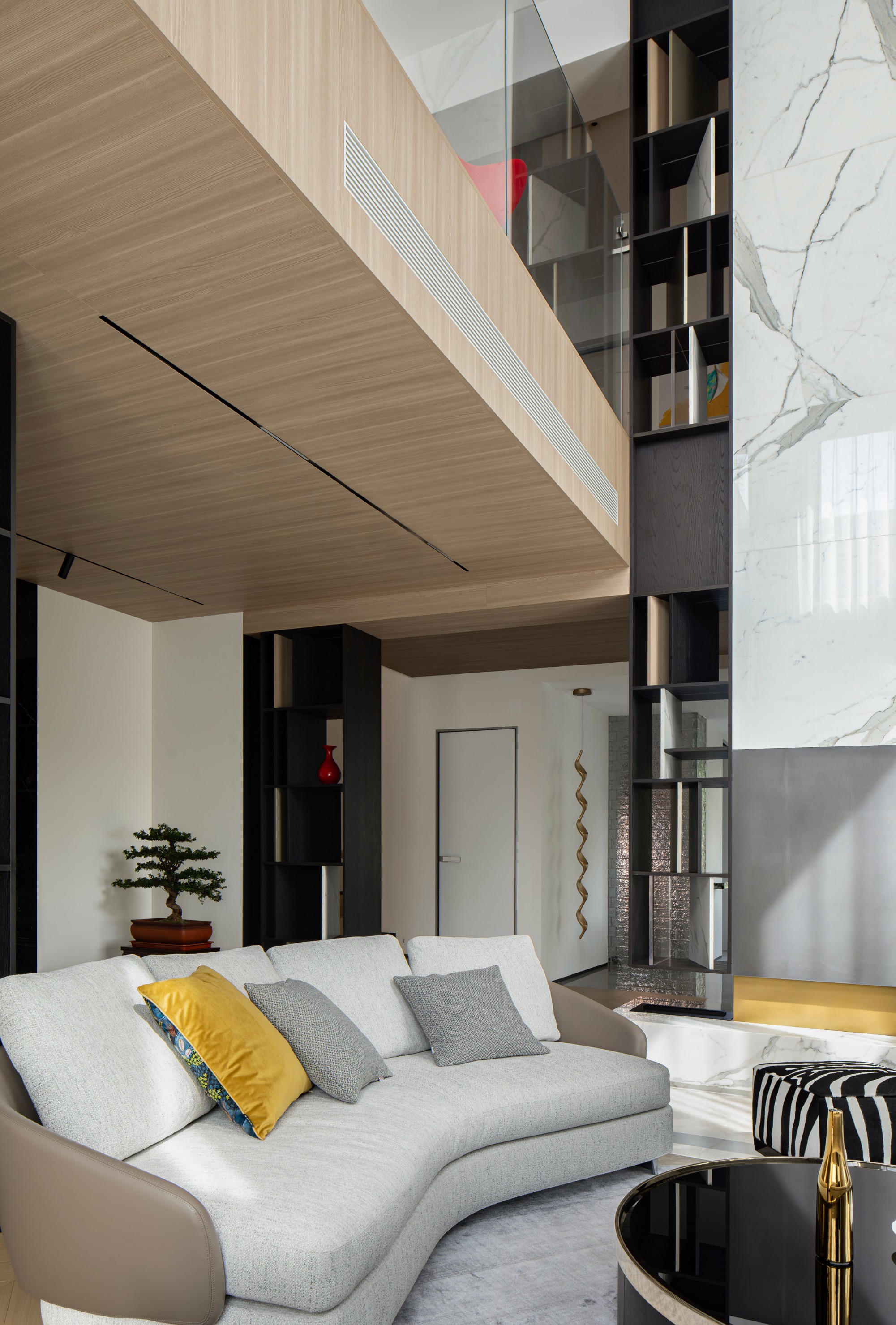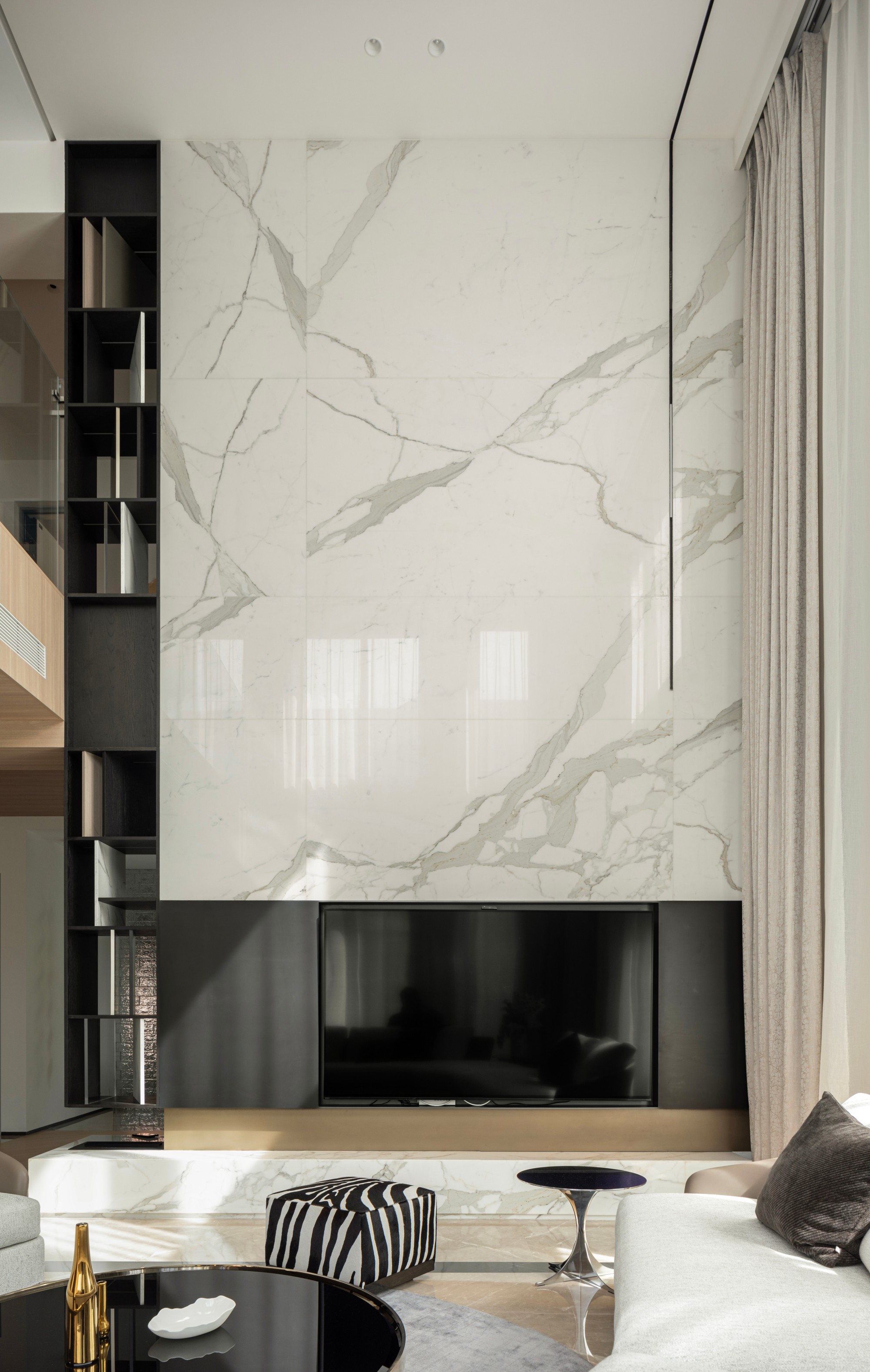 客厅: 挑空的气势被延展的线性细节平衡。那条核心的视觉线索,引导目光掠过质感沙发,最终落于整面万里石电视墙上。