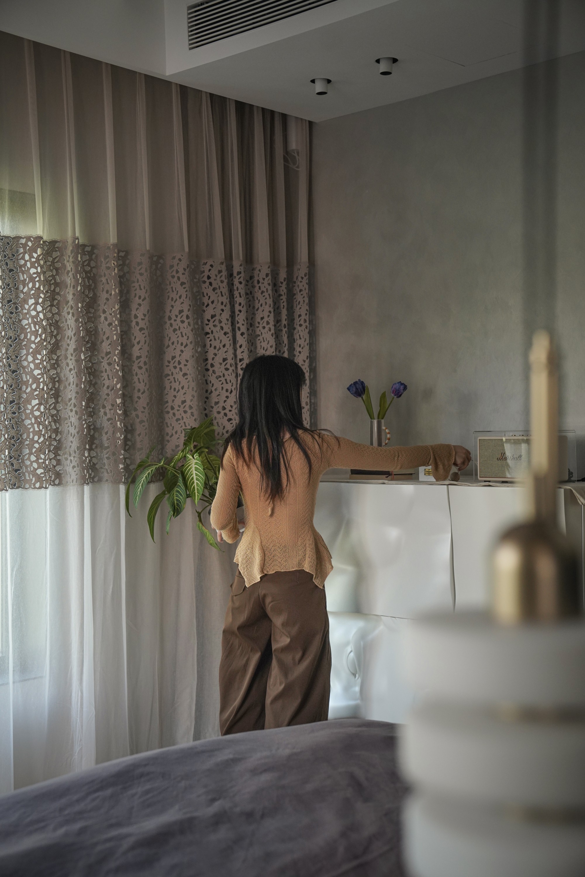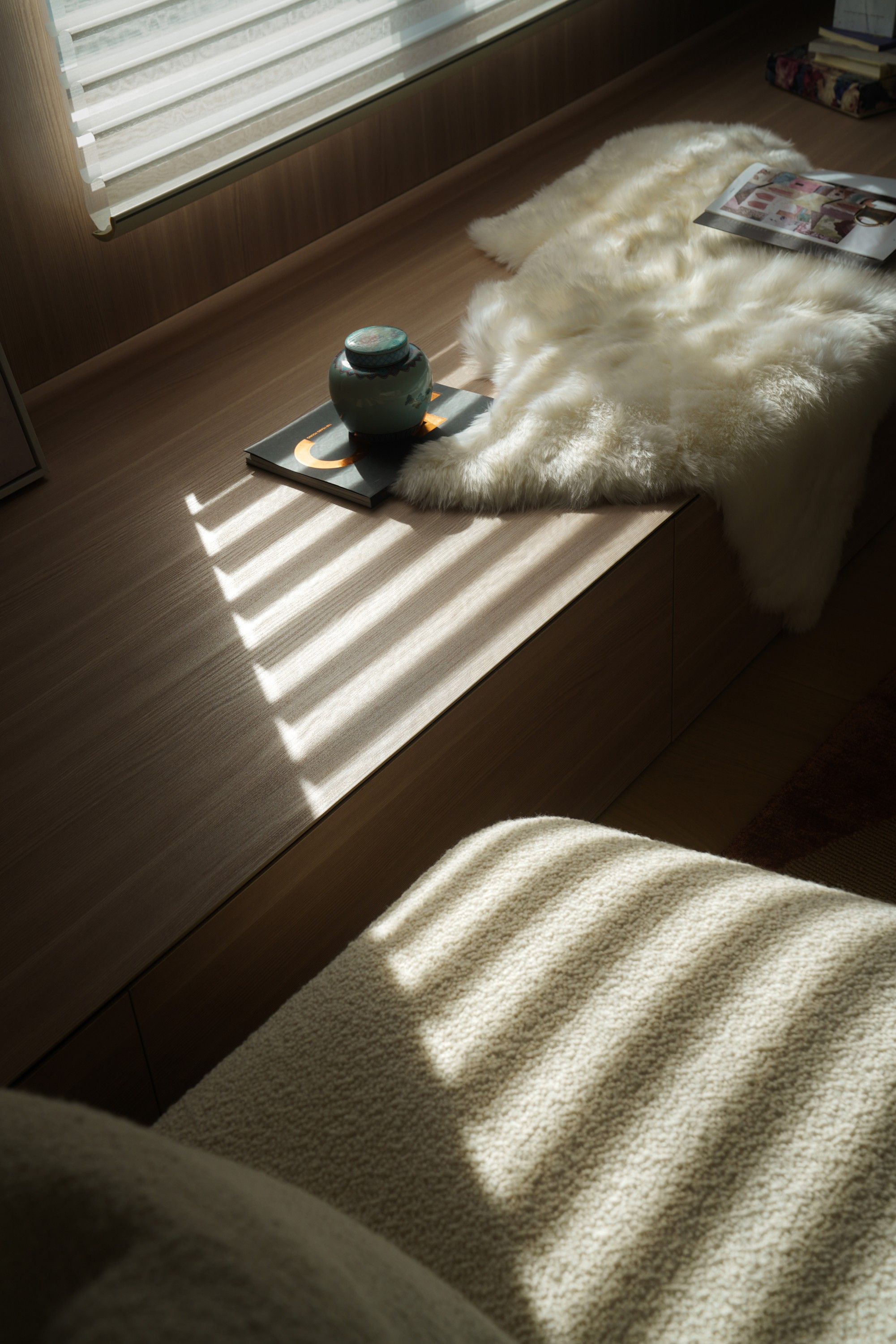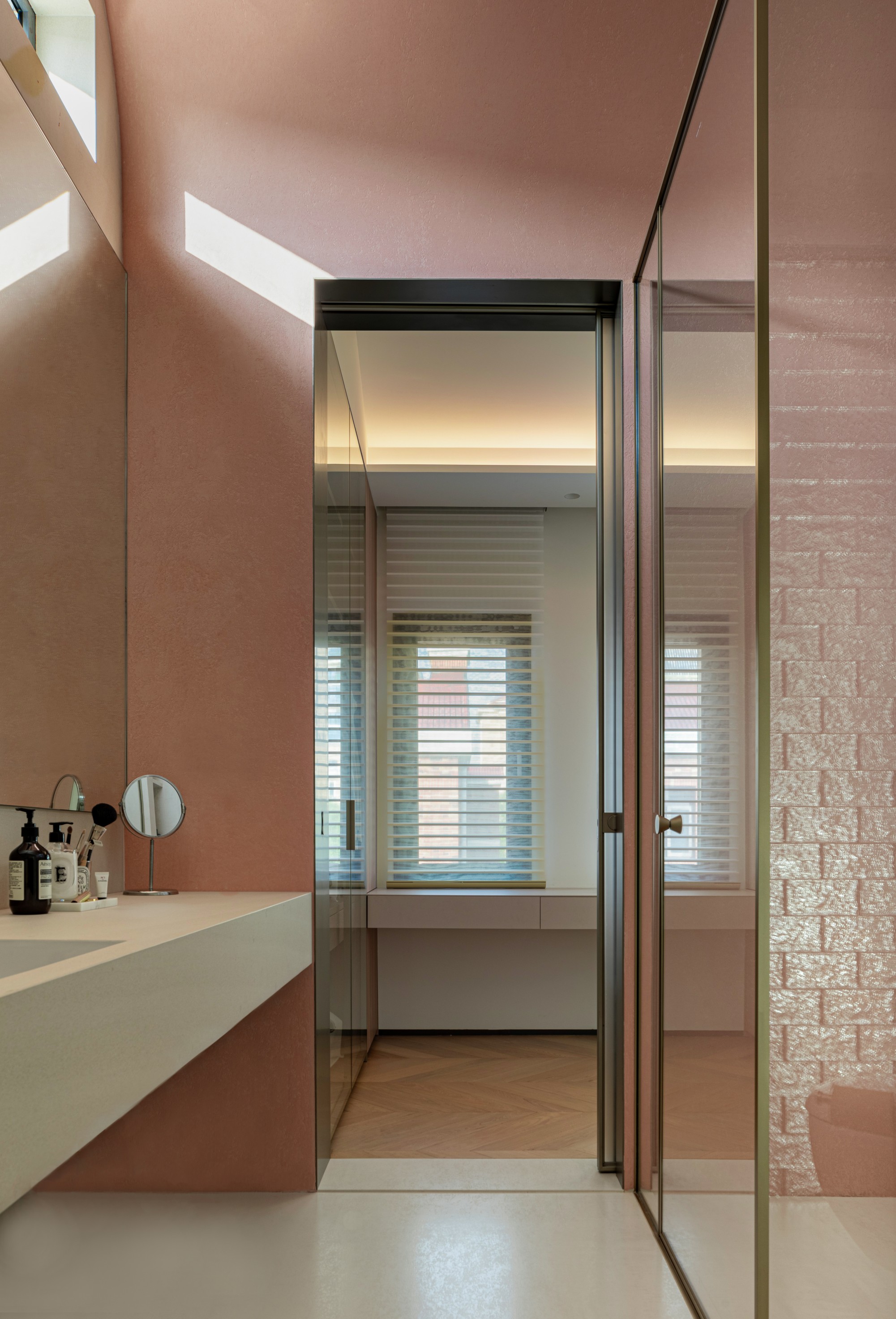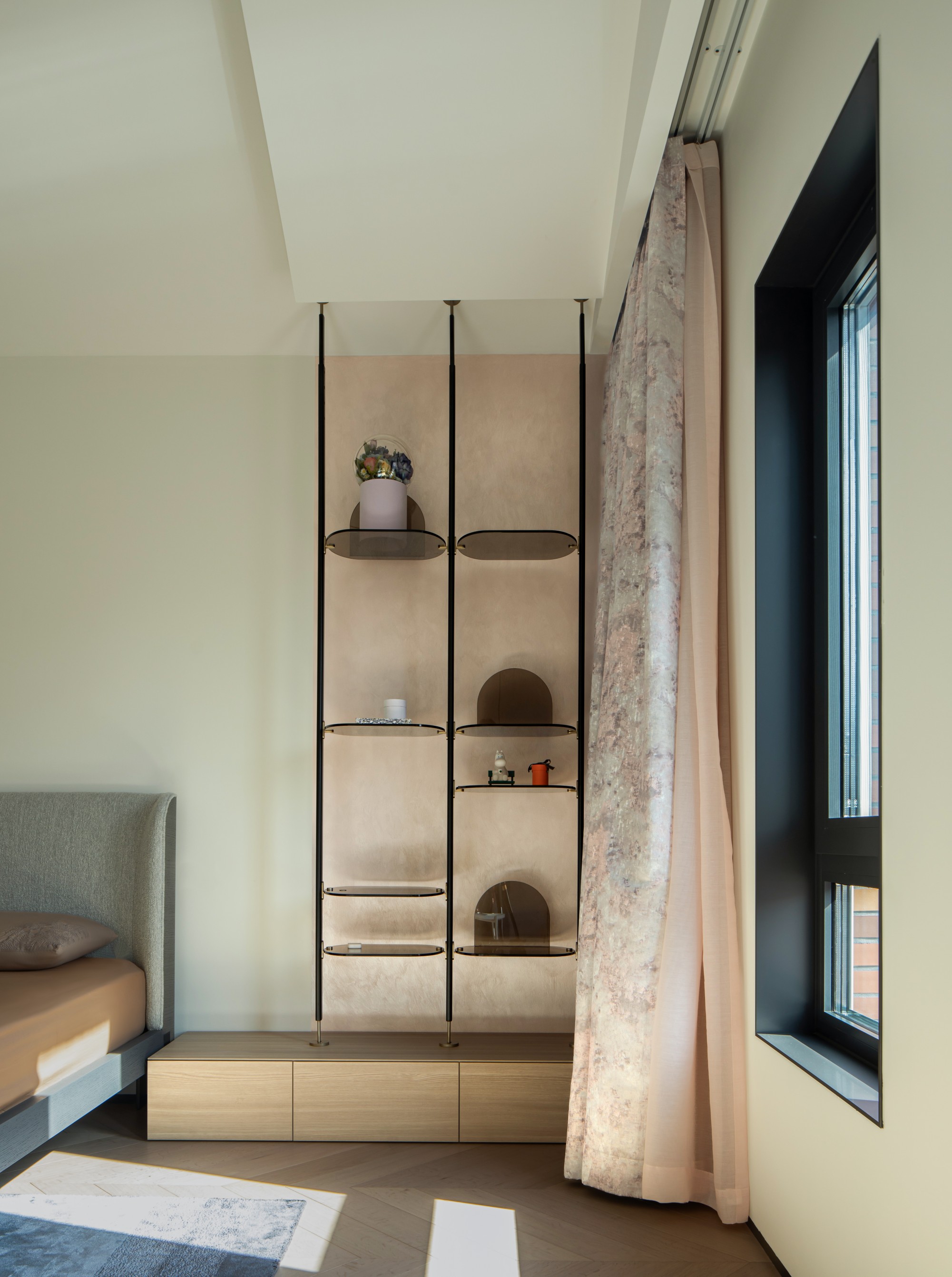 超长窗边化妆台是她的专属舞台,开放式柜格陈列着心爱之物与收藏。
