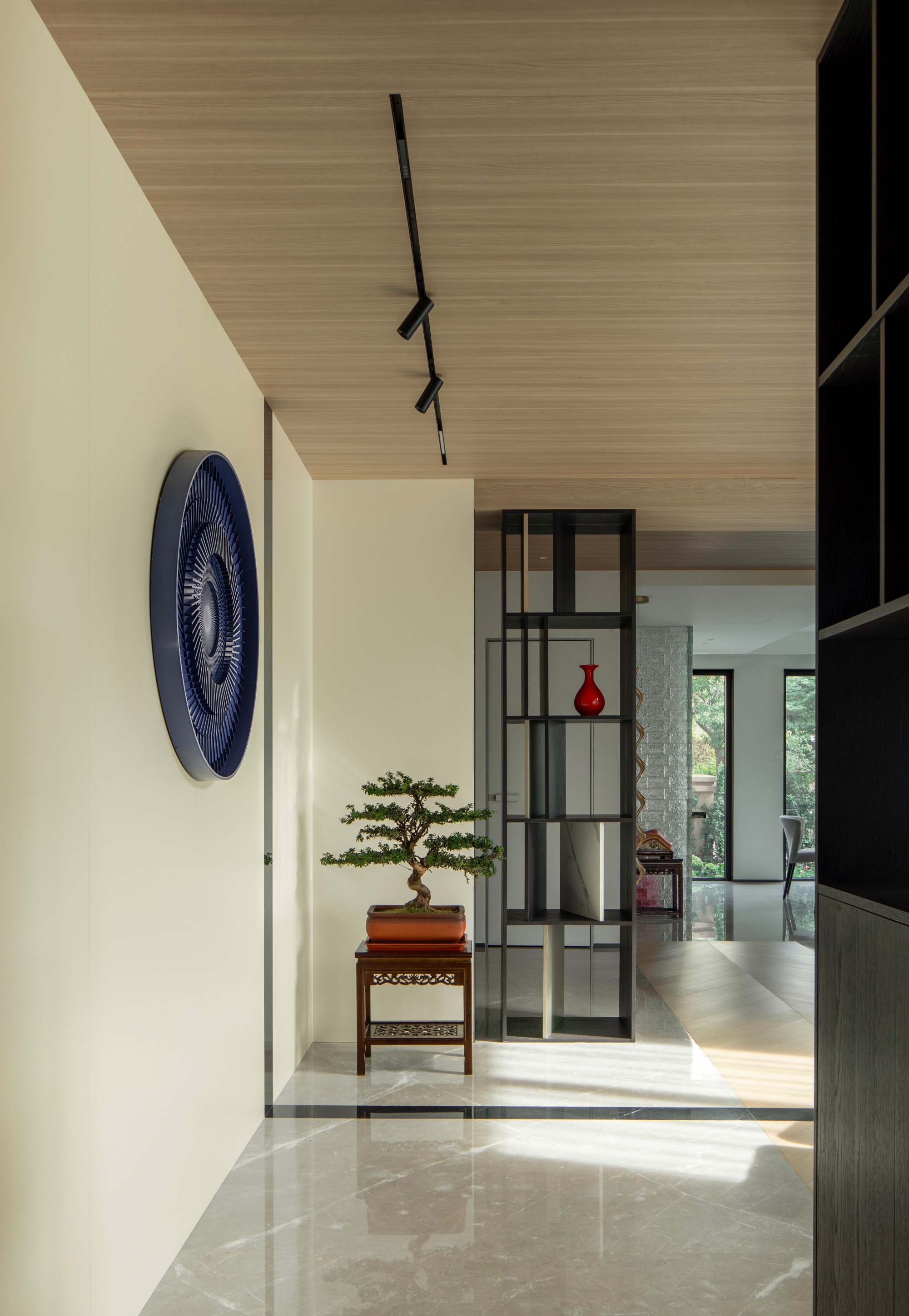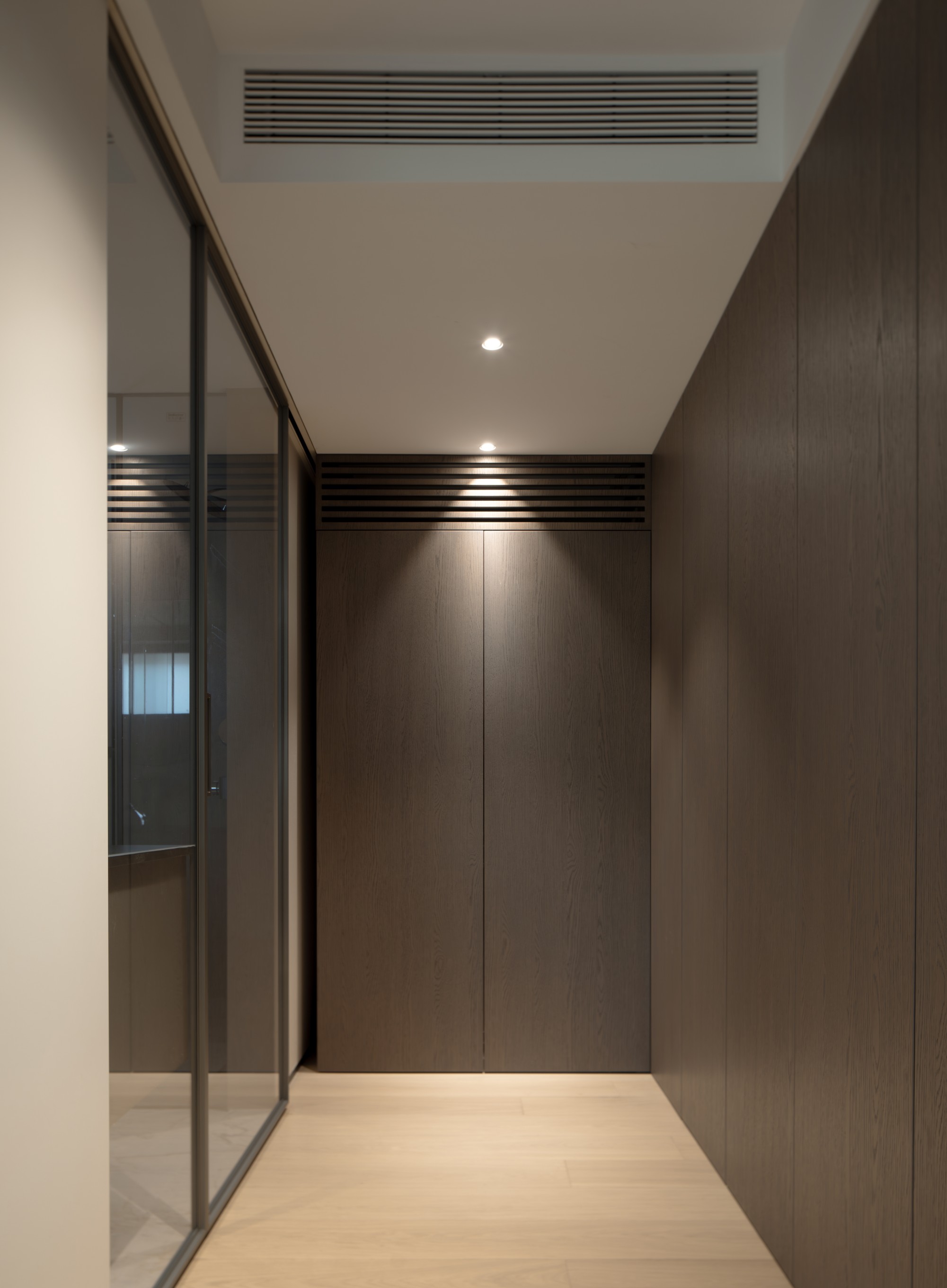 F1:仪式感与共享的艺术 玄关 : 入户即增设系统化收纳与舒适换鞋区,在进门瞬间奠定家的仪式与格调,将外套、鞋履与尘嚣一并妥帖收纳。