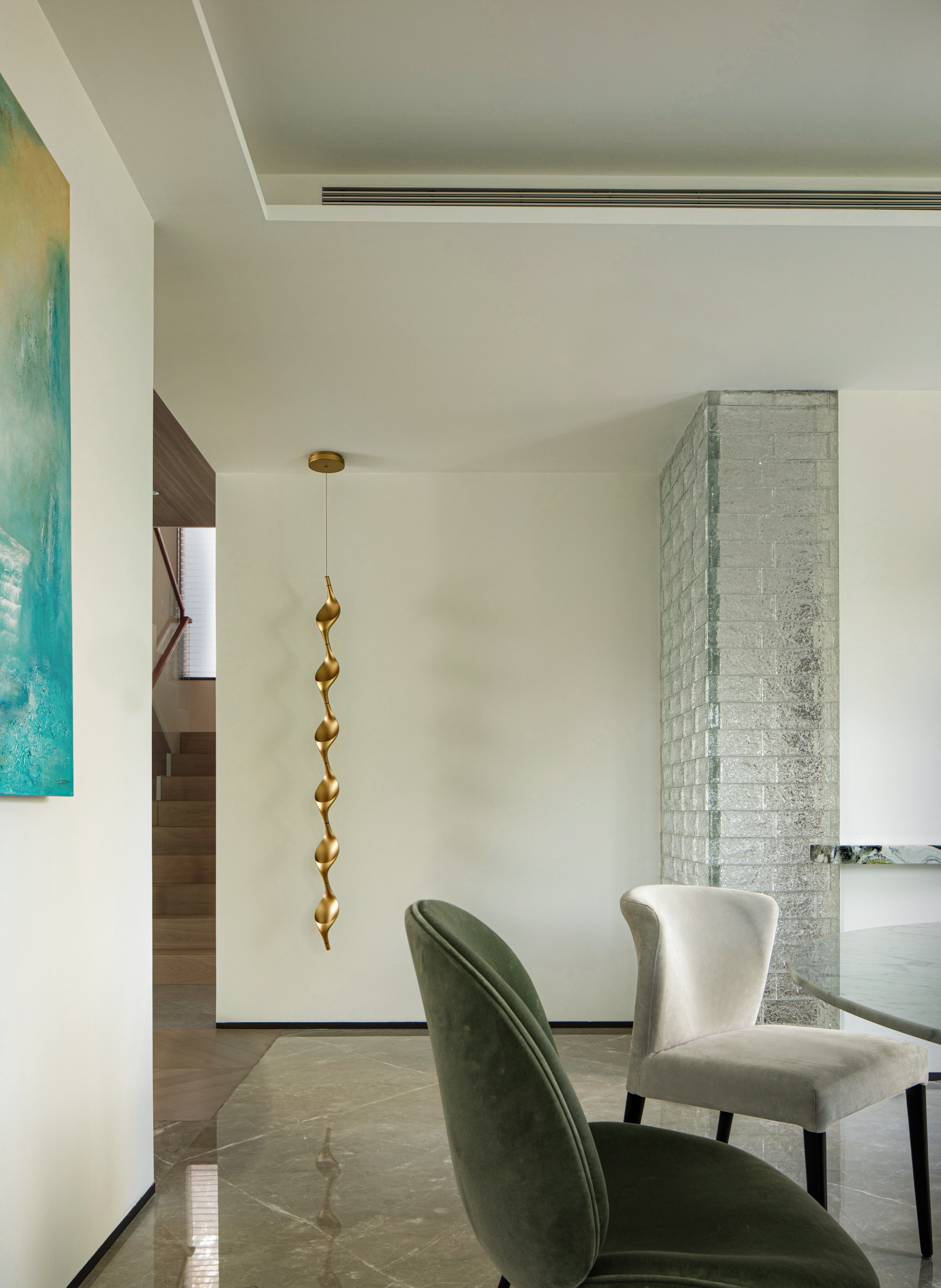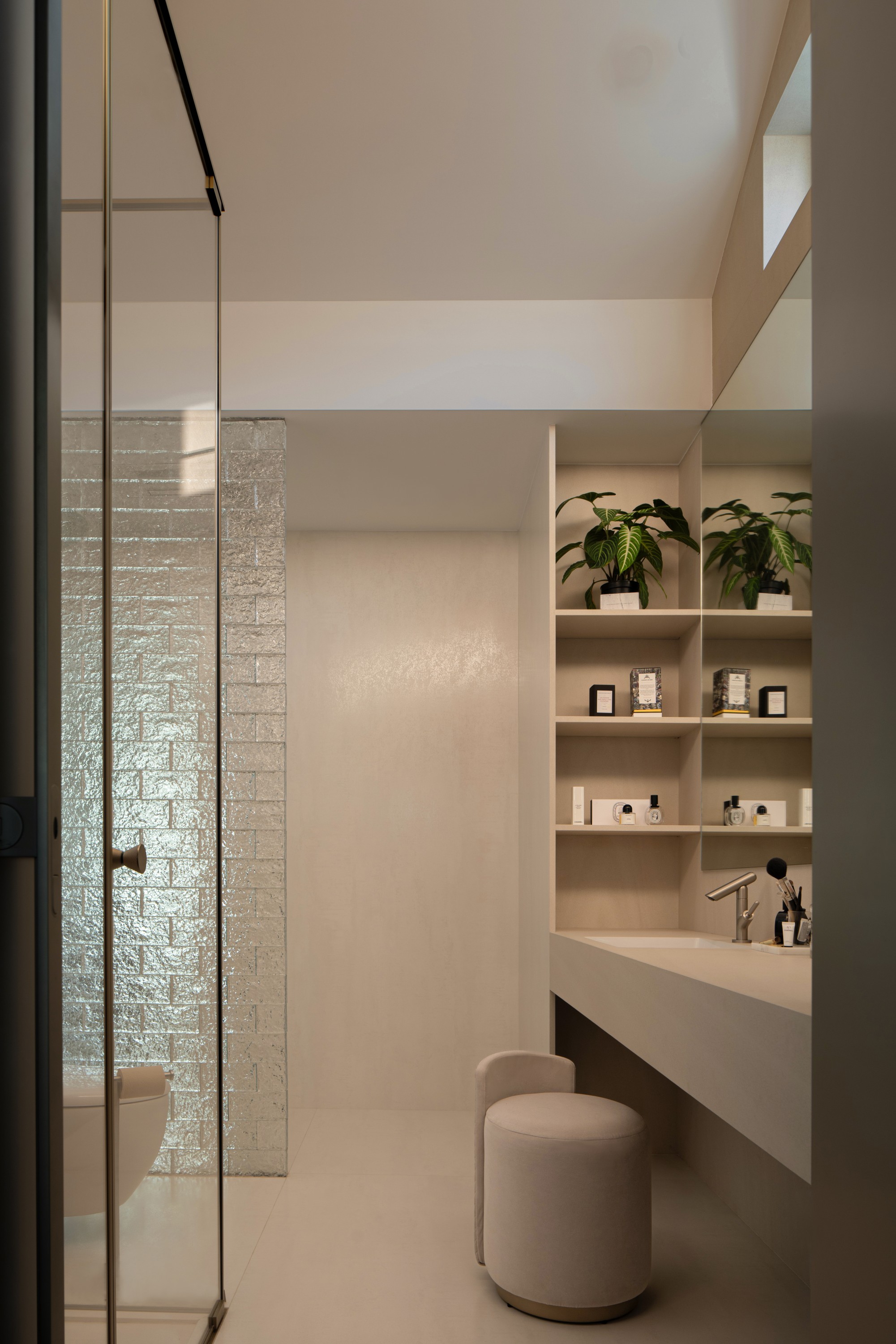 那道玻璃砖墙是点睛之笔,区隔了油烟与宁静,却让光线与备餐时的身影成为一种朦胧的家庭剧场,温馨而雅致。