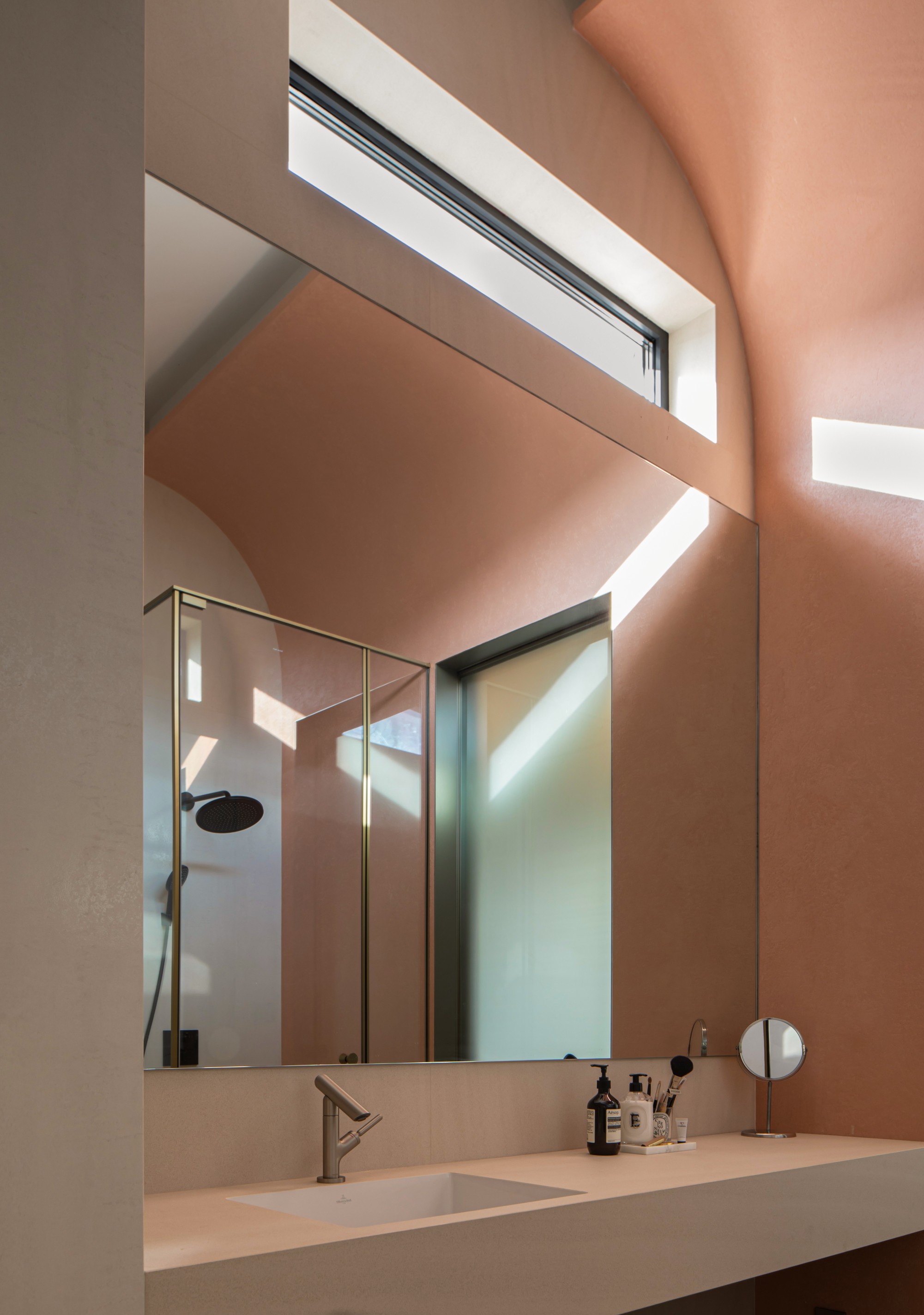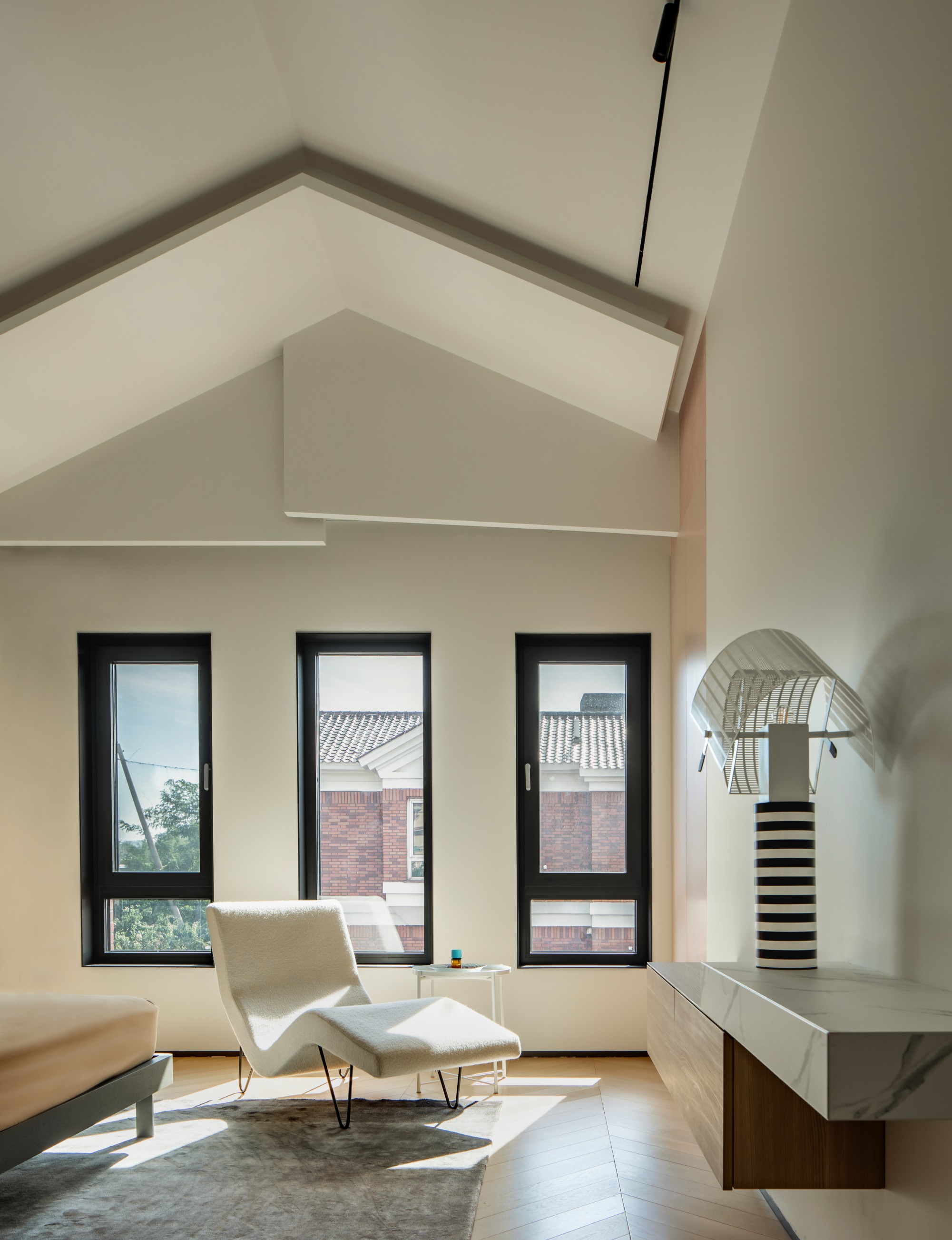 卫生间内,那道顺应斜顶勾勒的弧形天窗线,将阳光与星空引入,私密空间瞬间拥有了诗意的浪漫。