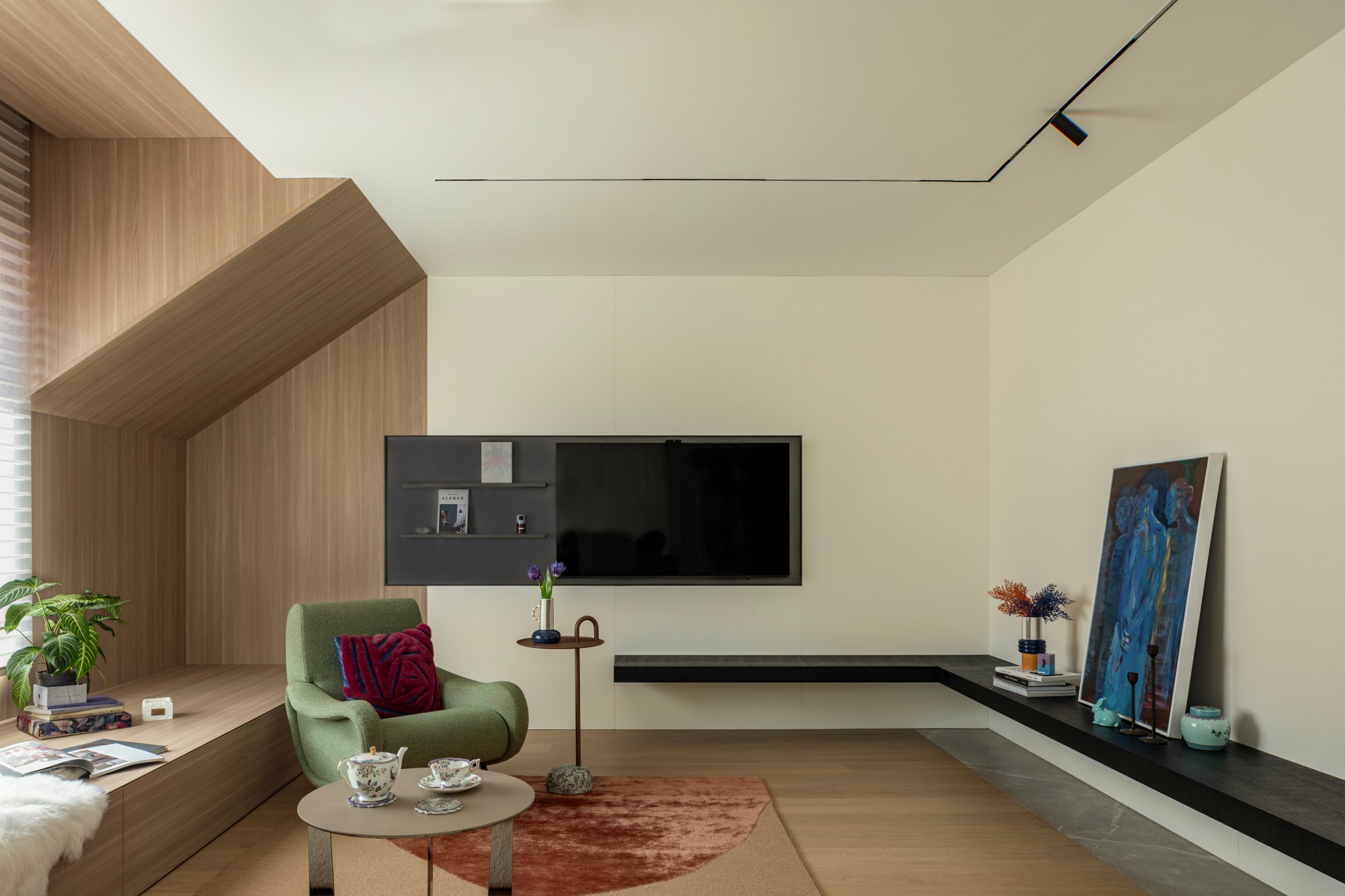F2:伴侣的私享领域 家庭厅: 这是专属于夫妻二人的“第二客厅”。这里融合了喝茶、阅读、观影、手工与瑜伽功能。 阳光透过窗户洒入,温暖惬意,是家中最富生活气息的角落。一整面线性书架墙,收纳着书籍、旅行纪念与手工材料。
