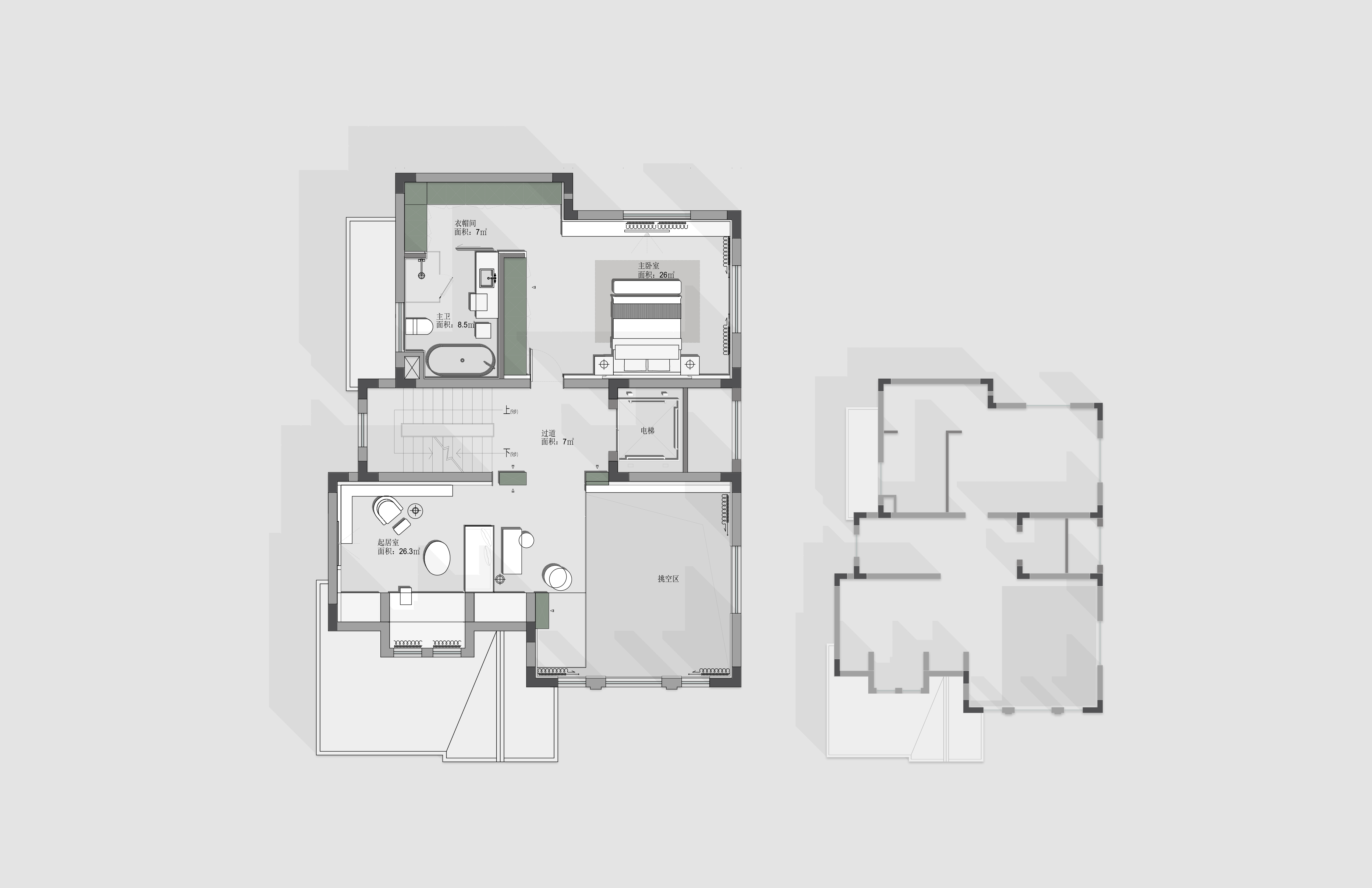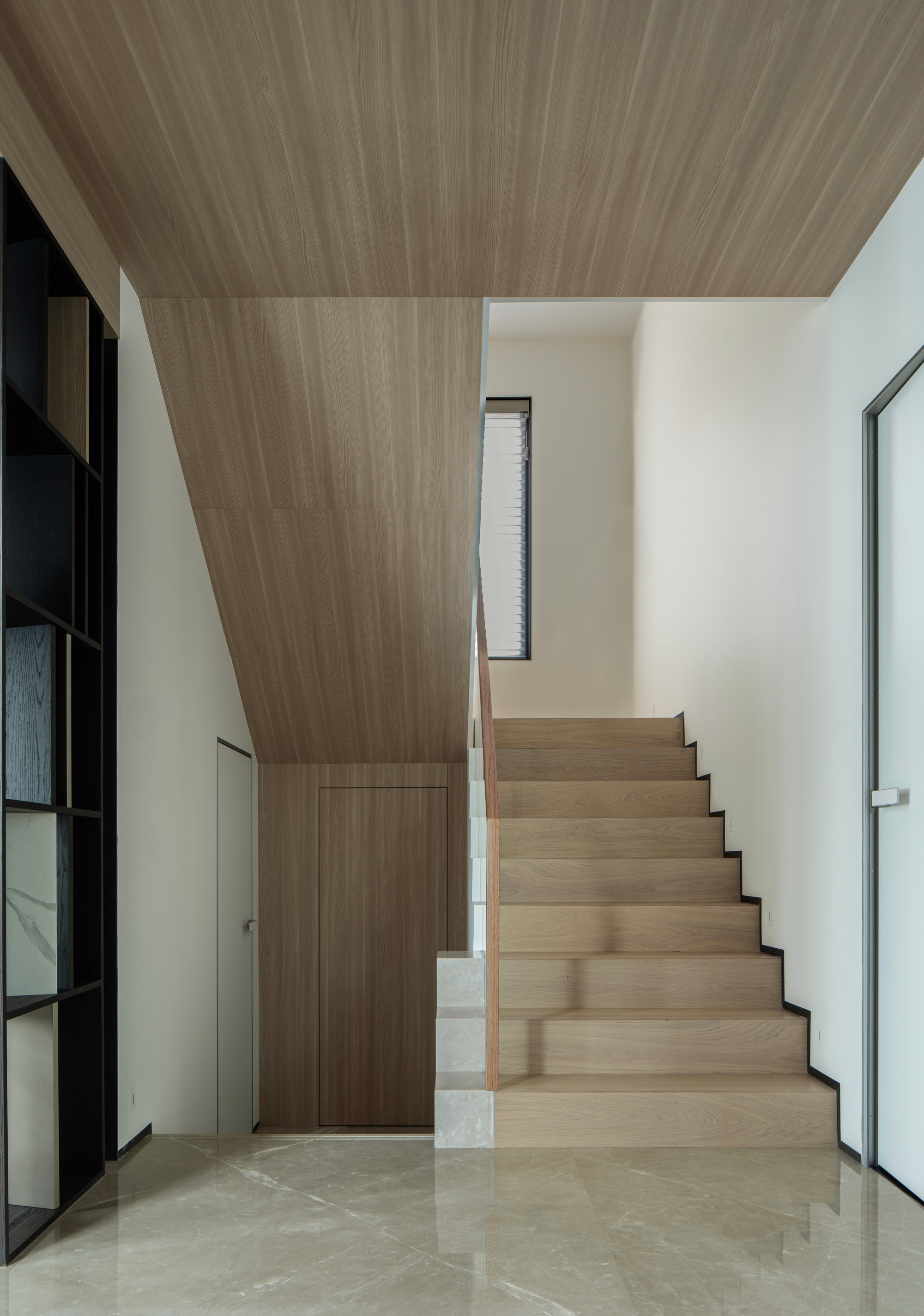 垂直链接:优雅的连通与必要的区隔 楼梯与电梯: 楼梯是家中的重要枢纽,记录着步移景异;与之并置的嵌入式电梯,则代表着高效与关怀,是对未来生活的前瞻性考量。