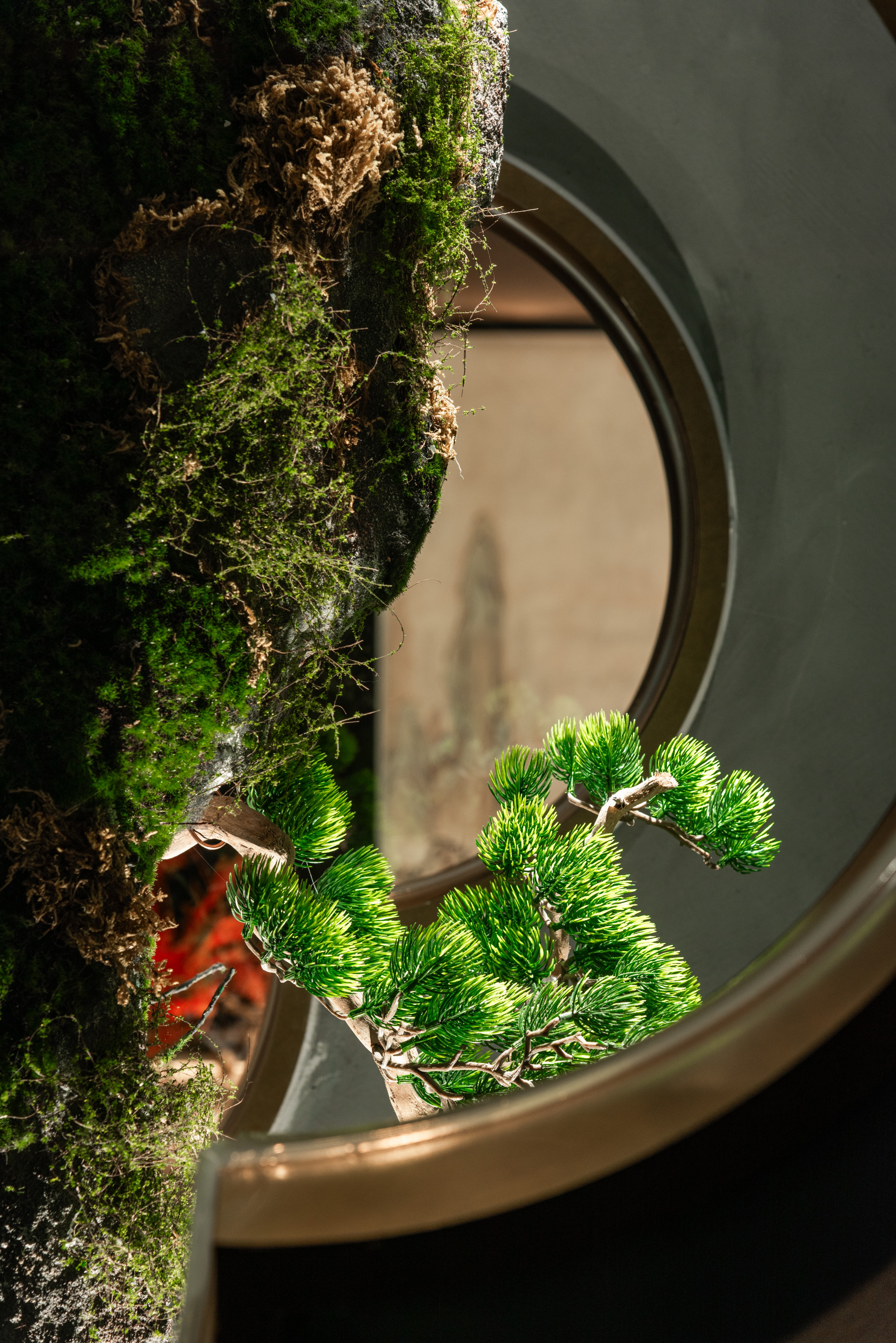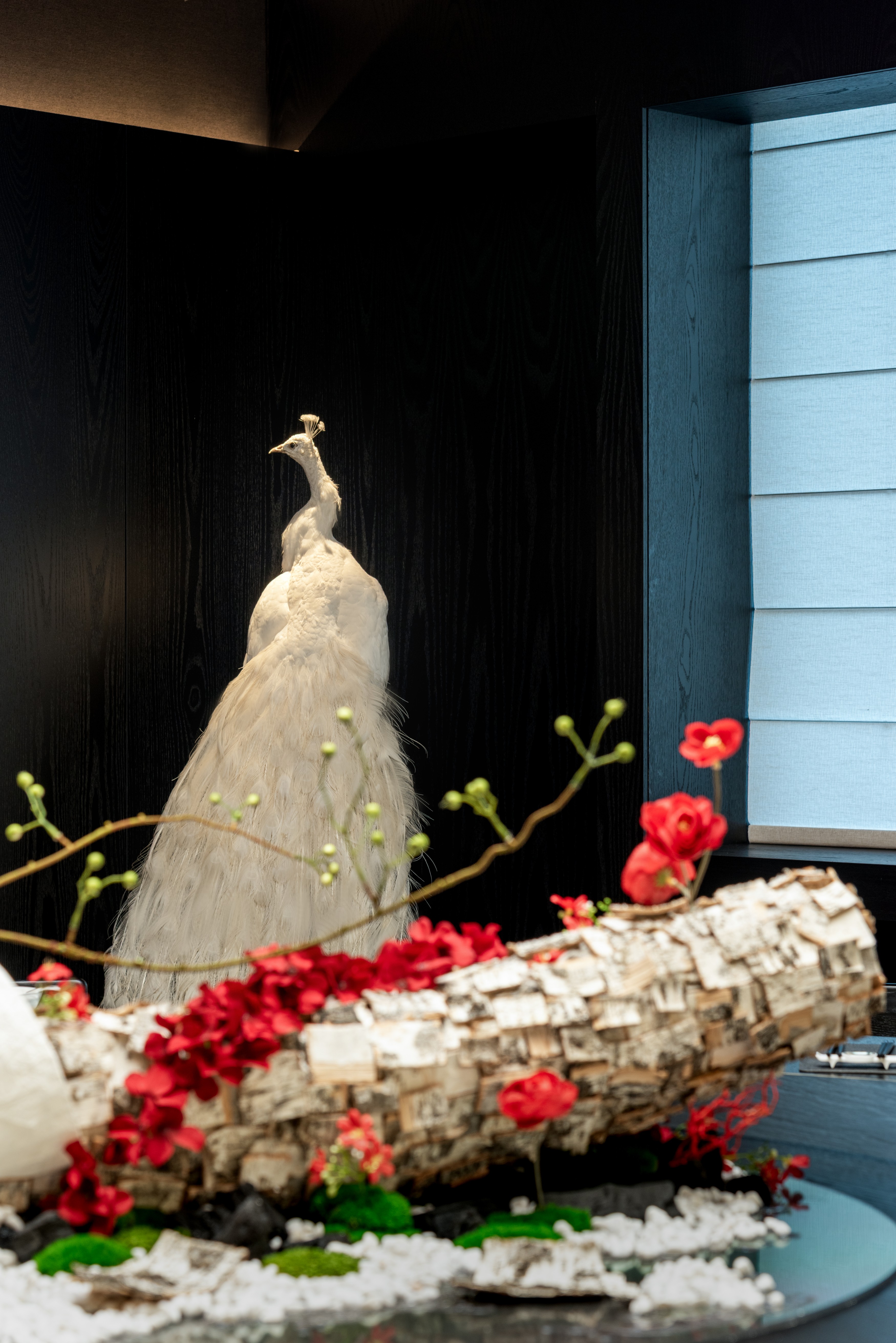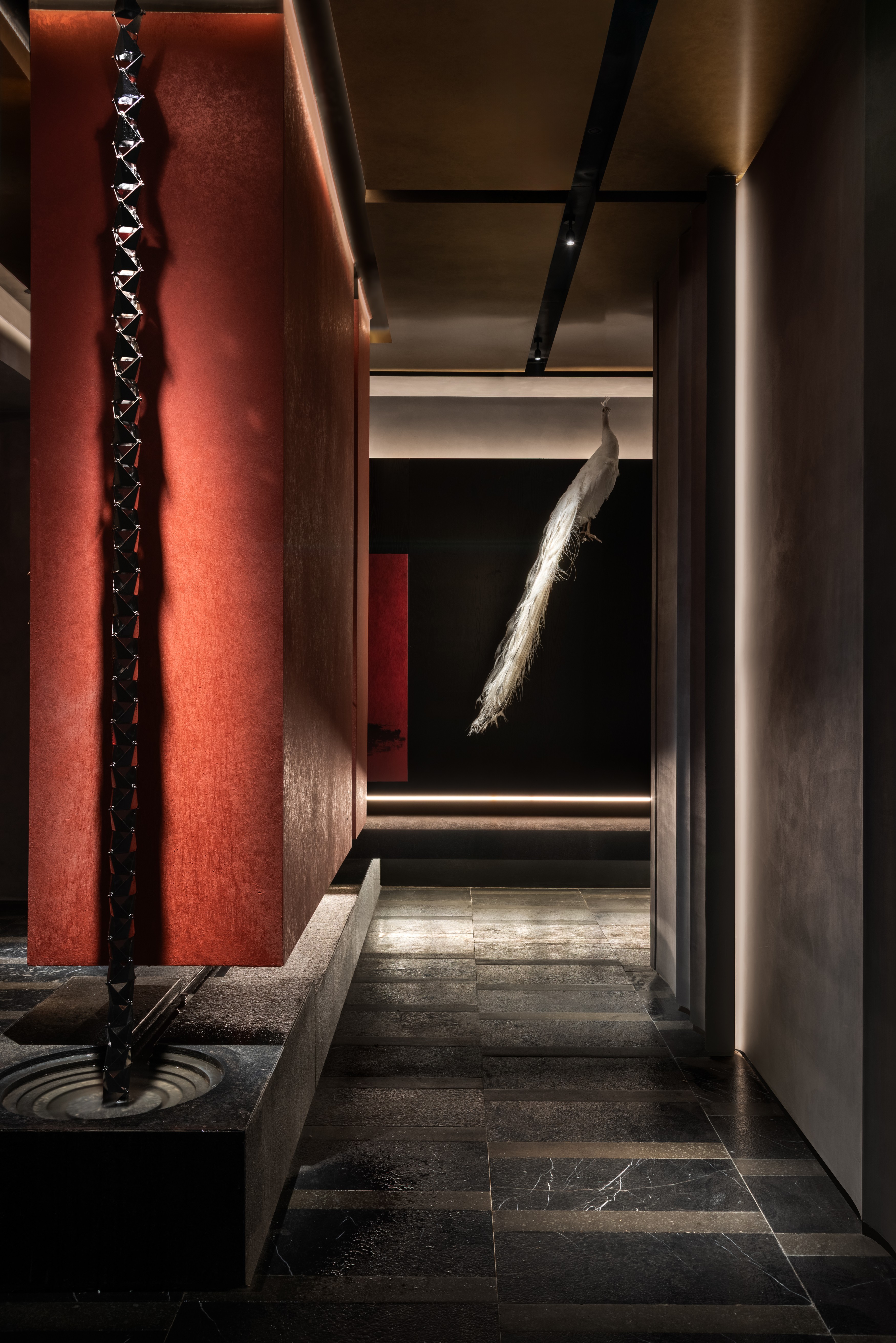 以“水”为引,雨链如琴弦 将天光与水声织成一片朦胧的帘幕 红背景前立石傲然,枯枝斜出 白孔雀静默回望,共构一幅微缩的宋人山水 于此,未入其室,先净其心 完成一场从纷扰到宁静的仪式过渡