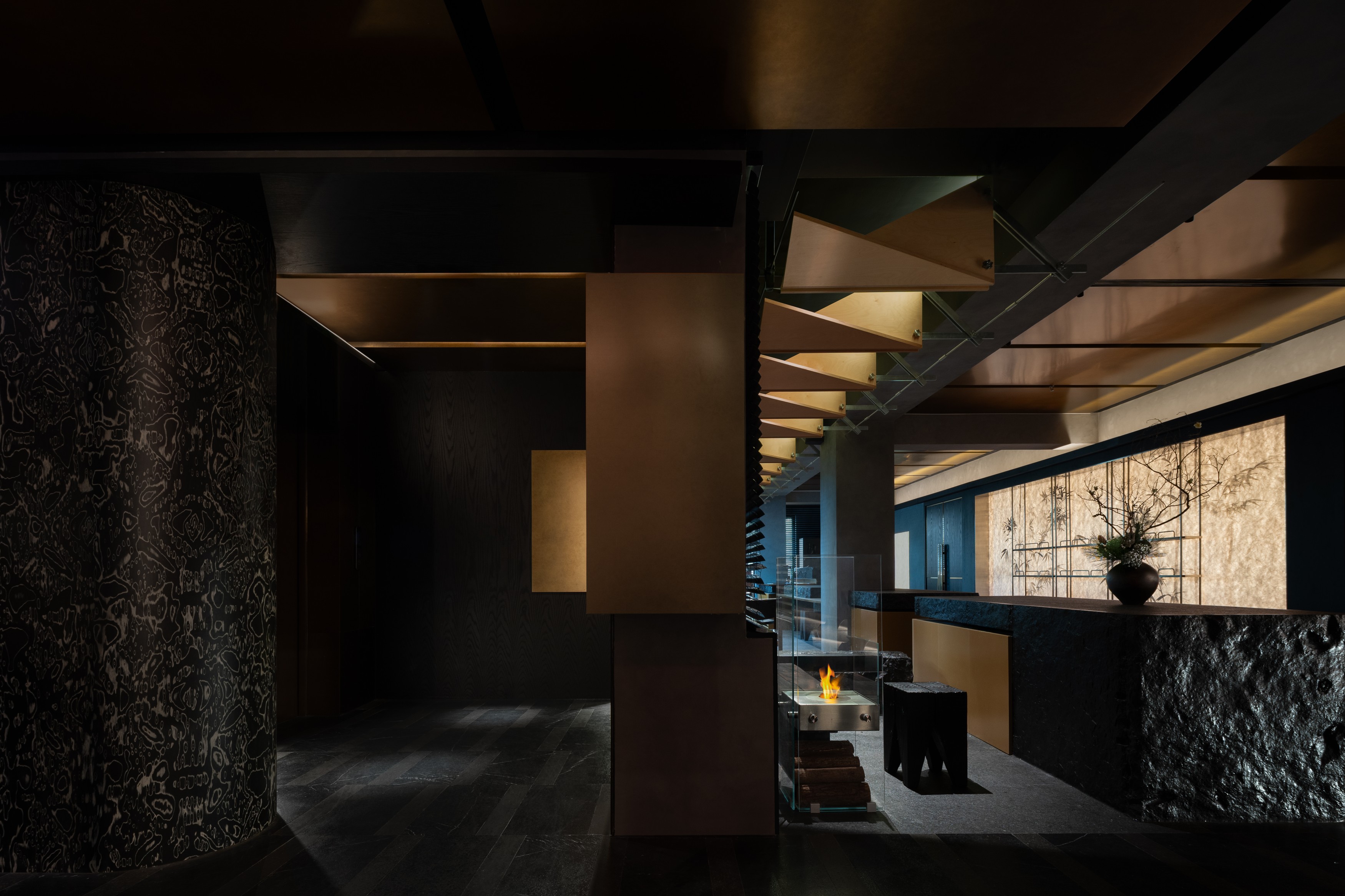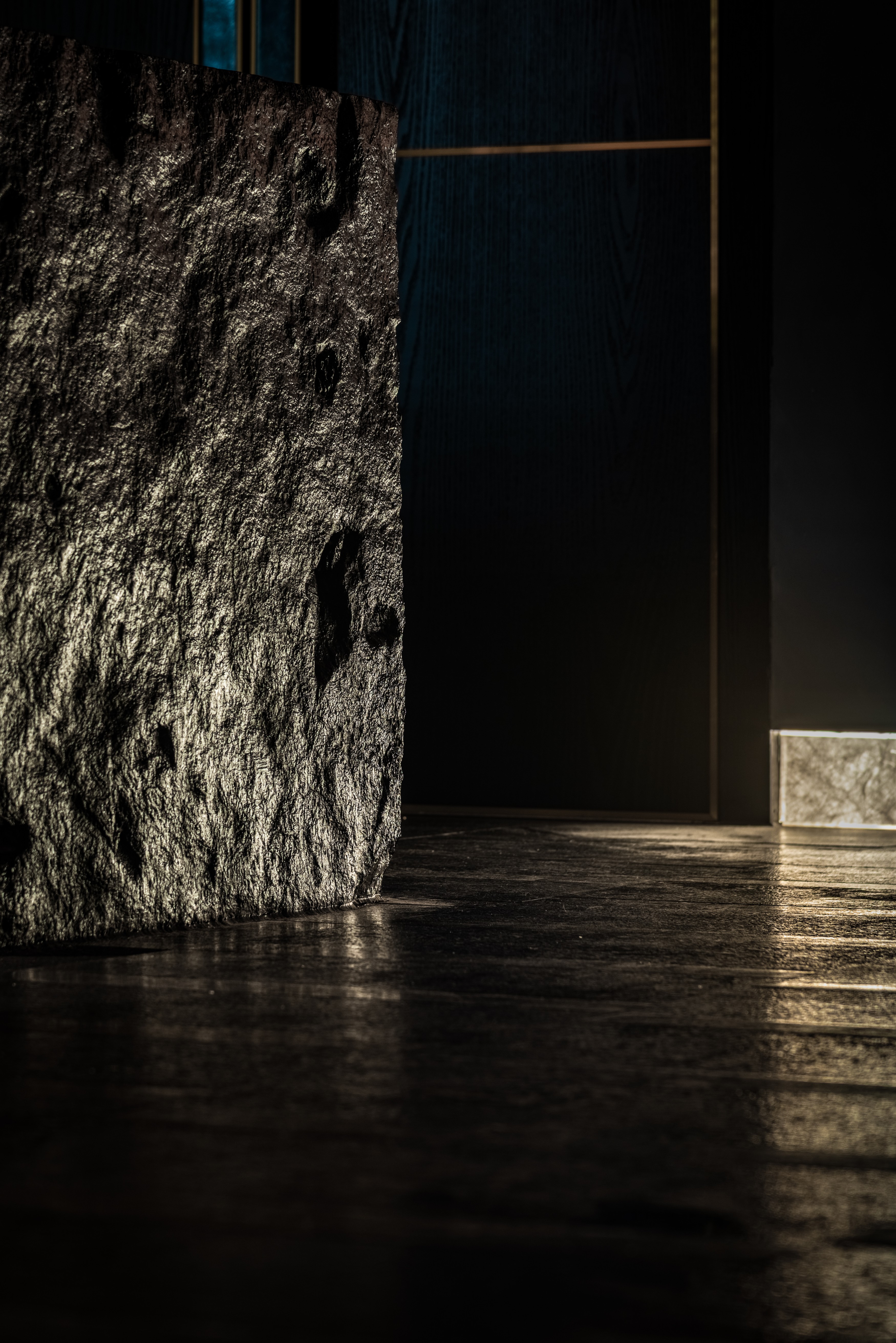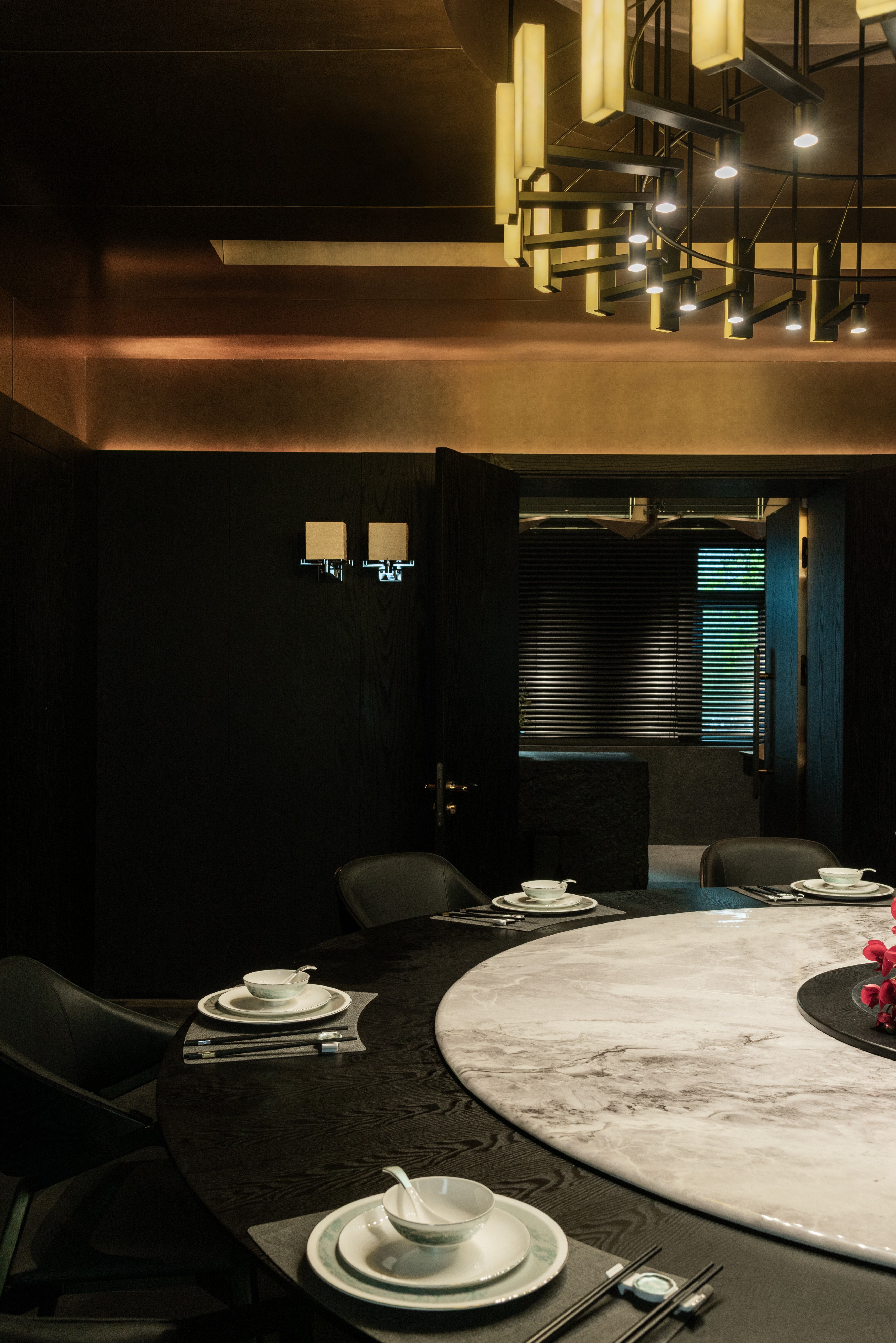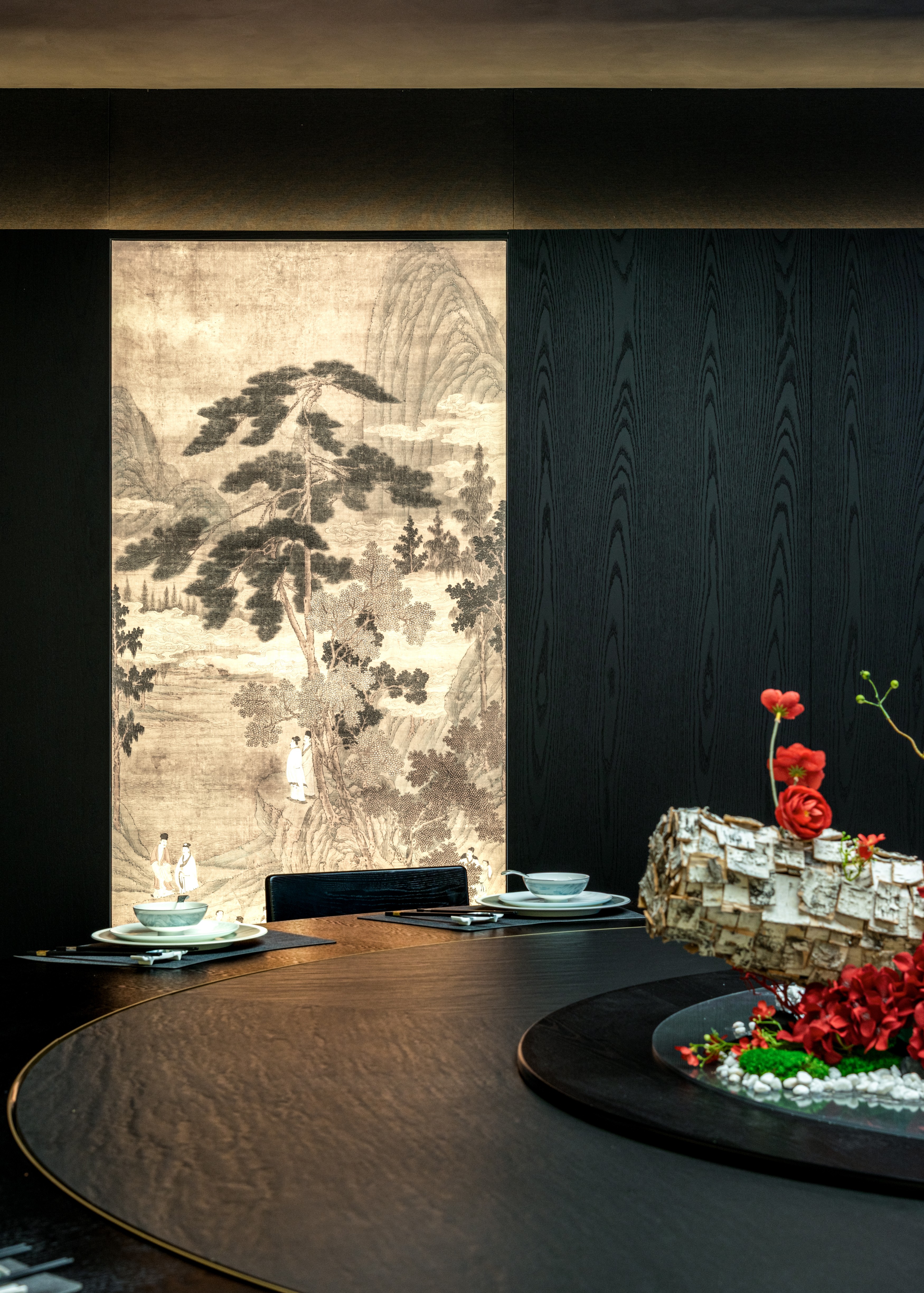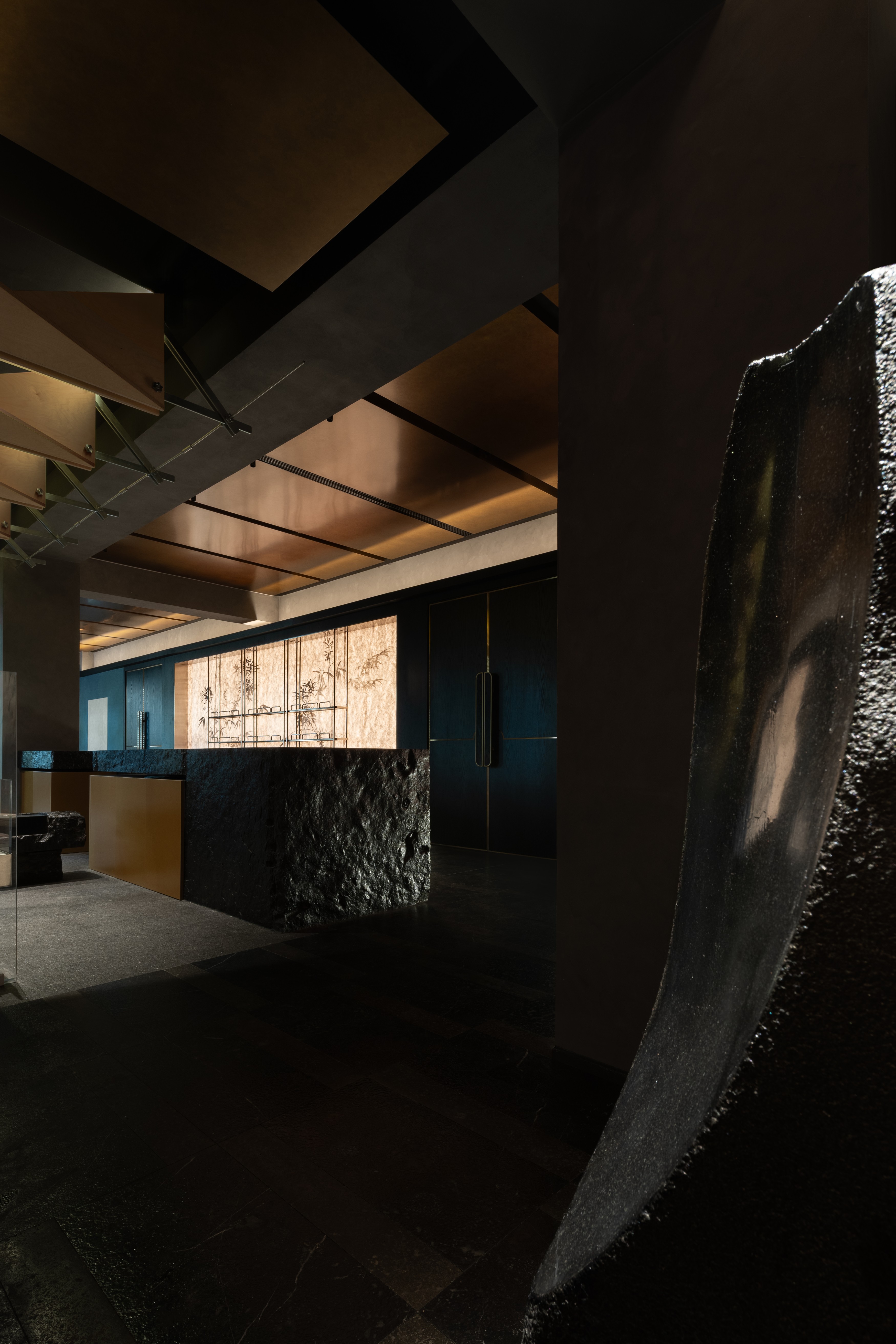 黑色岩石吧台与山水云石 构成空间基底 暗色并非压抑 而是来自大地般的包容与沉淀 托起全场气韵与格局