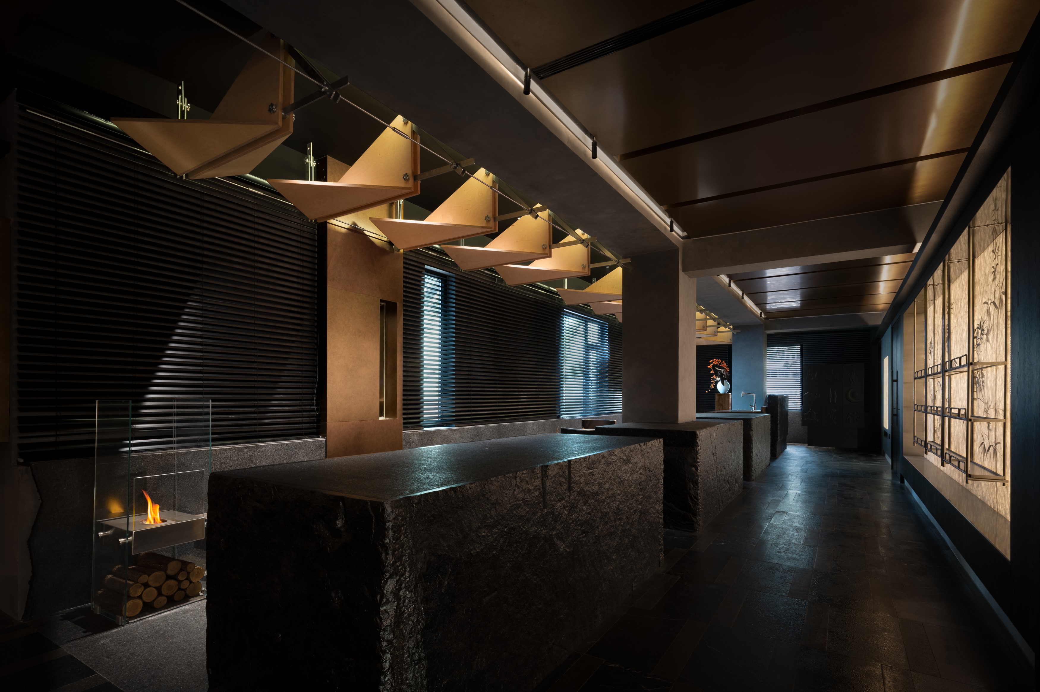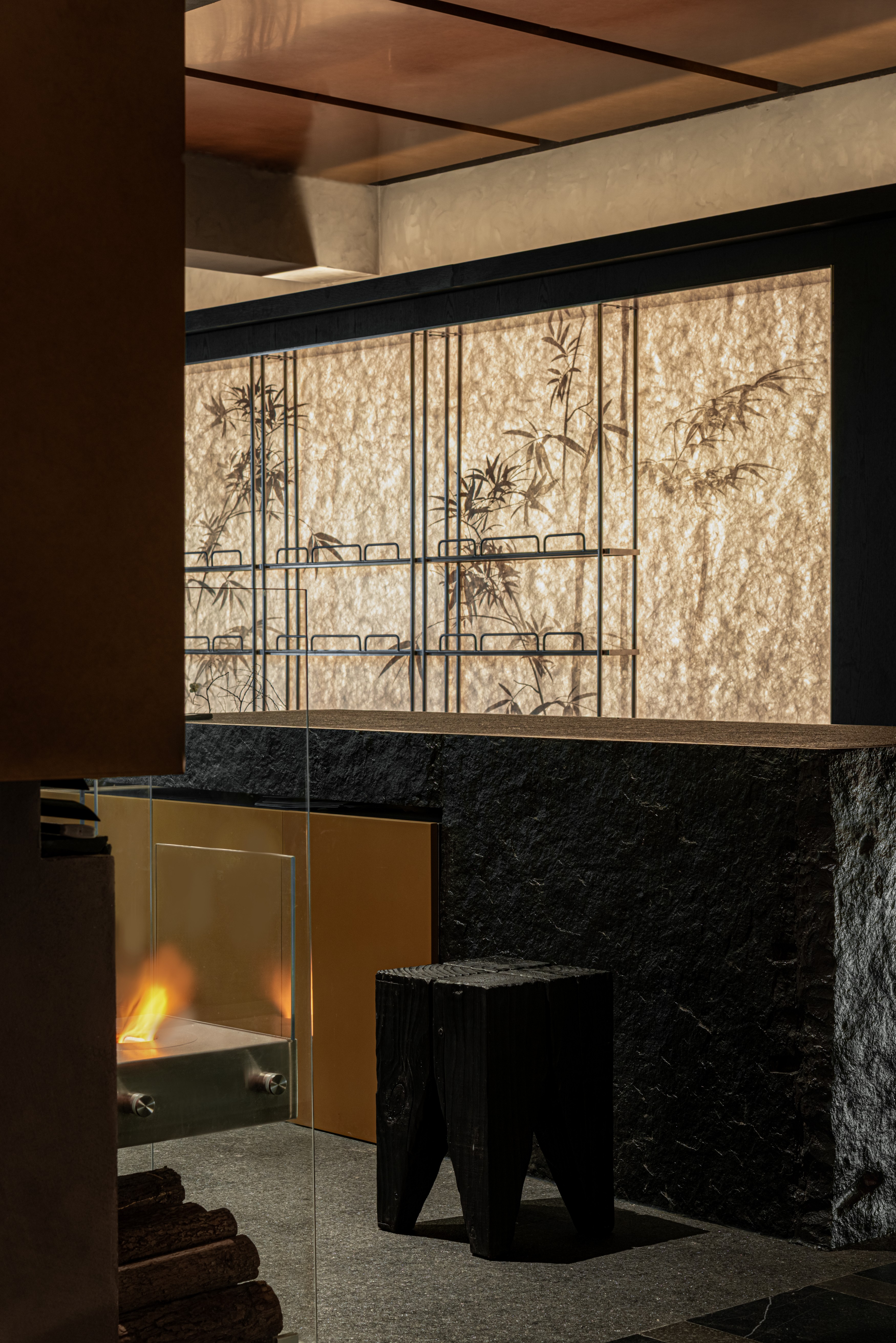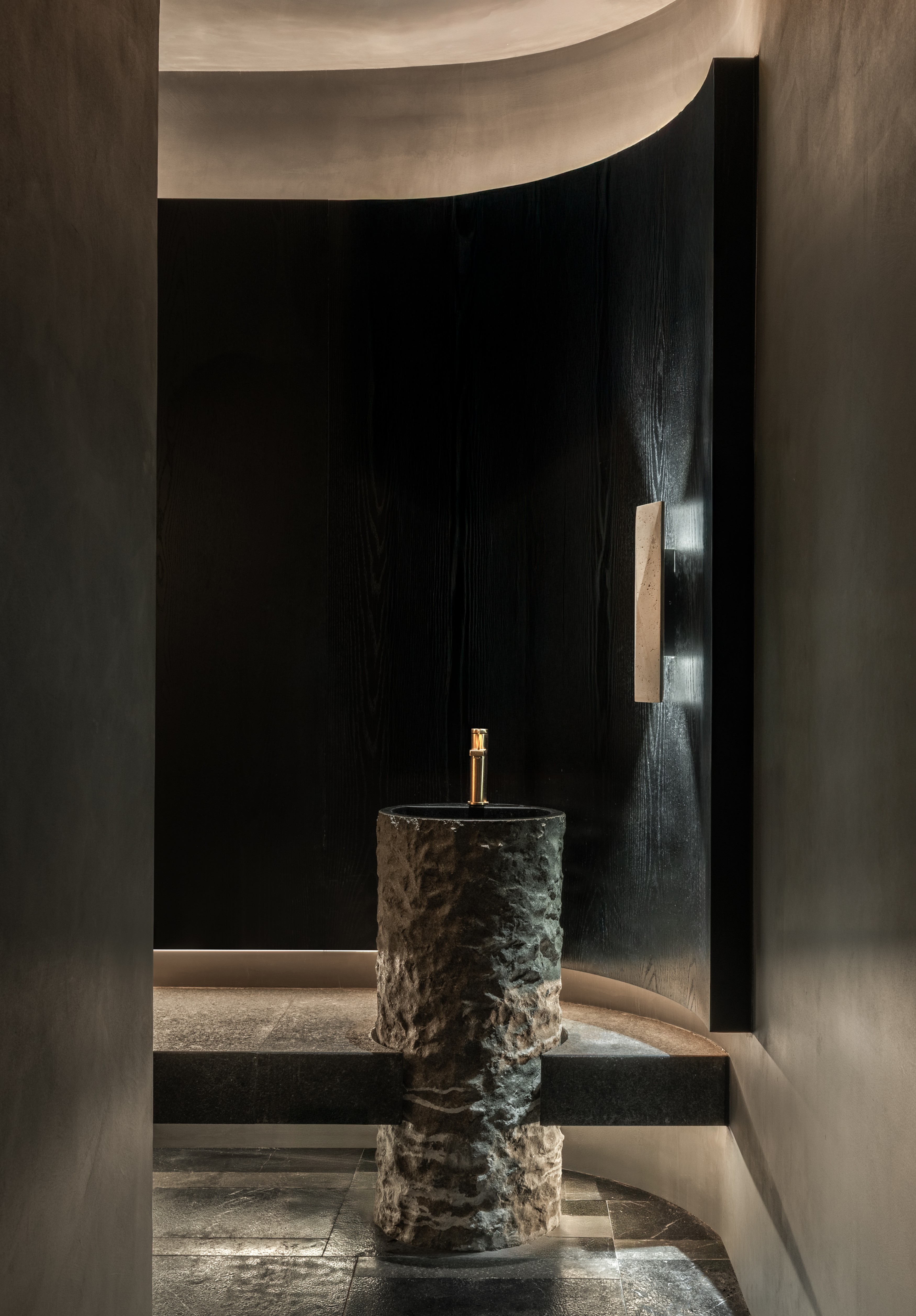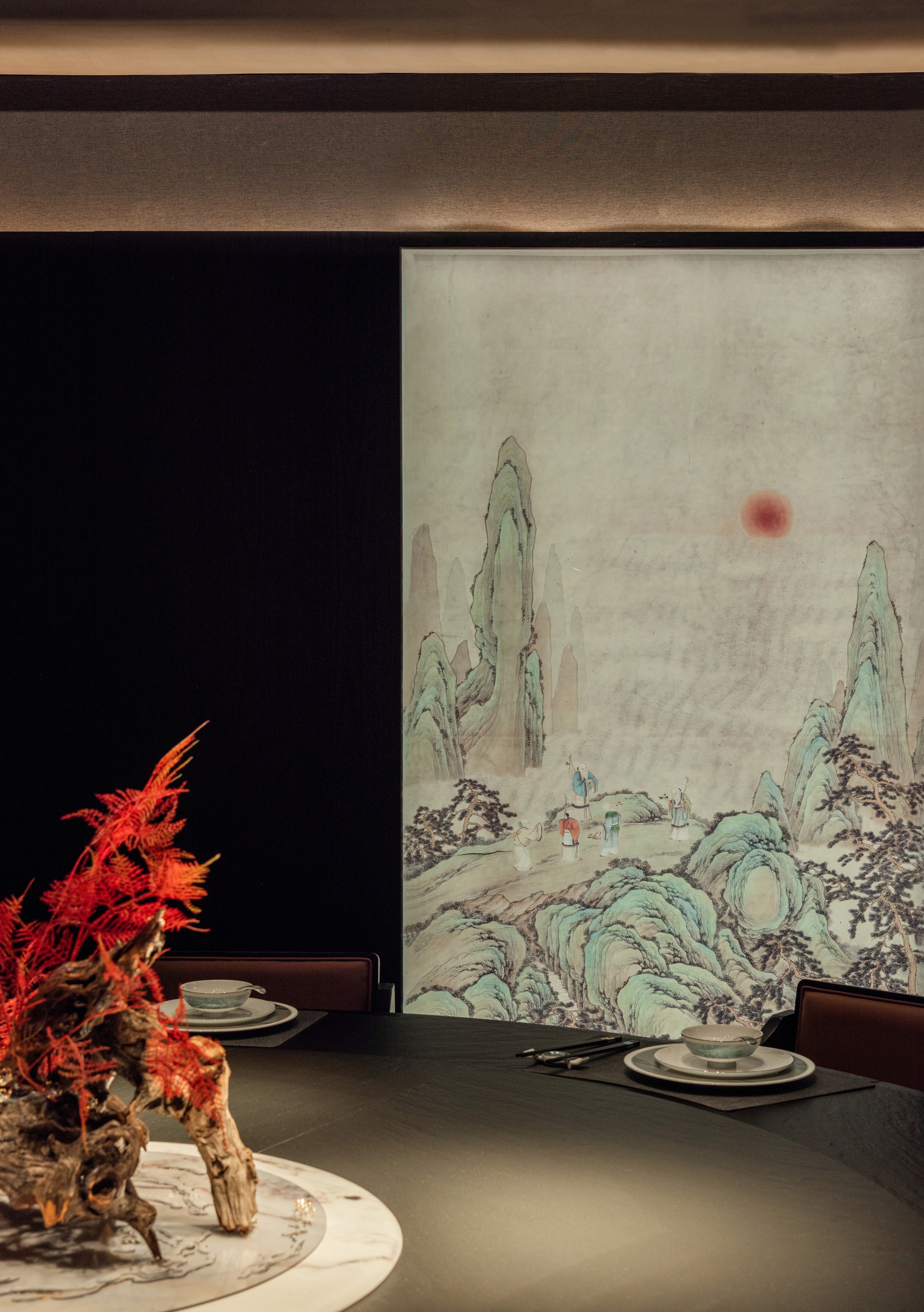 黑色岩石吧台与山水云石 构成空间基底 暗色并非压抑 而是来自大地般的包容与沉淀 托起全场气韵与格局