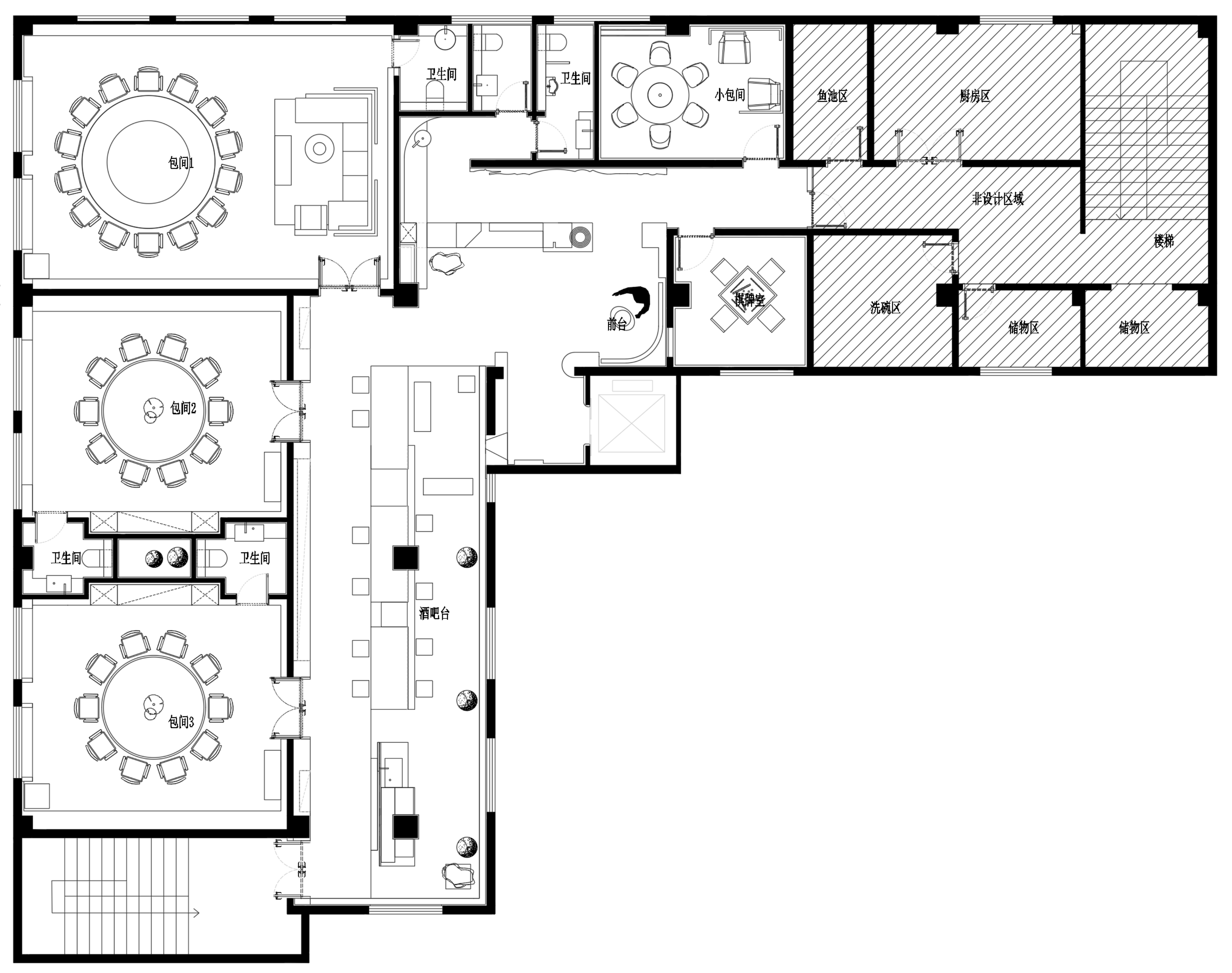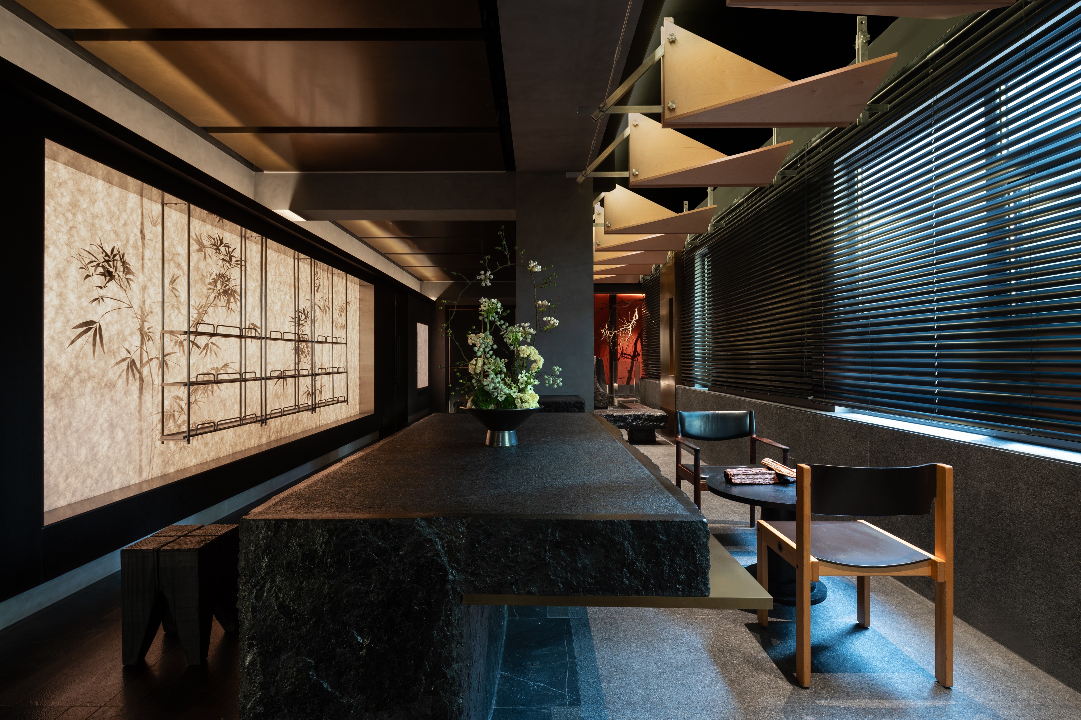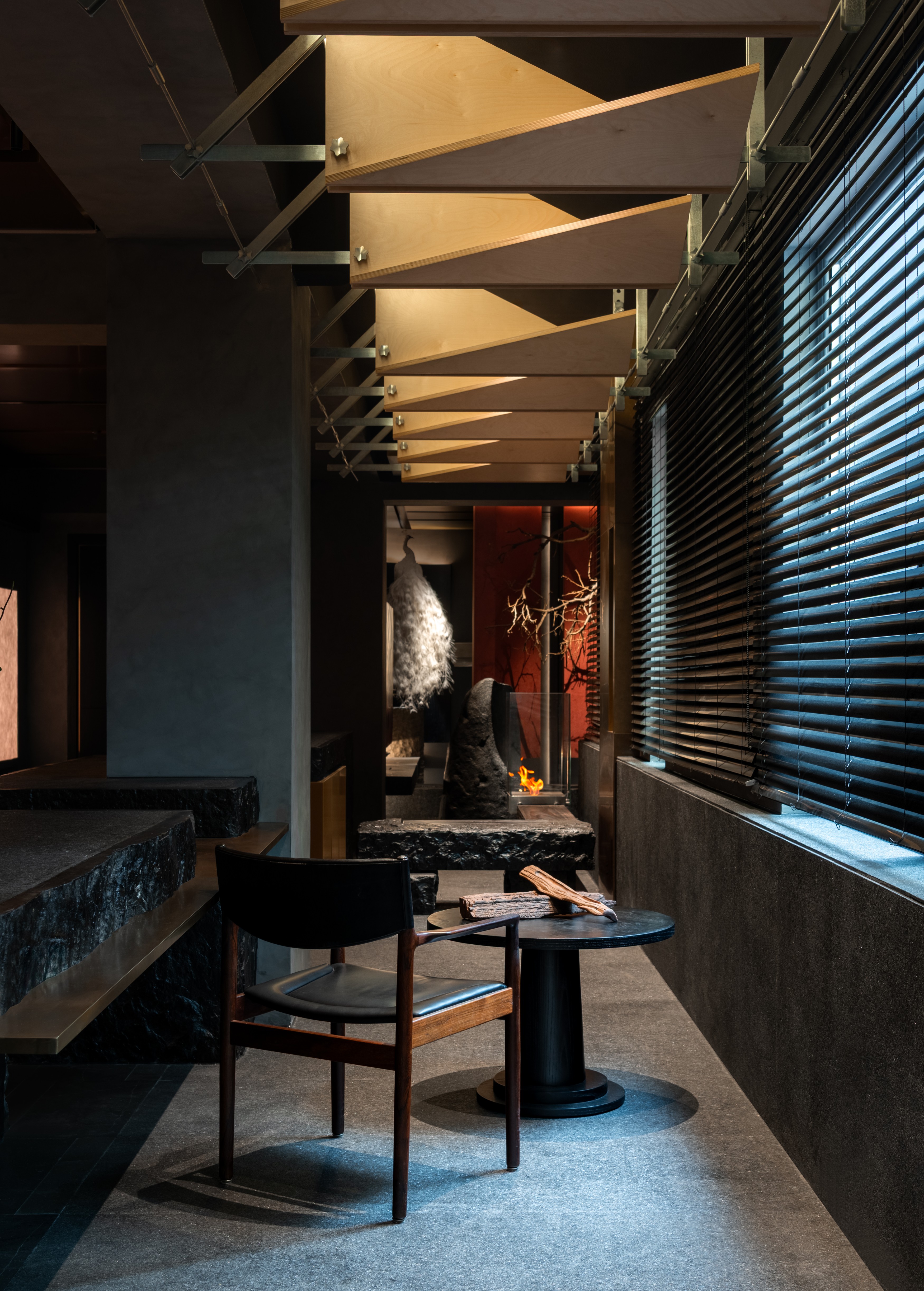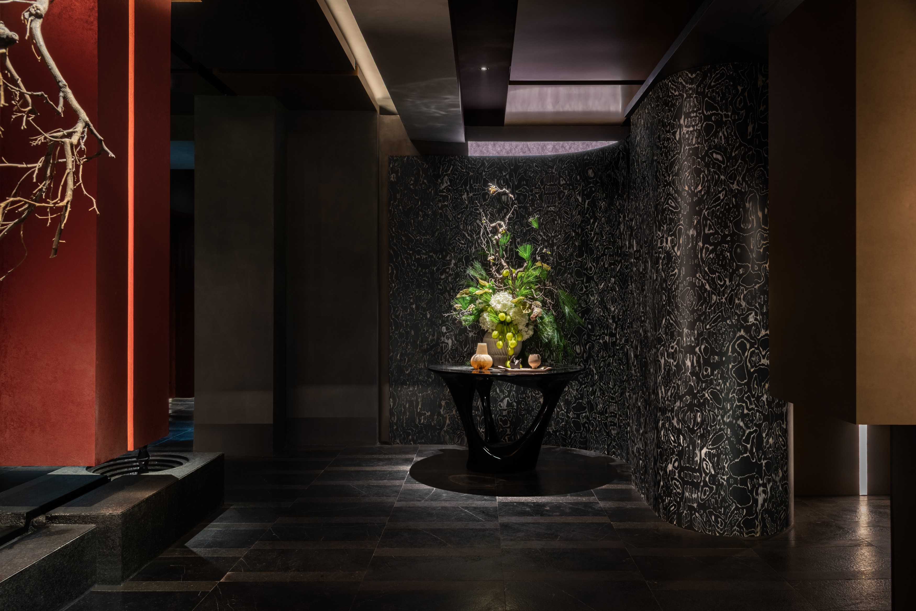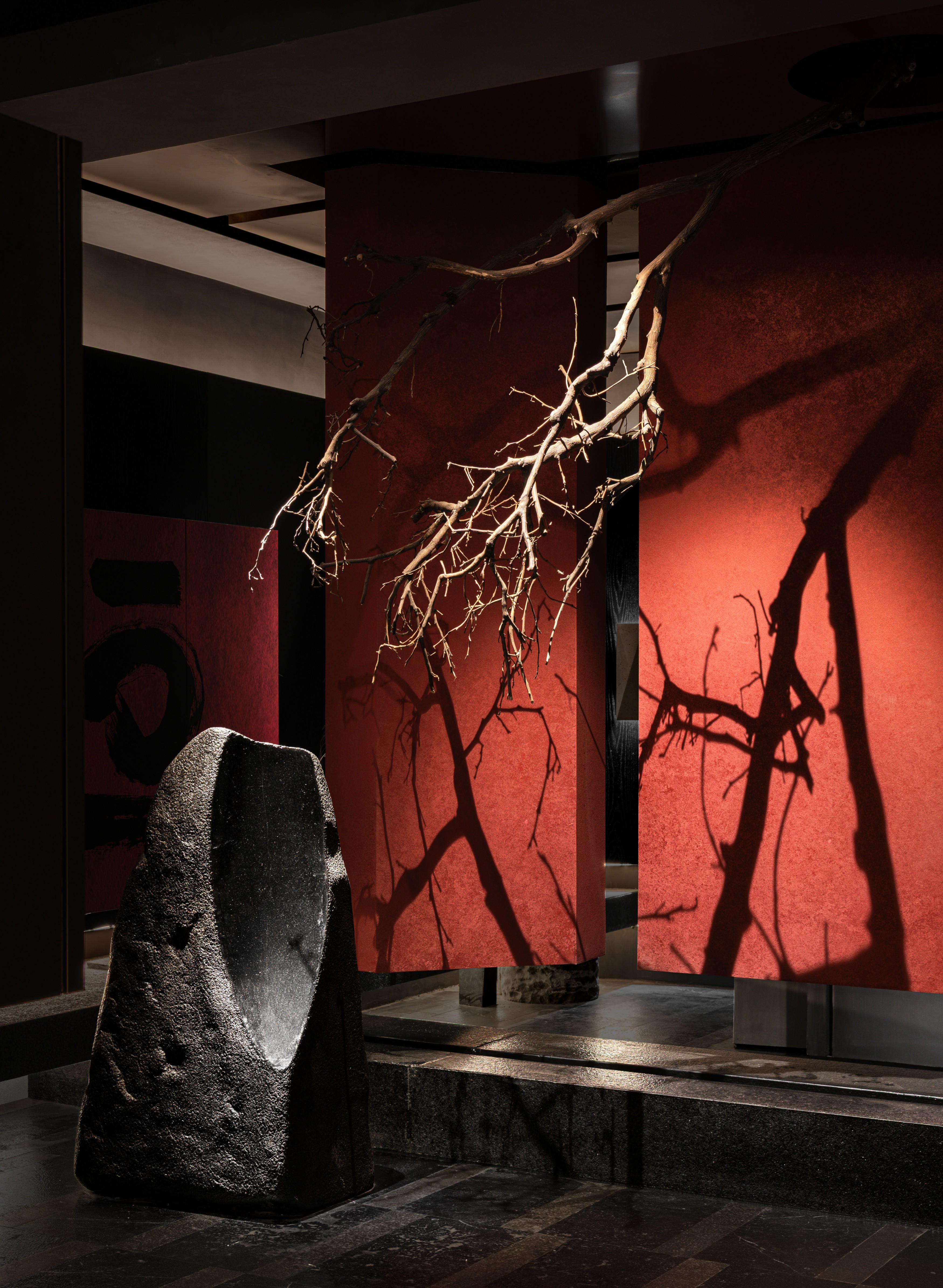黑色岩石吧台与山水云石 构成空间基底 暗色并非压抑 而是来自大地般的包容与沉淀 托起全场气韵与格局