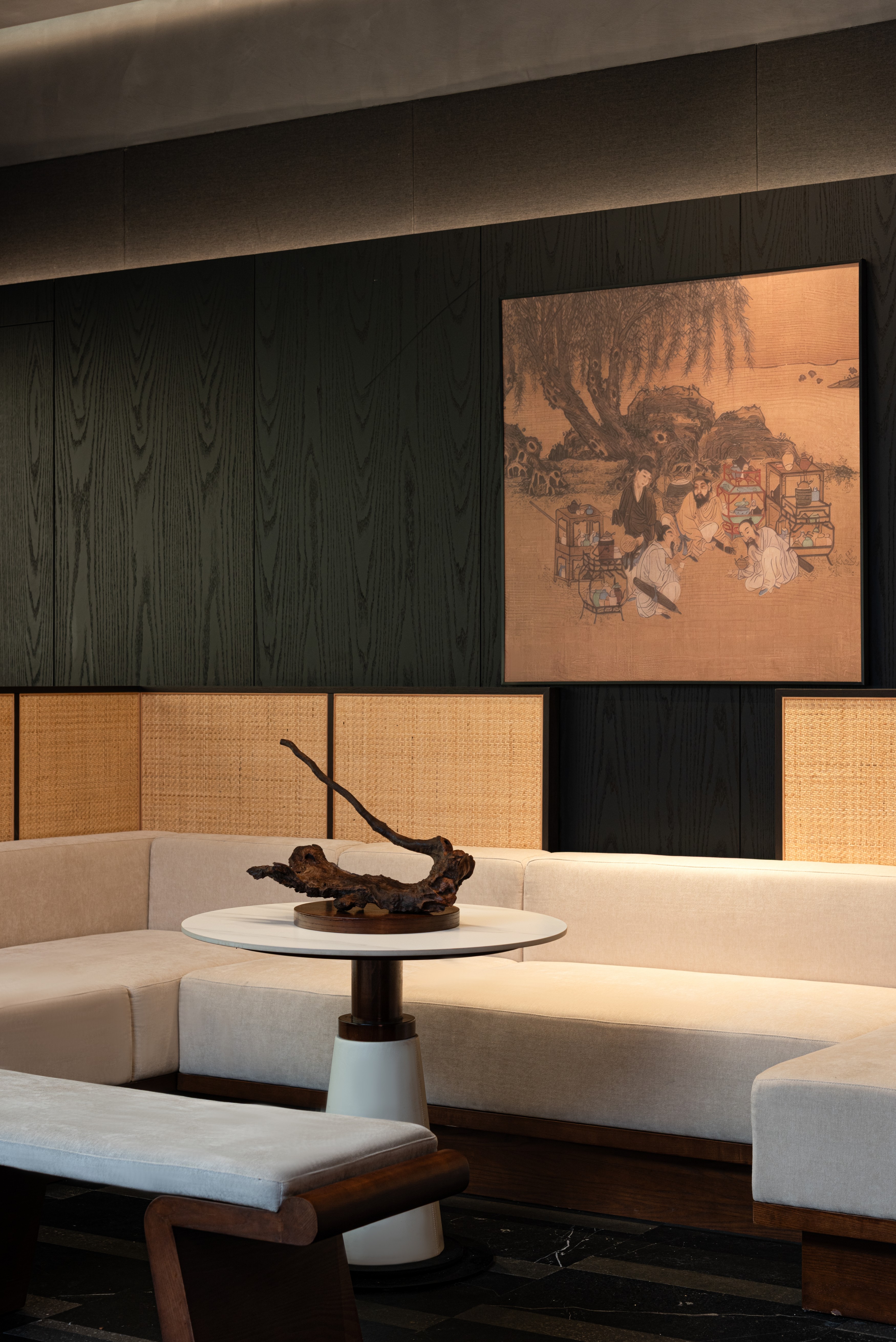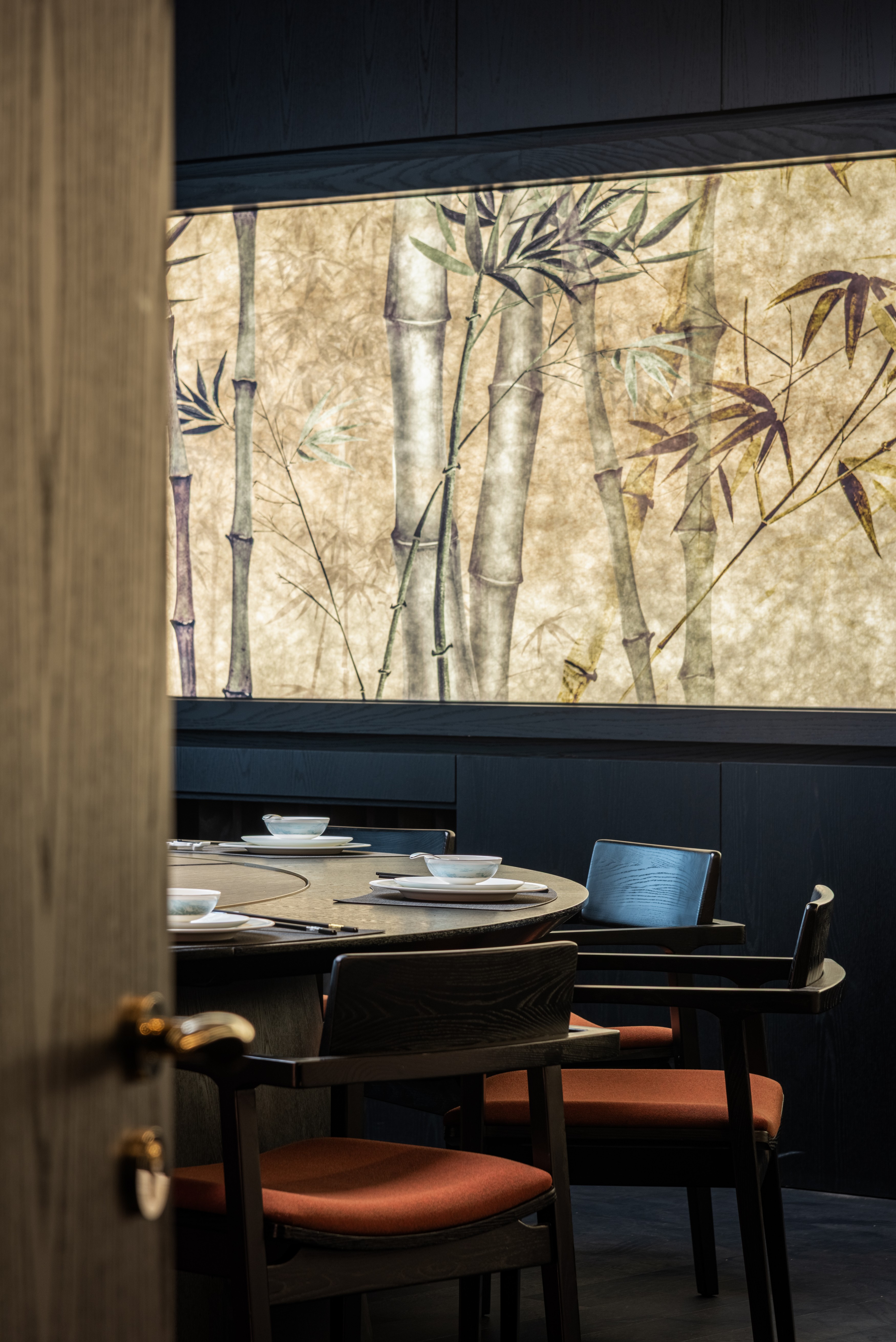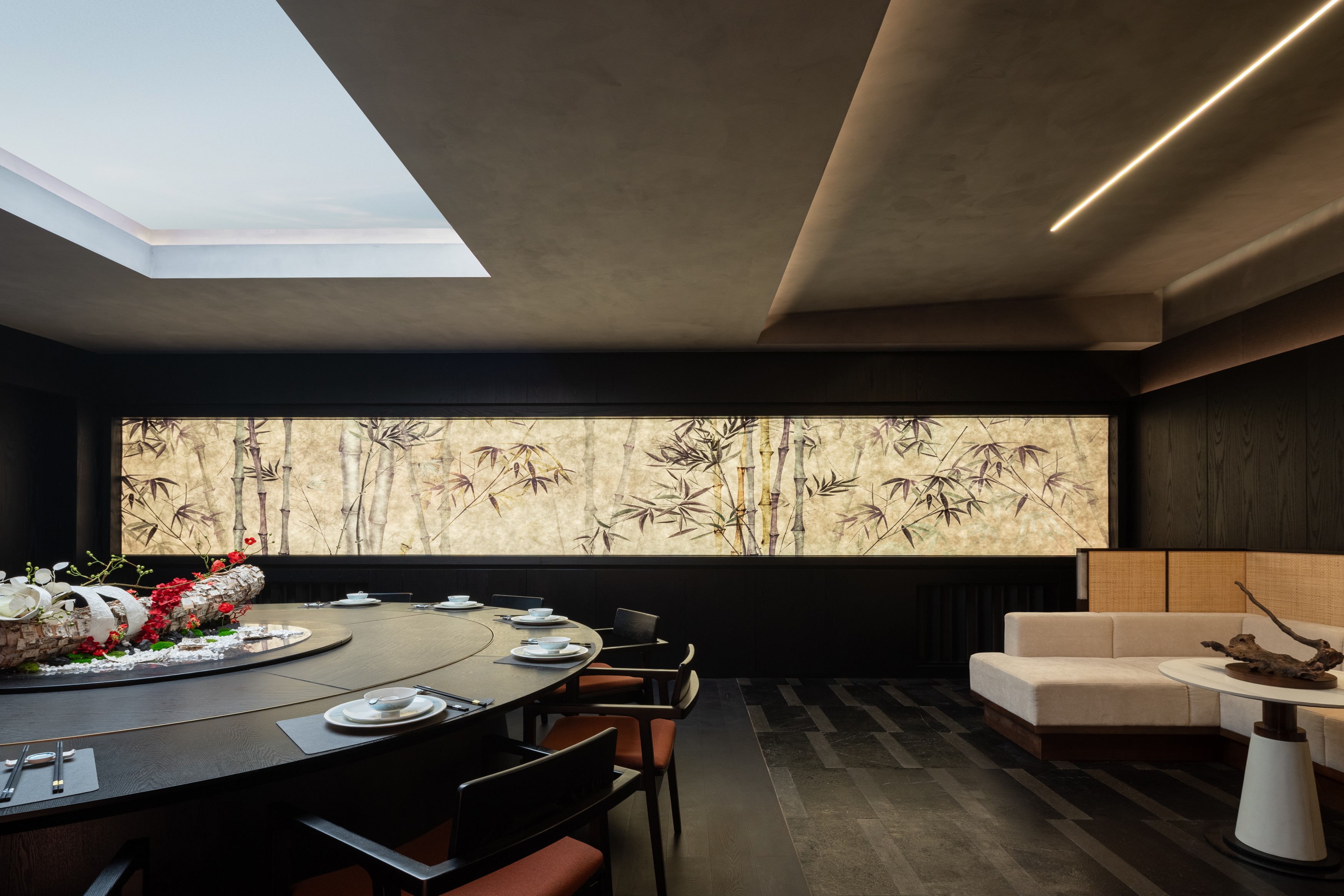 整面墙的水墨竹卷徐徐展开 墨色氤氲,笔意连绵 人行其间,如步入一幅活动的长卷 光影在竹影间游移 心境亦随之沉静、深远 体验一场“不下堂筵,坐穷林泉”的东方卧游之趣
