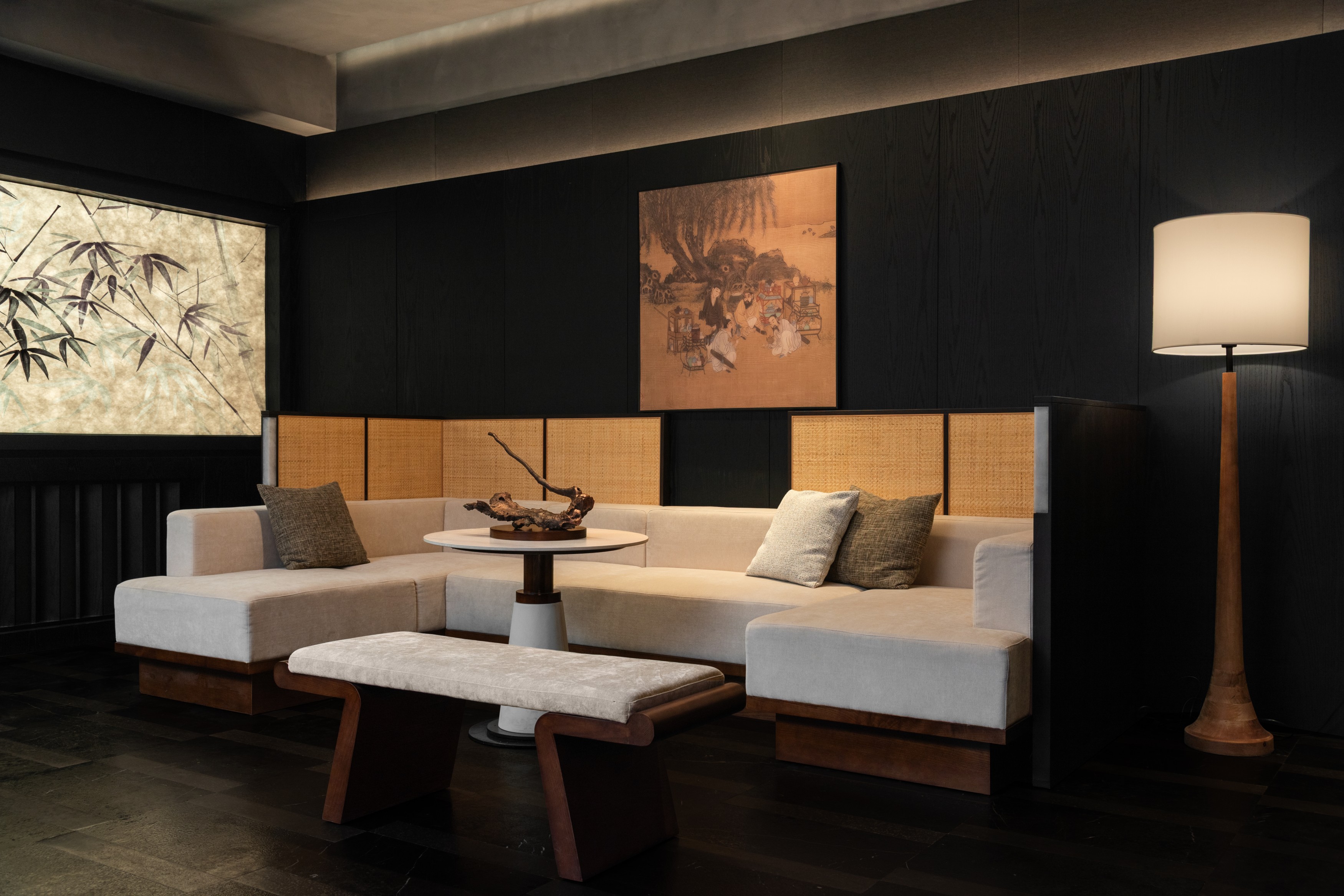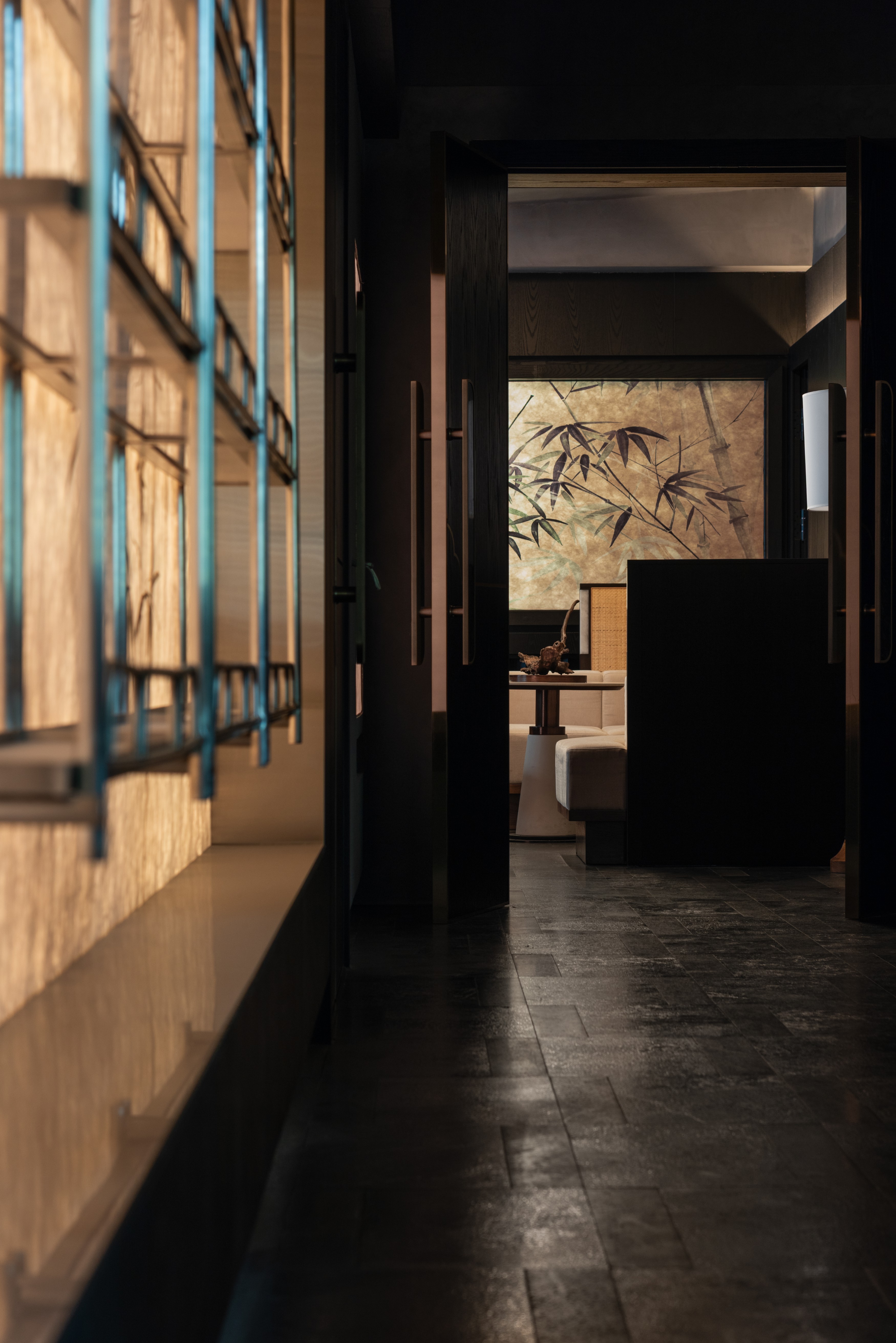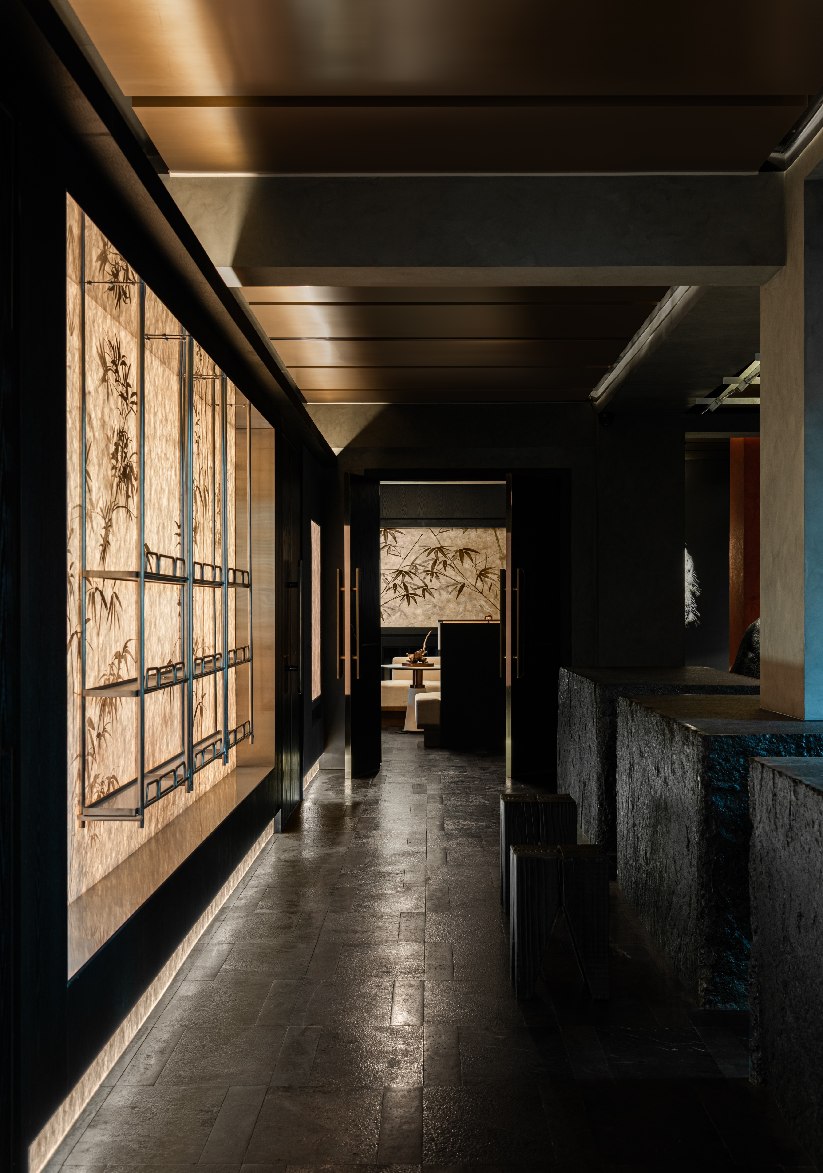 整面墙的水墨竹卷徐徐展开 墨色氤氲,笔意连绵 人行其间,如步入一幅活动的长卷 光影在竹影间游移 心境亦随之沉静、深远 体验一场“不下堂筵,坐穷林泉”的东方卧游之趣