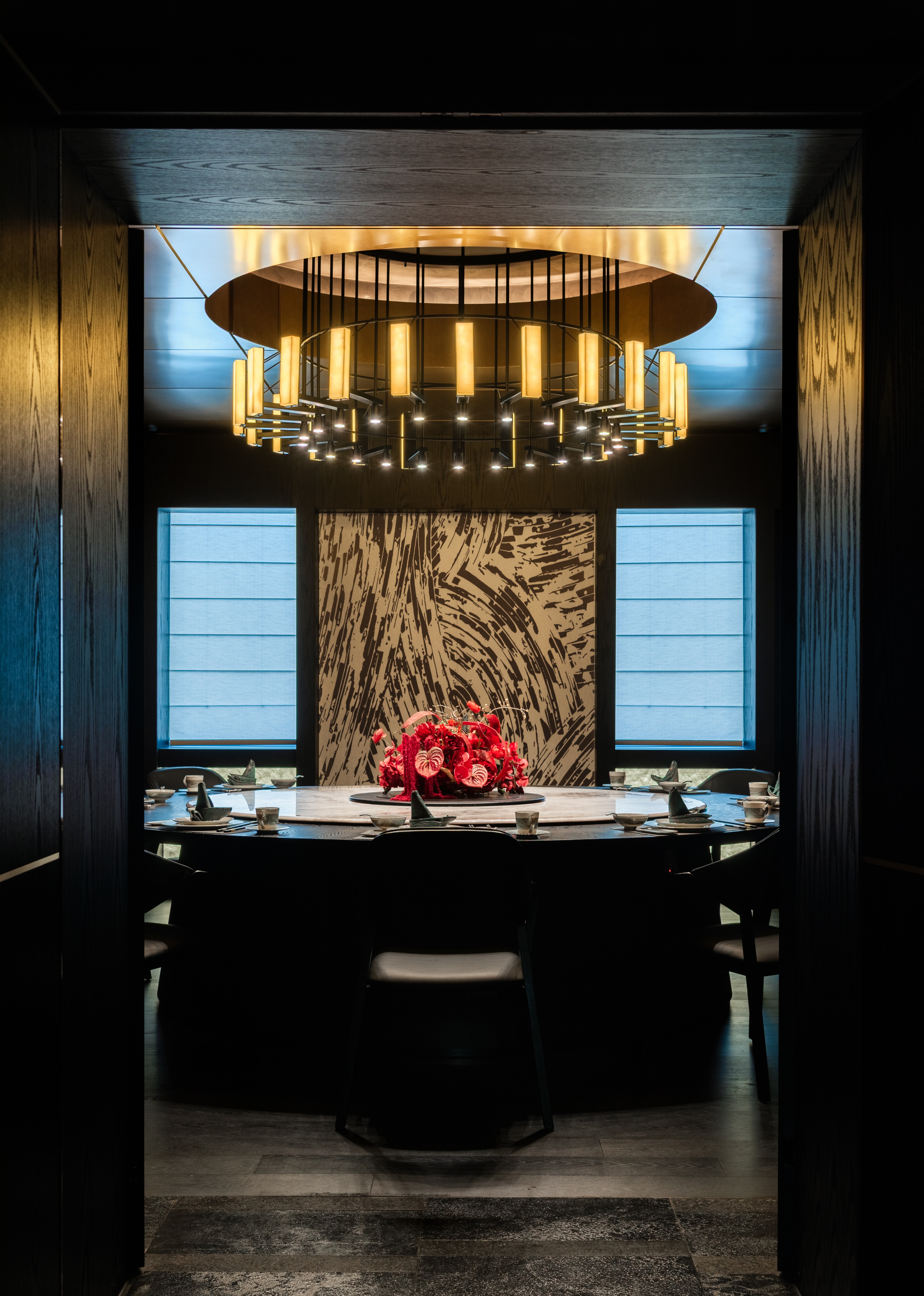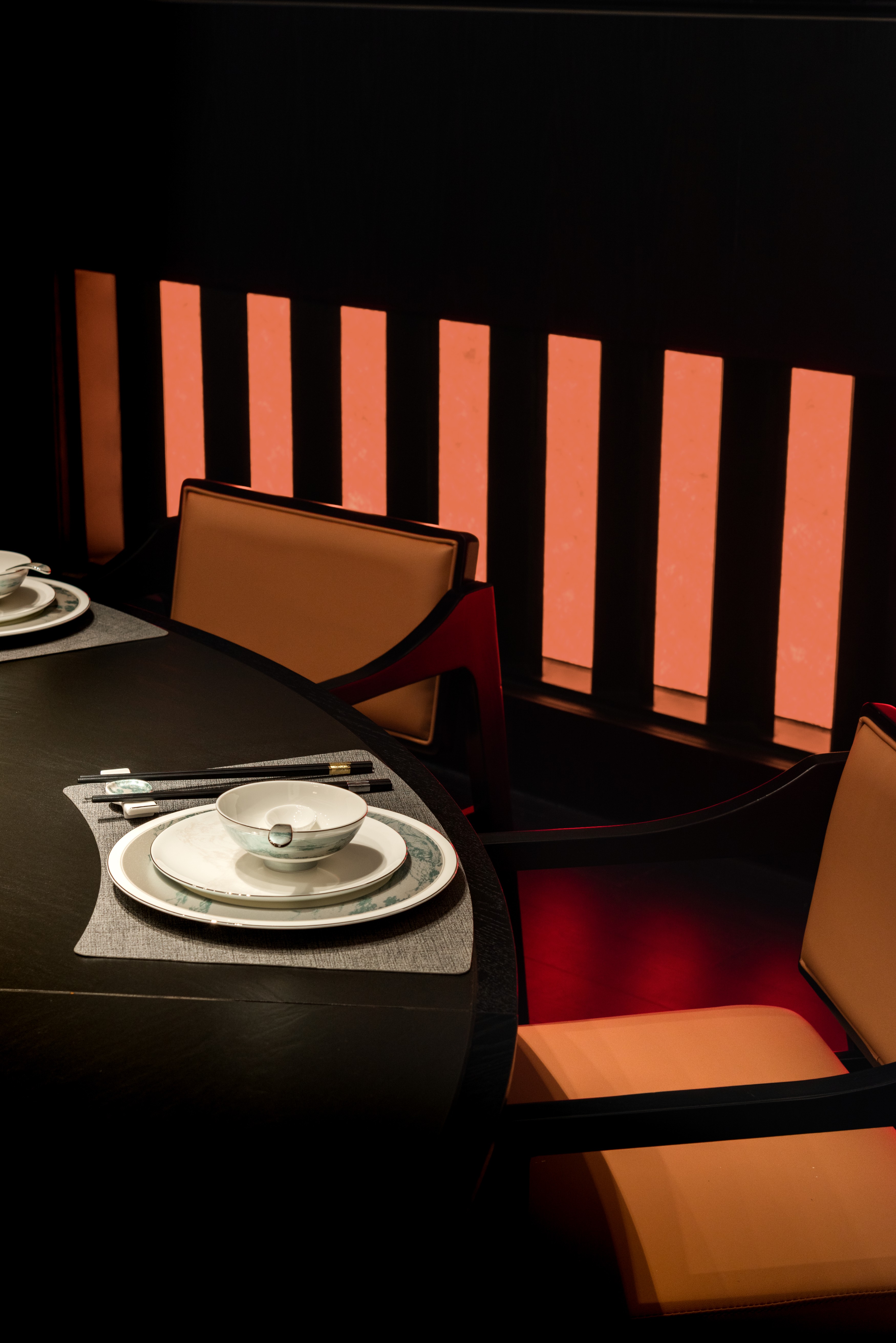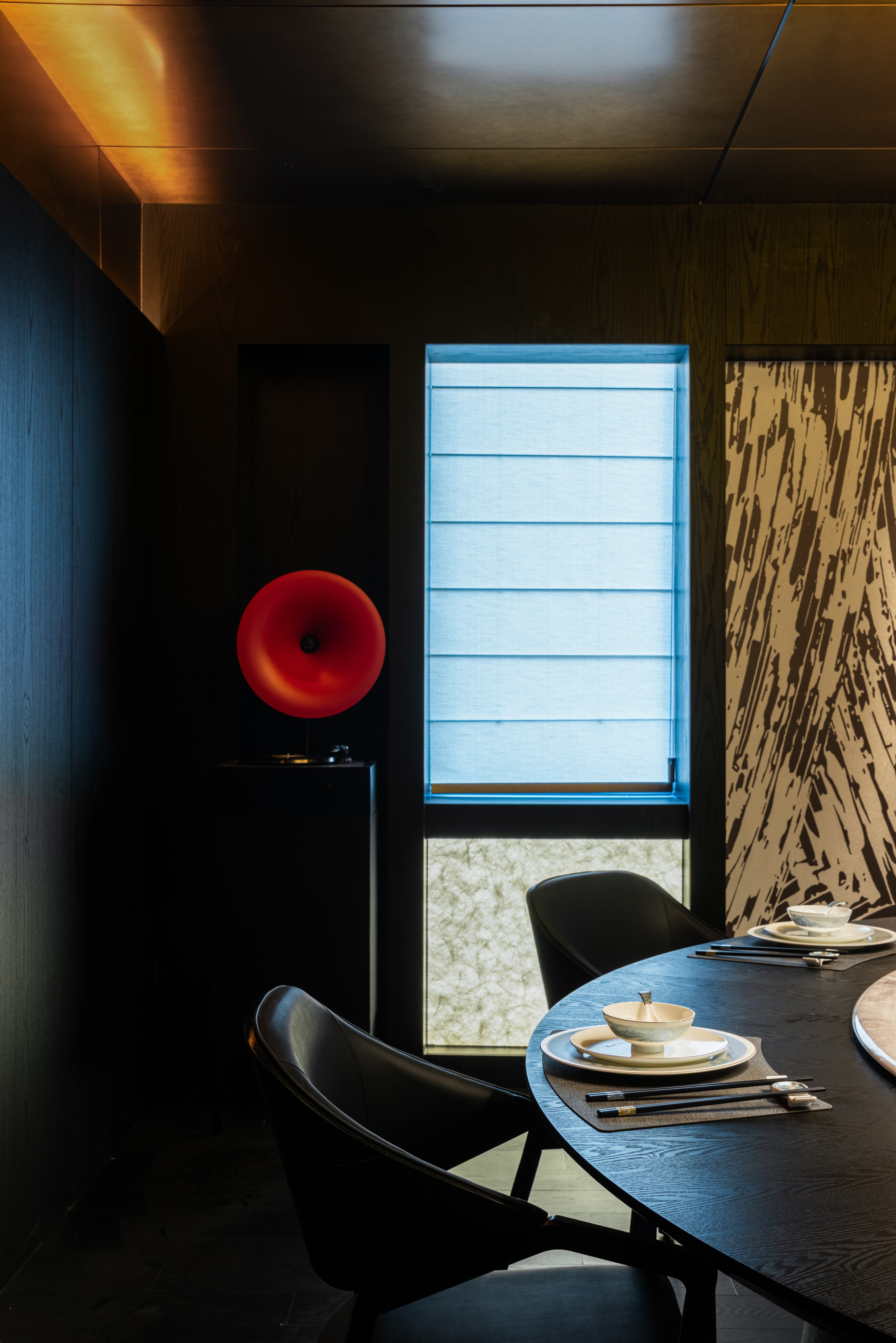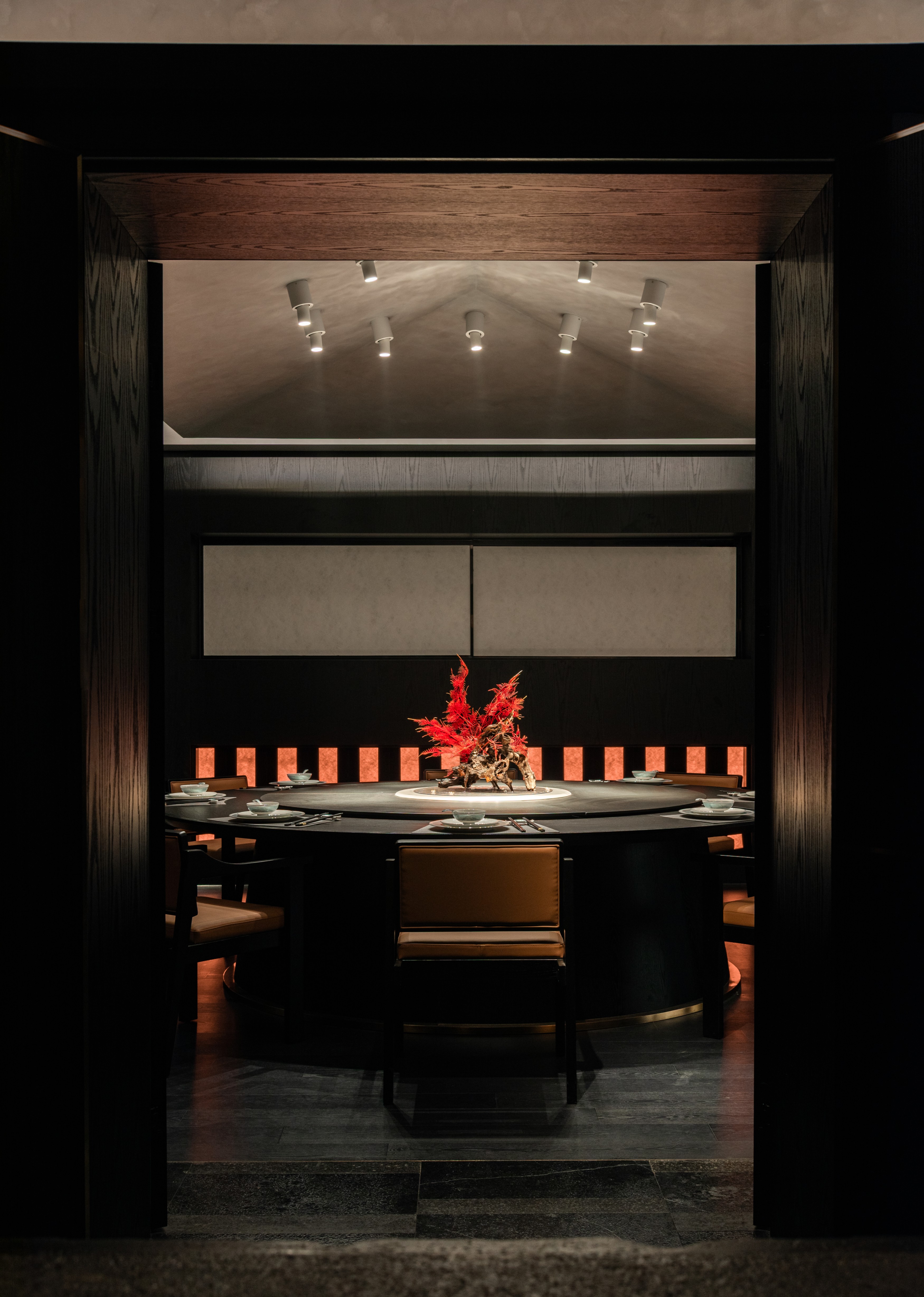 包间二|窗花引景,窥见天地 巧妙借墙体空隙“凿景” 中式窗棂成为捕捉光与影的画框 一日之间,光迹流转 在墙面与地面绘出瞬息万变的画作 一抹朱红巧妙点睛,既跃动了视觉 又含蓄致敬了古典园林的漏窗美学 方寸之间,得以窥见大千世界的无限生机