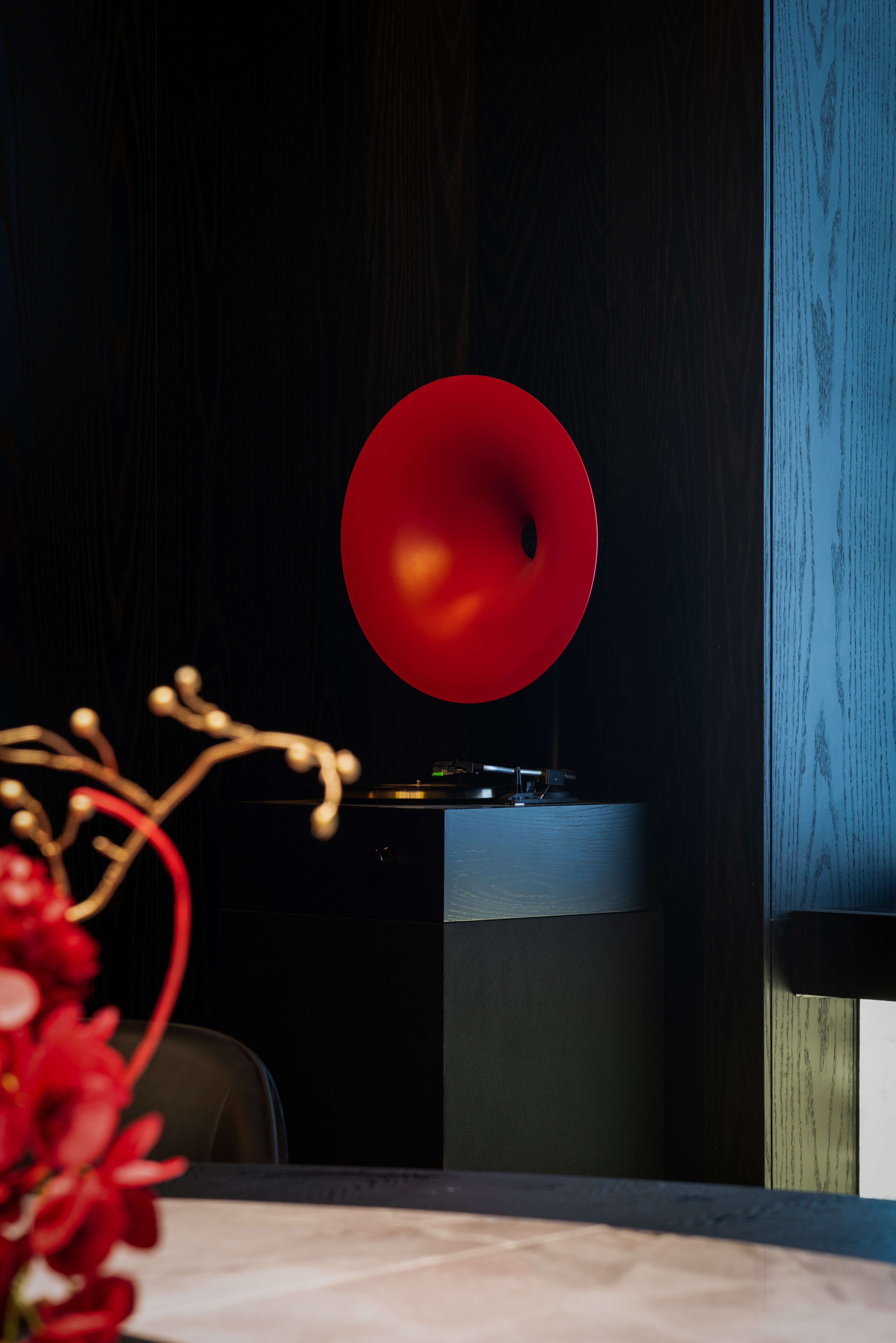 包间三|音律叠韵,时光对话 角落一隅,一台复古红色胶片机静置如艺术雕塑 它为沉静的东方氛围注入一抹温暖的现代浪漫 它不言,却仿佛有旧日旋律在空间中低回 营造出一种跨越时空的对话感 让经典与摩登在此刻和谐共鸣