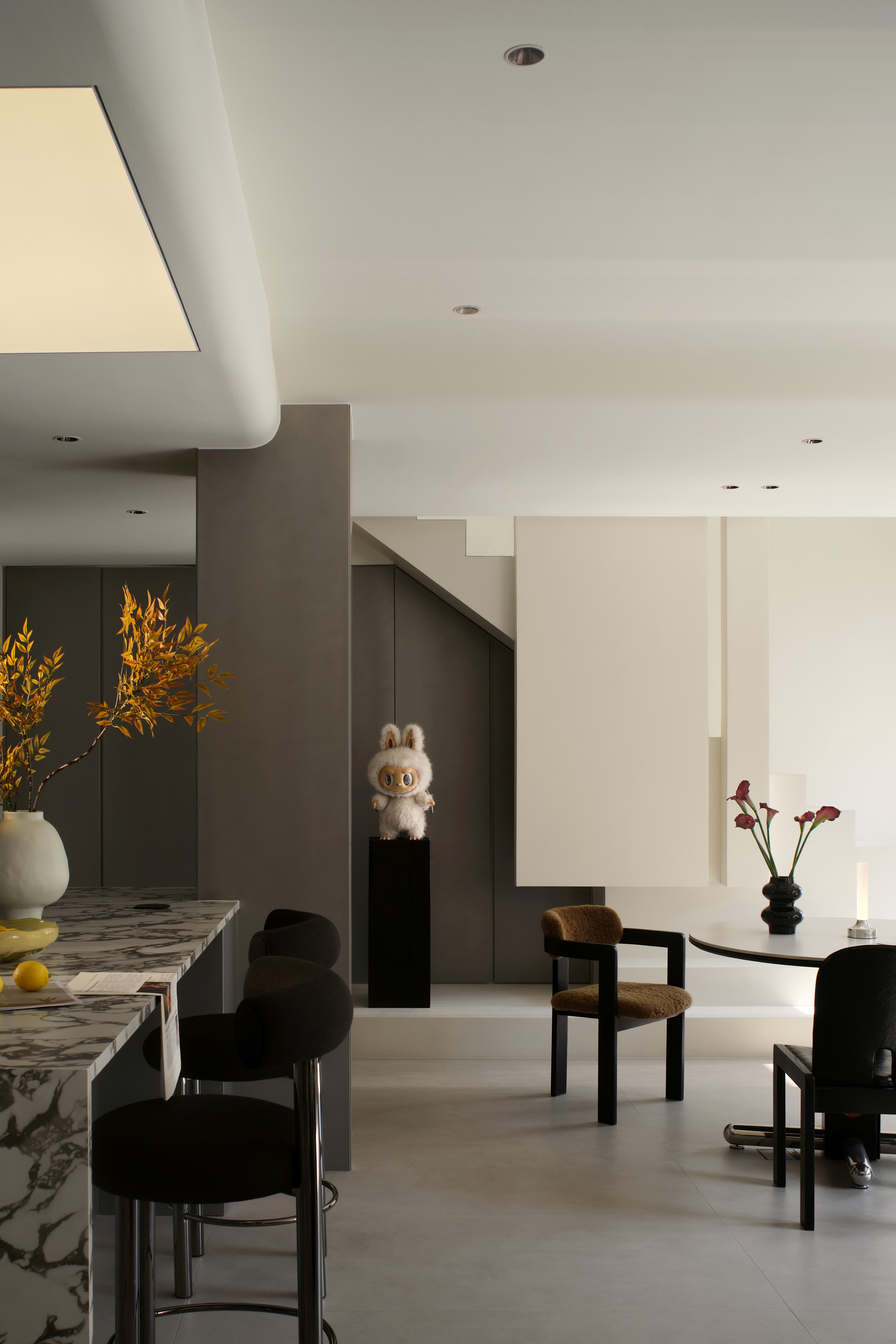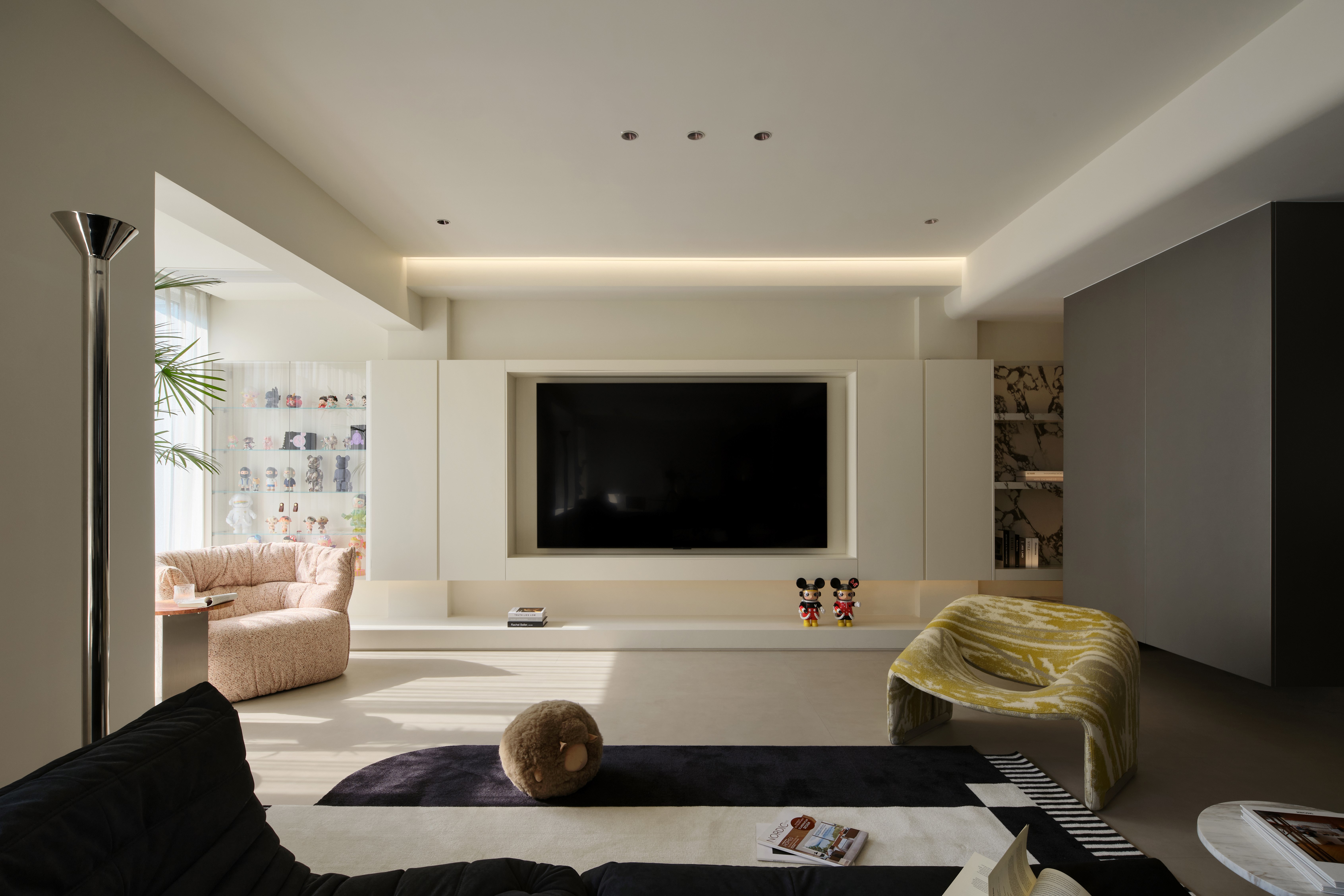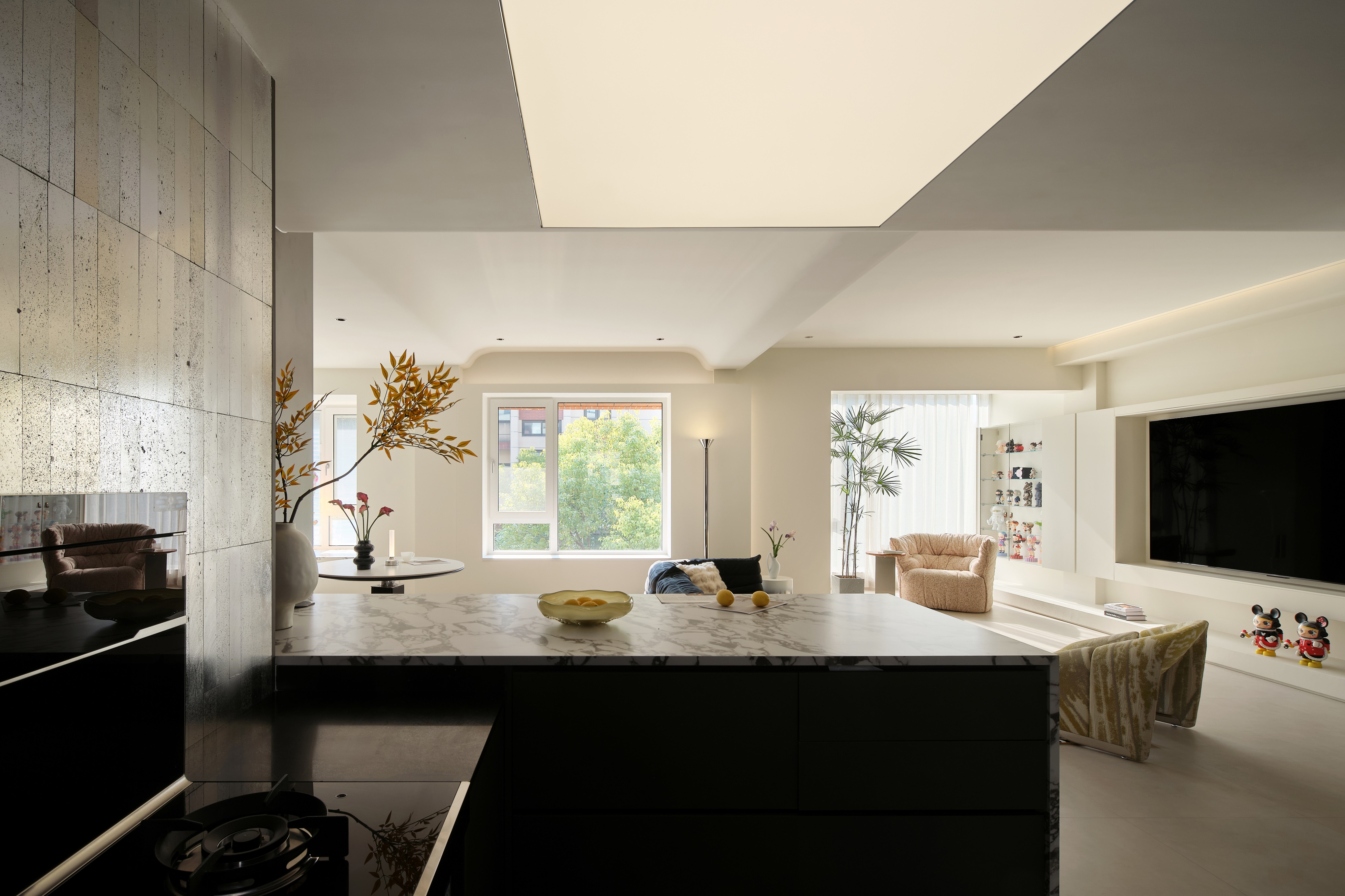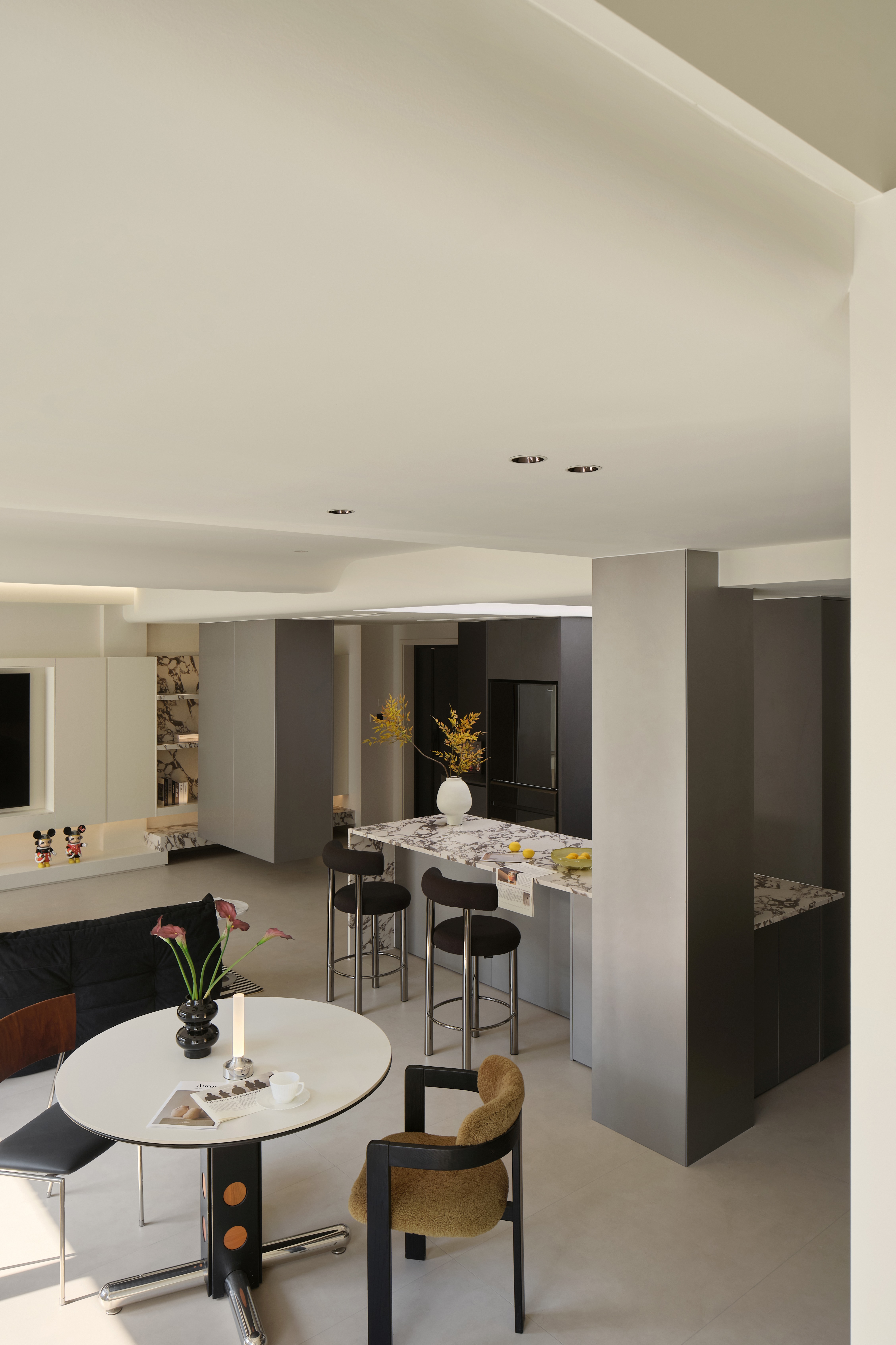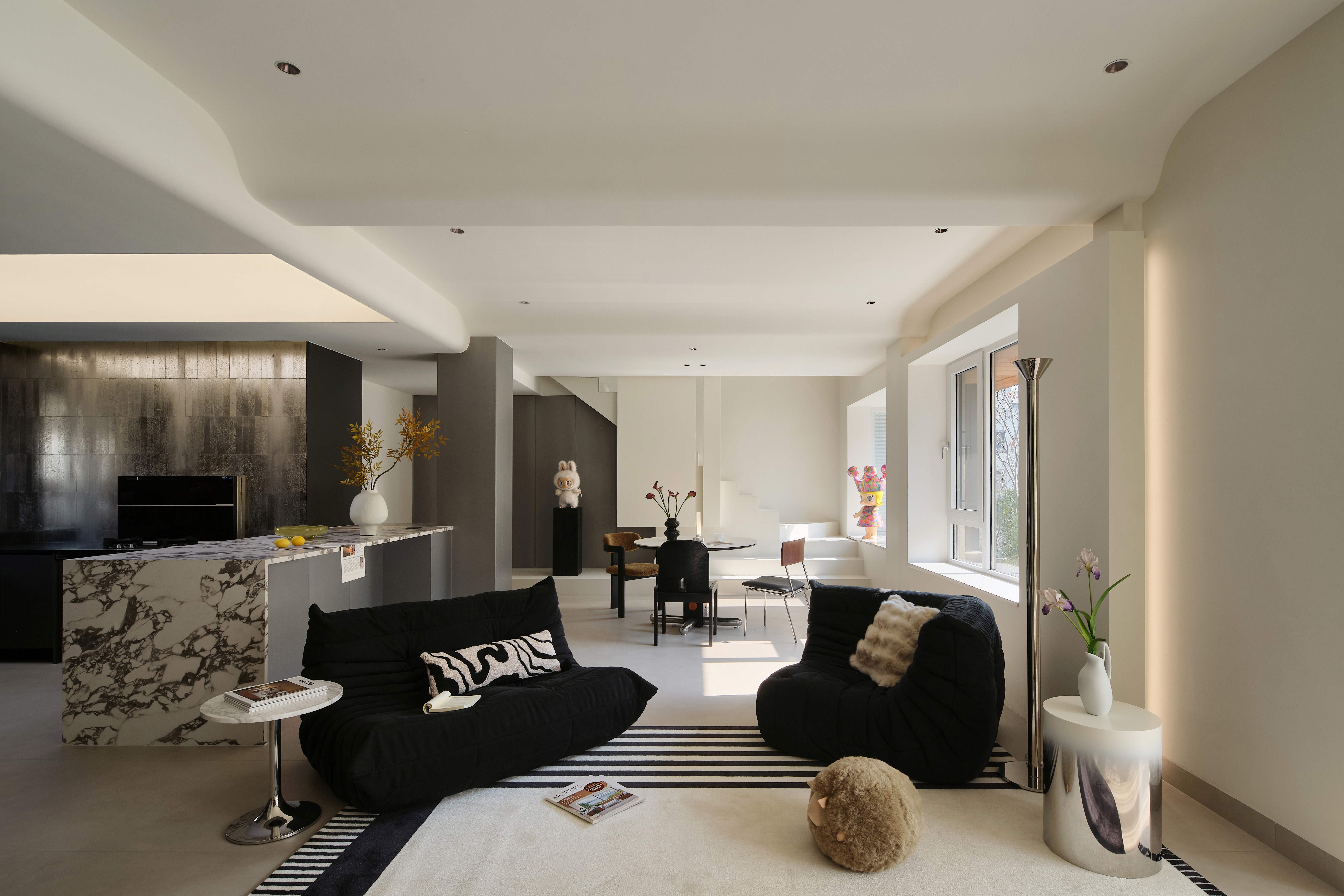 空间意境:整体环境以黑、白、灰为基调,构建出纯净而富有张力的视觉画面。创新之处在于打破“极简即冷感”的固有印象,通过精准的自然光引入、空间动线规划,以及如泡泡玛特雕塑、西皮风格挂画等趣味性软装点缀。极简不是风格的标签,而是为了让生活本身成为主角。在这里,每一个日常都因空间的包容而变得舒展,每一次归家都成为与自我对话的仪式。