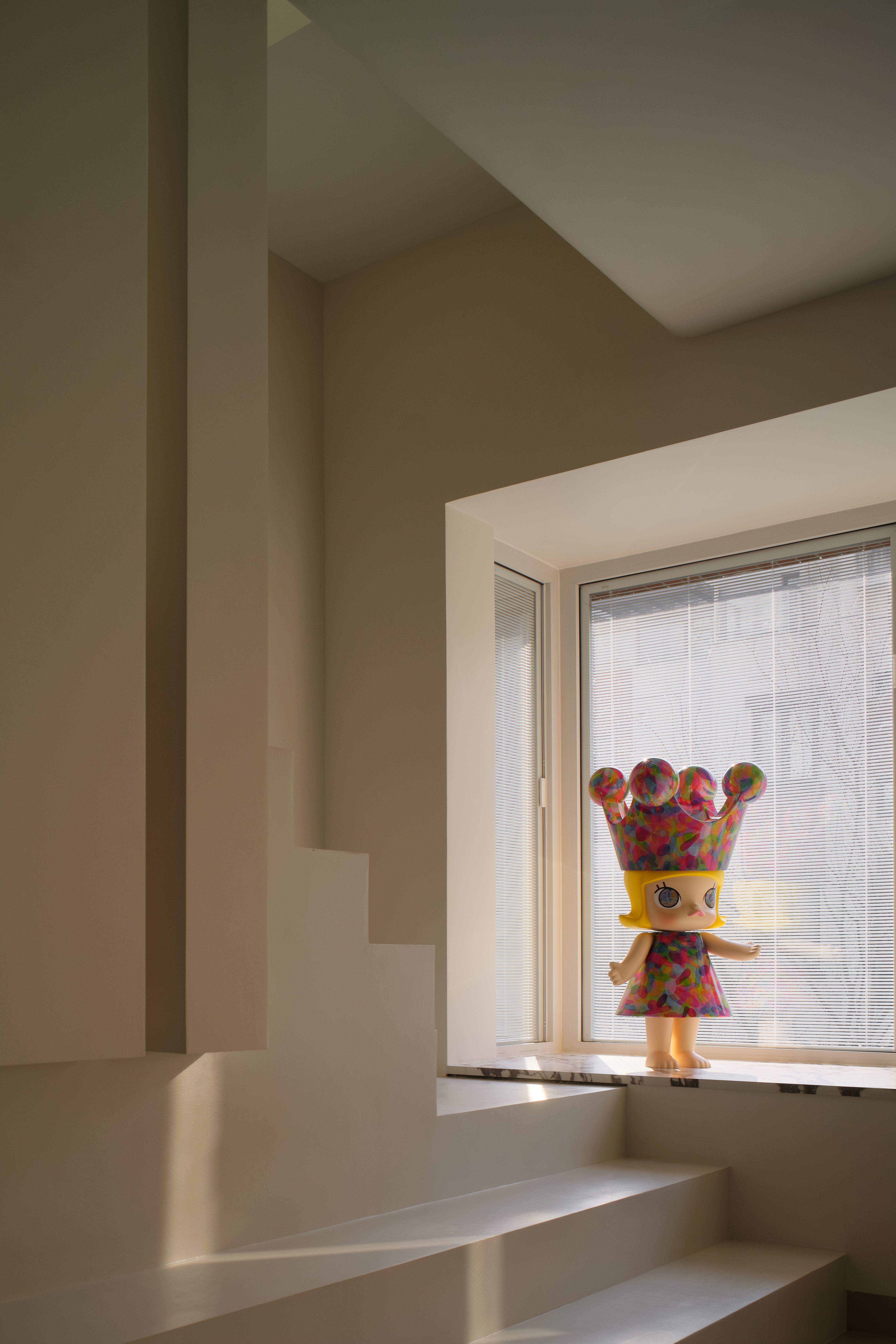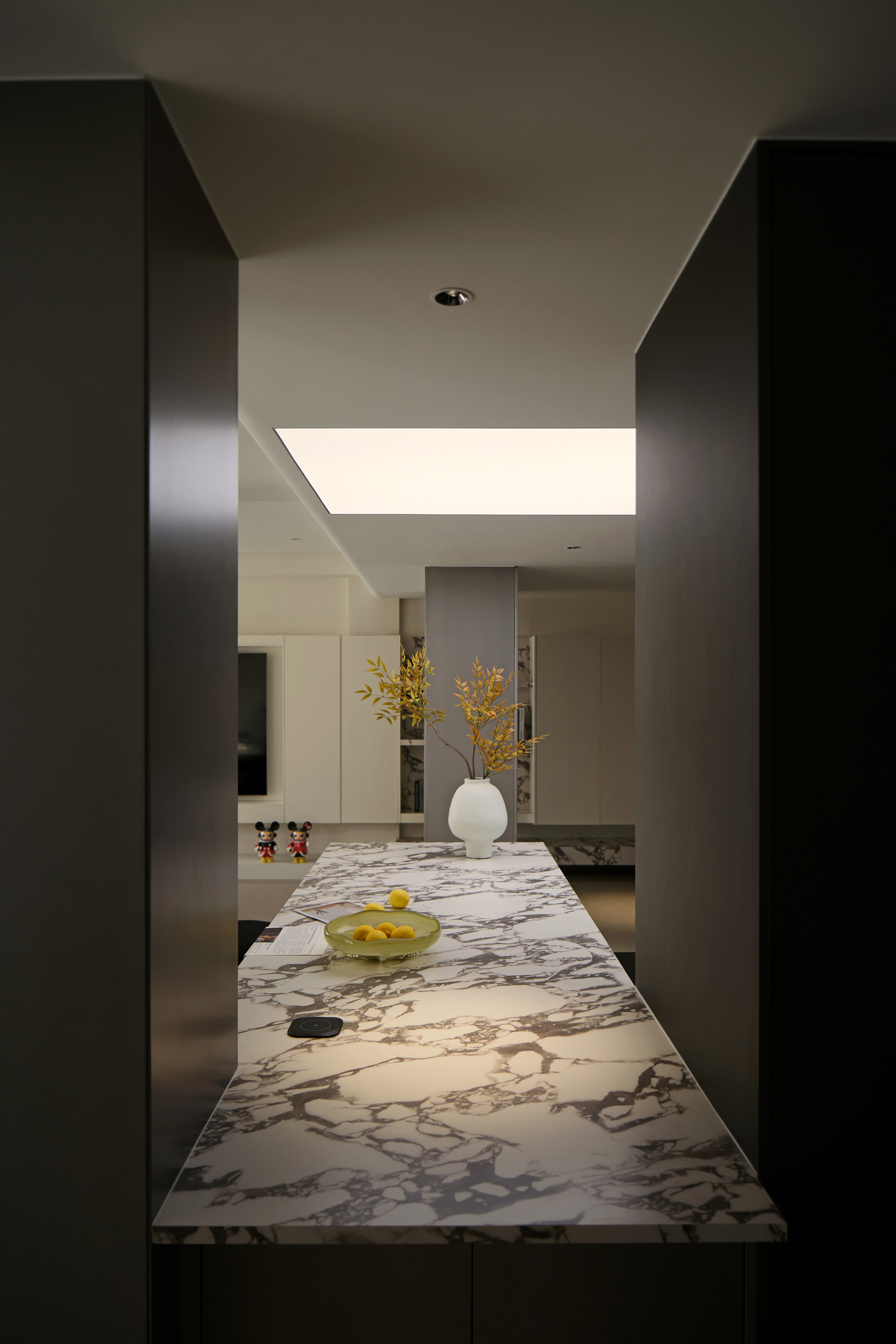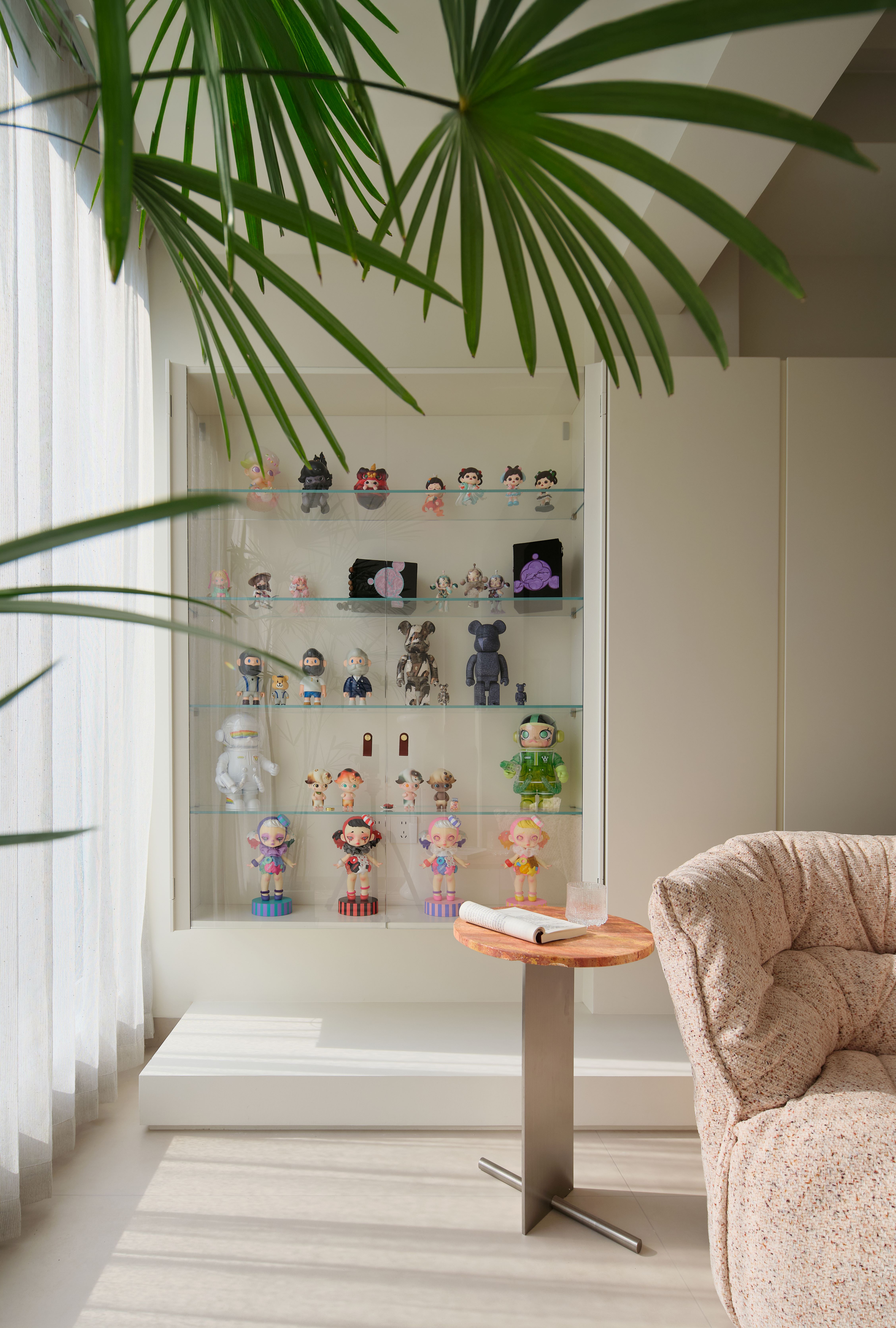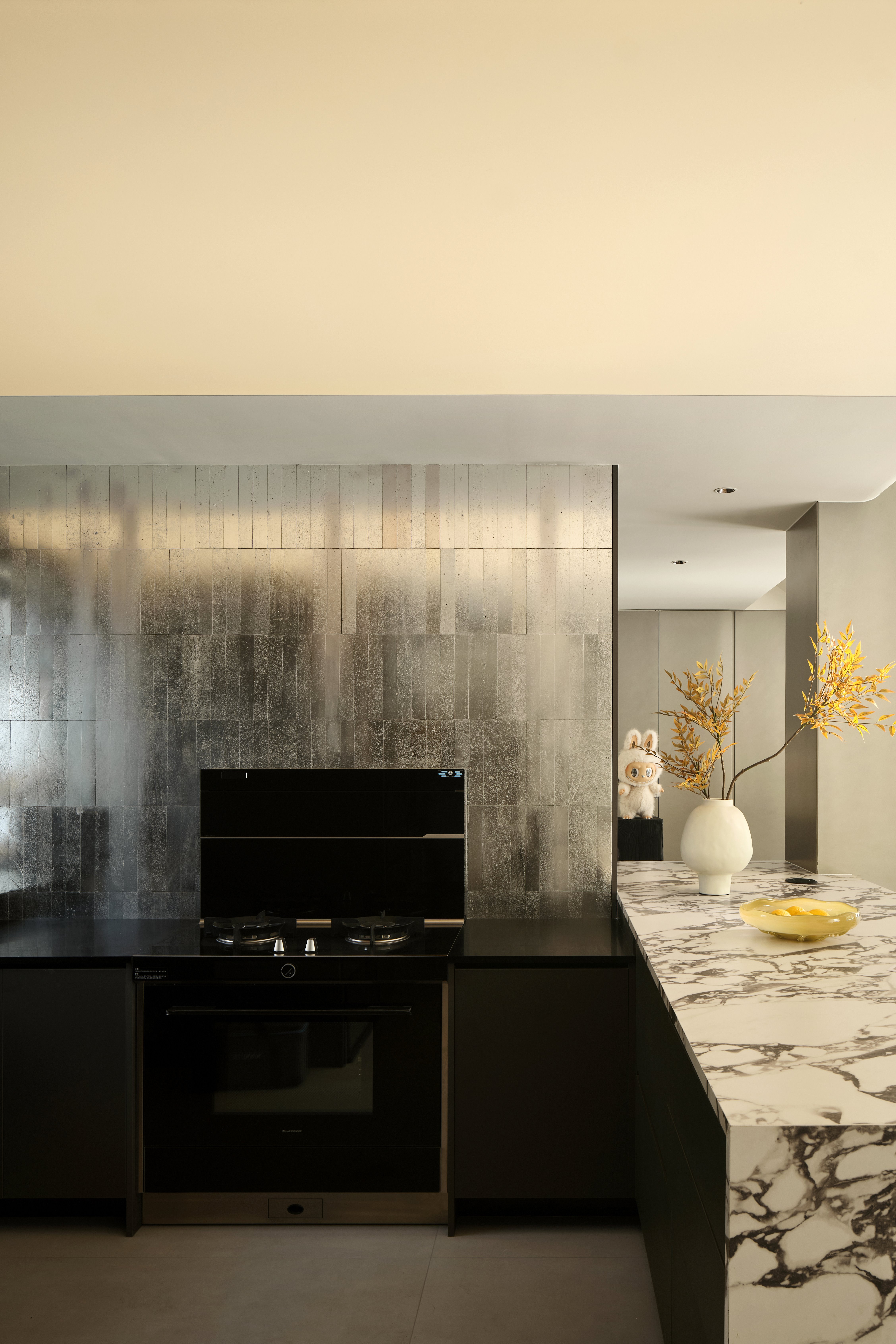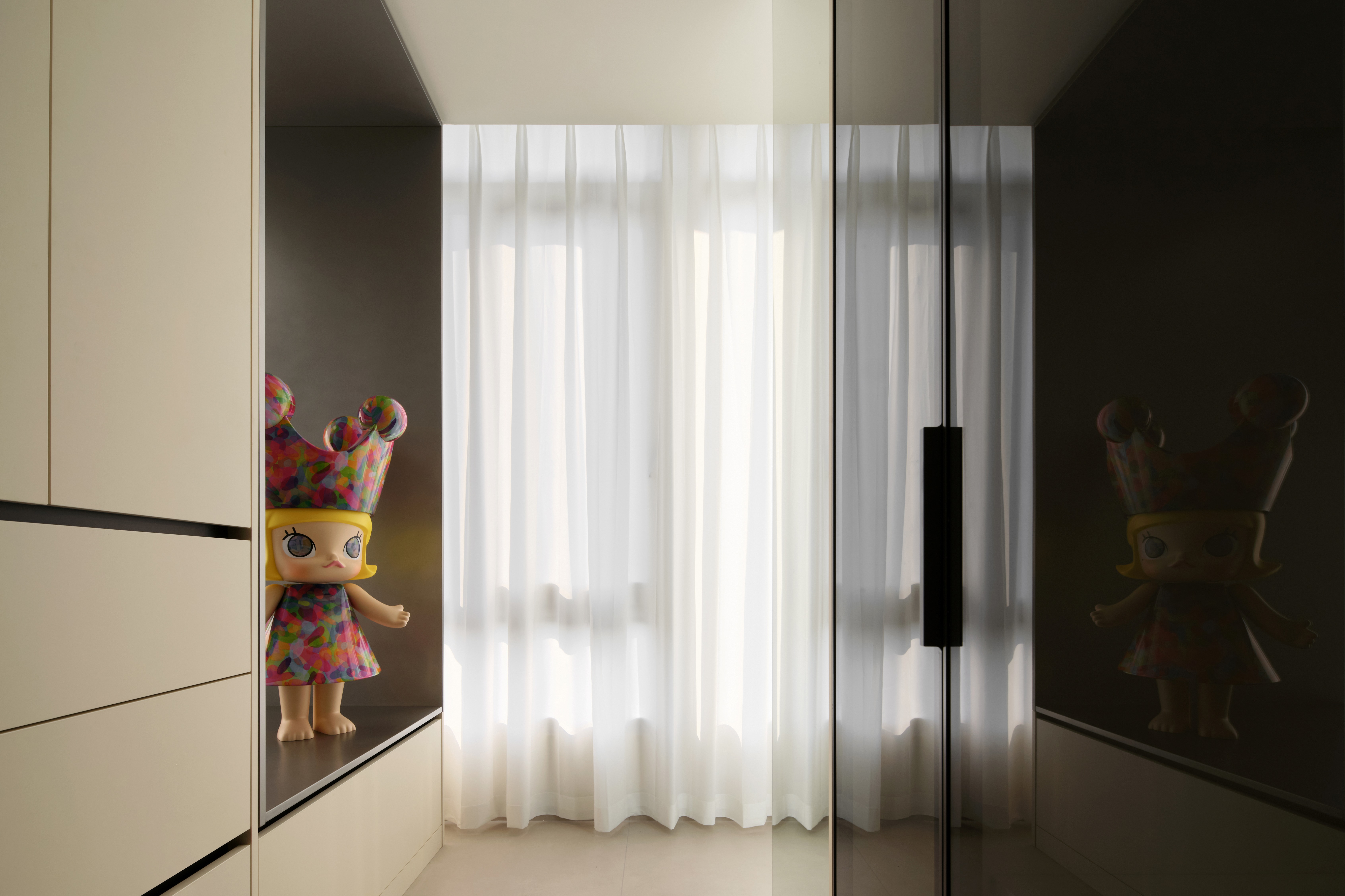 空间意境:整体环境以黑、白、灰为基调,构建出纯净而富有张力的视觉画面。创新之处在于打破“极简即冷感”的固有印象,通过精准的自然光引入、空间动线规划,以及如泡泡玛特雕塑、西皮风格挂画等趣味性软装点缀。极简不是风格的标签,而是为了让生活本身成为主角。在这里,每一个日常都因空间的包容而变得舒展,每一次归家都成为与自我对话的仪式。