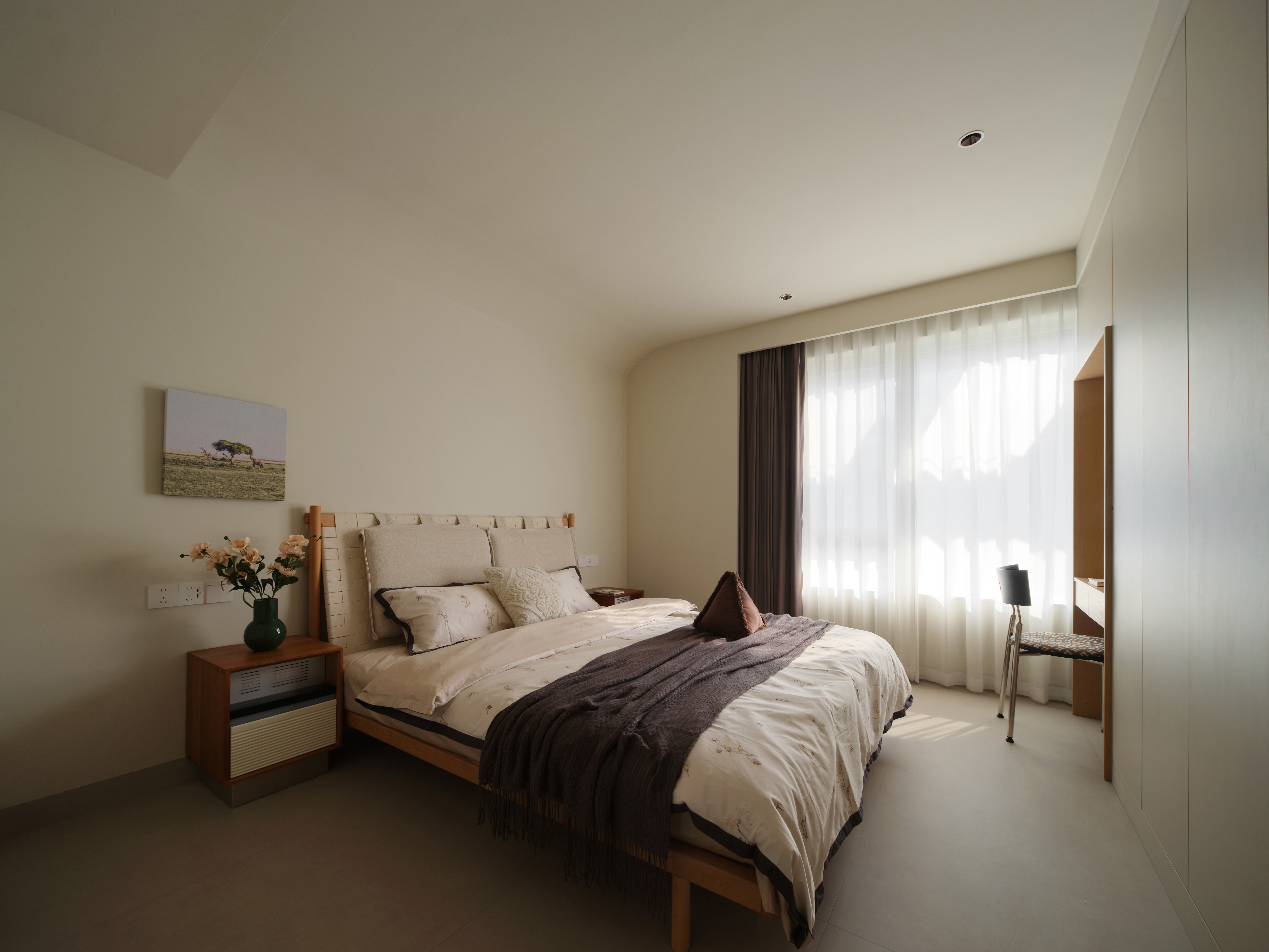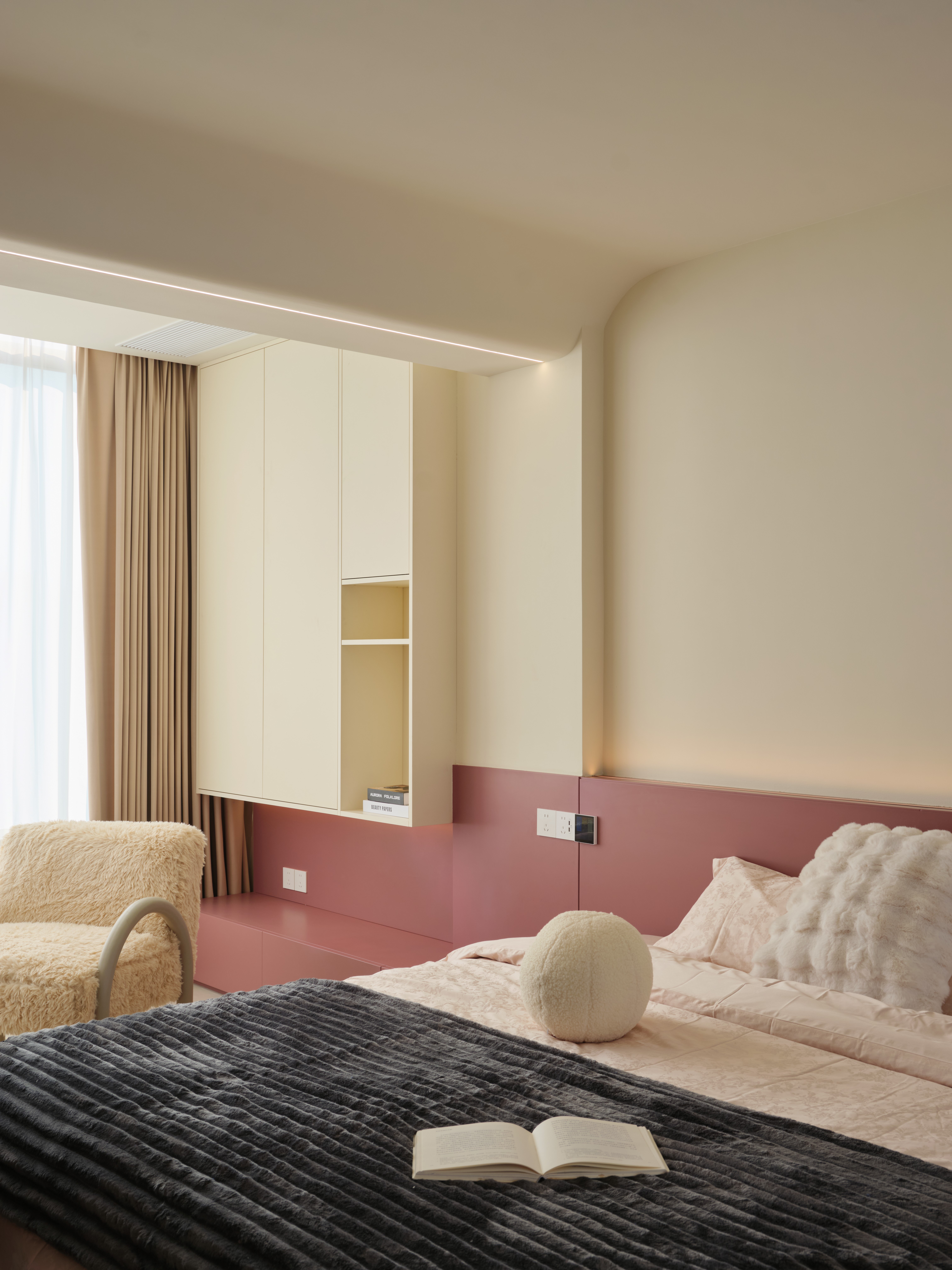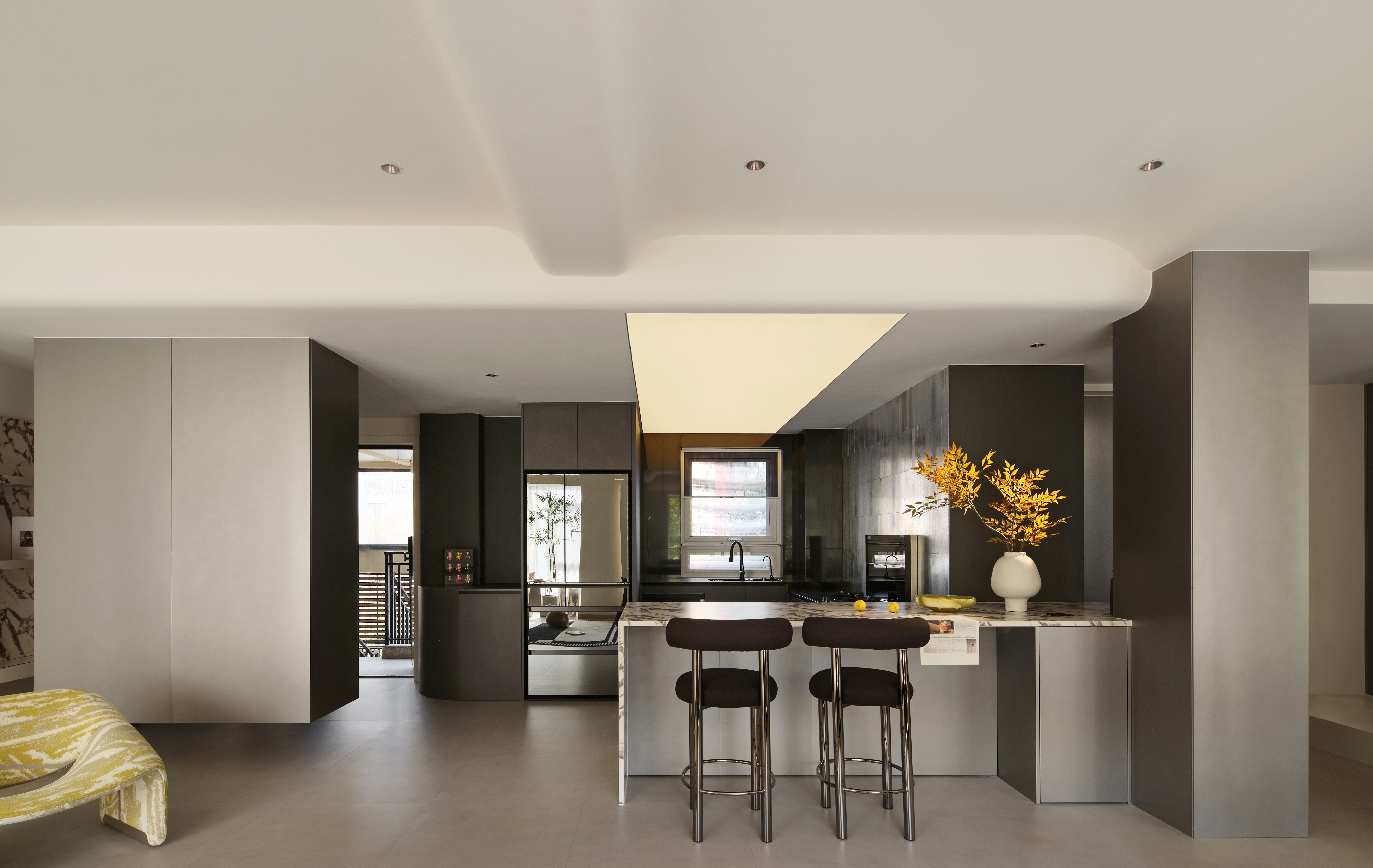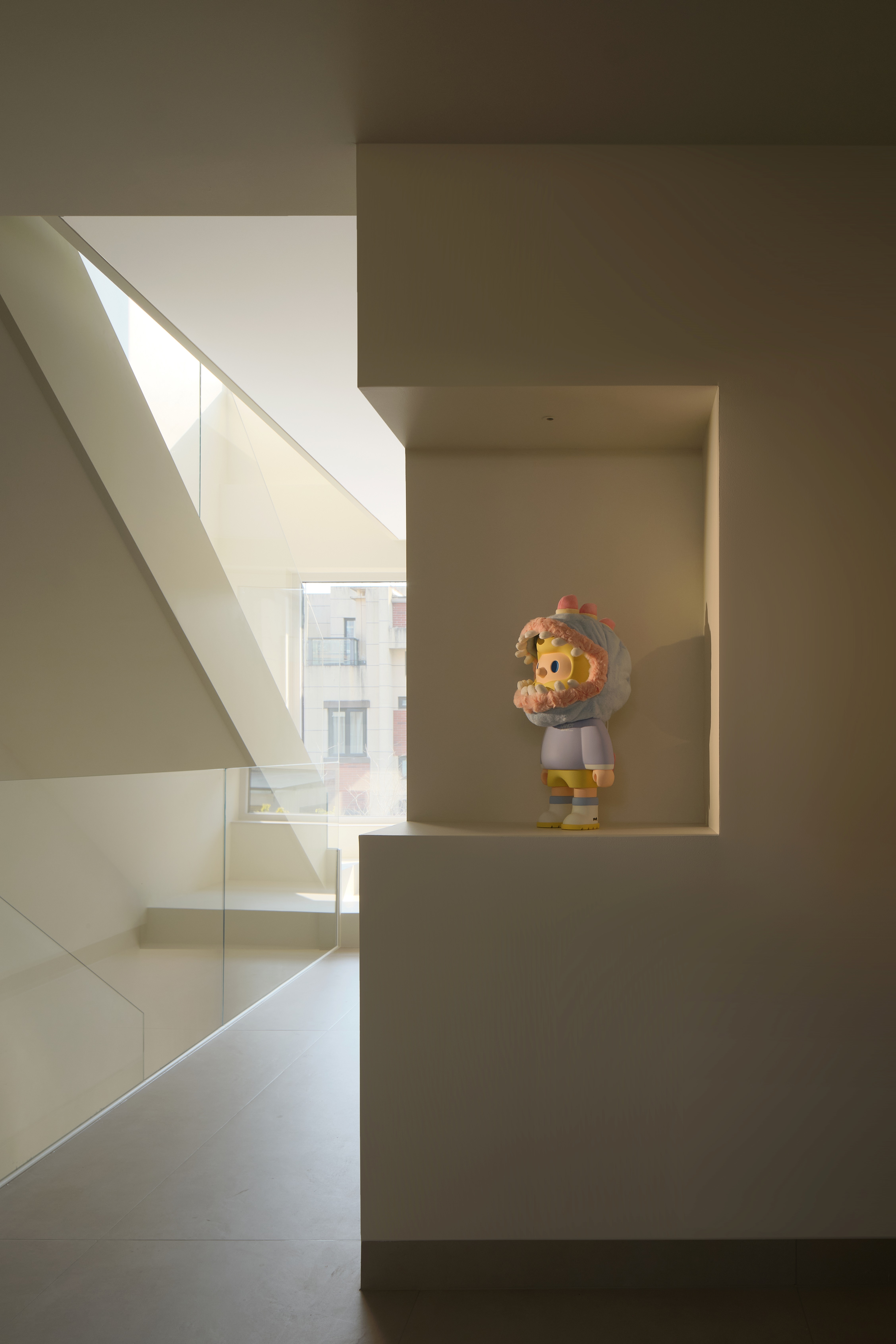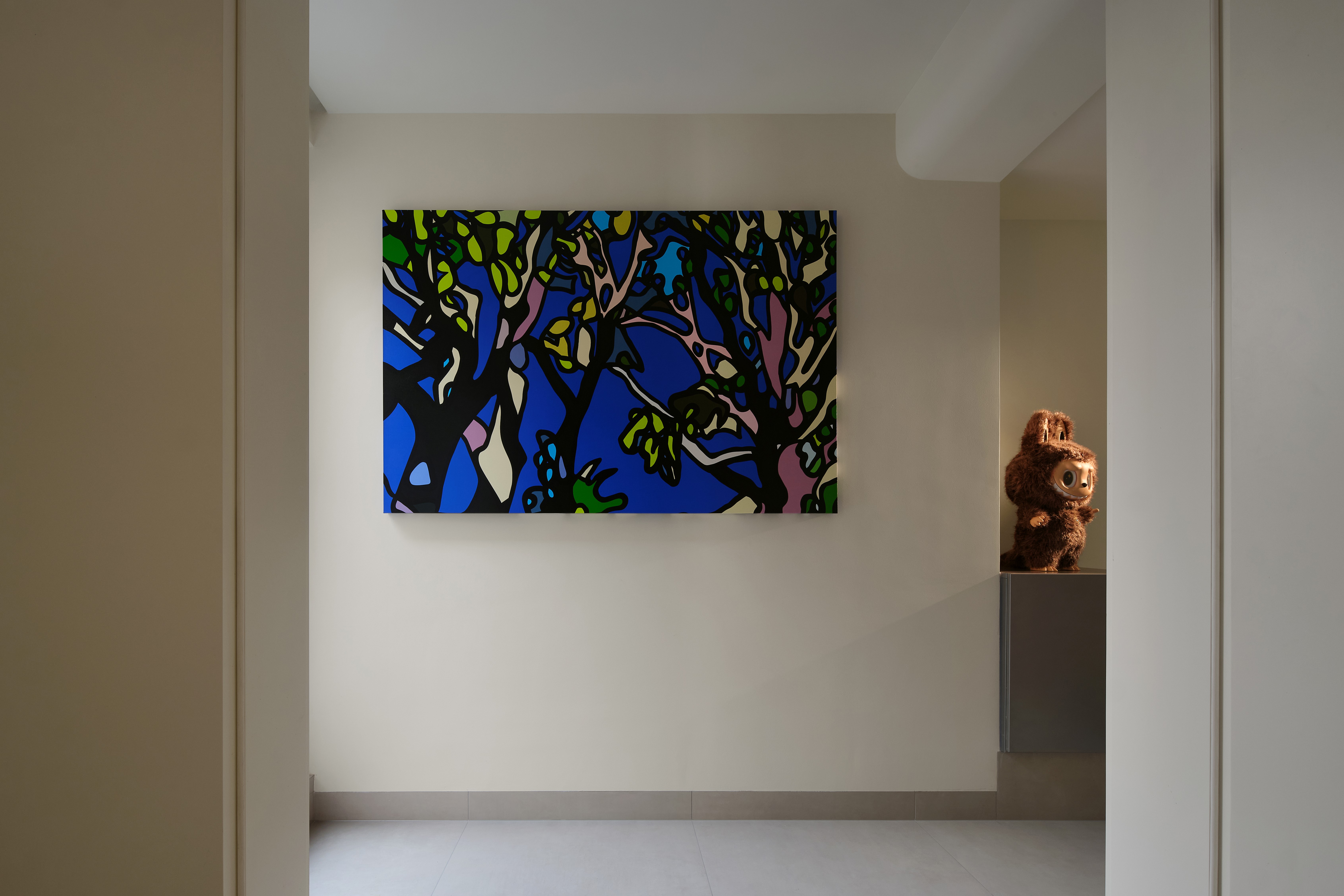 空间意境:整体环境以黑、白、灰为基调,构建出纯净而富有张力的视觉画面。创新之处在于打破“极简即冷感”的固有印象,通过精准的自然光引入、空间动线规划,以及如泡泡玛特雕塑、西皮风格挂画等趣味性软装点缀。极简不是风格的标签,而是为了让生活本身成为主角。在这里,每一个日常都因空间的包容而变得舒展,每一次归家都成为与自我对话的仪式。