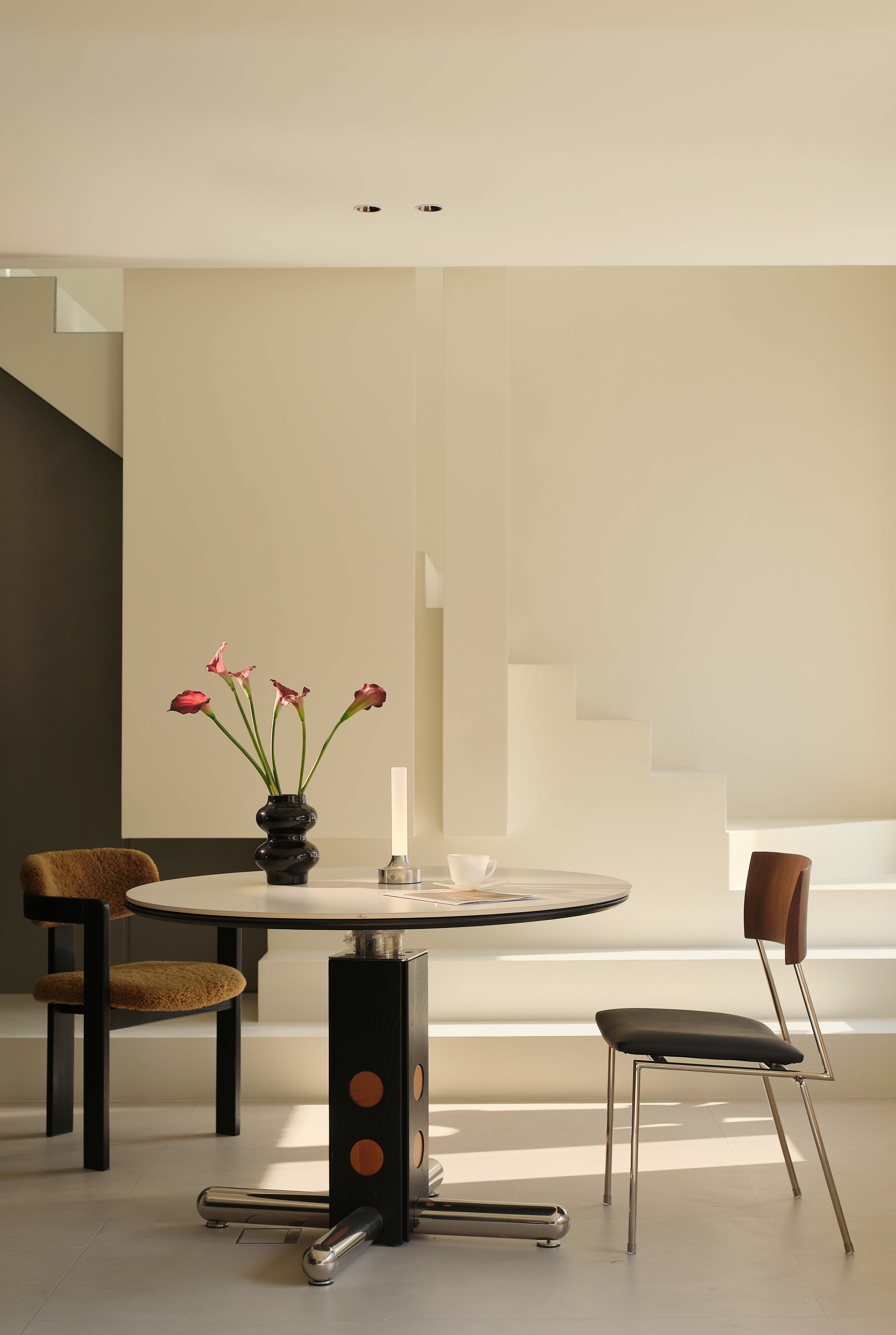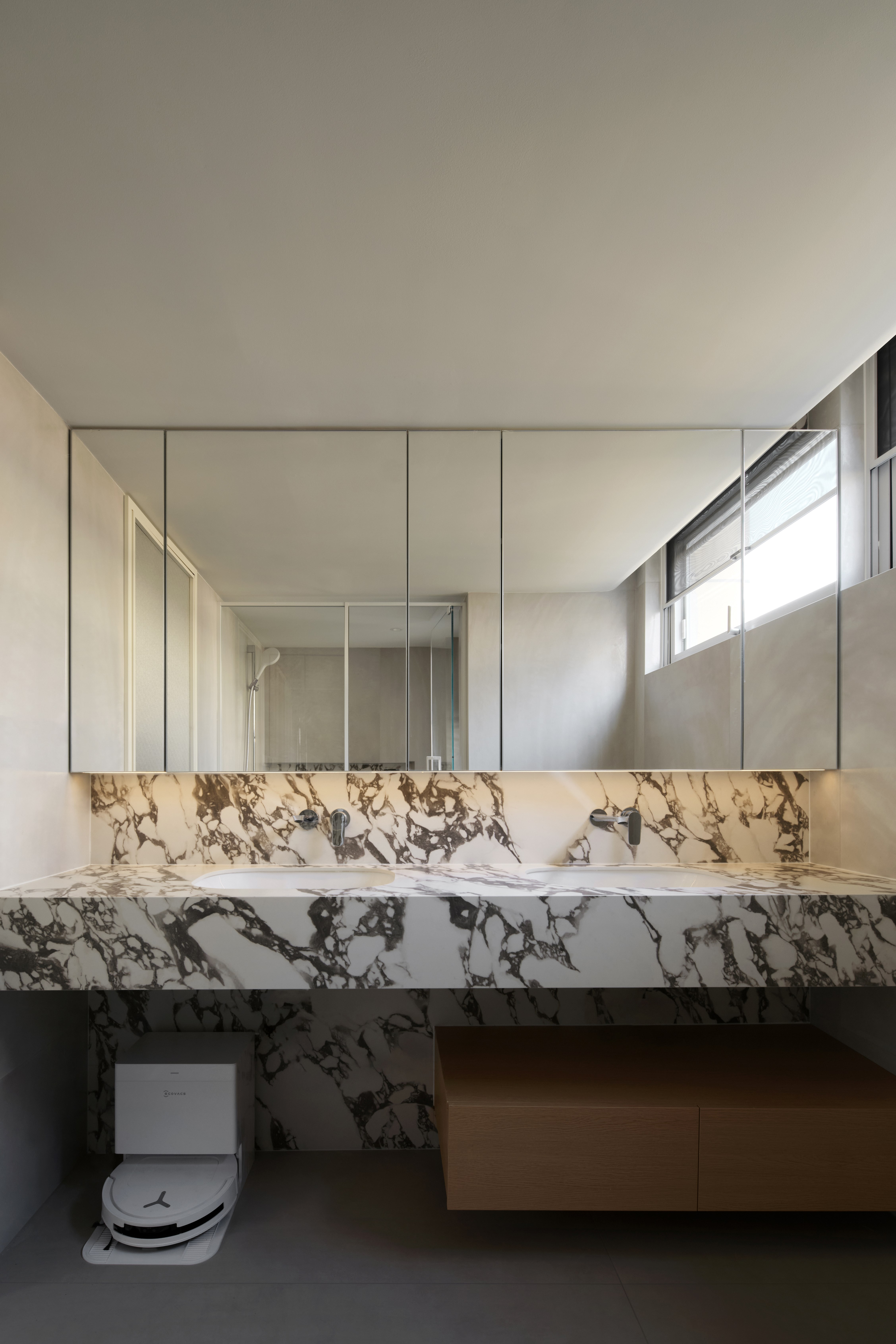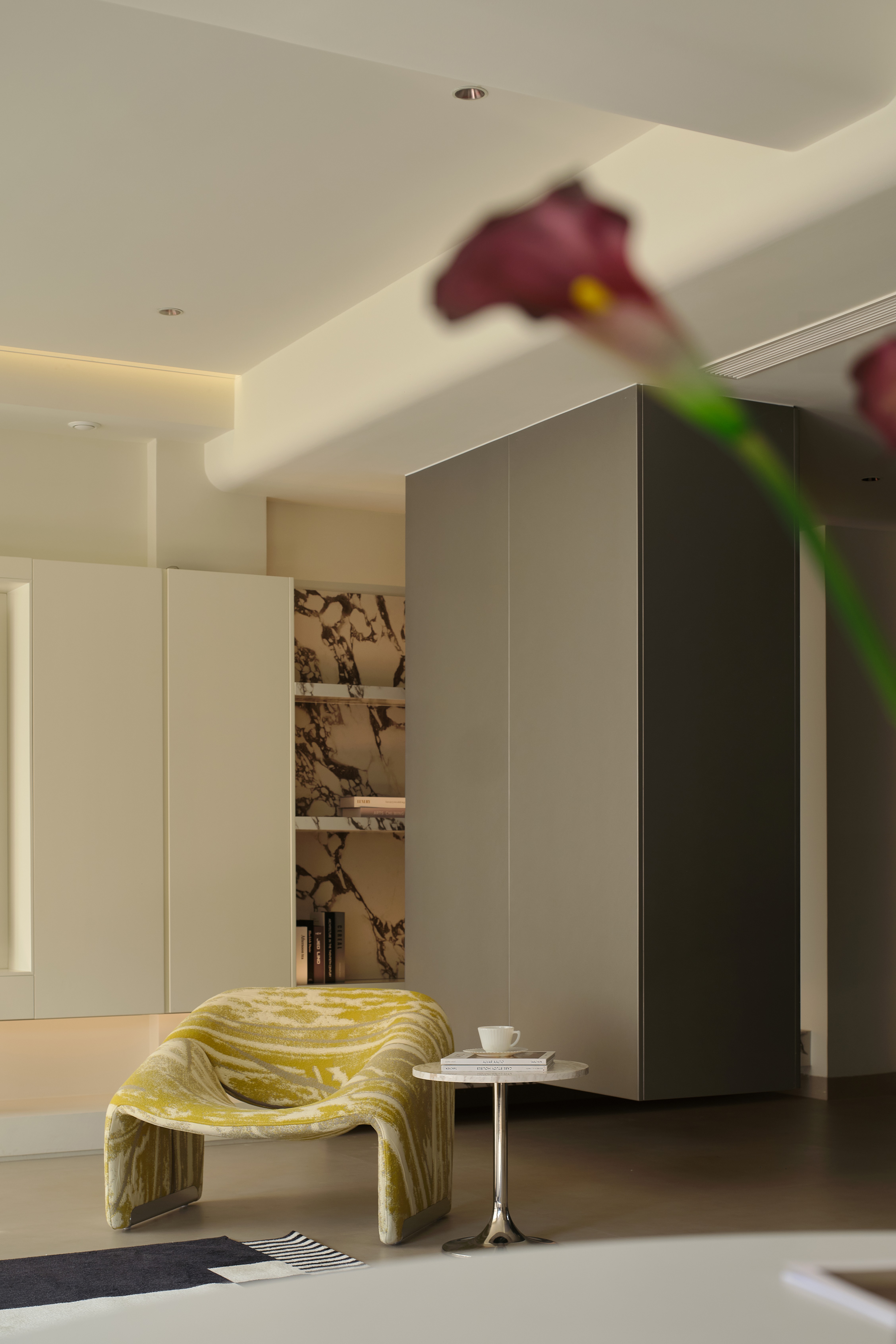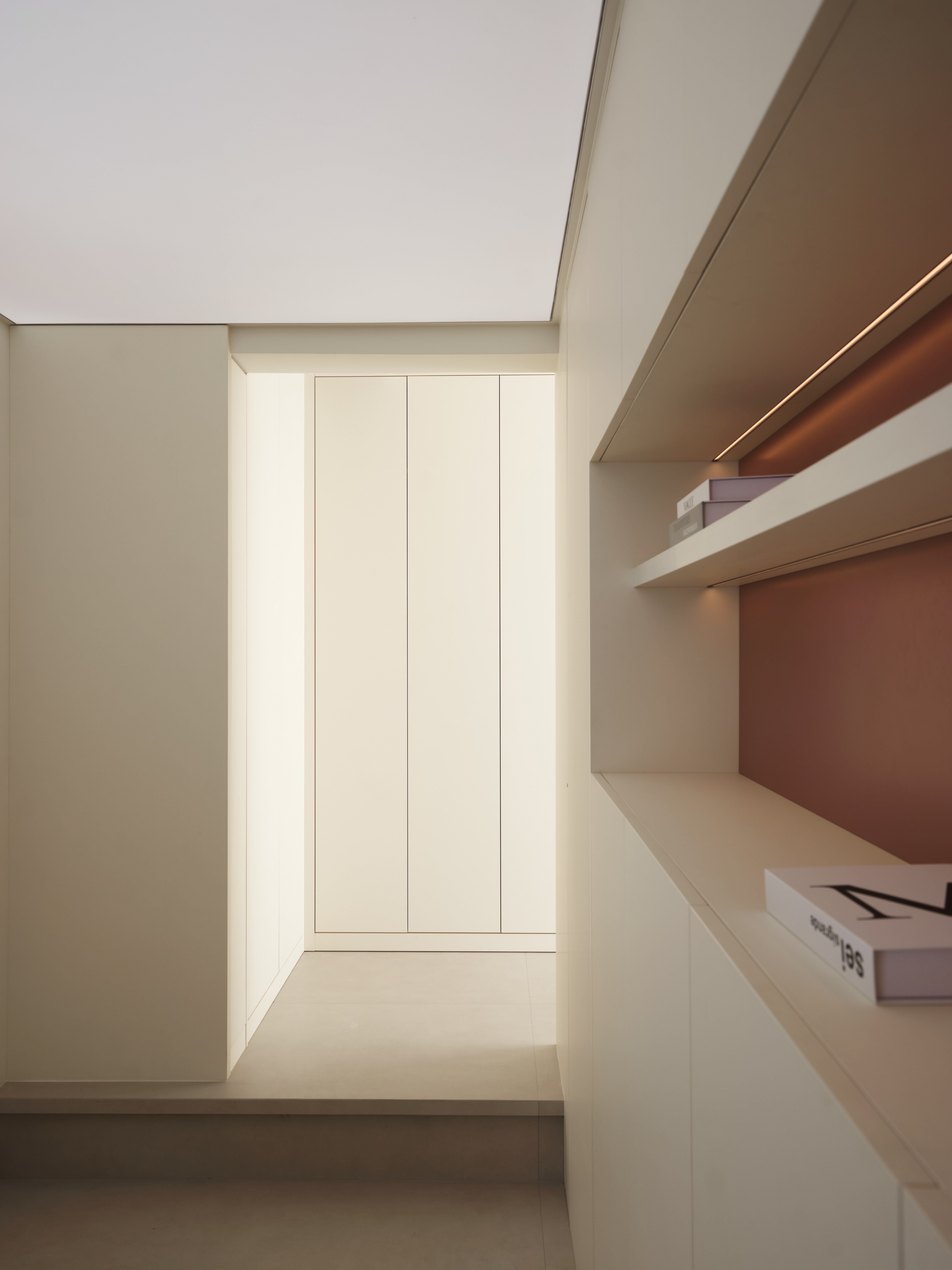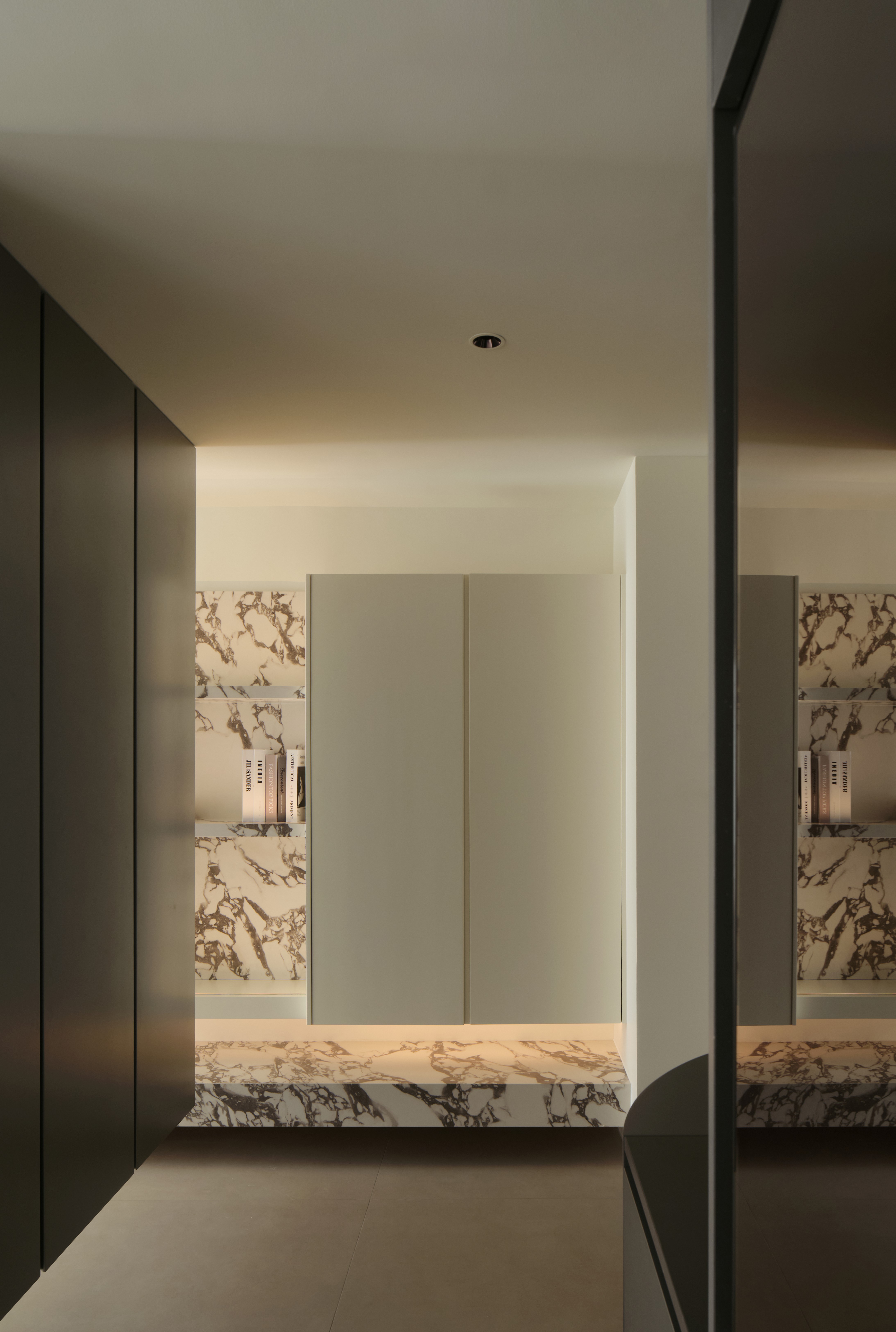 设计选材:选材强调质感对比与通透性,兼顾低碳与经济性。大量使用玻璃(如楼梯扶手、柜门)、镜面及光面材质,增强反射与空间纵深感,减少照明能耗。核心墙体采用原有承重结构,减少新建;运用大理石、金属、绒布等材质在关键部位点缀,提升品质。悬浮柜体、线性灯带等设计,在减少体量感的同时,亦实现了高效的情景照明。