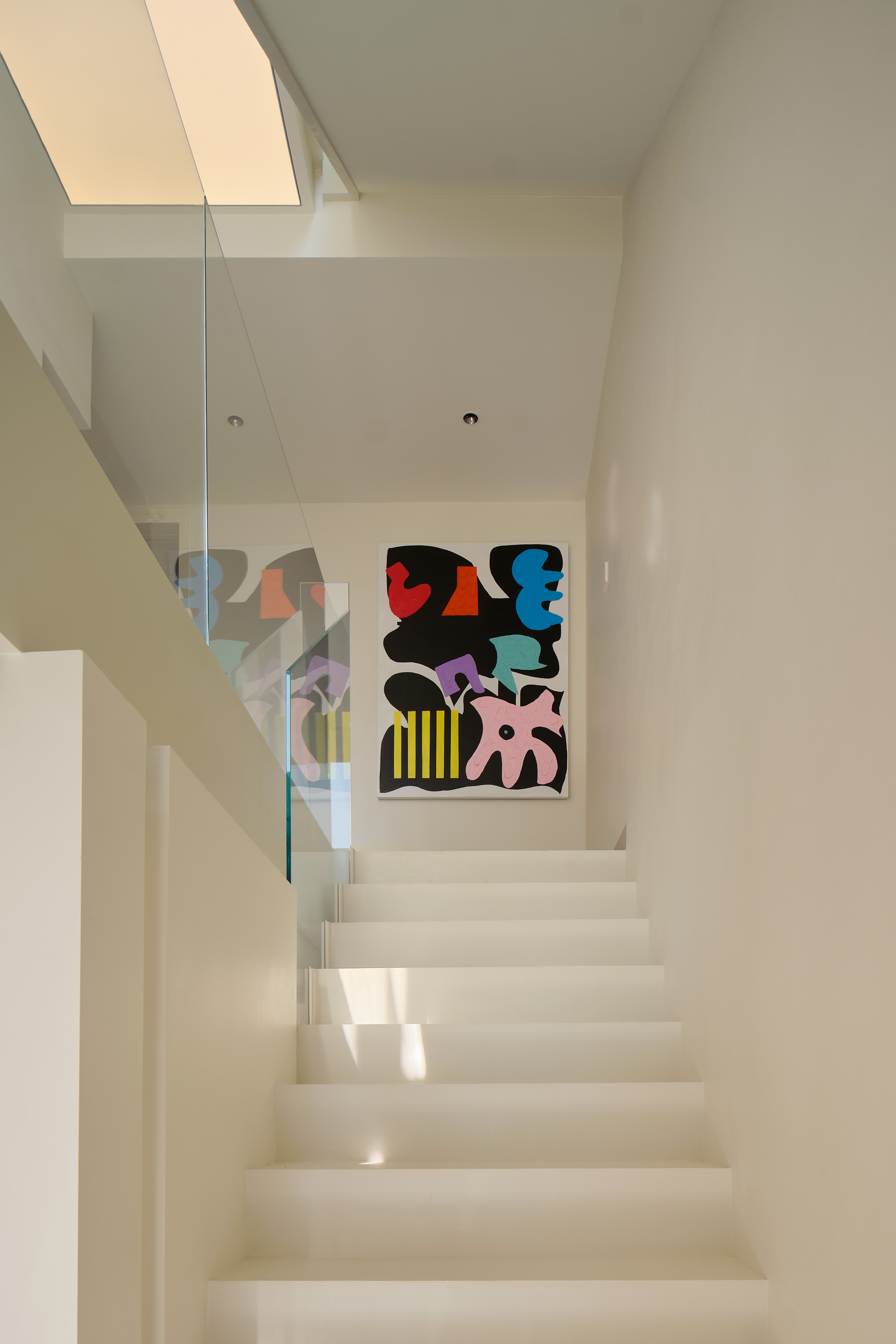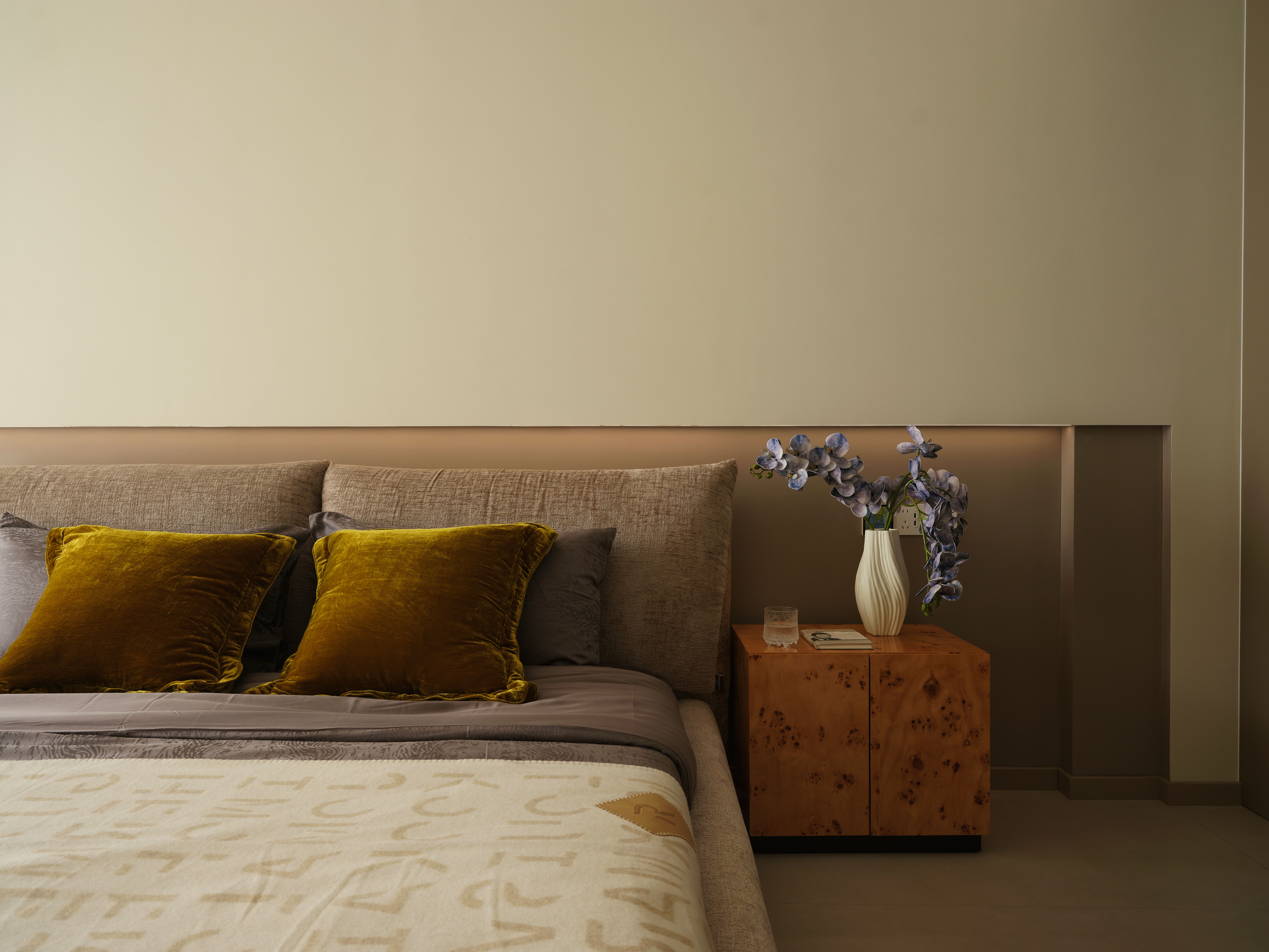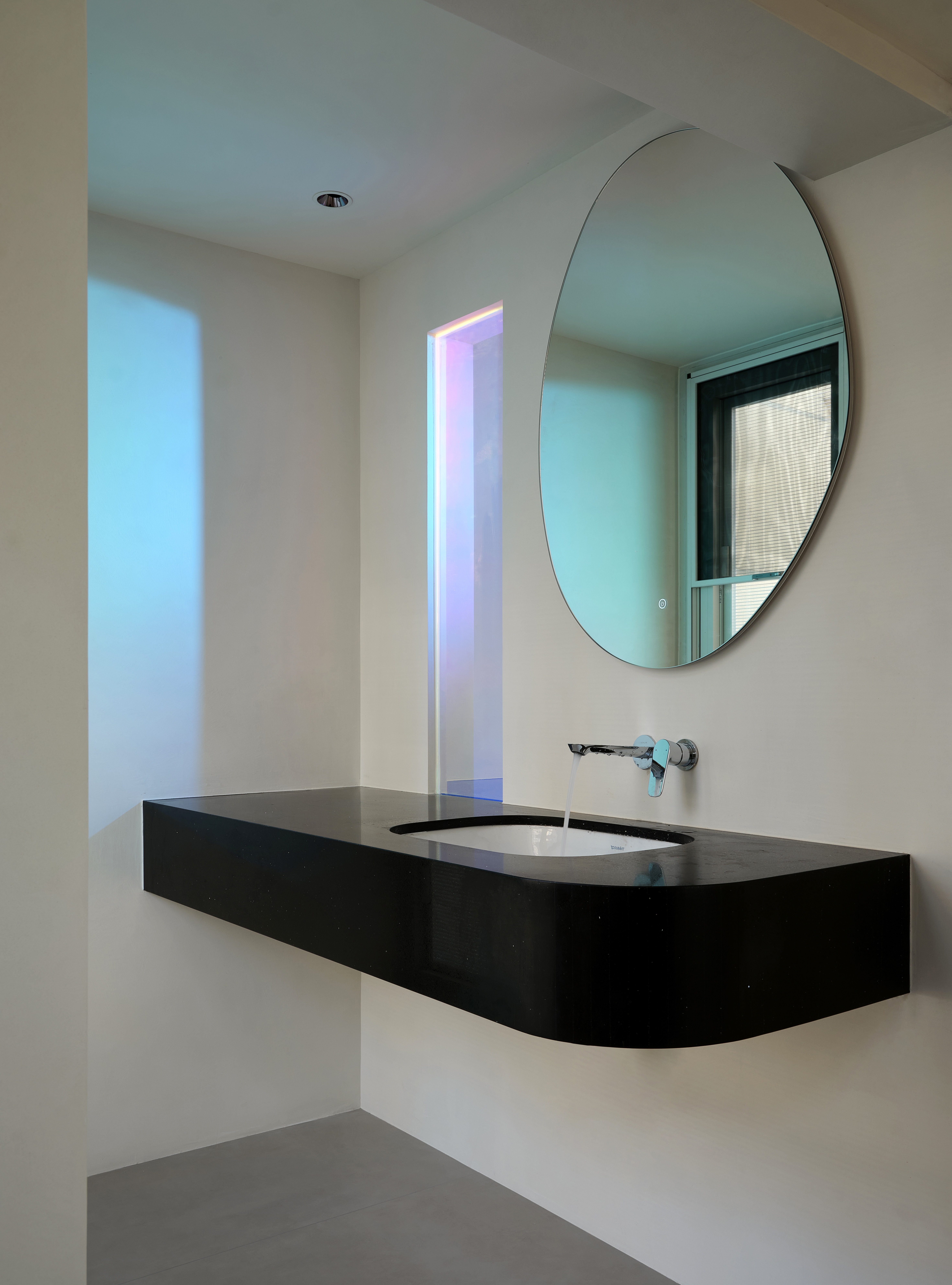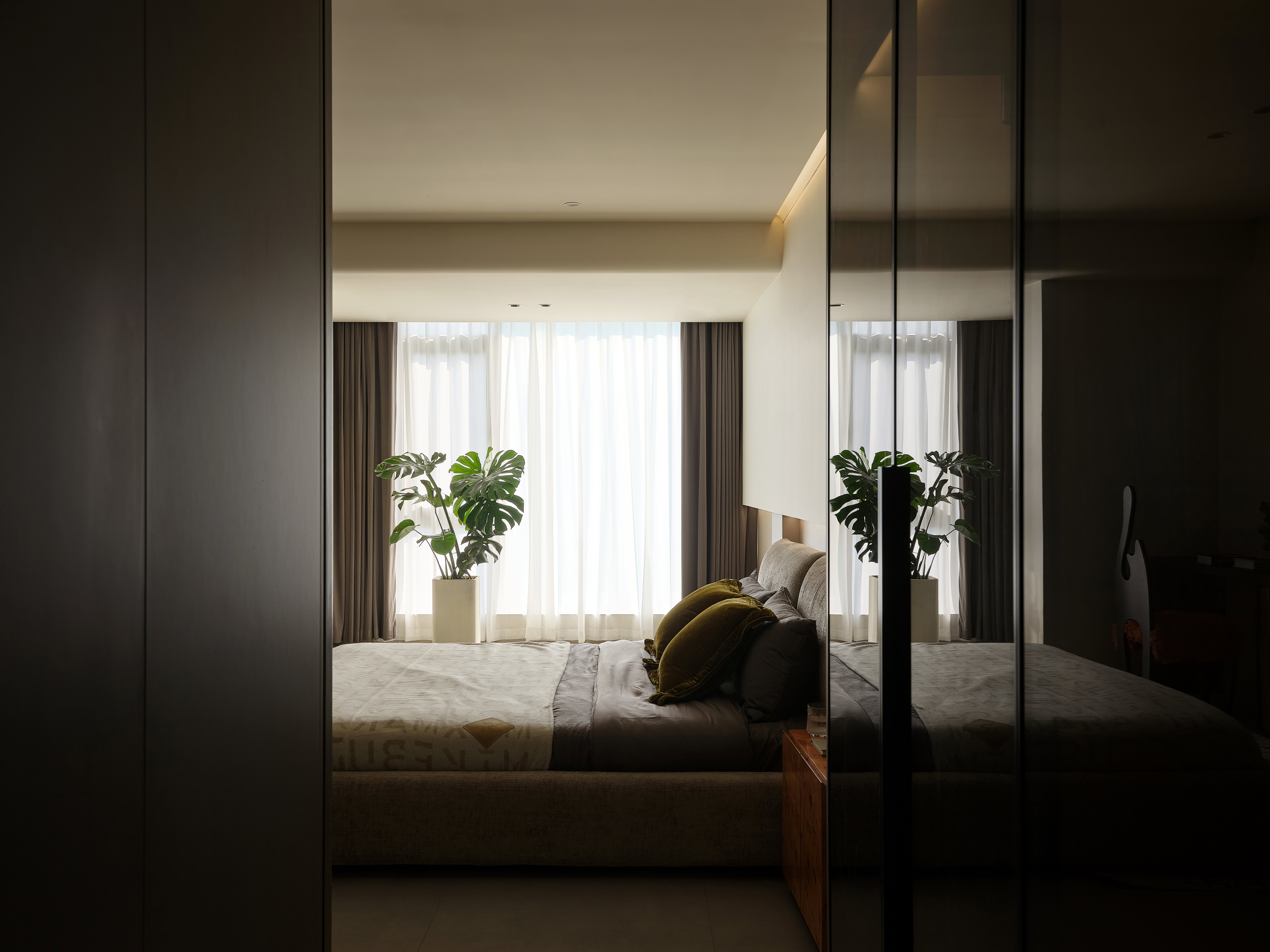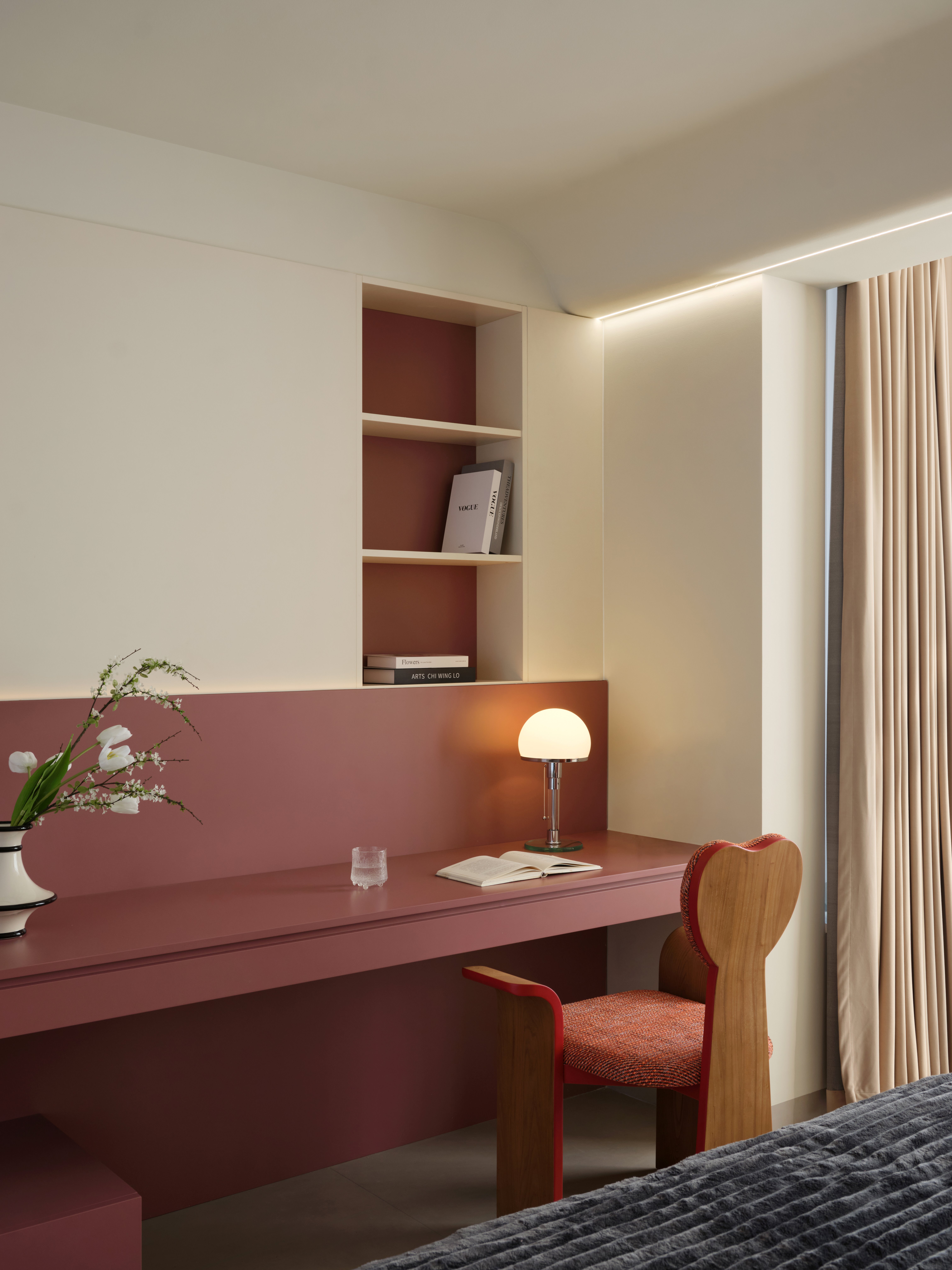 设计选材:选材强调质感对比与通透性,兼顾低碳与经济性。大量使用玻璃(如楼梯扶手、柜门)、镜面及光面材质,增强反射与空间纵深感,减少照明能耗。核心墙体采用原有承重结构,减少新建;运用大理石、金属、绒布等材质在关键部位点缀,提升品质。悬浮柜体、线性灯带等设计,在减少体量感的同时,亦实现了高效的情景照明。