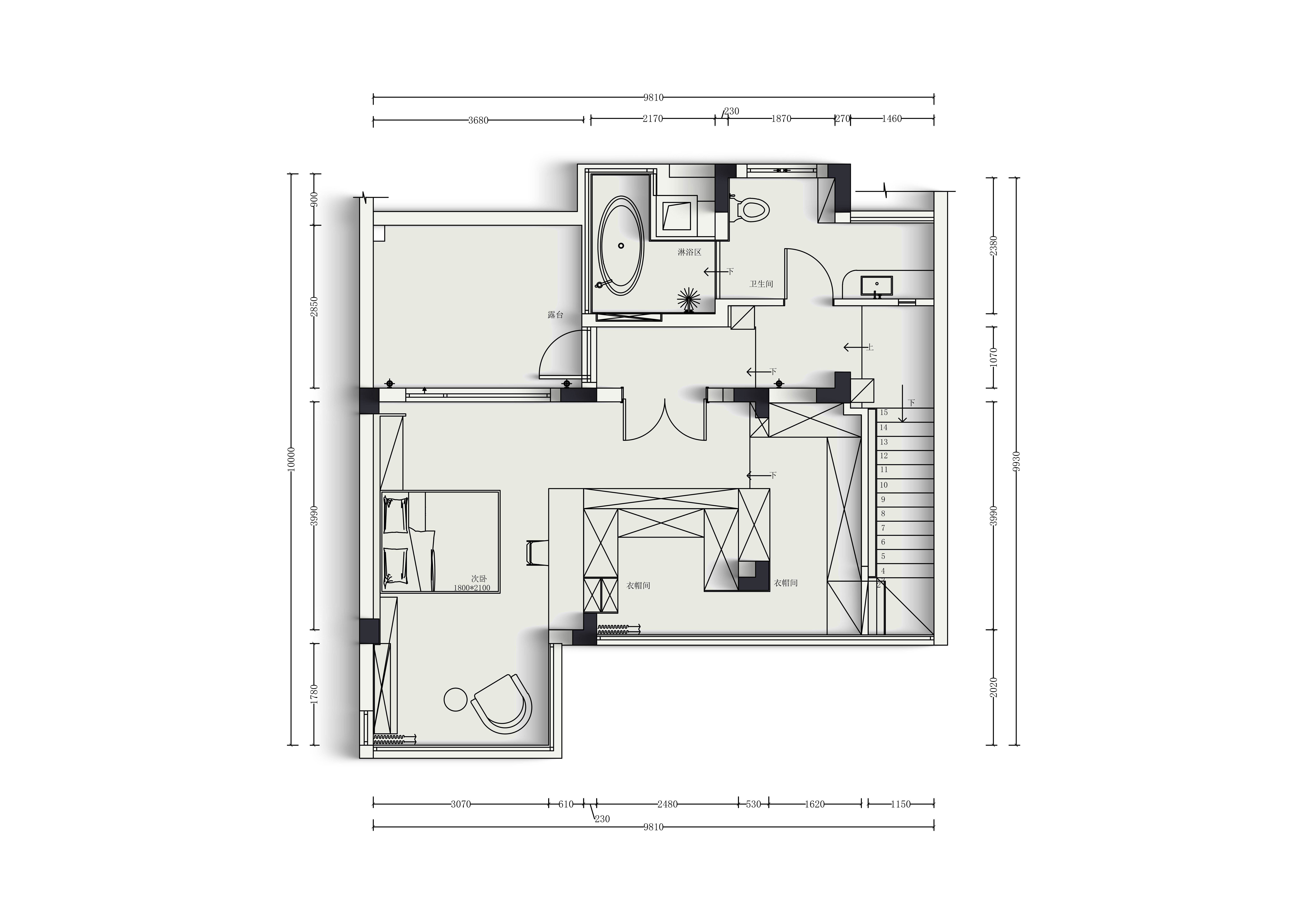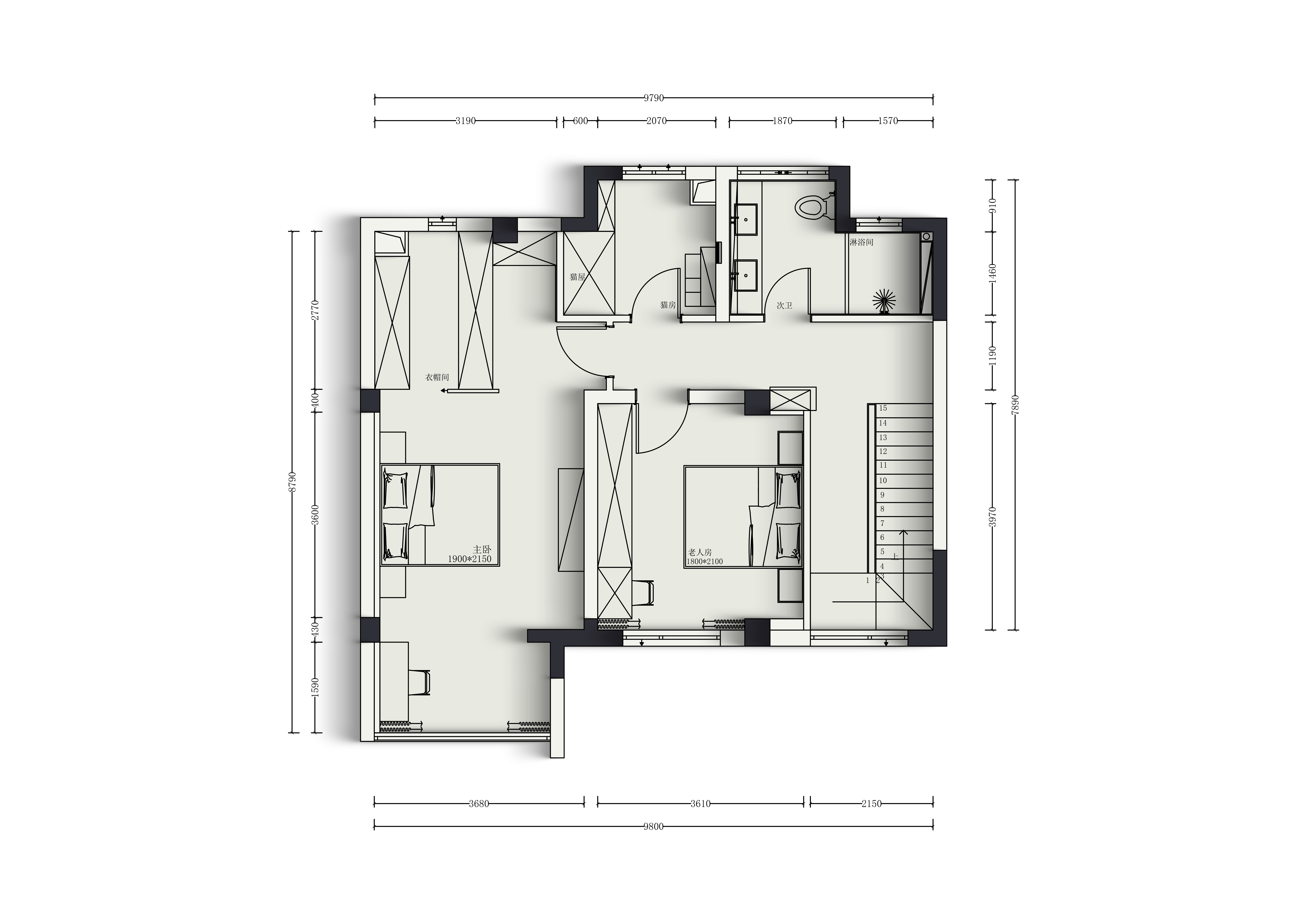 空间布局:布局的核心创新在于“解放空间,重塑流动”。三层空间均进行了颠覆性改造:一层拆除隔墙,形成融合客、餐、厨的开放式大空间,并移位楼梯,使其成为动态视觉焦点;二层打通主卧隔墙,形成集睡眠、休闲、衣帽间于一体的通透套房;三层则将南向隔墙全数拆除,最大化引光入室。各层均以功能和动线为导向,动静分离,实现光、气、视线的无阻贯通。