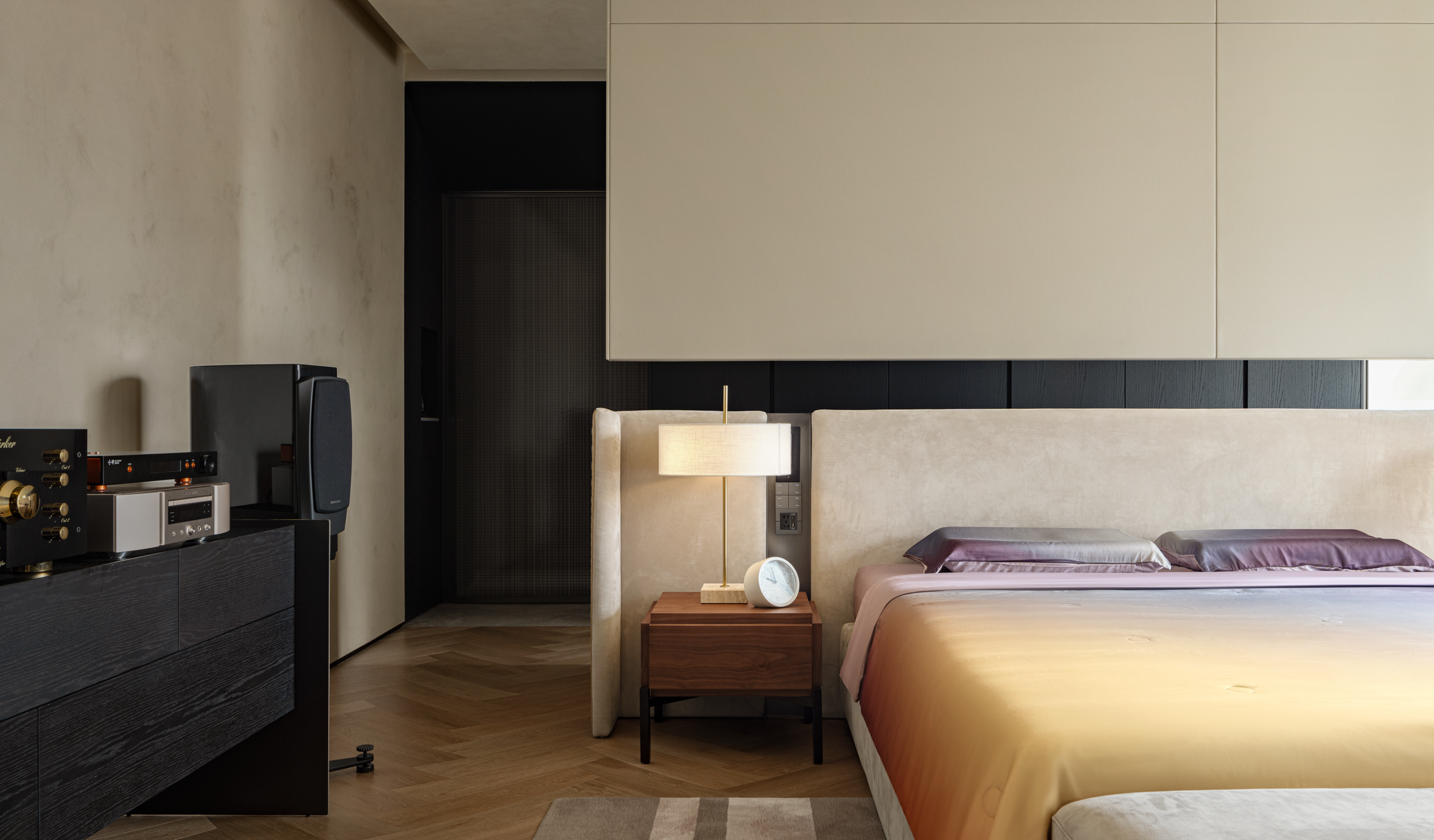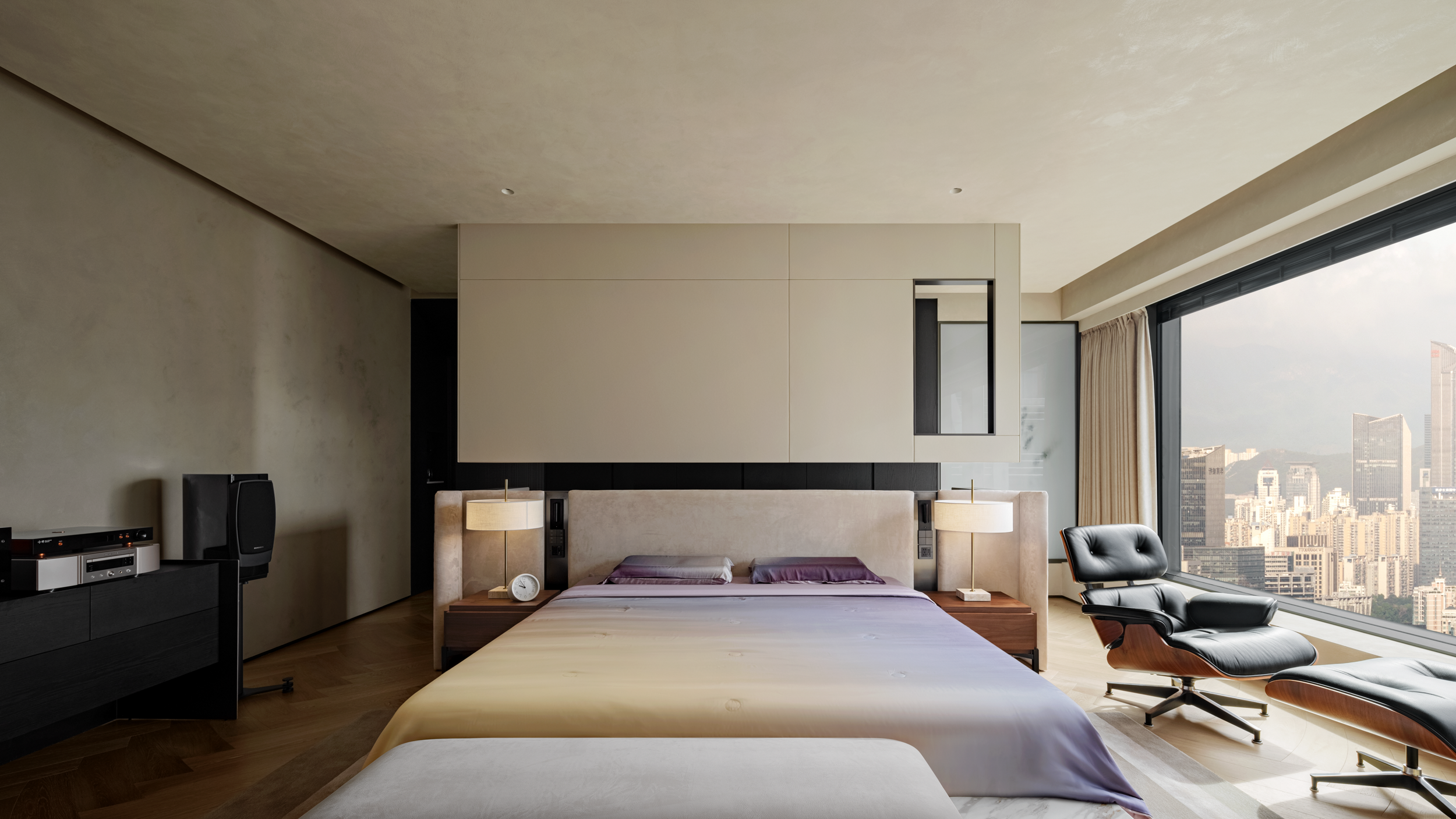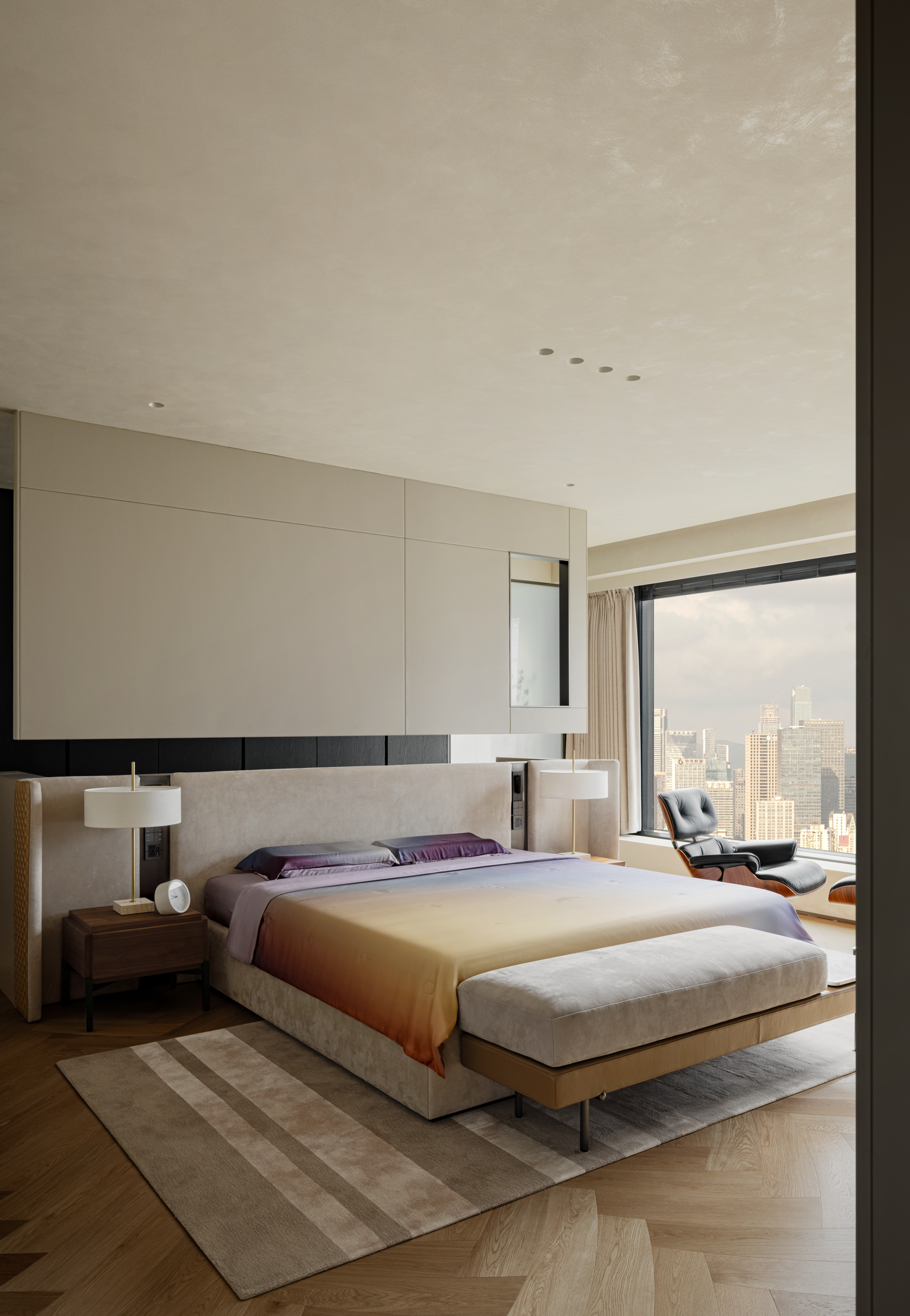 踏入休憩空间,主卧的温柔渐变色调,跟着光线变换情绪——晨间阳光斜扫时,浅紫裹着暖黄像浸了晨雾;睡前开夜灯,暗调又能裹住倦意,把都市窗景衬成了软乎乎的背景。