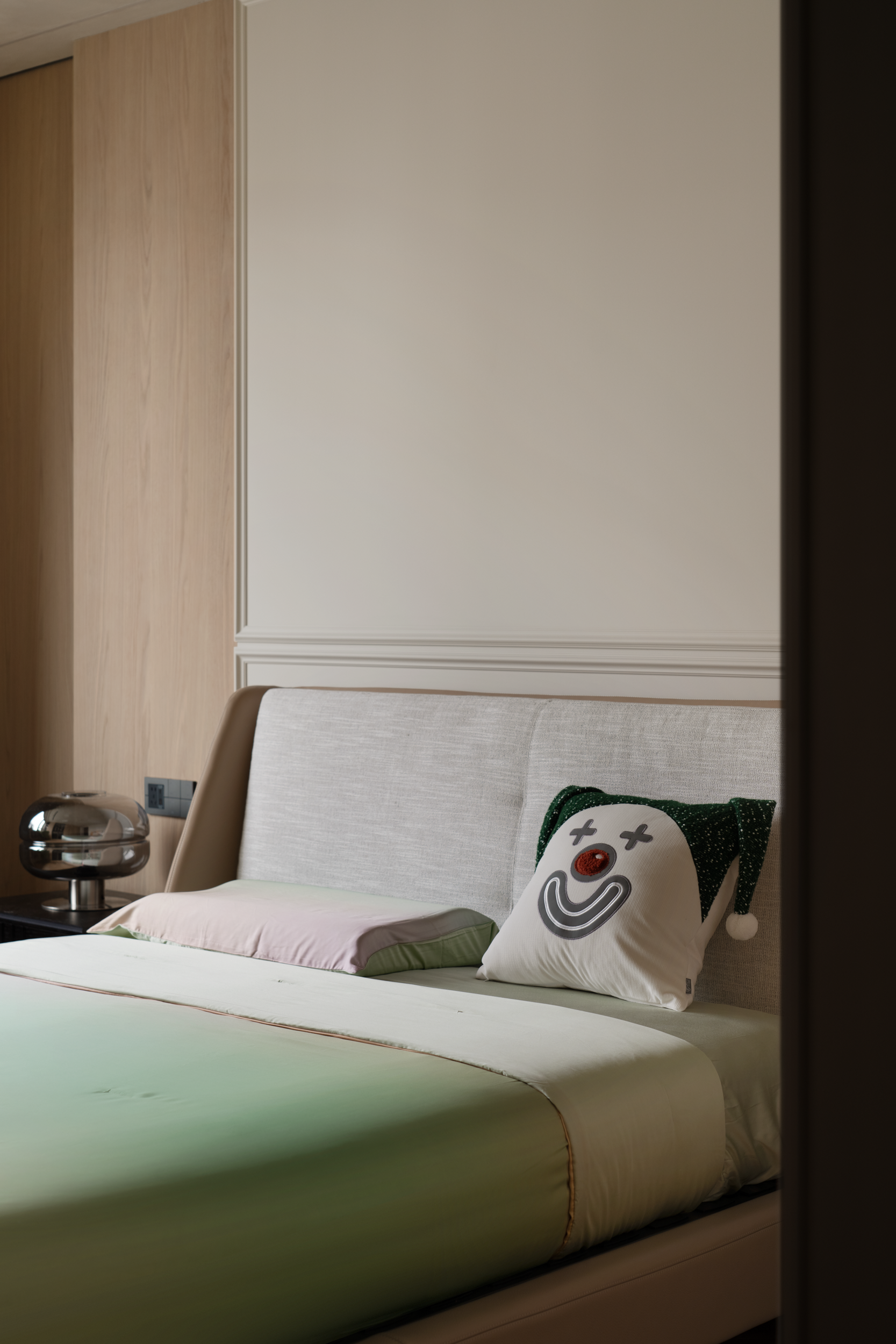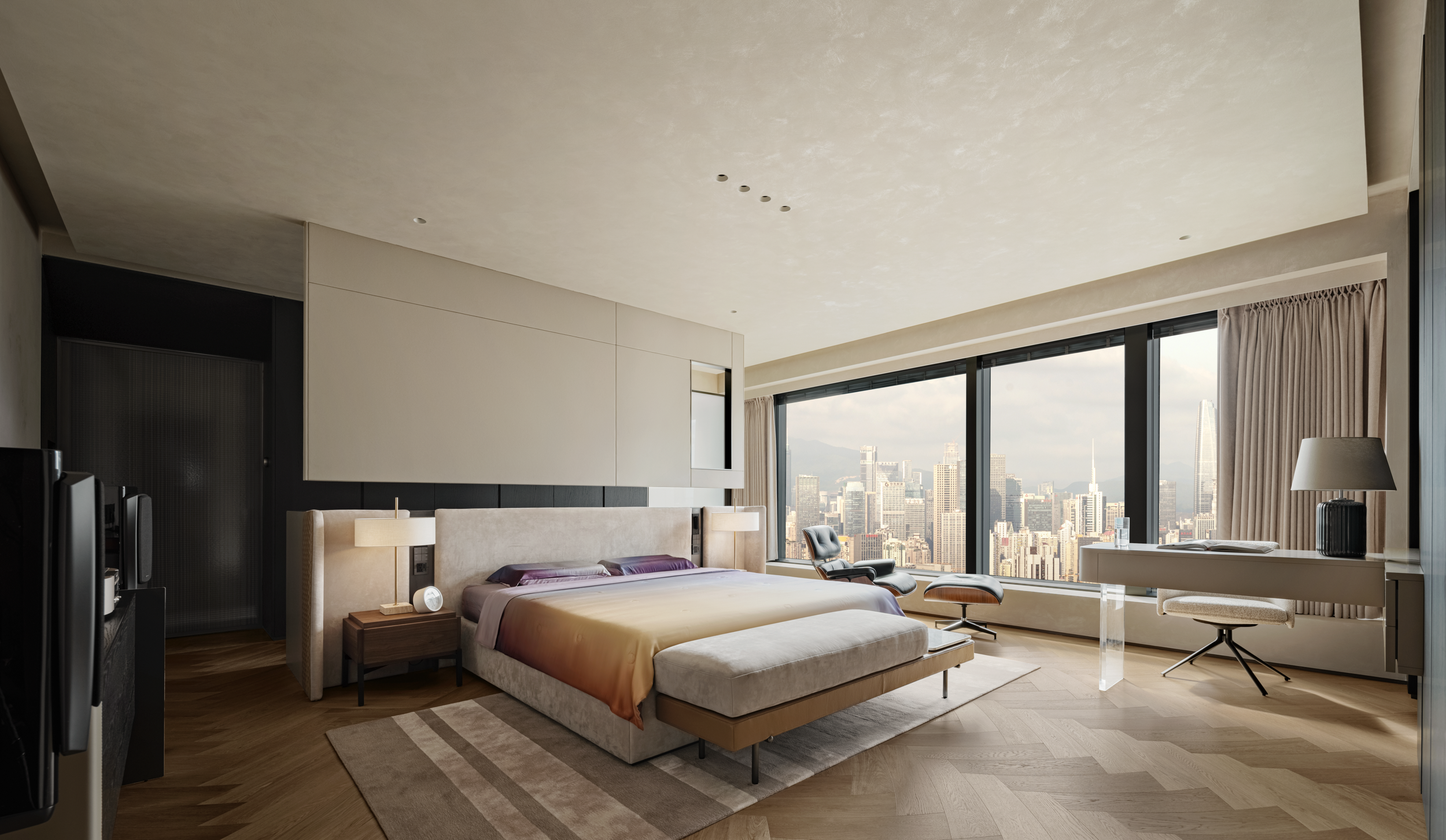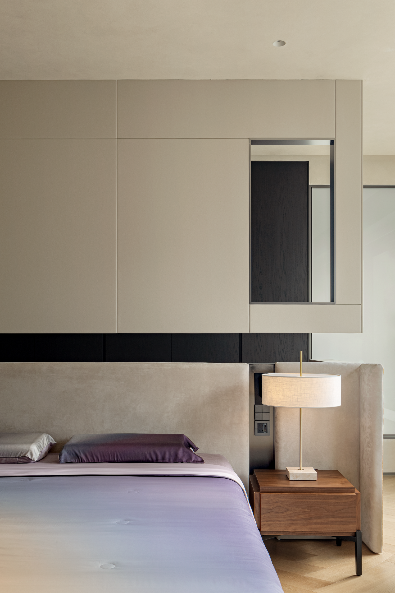 踏入休憩空间,主卧的温柔渐变色调,跟着光线变换情绪——晨间阳光斜扫时,浅紫裹着暖黄像浸了晨雾;睡前开夜灯,暗调又能裹住倦意,把都市窗景衬成了软乎乎的背景。