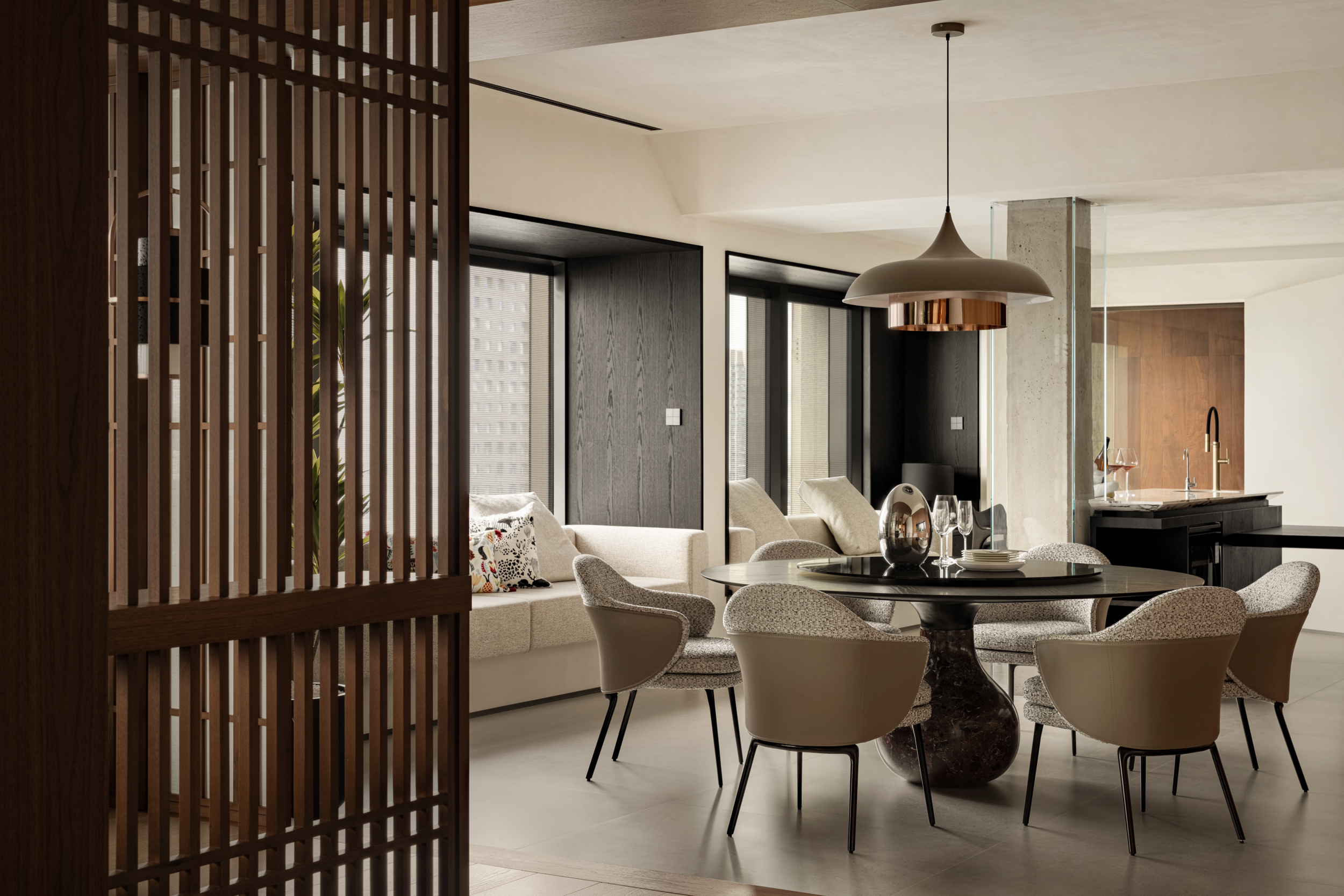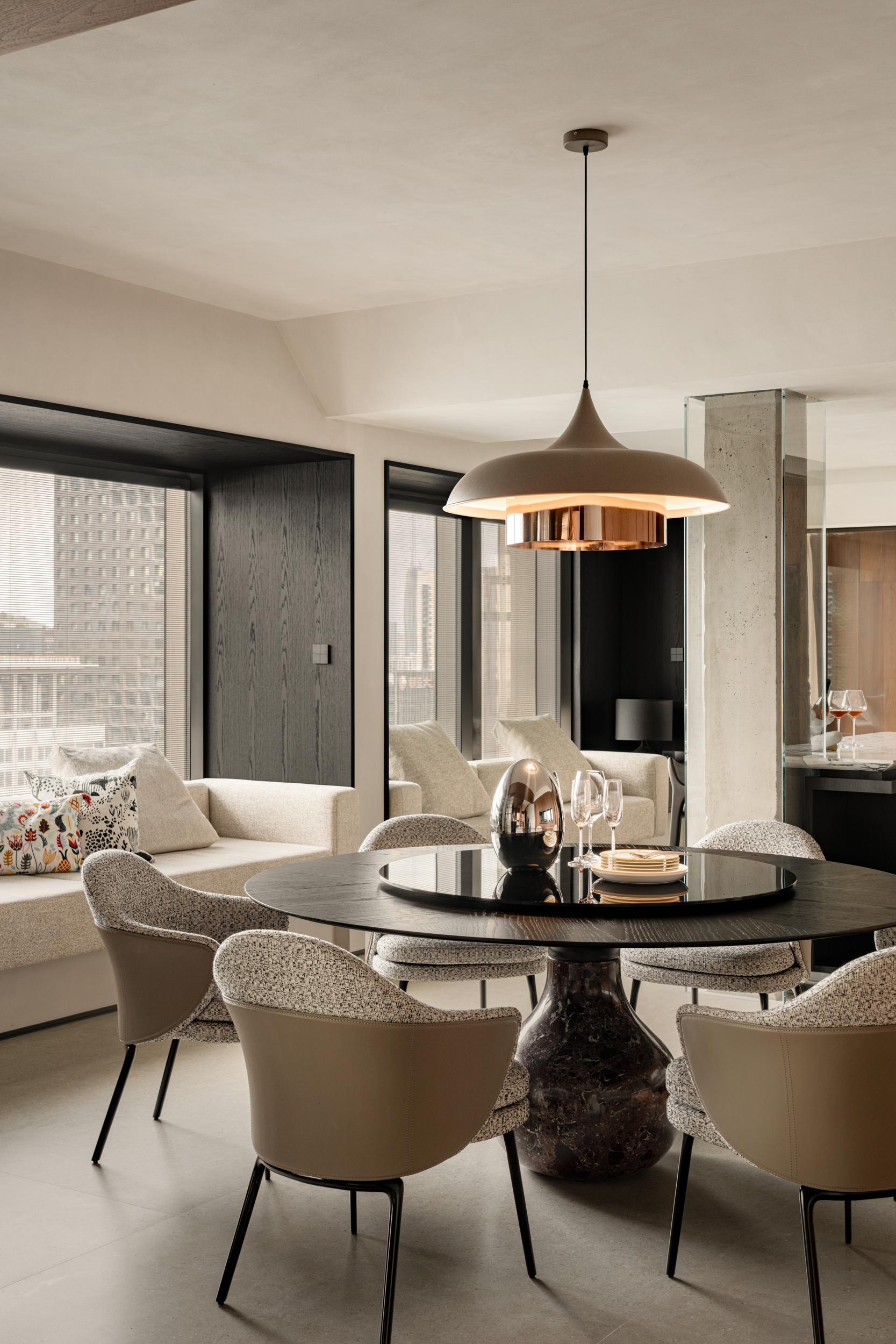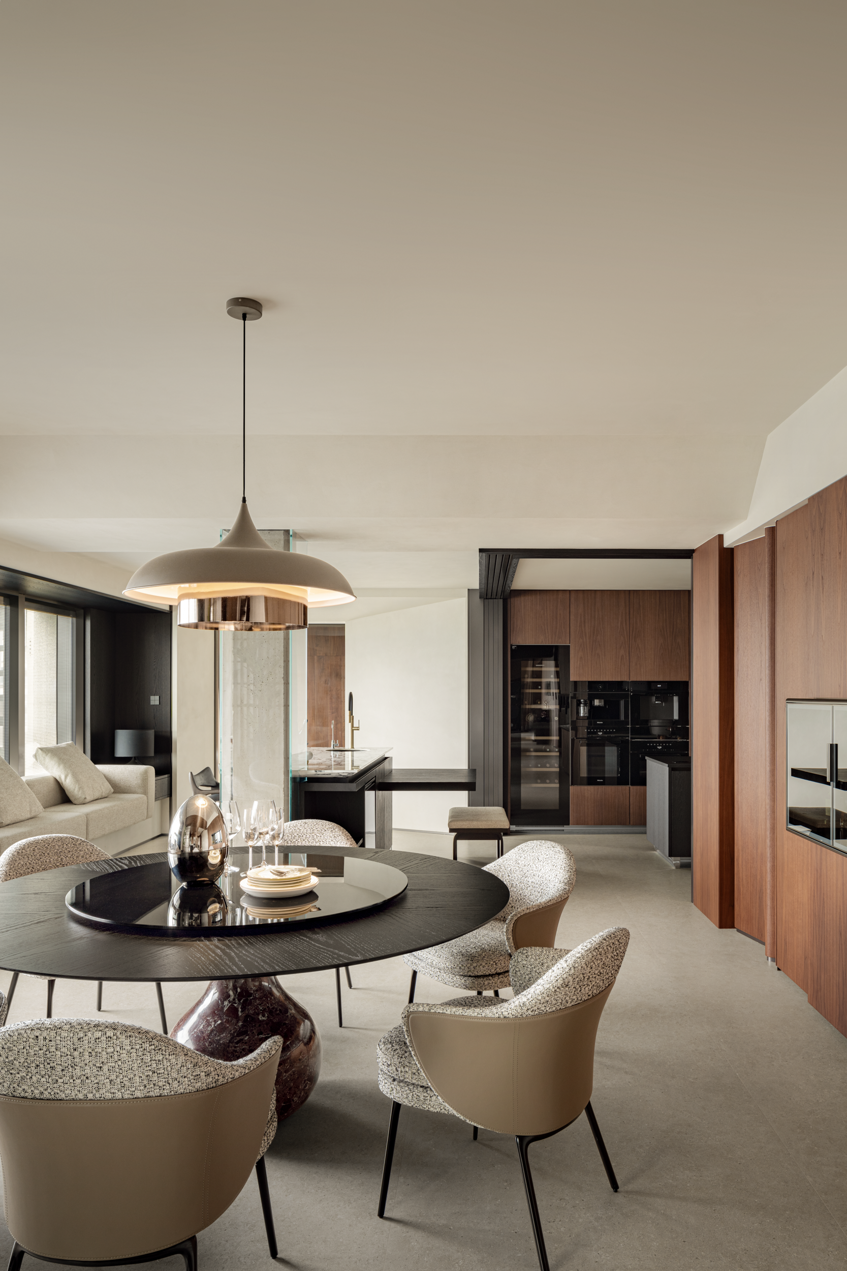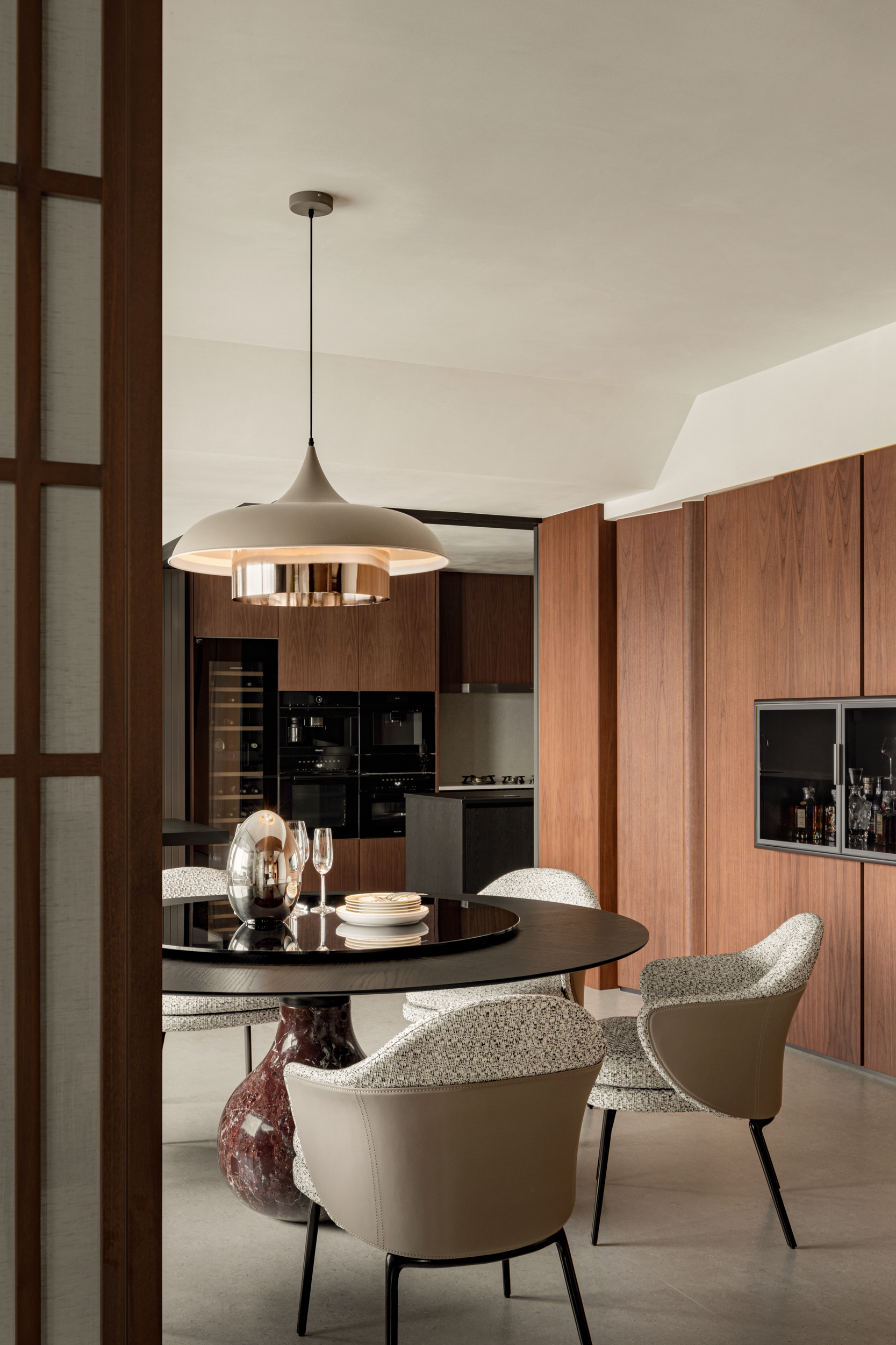 餐桌底座是浸了酒红雾气的深色云石,与桌面烟熏黑相衬,既有聚餐时的“稳”,又有肌肤与木质结合的暖意。铜边半哑光的灯,把温暖刚好裹进餐桌中央,让相聚时的氛围都格外温柔。