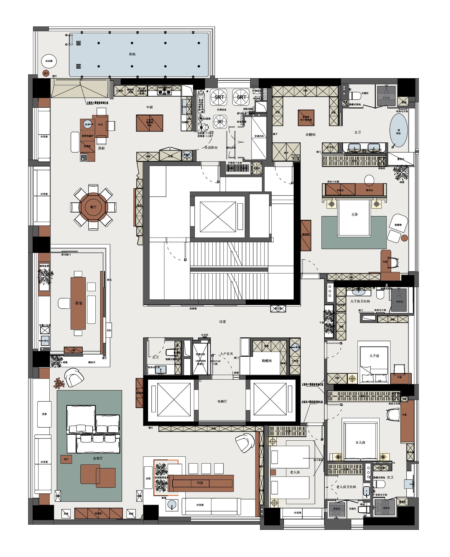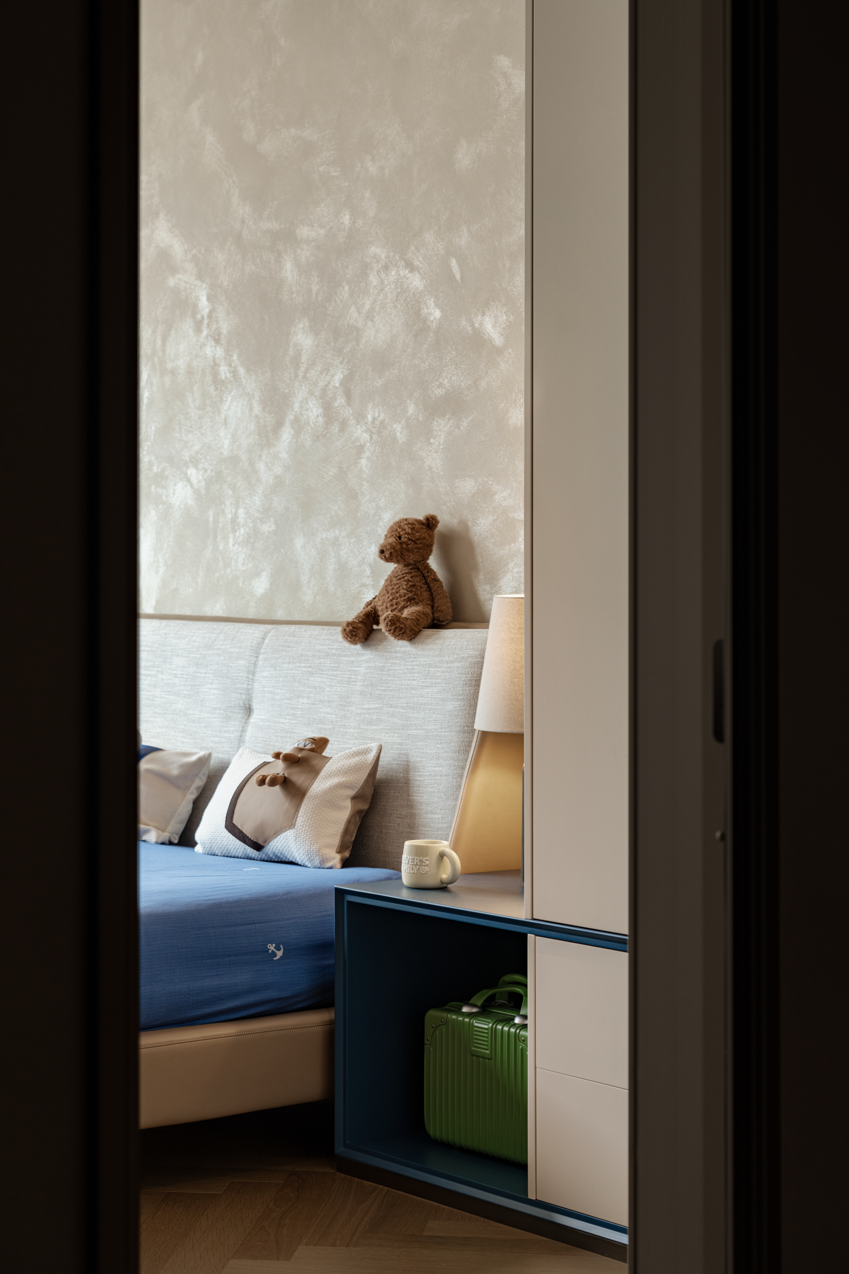 空间意境:光,漫过深圳的晴空,在胡桃木与岩肌理间织就二十载的情长。夫妻二十余年的恩爱,藏在床头的软细节里;大女儿的艺术追求,映在漫画与手办间;小儿子的童真天赋,留在书桌的画作上;男业主的音乐热忱,融在透明乐器装置与音响里。东方的静雅与现代的简约,夫妇爱的浓意与孩子童真趣味的憧憬,在此相映成趣。