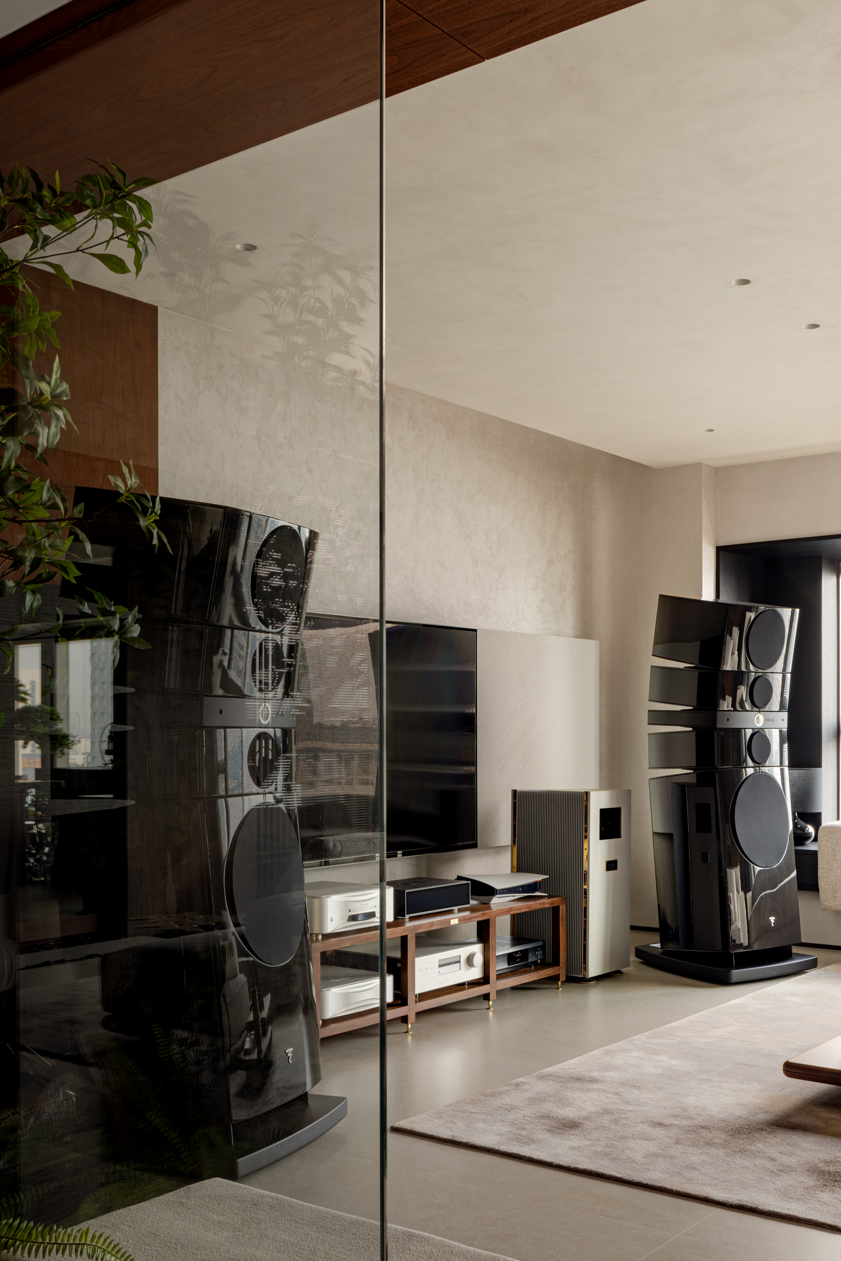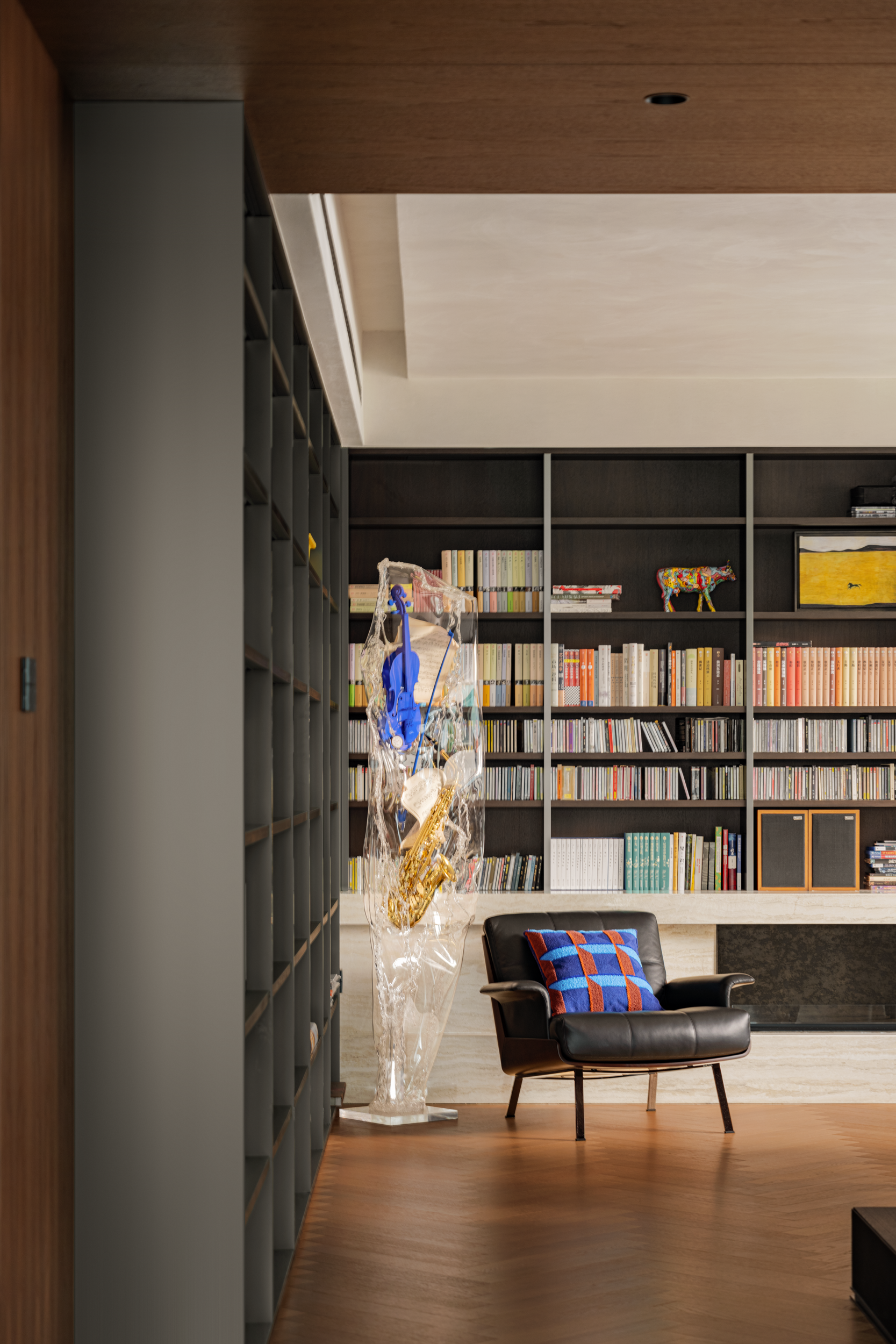 彩色抱枕颜色跳脱,却刚好呼应了乐器装置的蓝与金,让客厅和书房虽为两区,却用颜色缠在了一起。黑色音响被深色木饰面和黑玻“藏”了锐感,听歌时是影音工具,闲时便是空间的装饰,让音乐这抹“难以捉摸的空气”,始终萦绕在生活里。