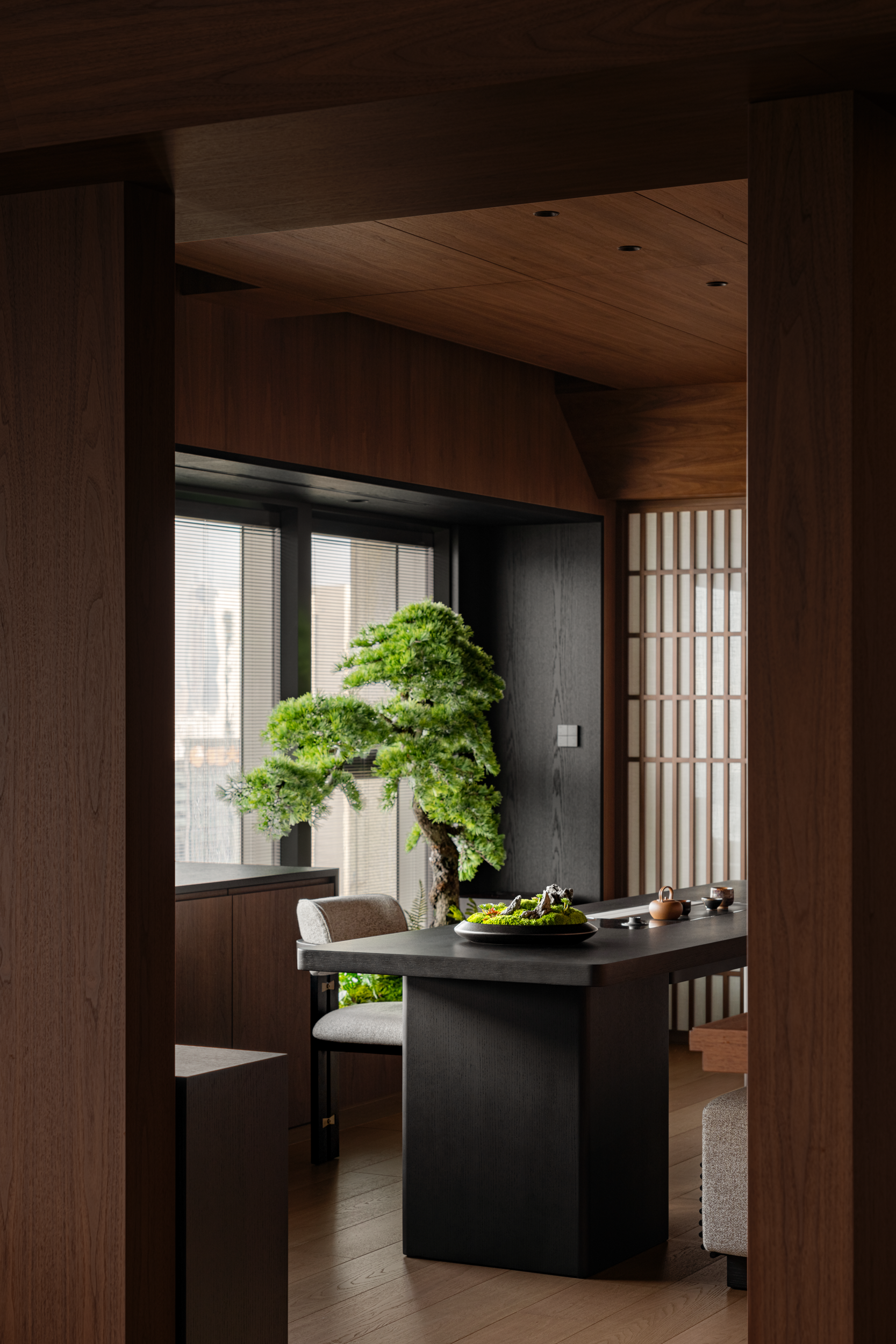 一隅茶席,盛满东方雅韵。青松造景不是摆样子,是为抬眼就能碰着绿意,刚好为木卸了沉。