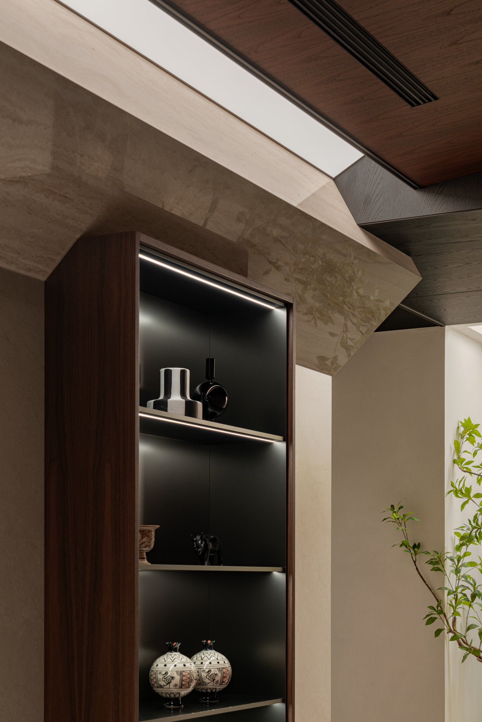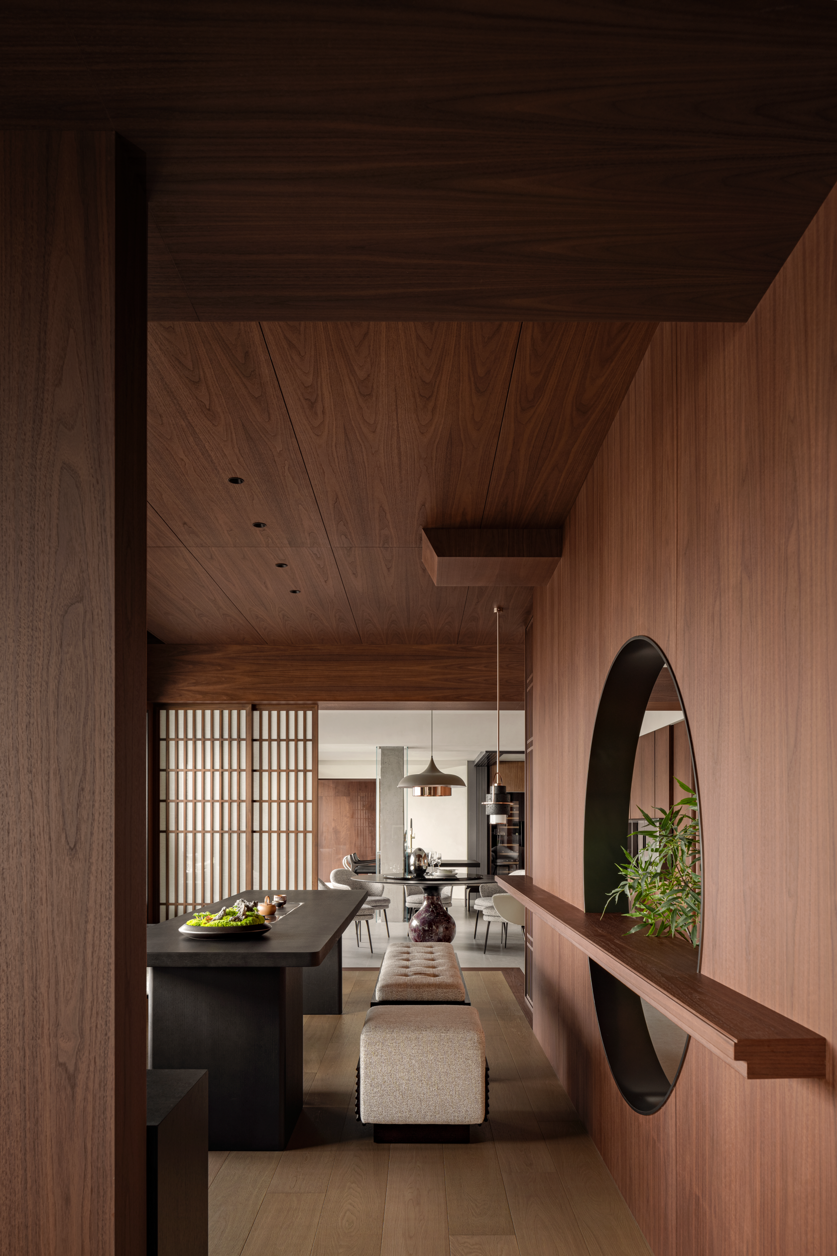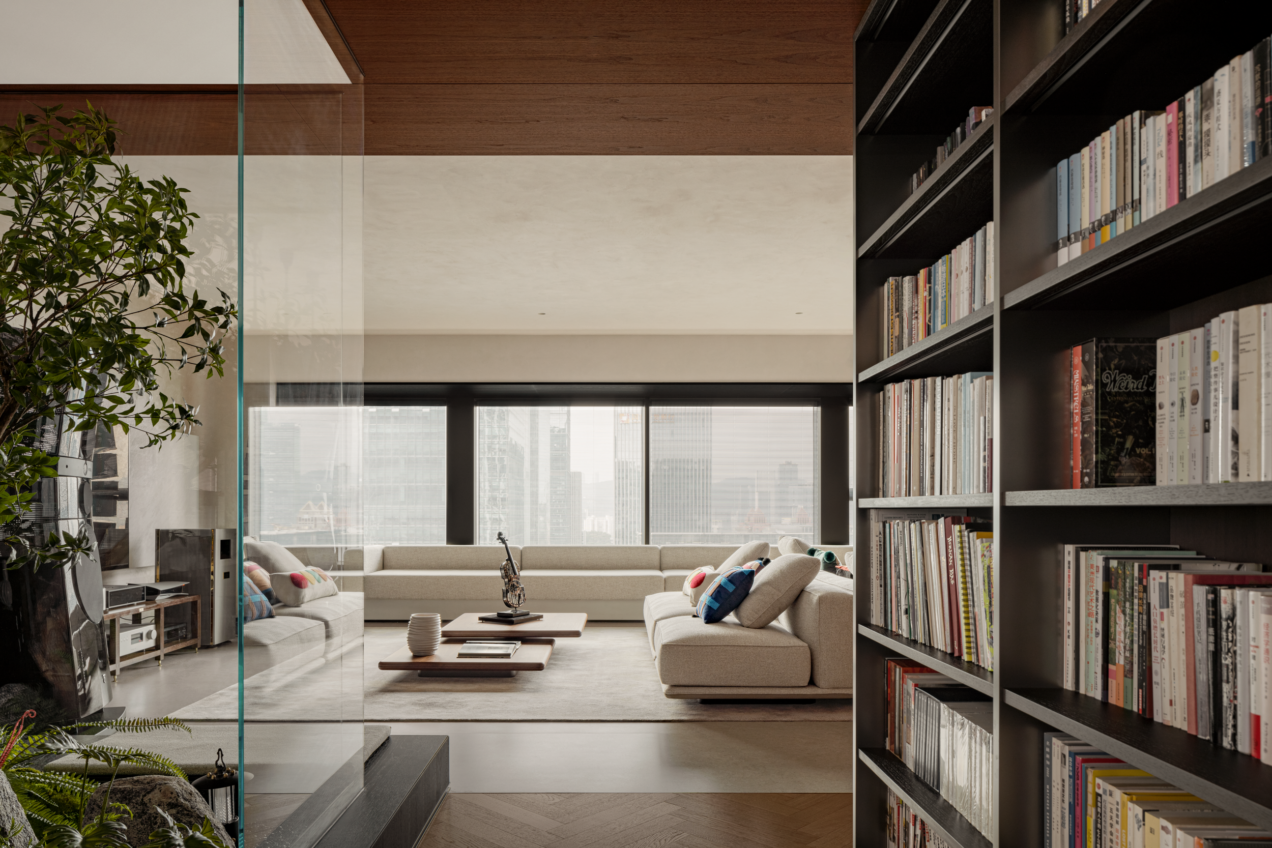 深色胡桃木并未压沉空间,全靠玻璃隔断“透了气”—书房与客厅以玻璃分界,既隔出阅读与休闲的区域,又让书房的光漫进客厅;木饰面只裹了半墙,剩下的留白衬着绿植,冷瞬间温柔了下来。