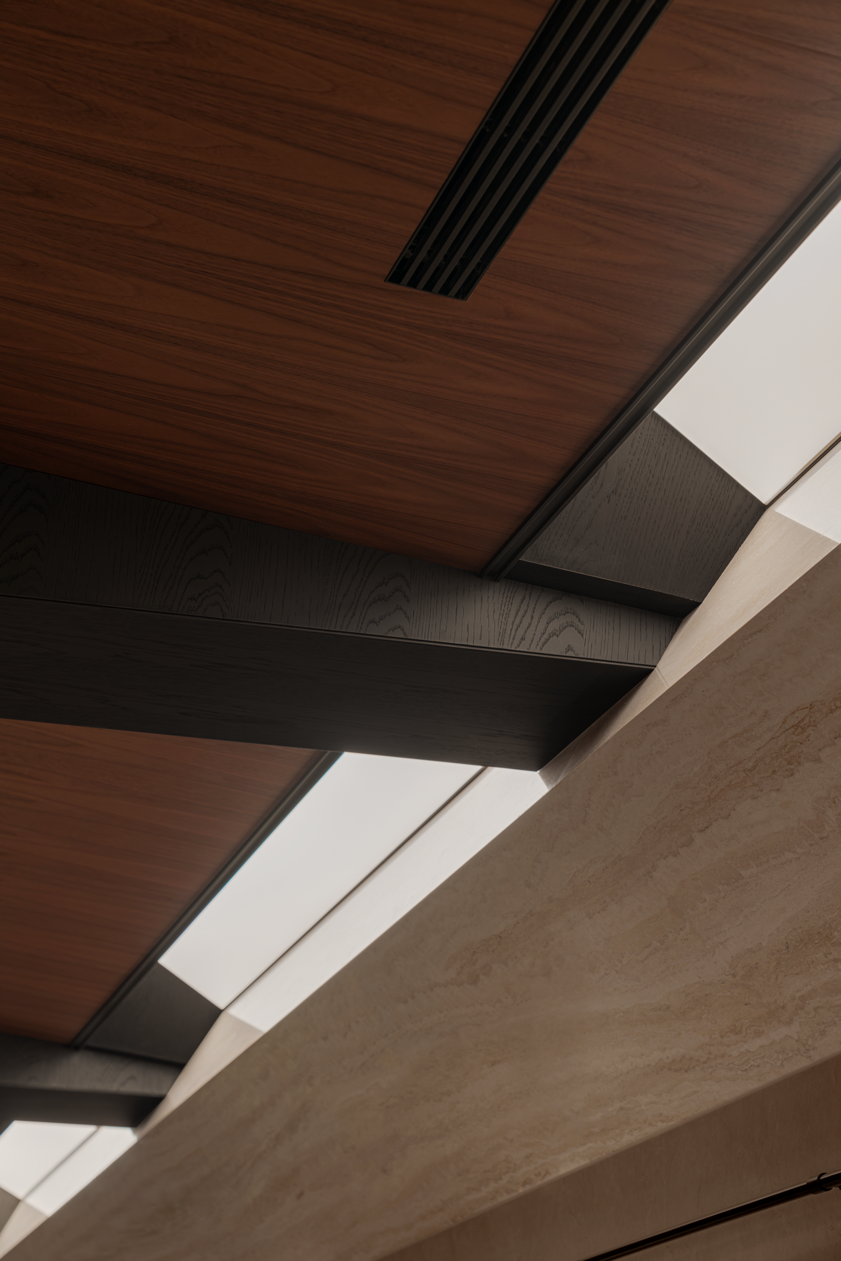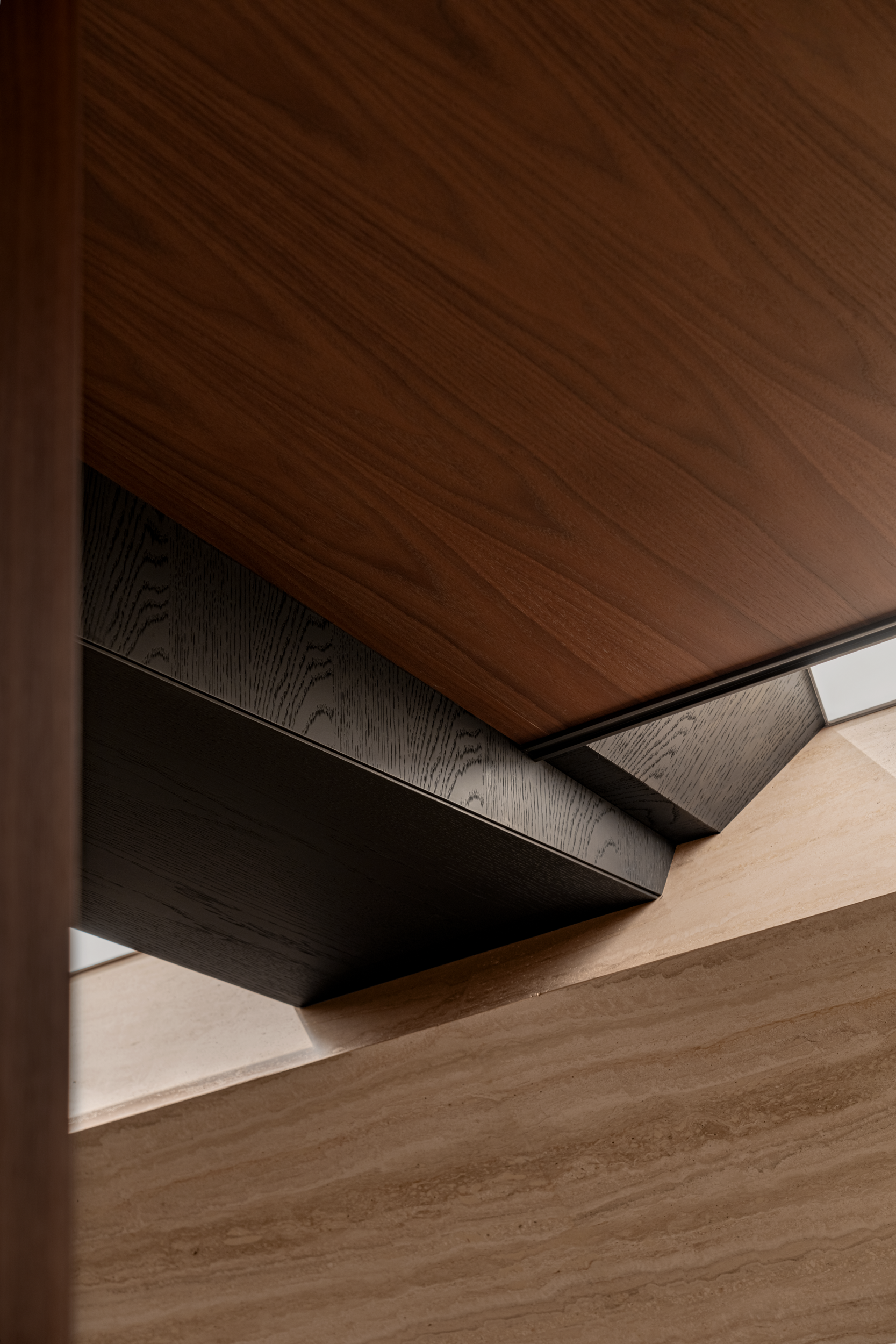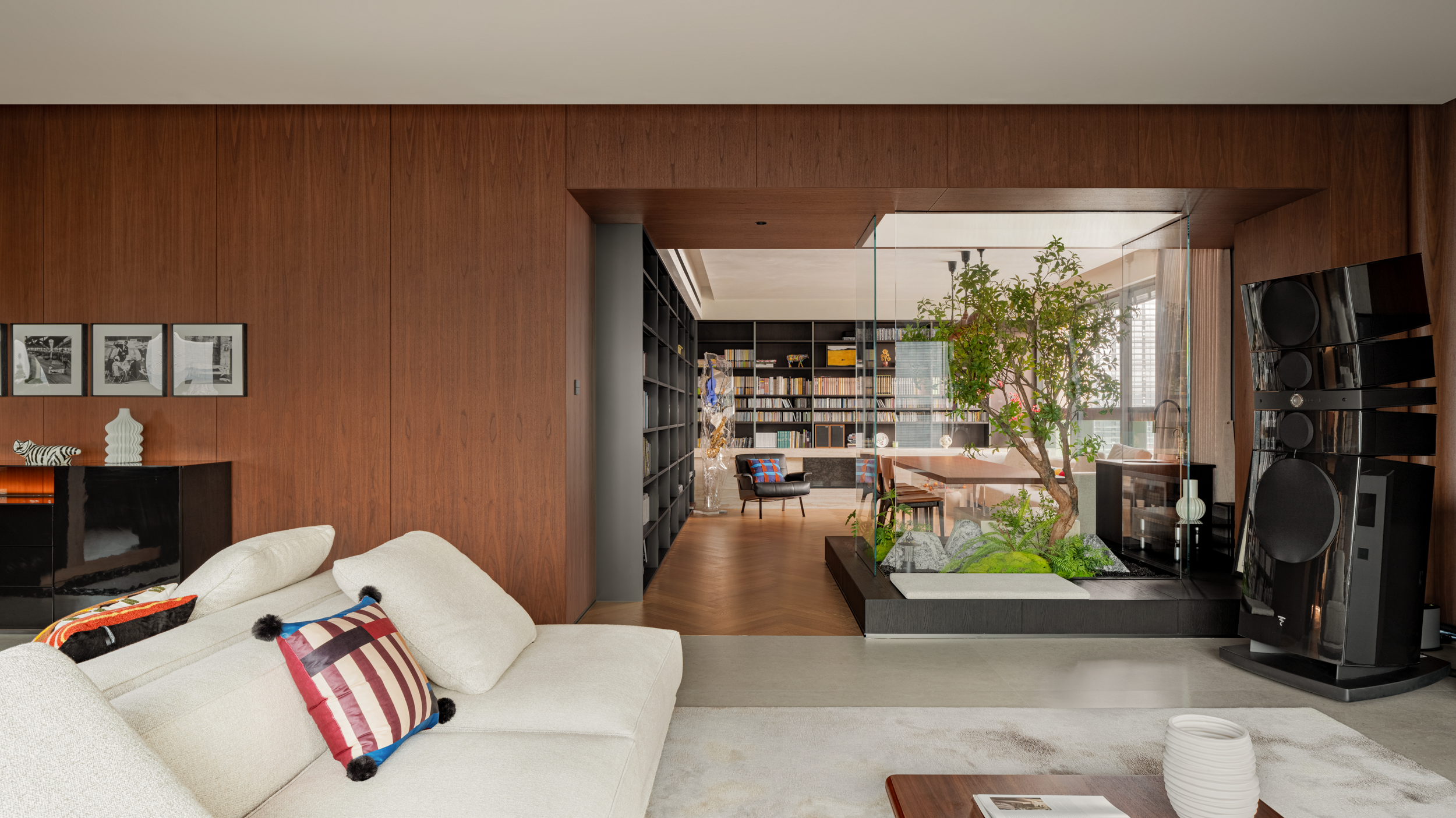 深色胡桃木并未压沉空间,全靠玻璃隔断“透了气”—书房与客厅以玻璃分界,既隔出阅读与休闲的区域,又让书房的光漫进客厅;木饰面只裹了半墙,剩下的留白衬着绿植,冷瞬间温柔了下来。