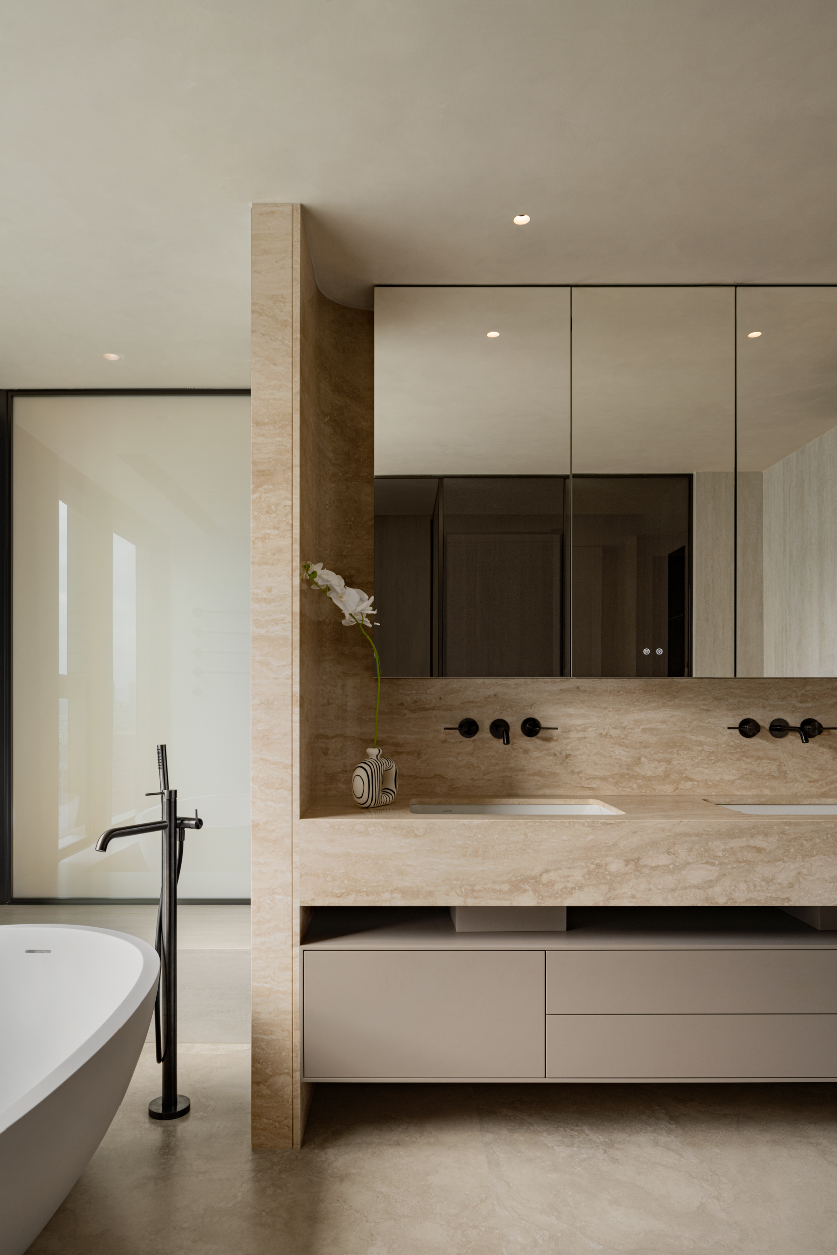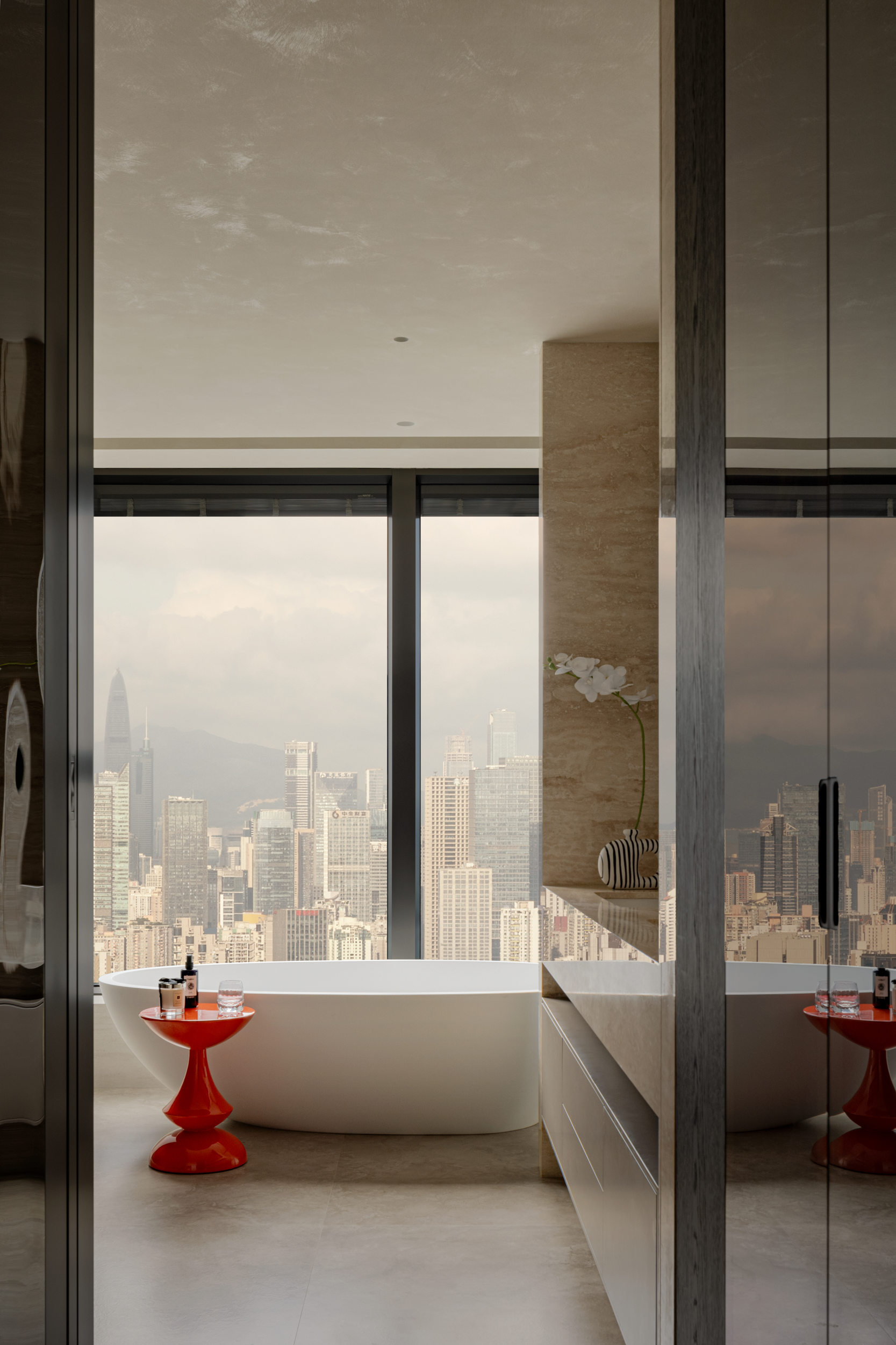 浴缸裹着冷调石肌理,旁边的一抹红,刚好被点亮,连窗外的都市楼群都浸成了软乎乎的放松背景。