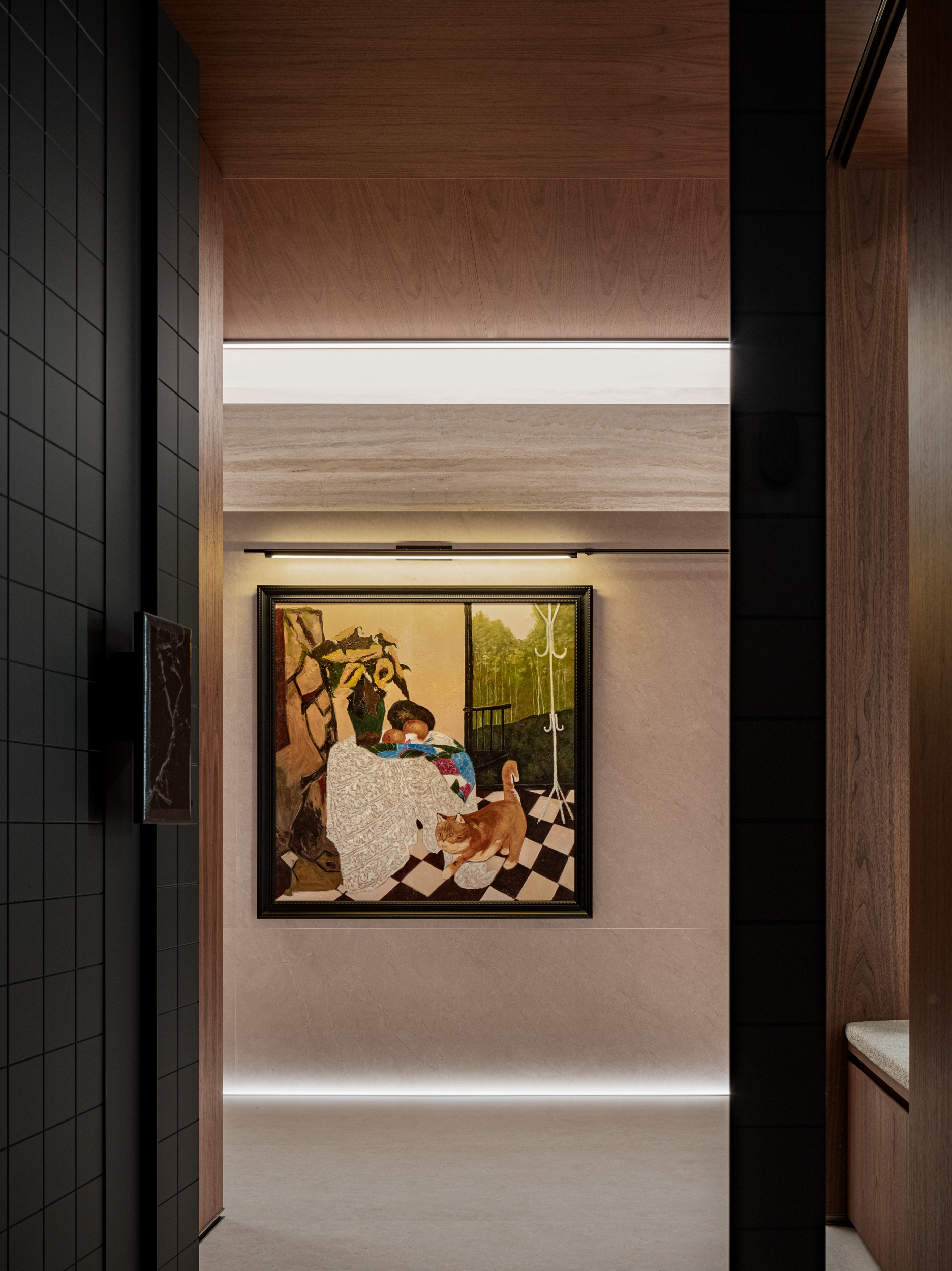 推开门的那口气,先被这方玄关温柔接住。暖棕胡桃木缠上暗纹瓷砖的静,线性灯带裹着暖纱流淌,将刚与柔揉成归家的第一帧松弛。墙面藏着的小心思,在织纹肌理中,把“松弛”二字映入每一次推门的瞬间。