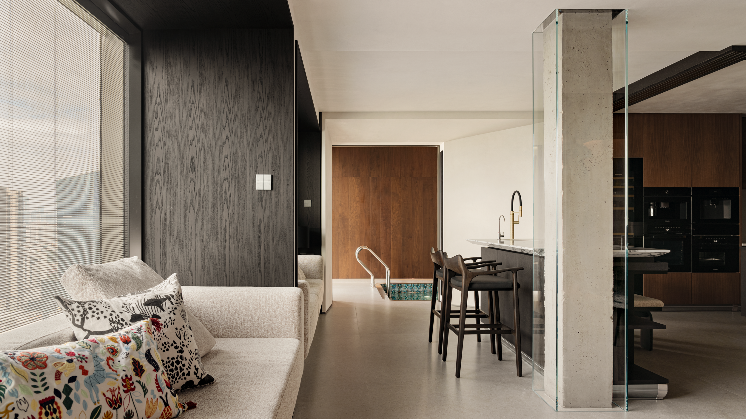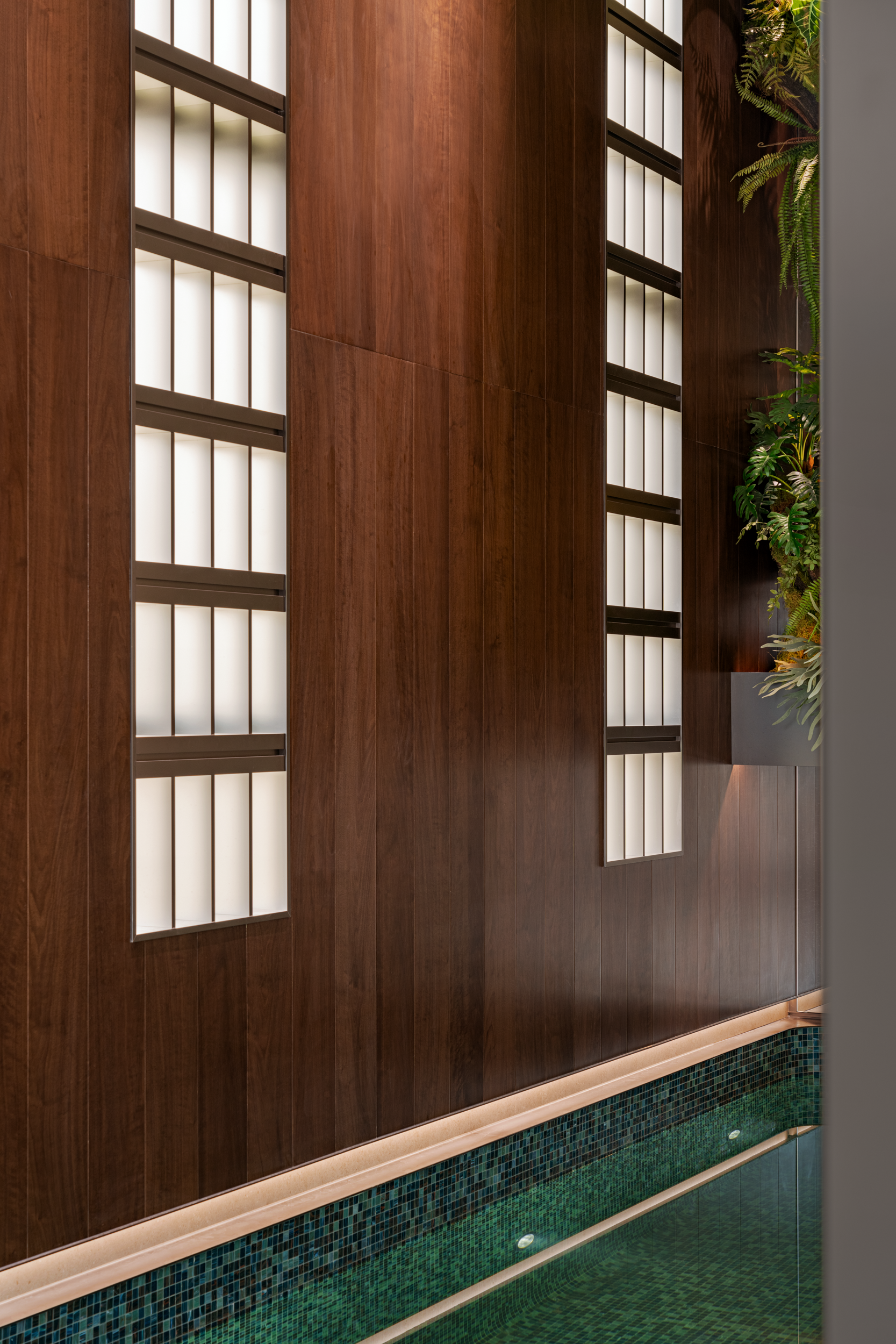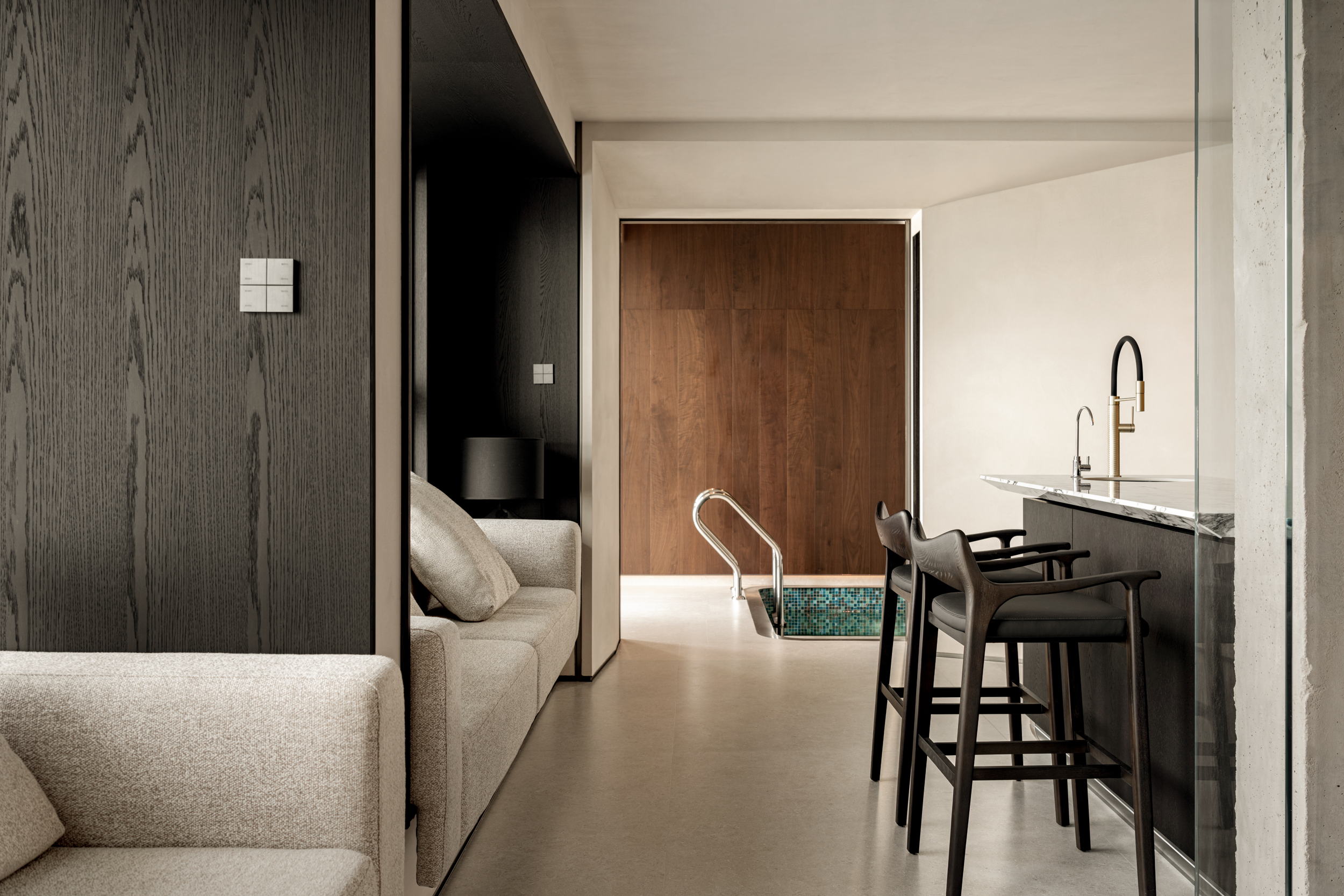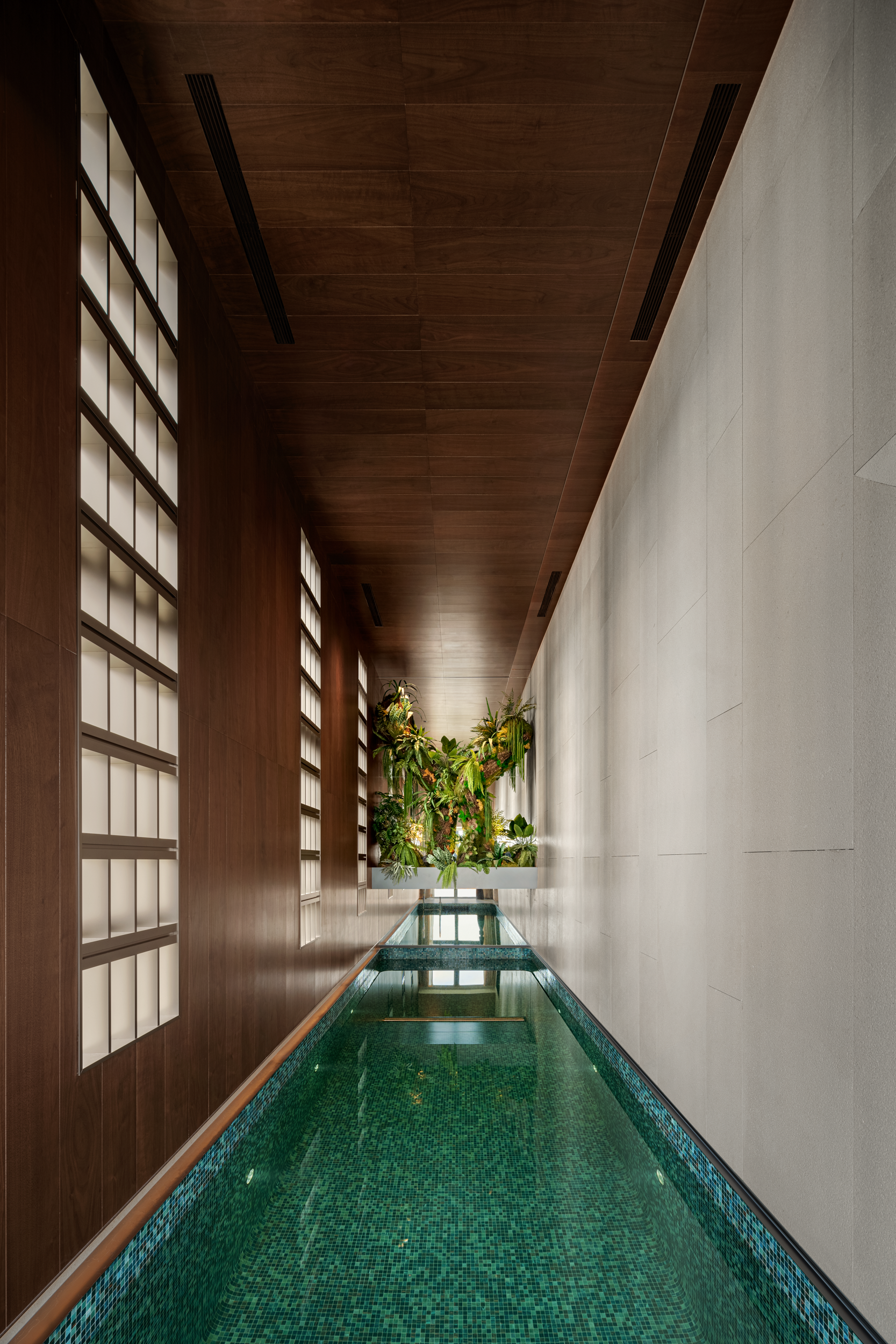 最让人惊喜的,是这方藏在家里的泳池。木顺着泳池延伸,裹住了水的冷意,让游泳时像裹在温软的木壳里,光渗进来是漫开的,水波里的光也都是软的,像浸在裹了纱的午后。