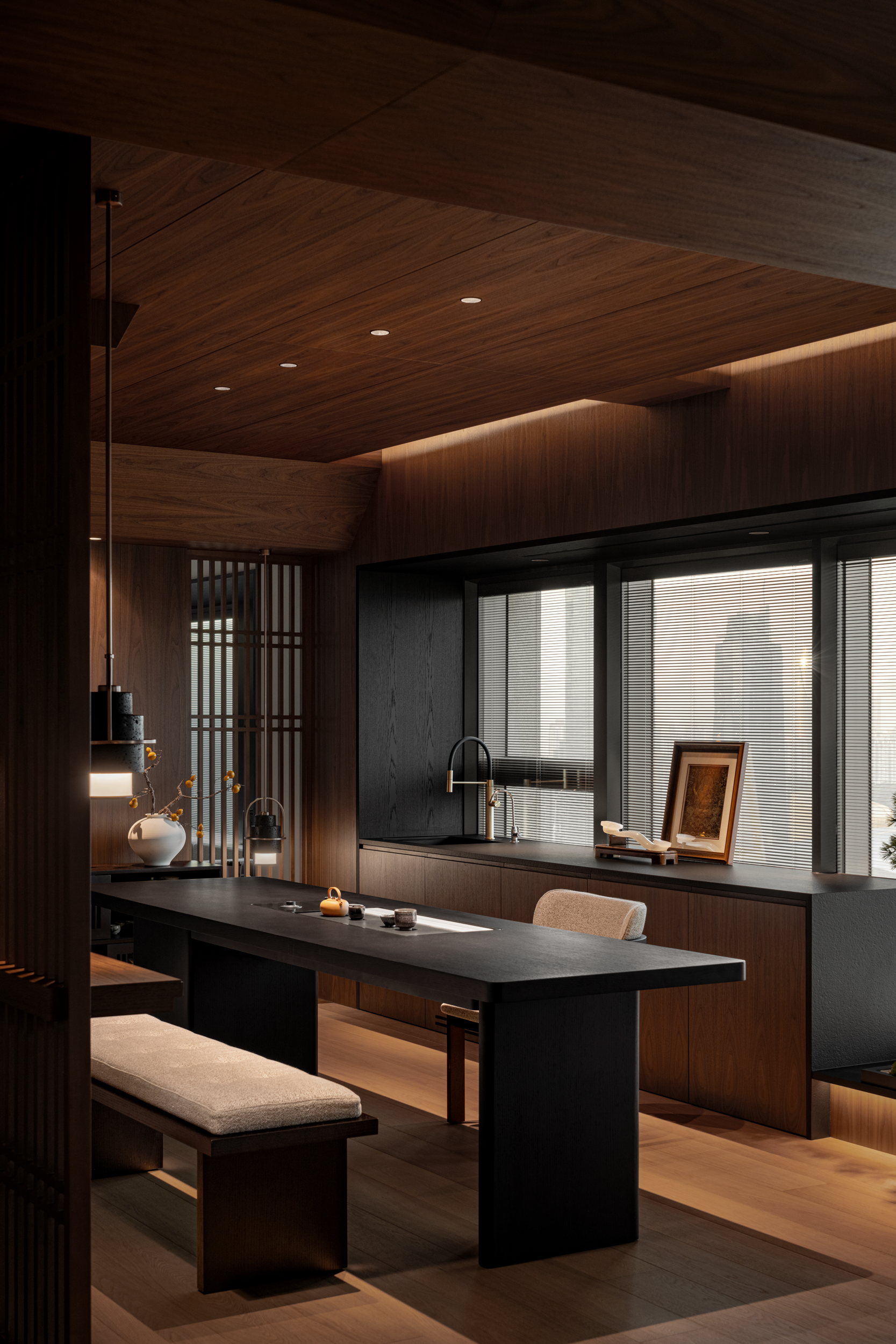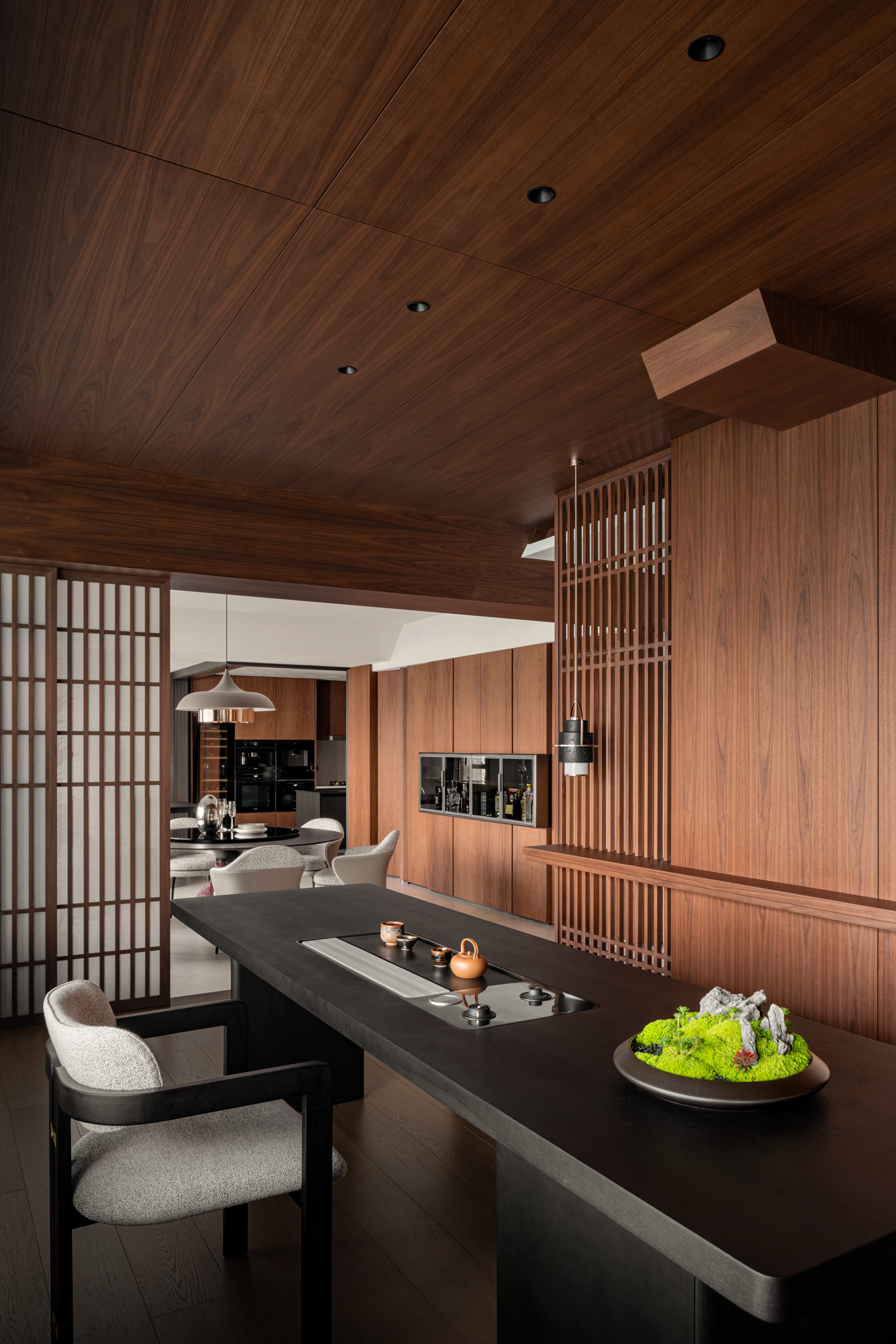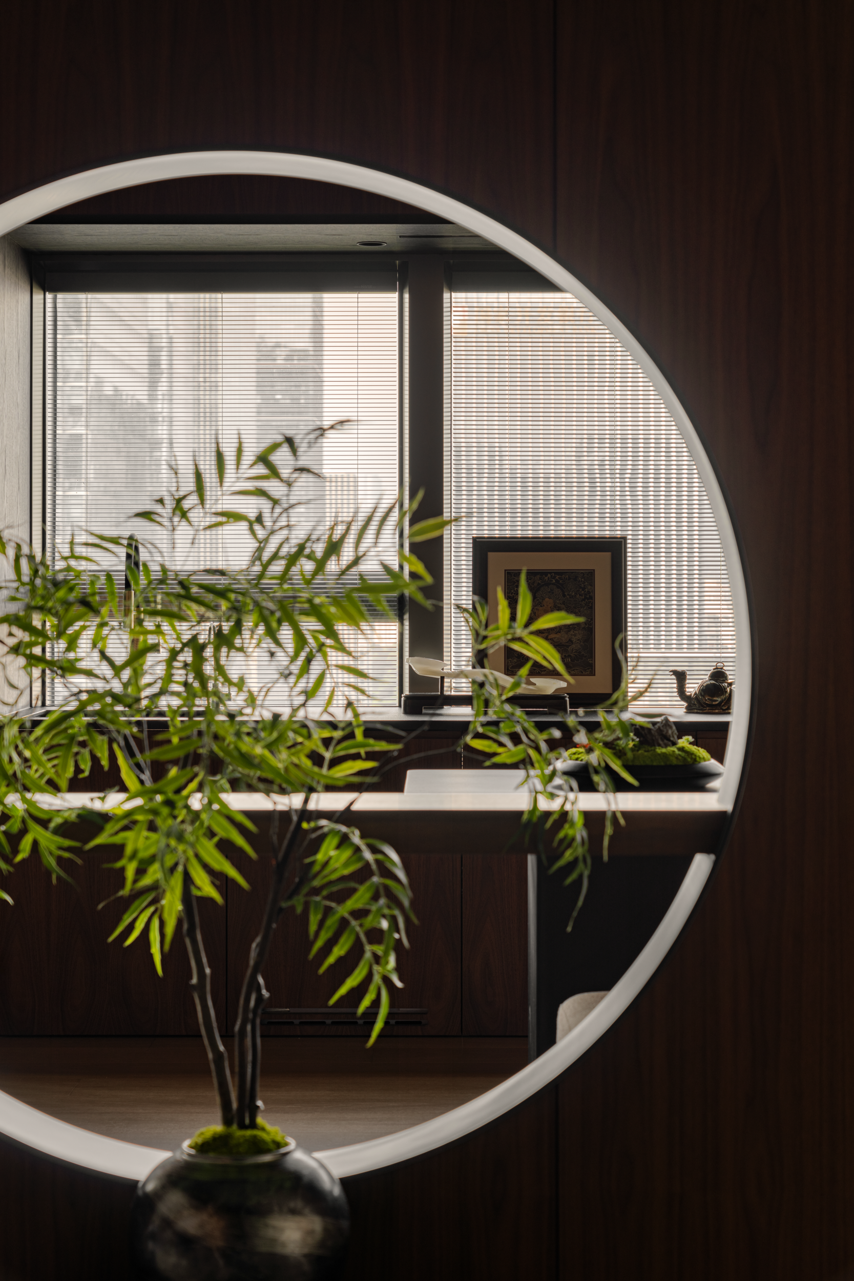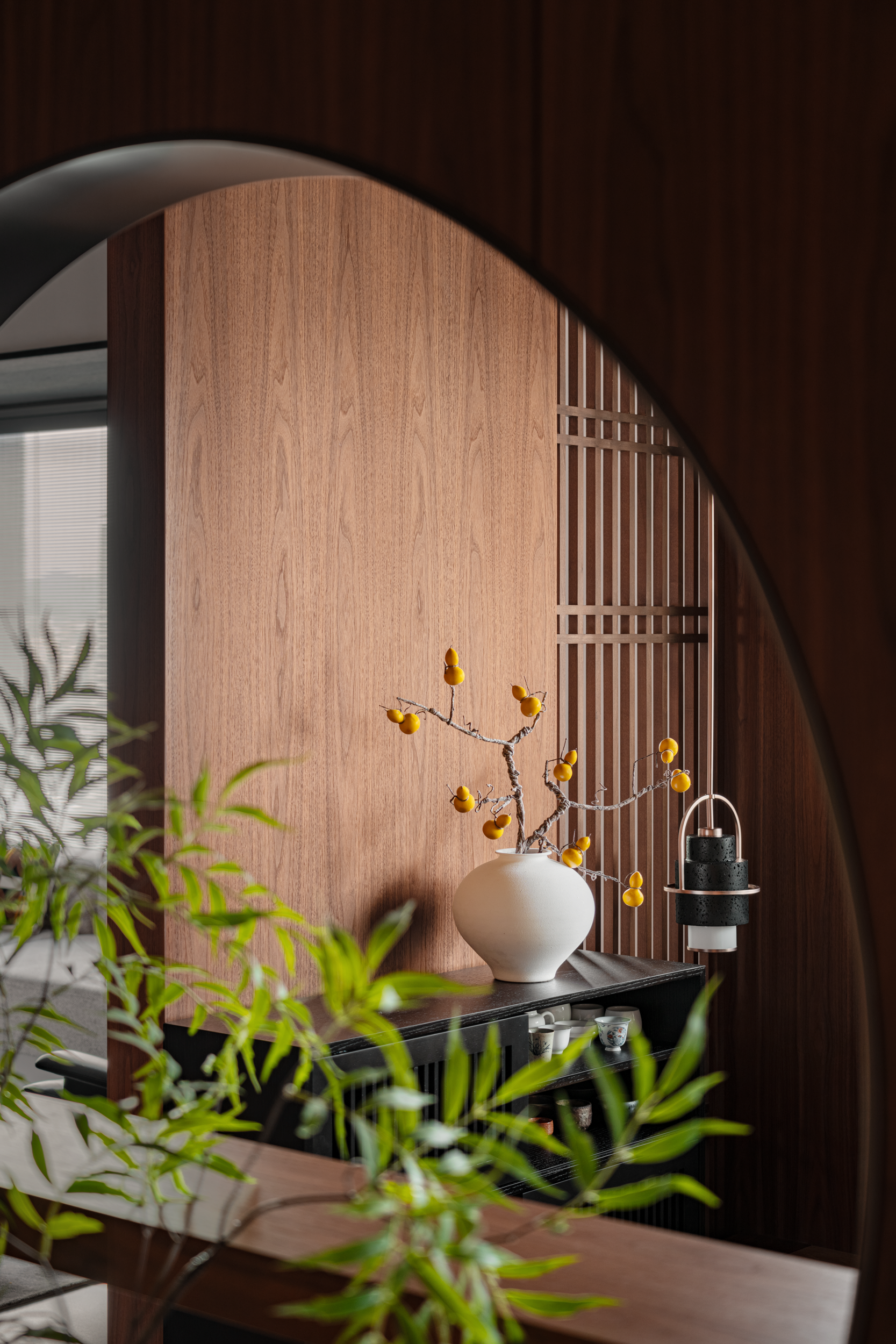 圆,不仅让空间“透”了起来,更刚好框住那枝藏着“事事顺”小意头的柿子。细竹斜立,叶片轻软,风一吹能晃出碎影,与胡桃木的沉裹在一起,正是喝茶该有的“松而不散”。嵌入式灯藏在木顶缝里,光顺着桌沿铺,既不晃眼,又能让茶盏的釉色清晰显现,连洗茶的水痕都看得分明,让喝茶的兴致更浓。