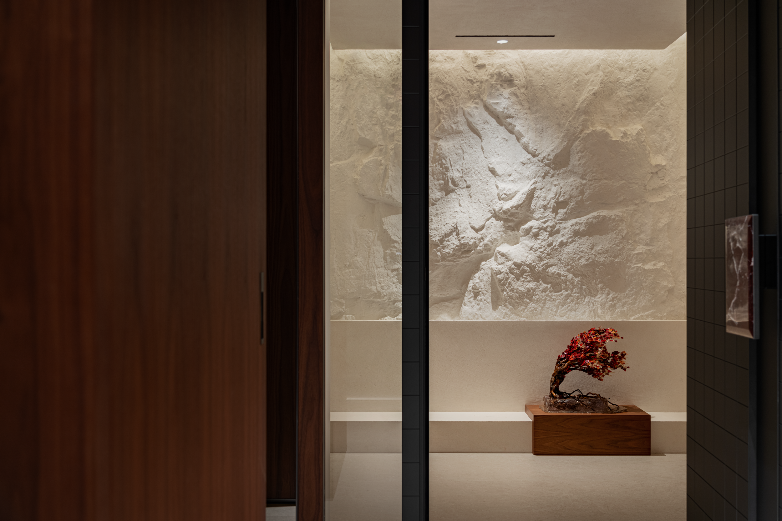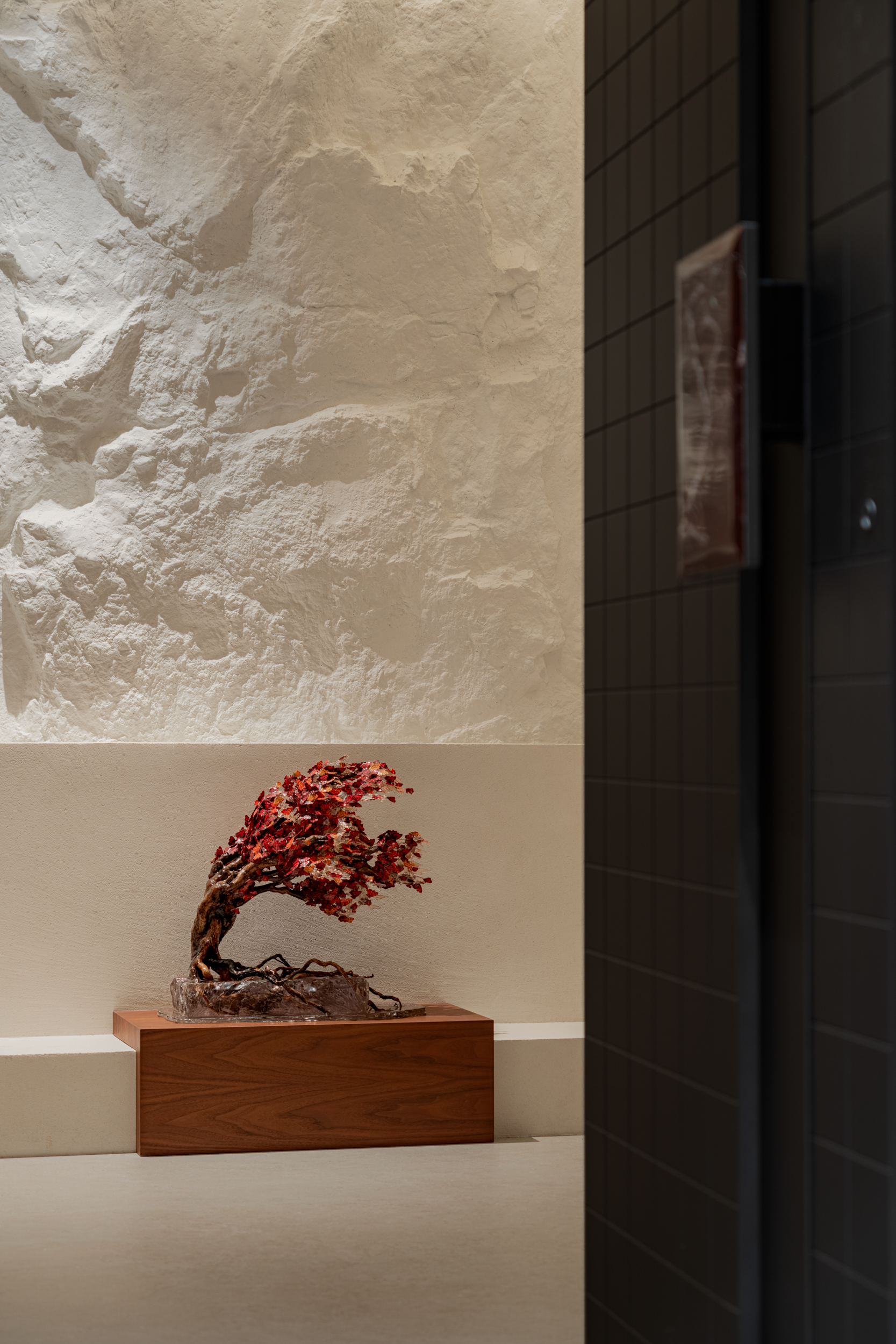 转角藏着细碎欢喜,器皿在灯带里泛着静气;那面手作的岩肌理墙像揉碎的云,斜支的枫树“Fukinagashi”添了一抹热烈。秋日绚烂的红韵,与冷调的岩石相映,让冷与暖在此刚好相逢。连角落都藏着小调皮,波点奖杯踮着脚,撞着色透着俏,把设计的精致晕染成了日常的可爱。