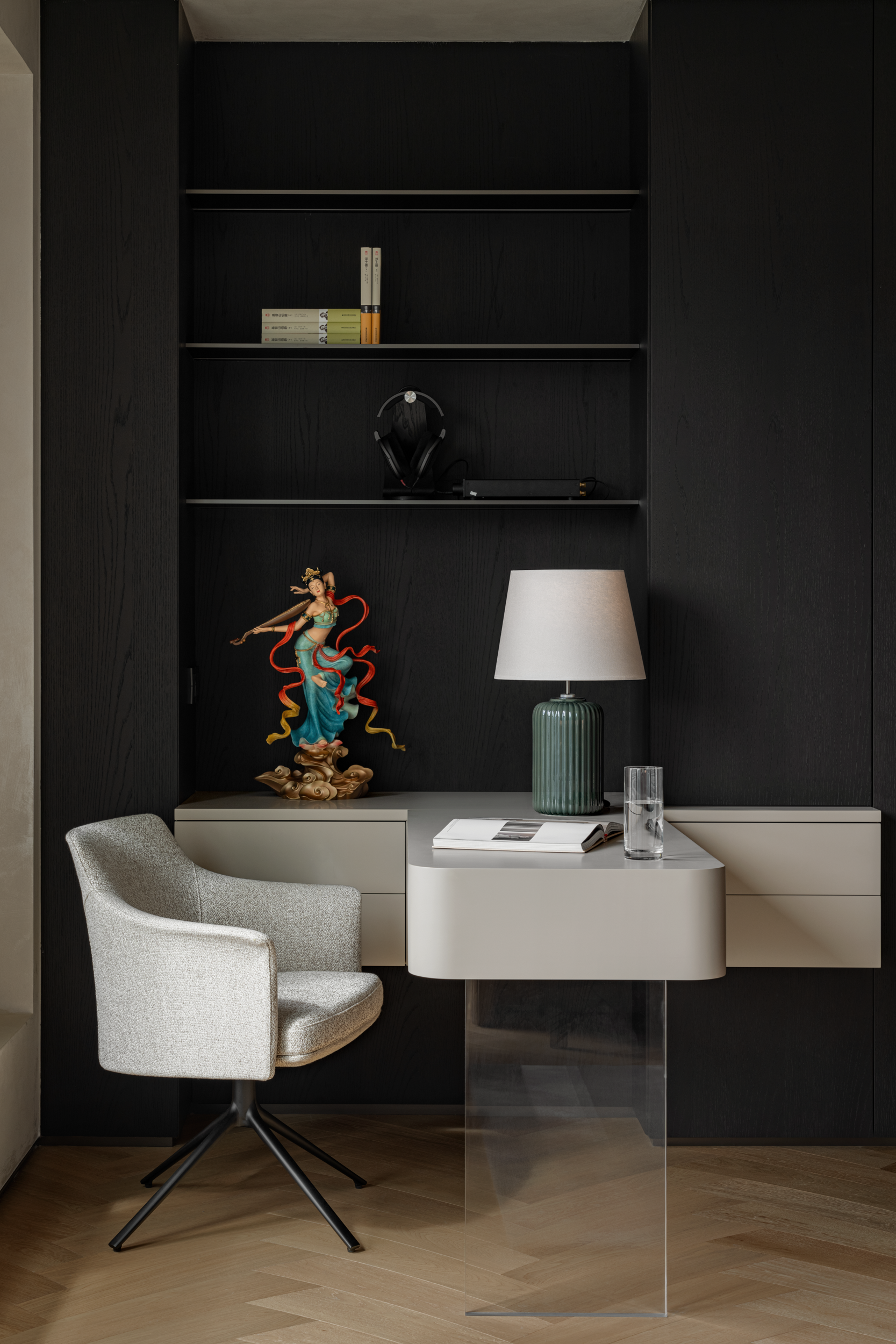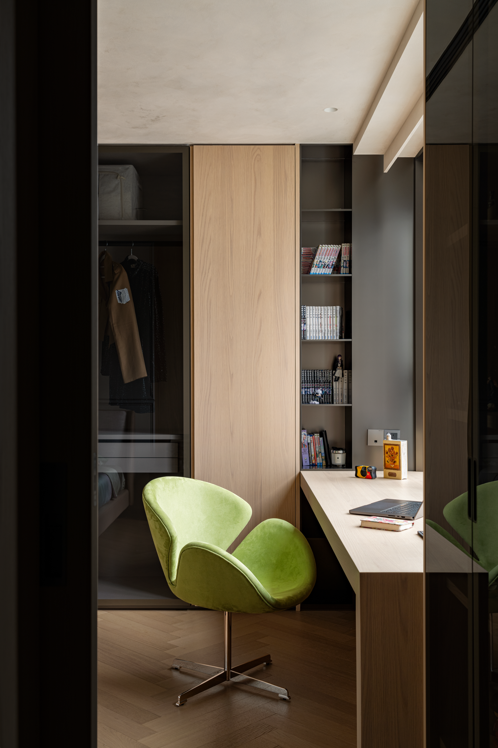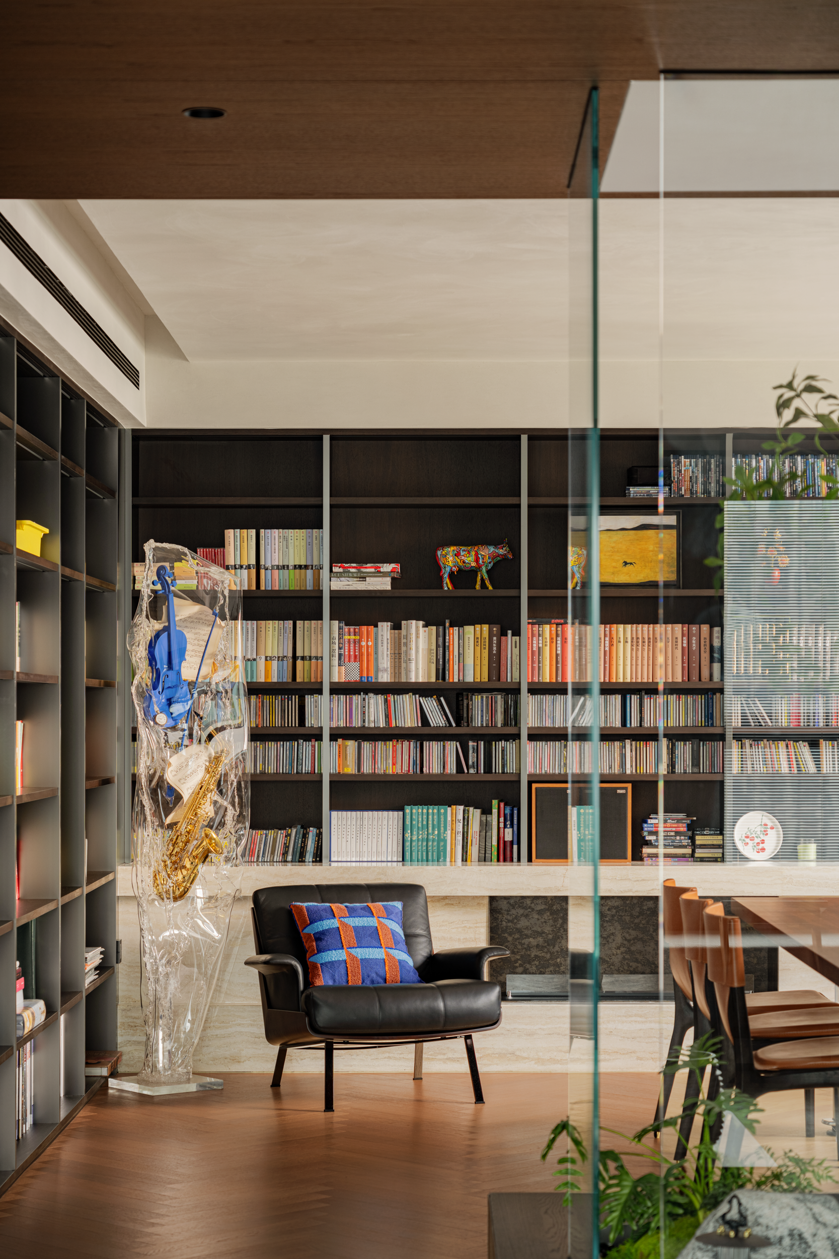 这里是他们的音乐天地,也是翻阅艺术书籍的角落,也是亲友小聚畅谈的场所。玻璃隔断让翻书的动静与客厅的笑闹相互映衬,“分而不隔”的松弛感,让两代人的爱好、亲友间的闲谈,都能在此和谐共生。